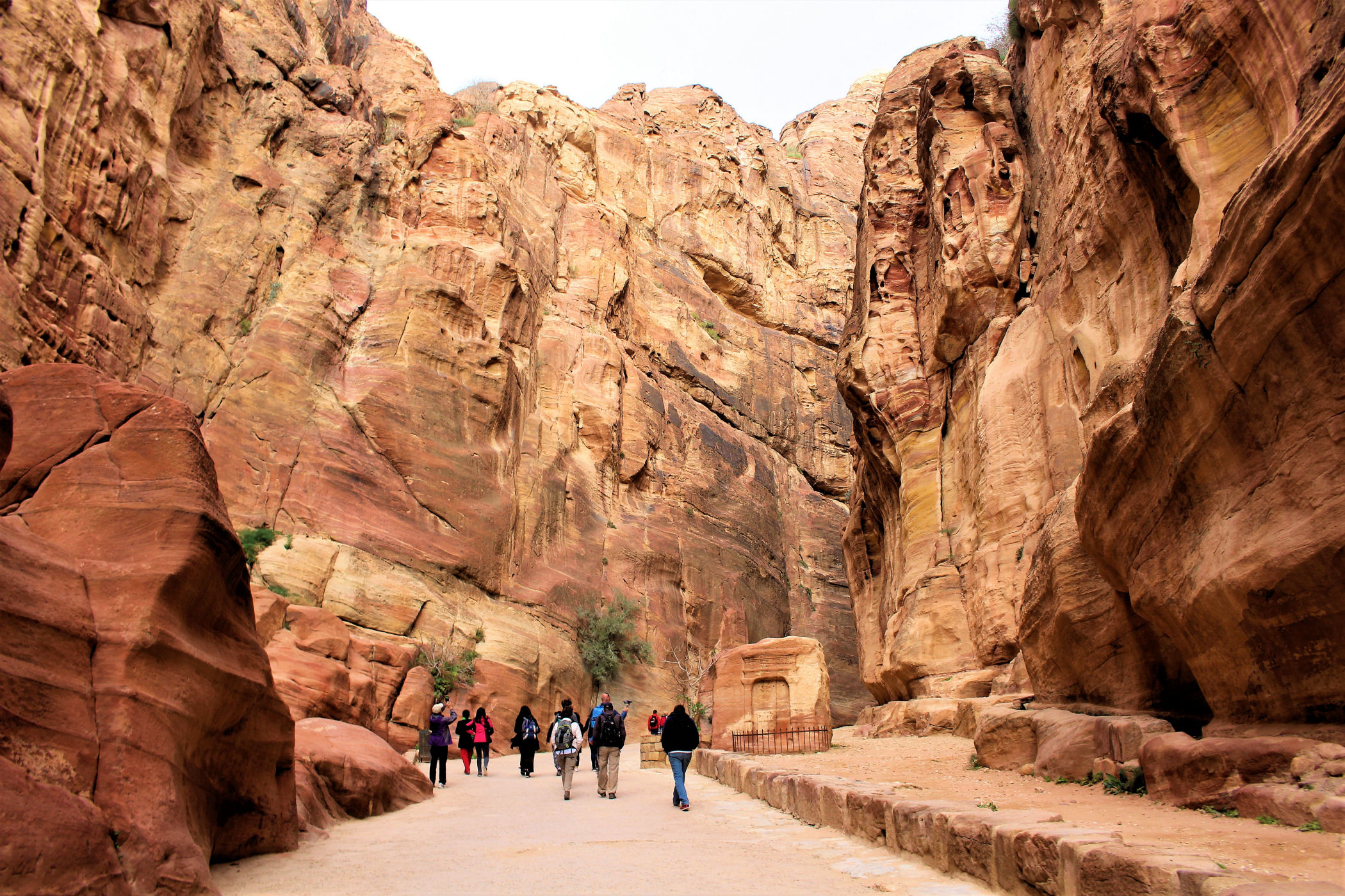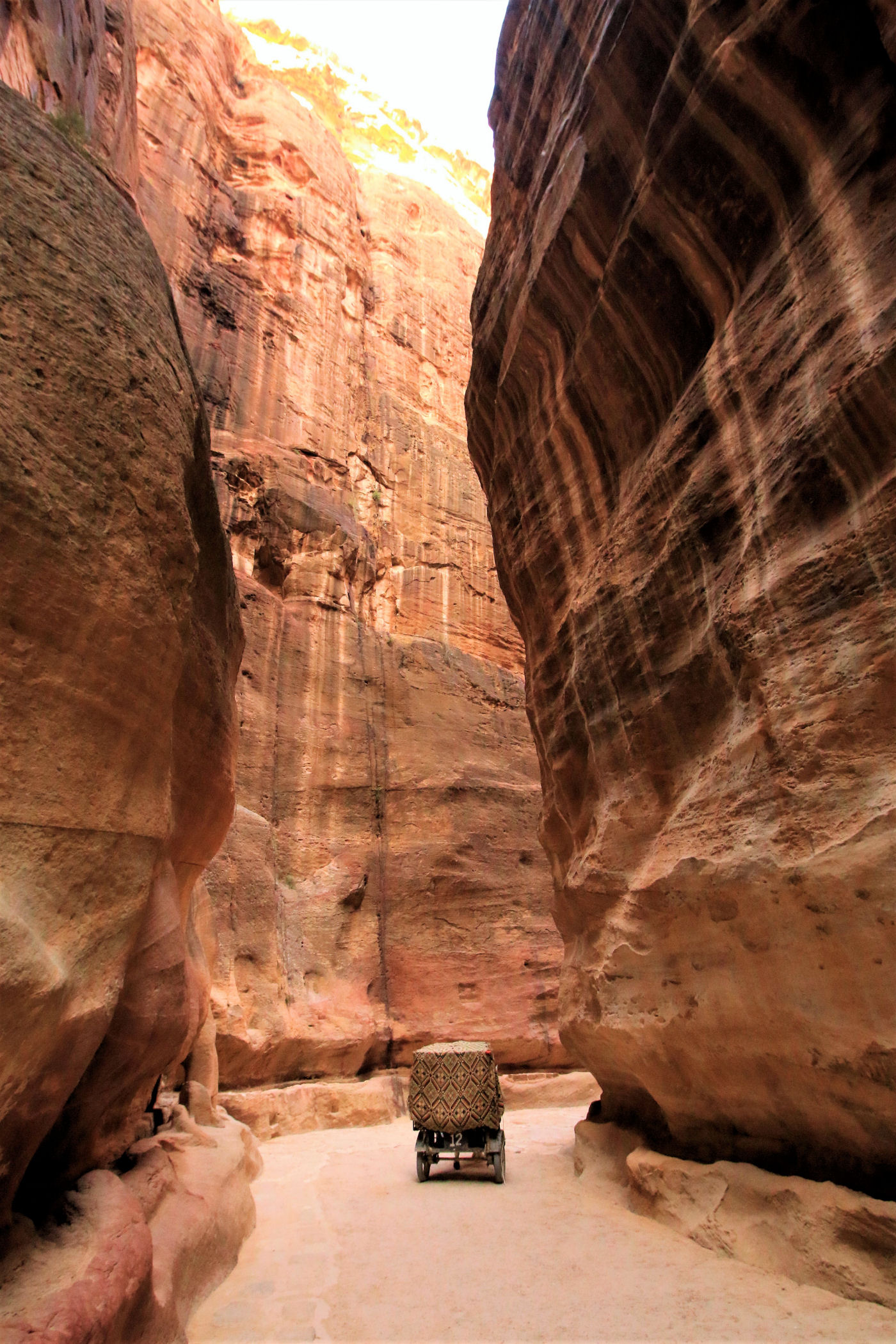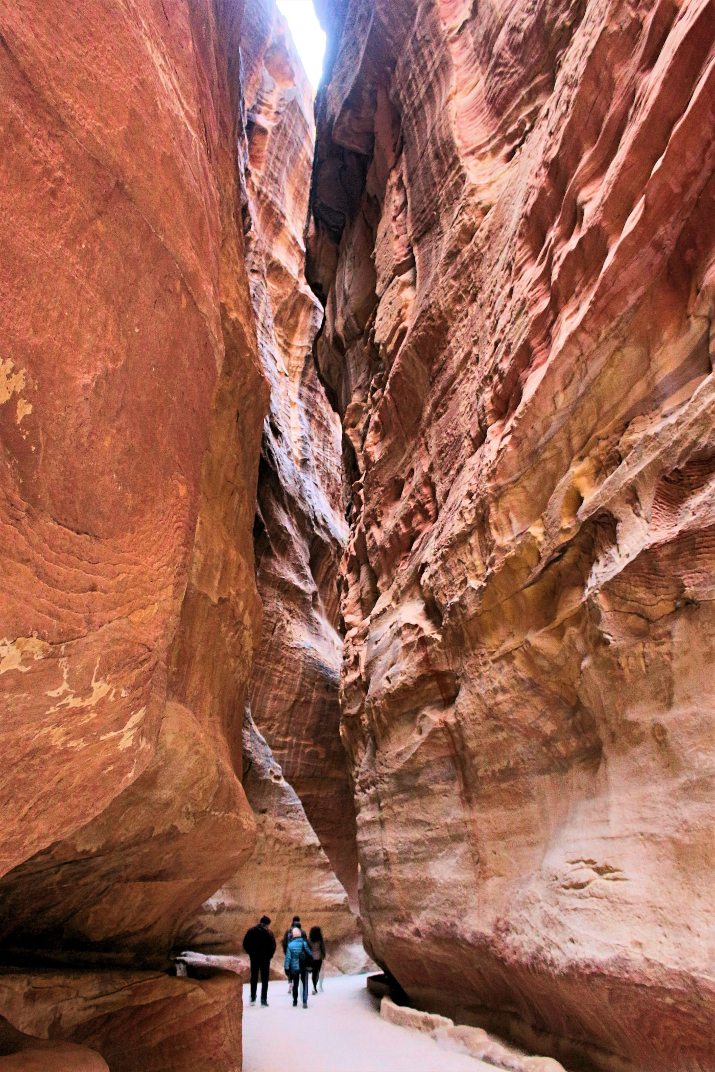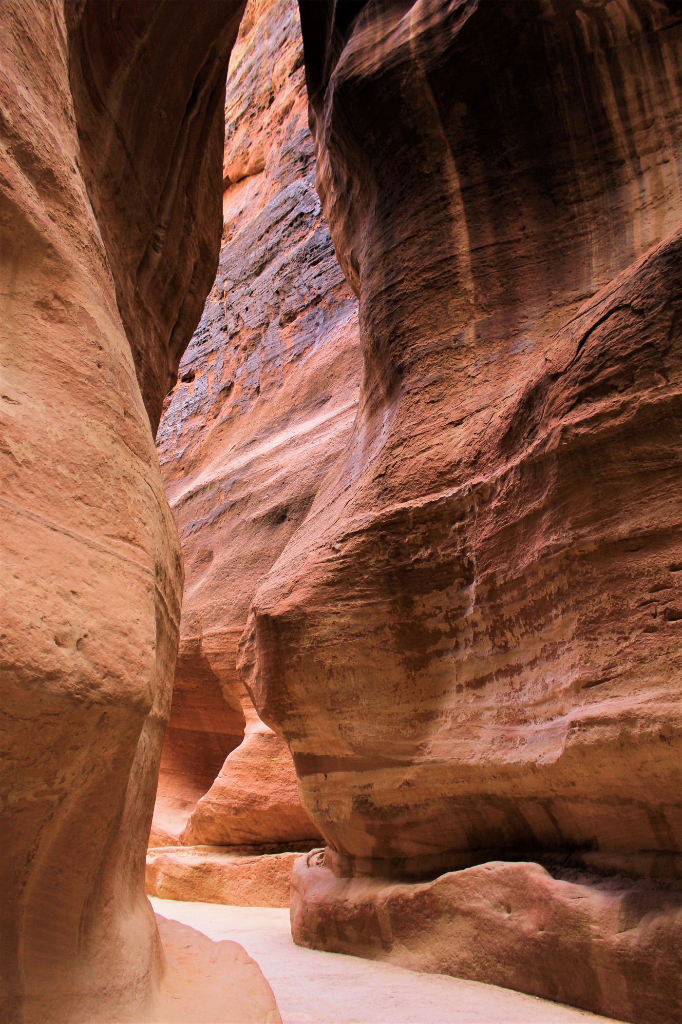 Mniej więcej 1,5 kilometra dalej droga nagle zwęża się i wchodzimy w krainę bajecznego czerwonego kanionu. Jego długość to około 1 km. Po obu stronach otoczony jest strzelistymi klifami o wysokości do 80 metrów. Kanion ma unikalny geologicznie krajobraz na świecie. Wyrzeźbiona z bladoczerwonego piaskowca wschodnia strona tego obszaru jest ograniczona murem królewskim. Gdy docieramy do końca Siq, przez wąską szczelinę ukazuje nam się słynny Skarbiec.