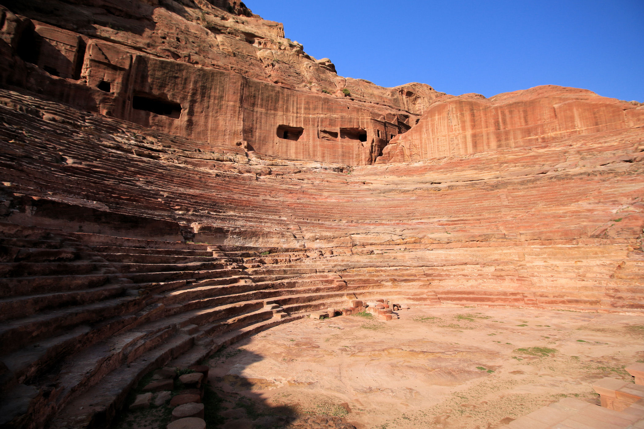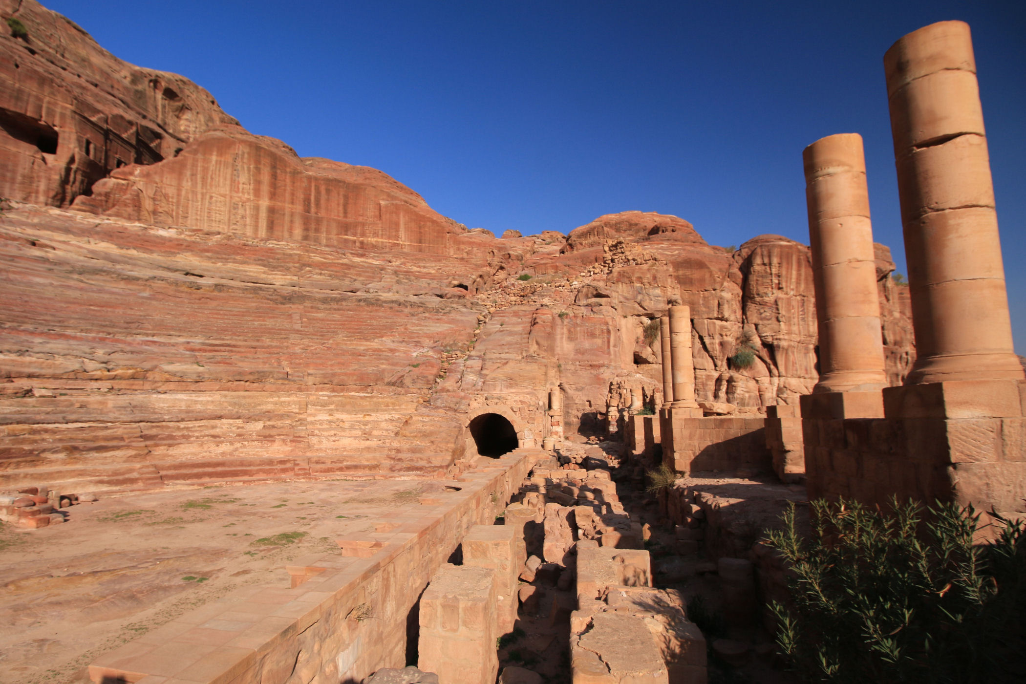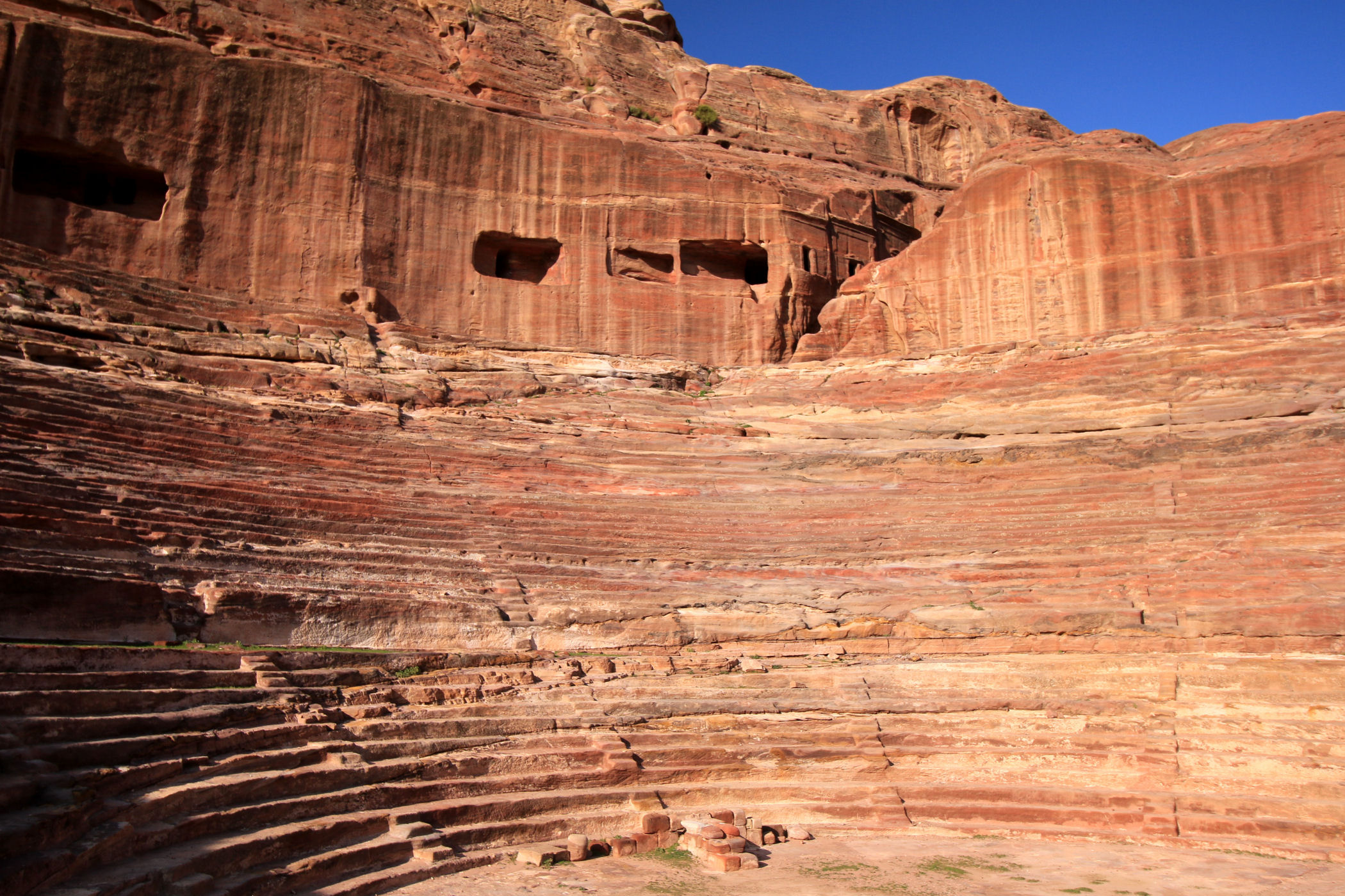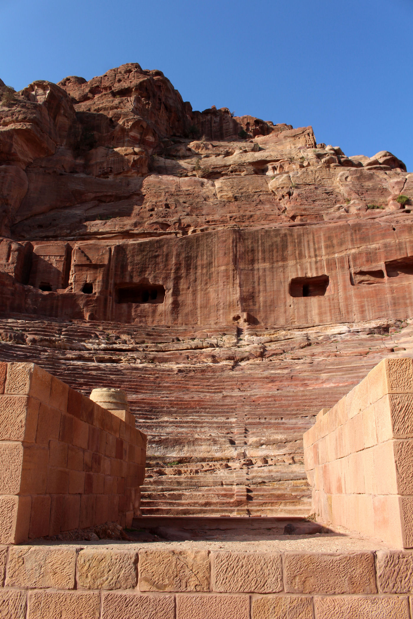 I tak po prawie 3 km docieramy do ogromnego rzymskiego Amfiteatru. To jeden z największych obiektów w Petrze, który zbudowany był w I w. n.e. na 6 ( a nawet10 tysięcy ) widzów. Powstał za panowania Aretasa IV. , ale rozbudowany po zajęciu Petry przez Trajana. Znaczna część teatru została wyrzeźbiona w litej skale co nadaje mu niesamowitą kolorystykę. Zbudowano jedynie scenę i ścianę zewnętrzną. Widownia teatru składa się z trzech poziomych sekcji siedzeń oddzielonych korytarzami. Amfiteatr widoczny jest w całej okazałości ze szlaku wiodącego nad Skarbiec, który zaczyna się tuż za nim po prawej stronie – opis TUTAJ.