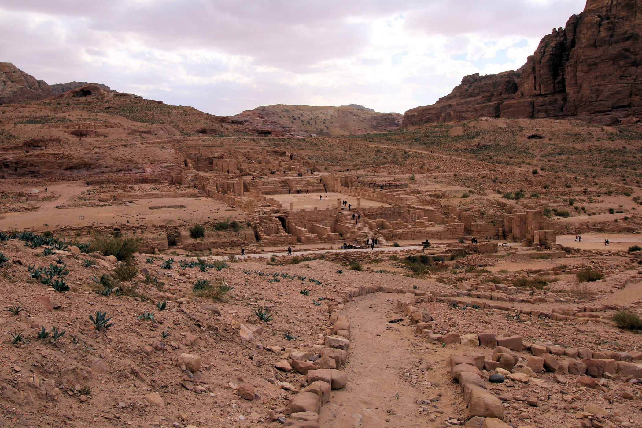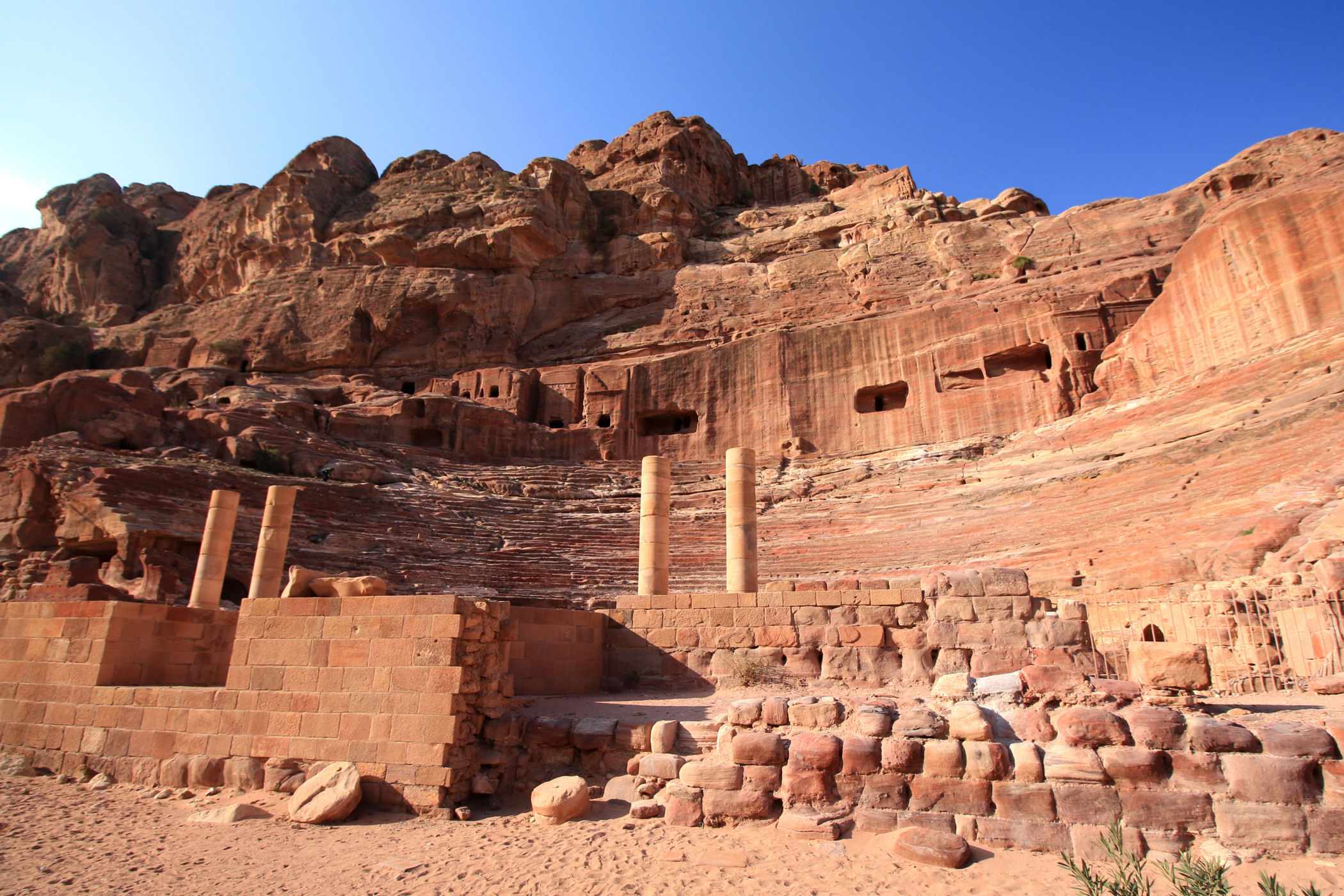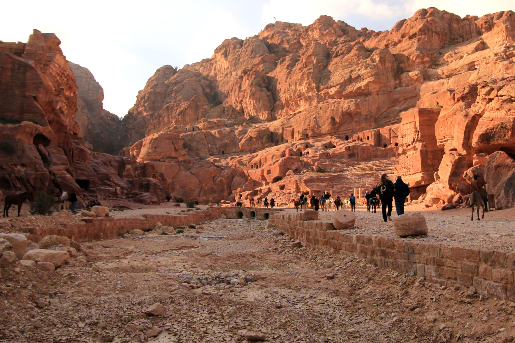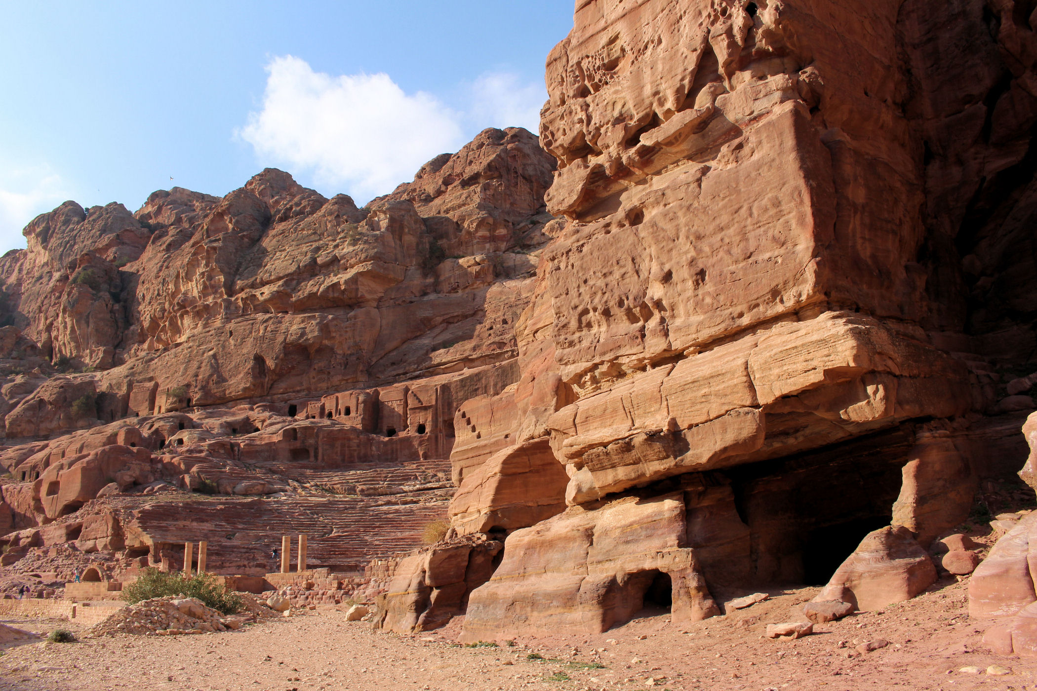 I tak po prawie 3 km docieramy do ogromnego rzymskiego Amfiteatru. To jeden z największych obiektów w Petrze, który zbudowany był w I w. n.e. na 6 ( a nawet10 tysięcy ) widzów. Powstał za panowania Aretasa IV. , ale rozbudowany po zajęciu Petry przez Trajana. Znaczna część teatru została wyrzeźbiona w litej skale co nadaje mu niesamowitą kolorystykę. Zbudowano jedynie scenę i ścianę zewnętrzną. Widownia teatru składa się z trzech poziomych sekcji siedzeń oddzielonych korytarzami. Amfiteatr widoczny jest w całej okazałości ze szlaku wiodącego nad Skarbiec, który zaczyna się tuż za nim po prawej stronie – opis TUTAJ.