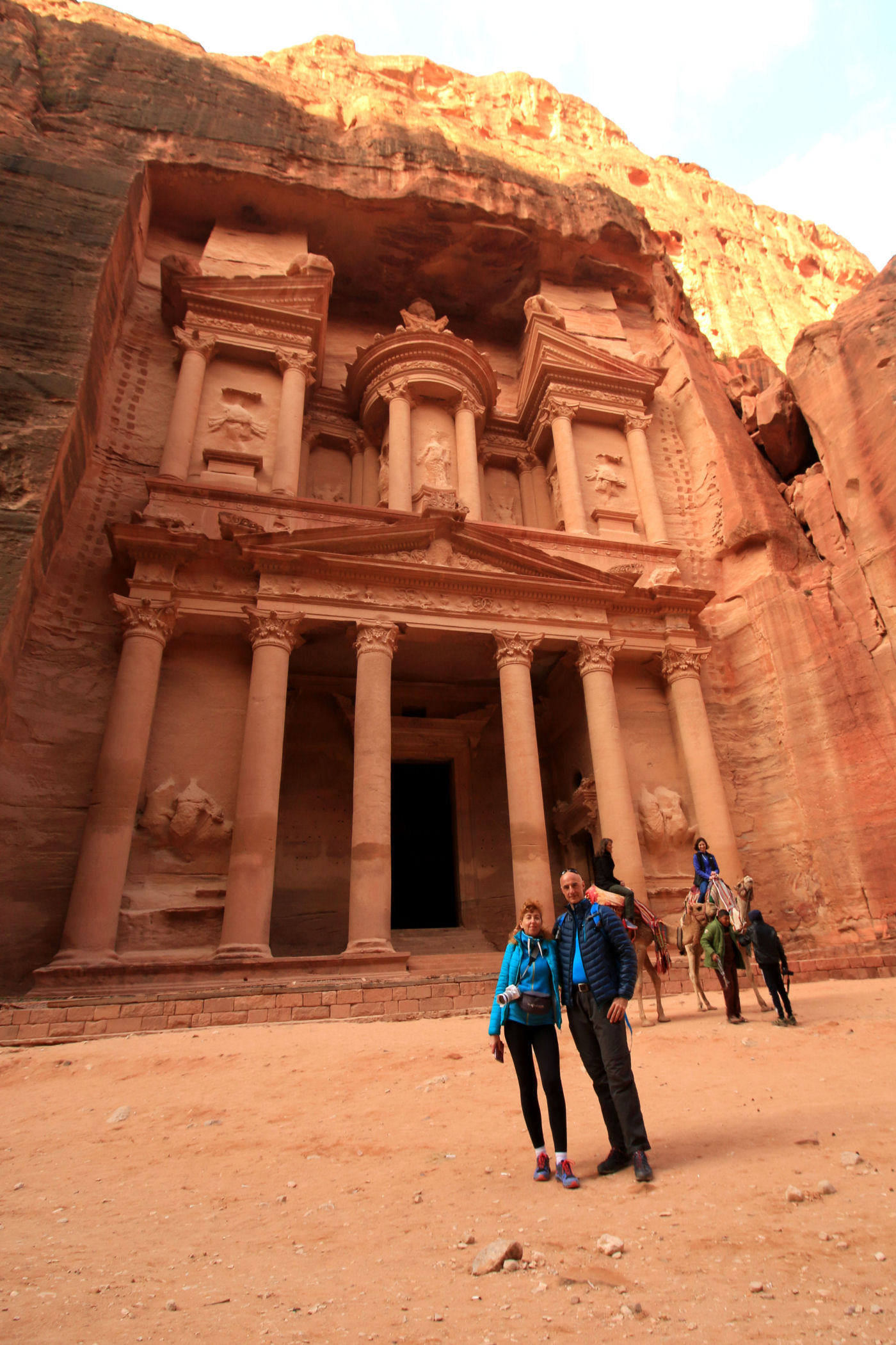 To najbardziej znane miejsce, stanowiące jakby wizerunek i reklamówkę Petry. Fasada Skarbca pojawia się na milionach zdjęć w przewodnikach, pamiątkach i relacjach. Znana jest z filmu „Indiana Jones i ostatnia krucjata” jako miejsce ukrycia Świętego Graala. Samo miejsce dość zaskakuje , bo okazuje się, ze jesteśmy na wielkim placu wciśniętym między pionowe skały. Budynek Skarbca to piętrowa budowla z częścią podziemną pochodząca z I-II w. n.e. Fasada ma wysokość ponad 40 m oraz szerokość 25 m. Wykuta jest z różowego piaskowca, zależnie od pory i oświetlenia dnia zmienia kolory. Dolne piętro fasady posiada sześć kolumn zwieńczonych korynckimi kapitelami, w tym dwie wolnostojące, podtrzymujących zdobione belkowanie. W stanie szczątkowym zachowały się skrajnie figury orłów i jeźdźców. Górne piętro budowli zajmuje okrągły budynek, otoczony podwójną kolumnadą. Do wnętrza budowli prowadzi 8-metrowe wejście główne. Niestety nie ma możliwości dostania się do środka. Choć nazwa wskazuje na przechowywanie tutaj skarbów, funkcja budowli, pozostaje nieznana. Była to albo świątynia, albo grobowiec któregoś z władców.