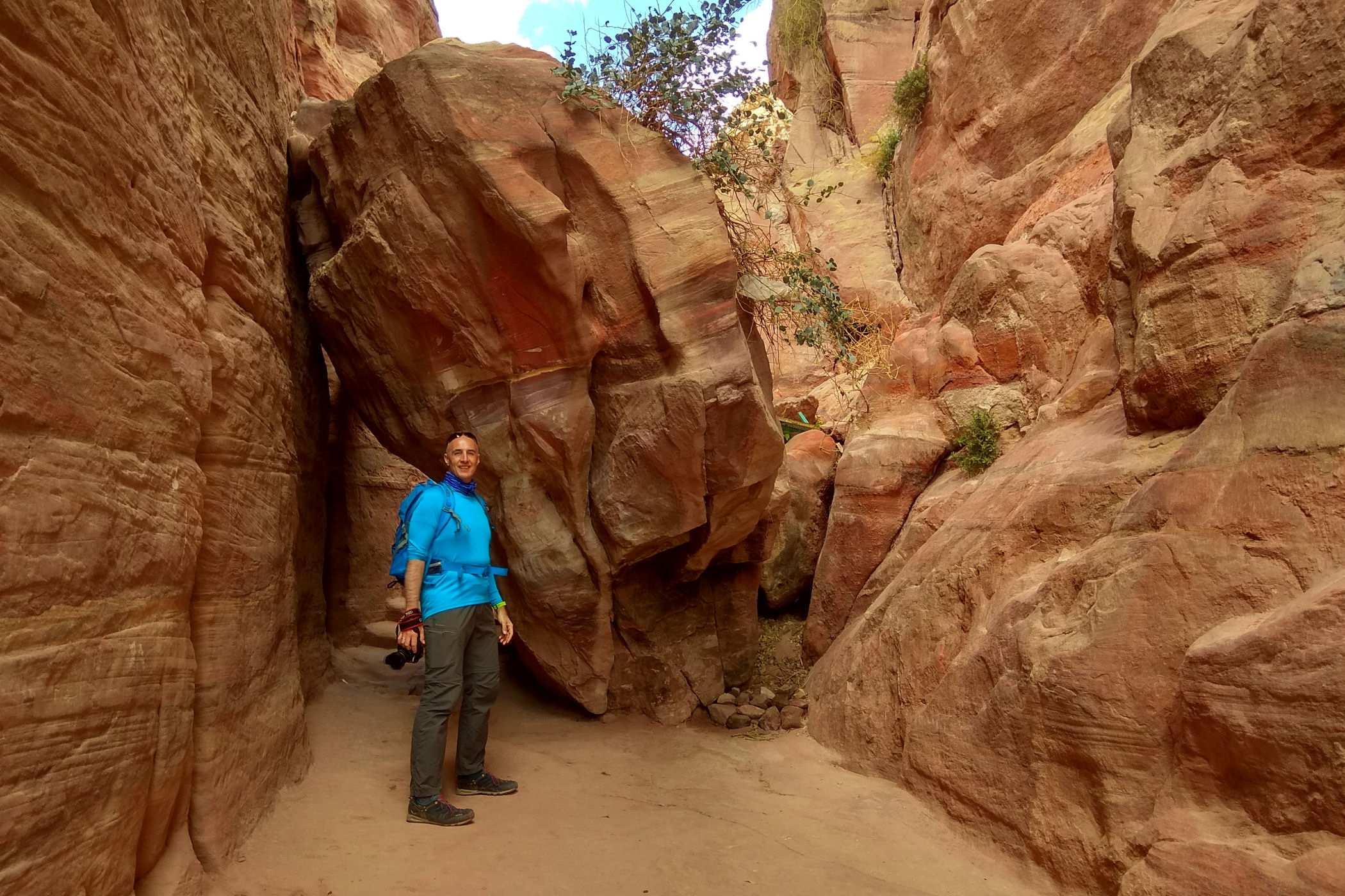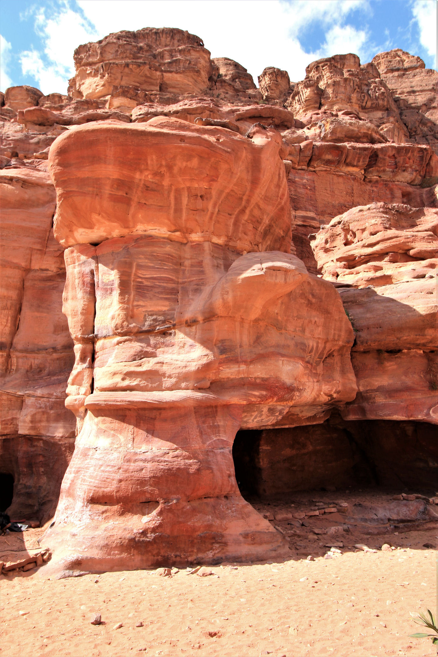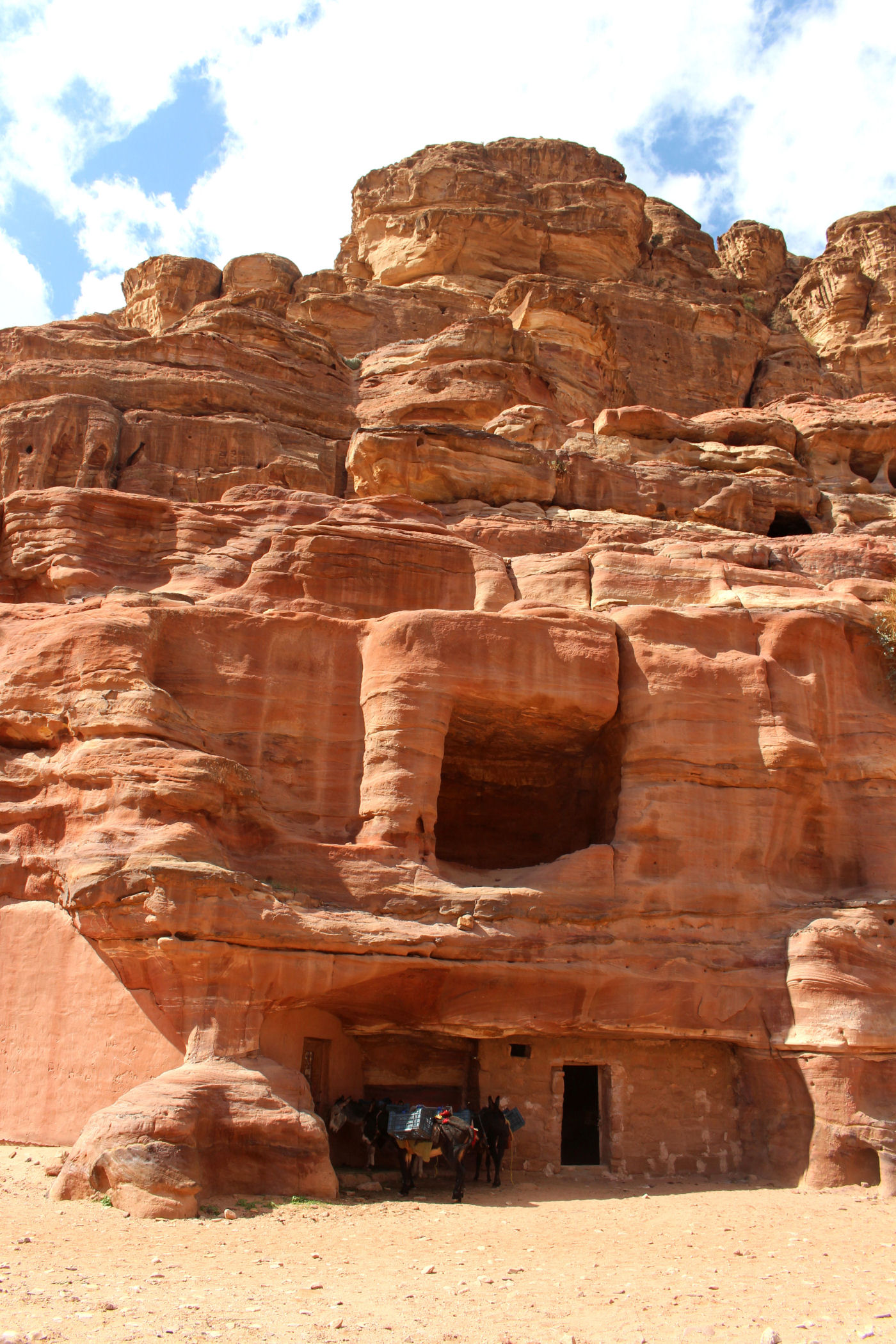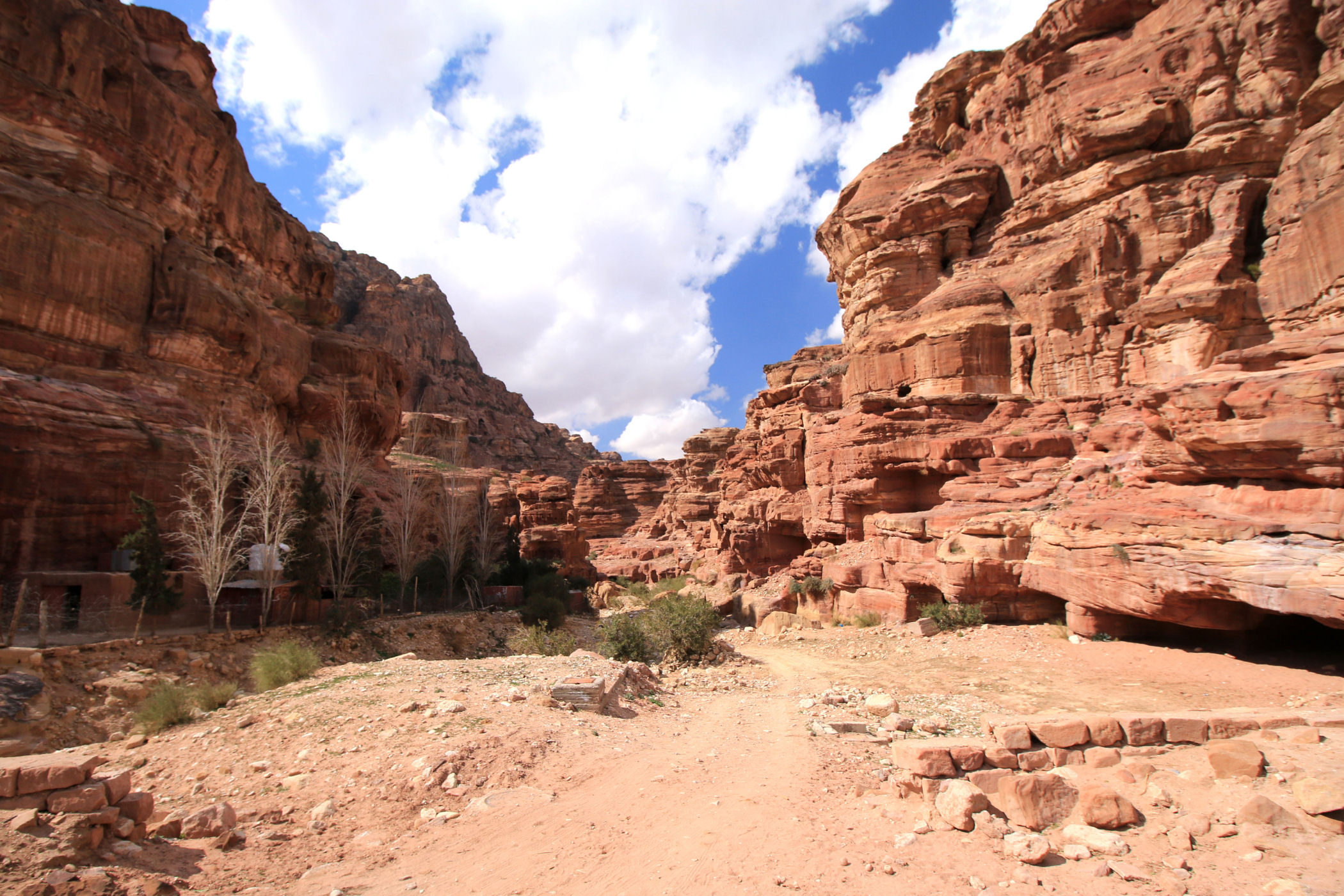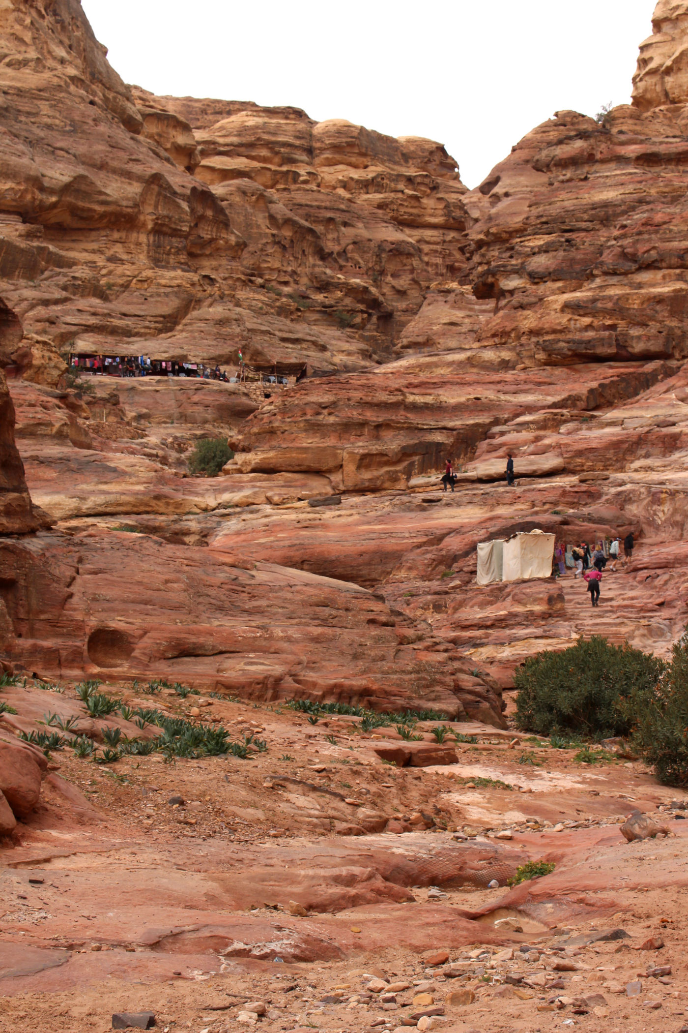 Pierwszy odcinek drogi jest dość płaski . Mamy tu fantastyczne kolorowe formacje skalne i … wykute w skale garaże. Tu czekają Beduini ze swoimi wielbłądami na turystów schodzących ze szklaku, aby zabrać ich w drogę powrotną Doliną Petry.