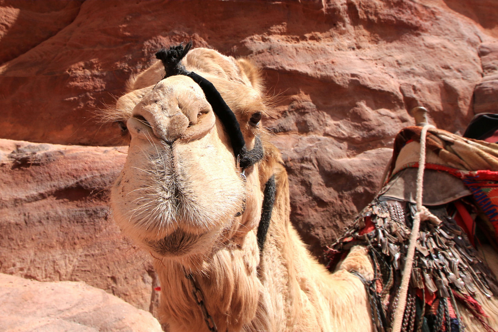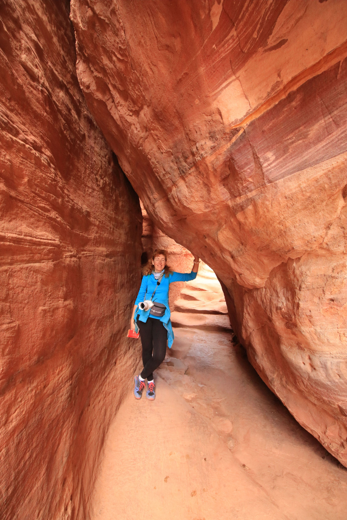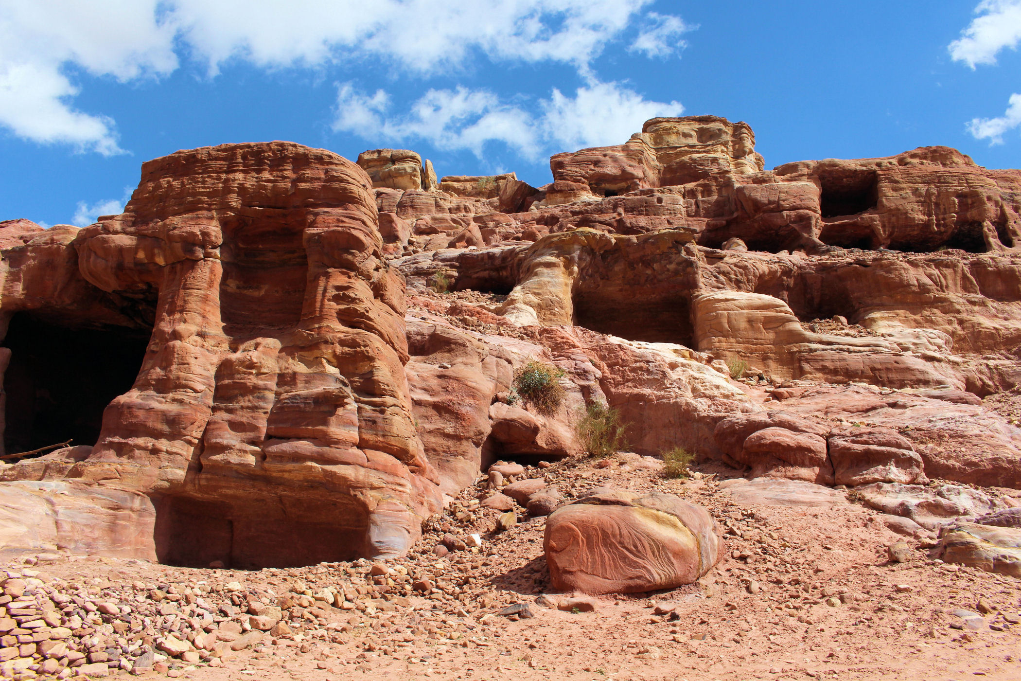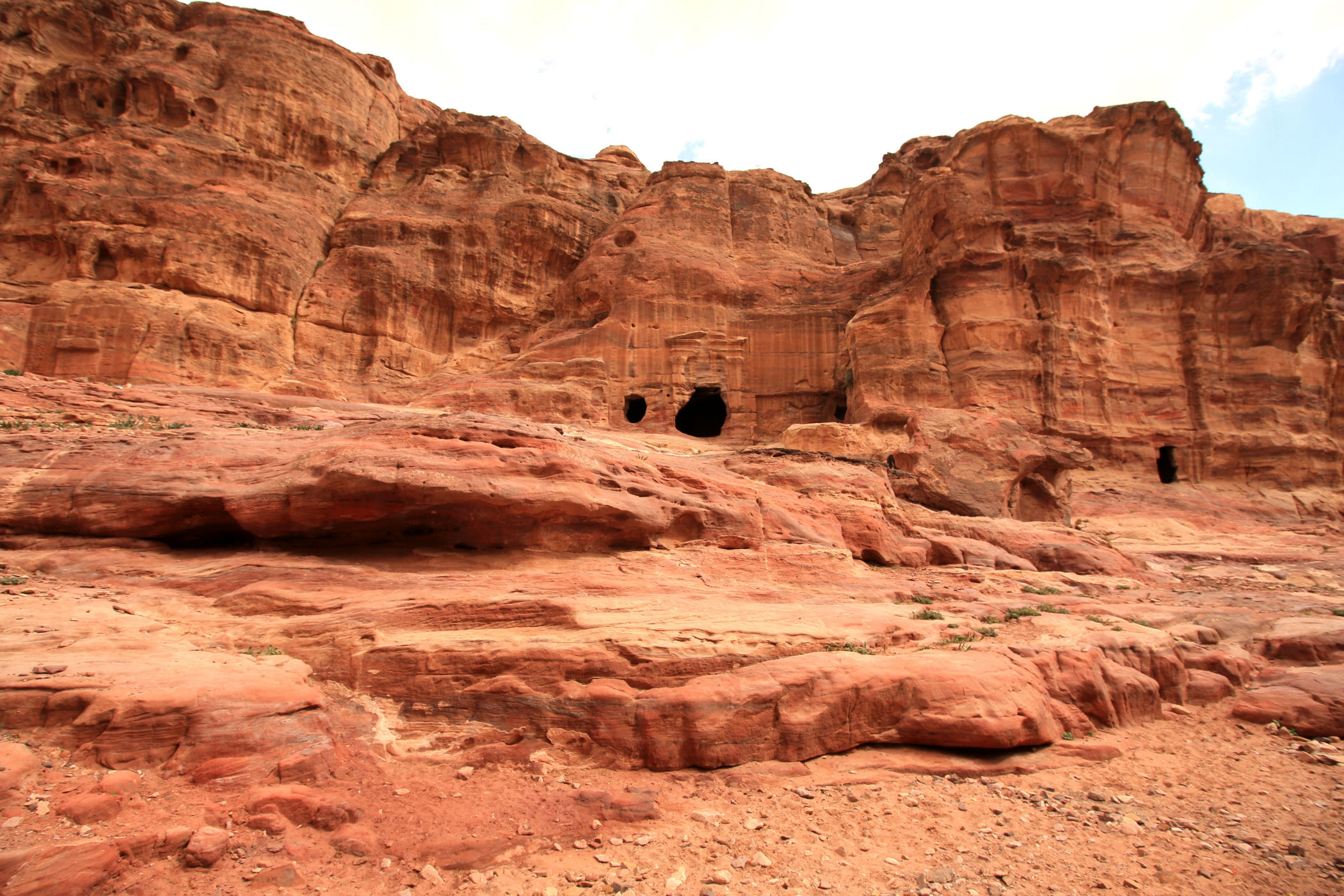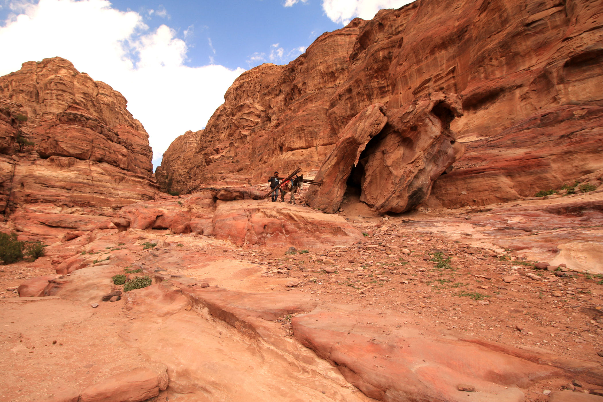 Pierwszy odcinek drogi jest dość płaski . Mamy tu fantastyczne kolorowe formacje skalne i … wykute w skale garaże. Tu czekają Beduini ze swoimi wielbłądami na turystów schodzących ze szklaku, aby zabrać ich w drogę powrotną Doliną Petry.