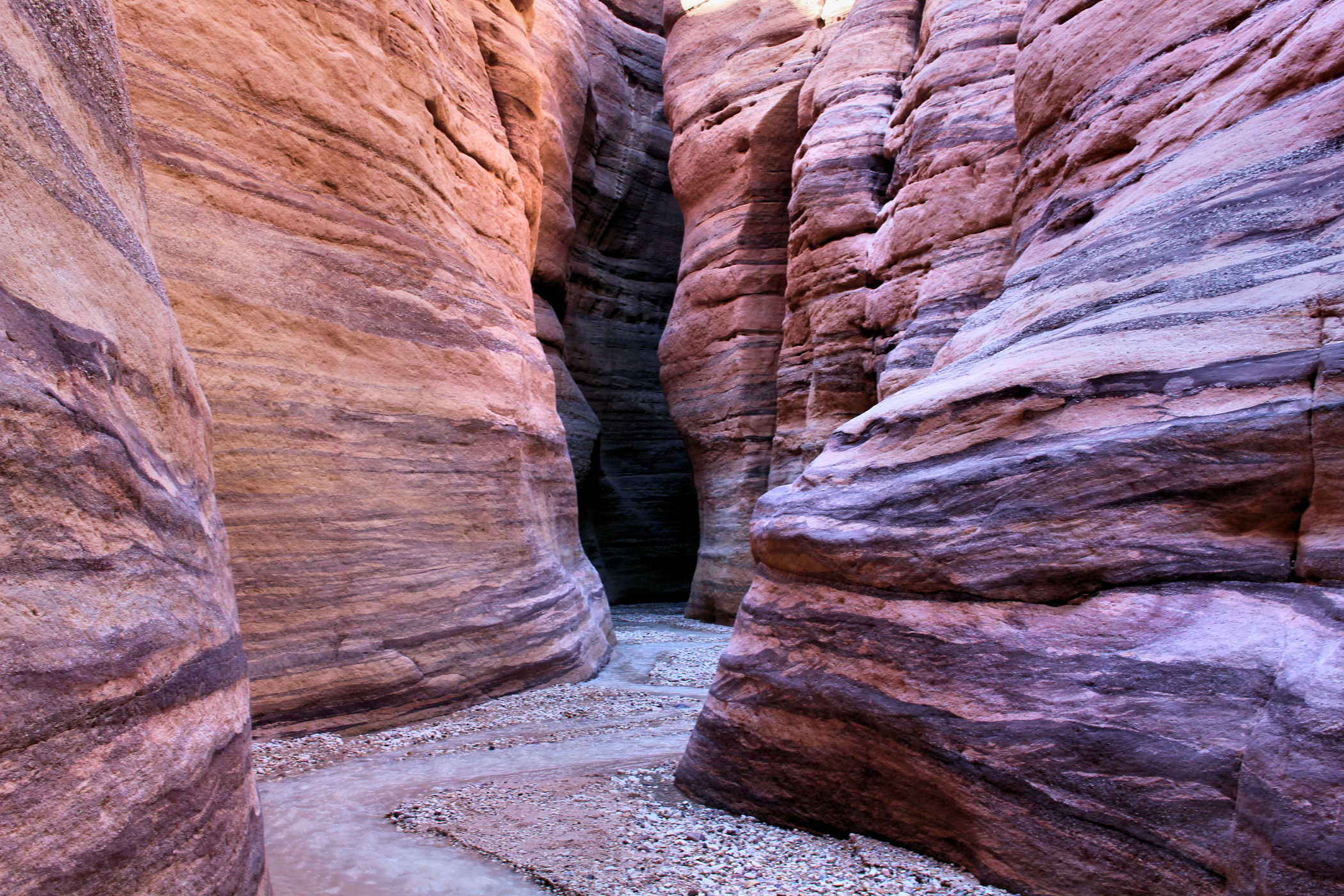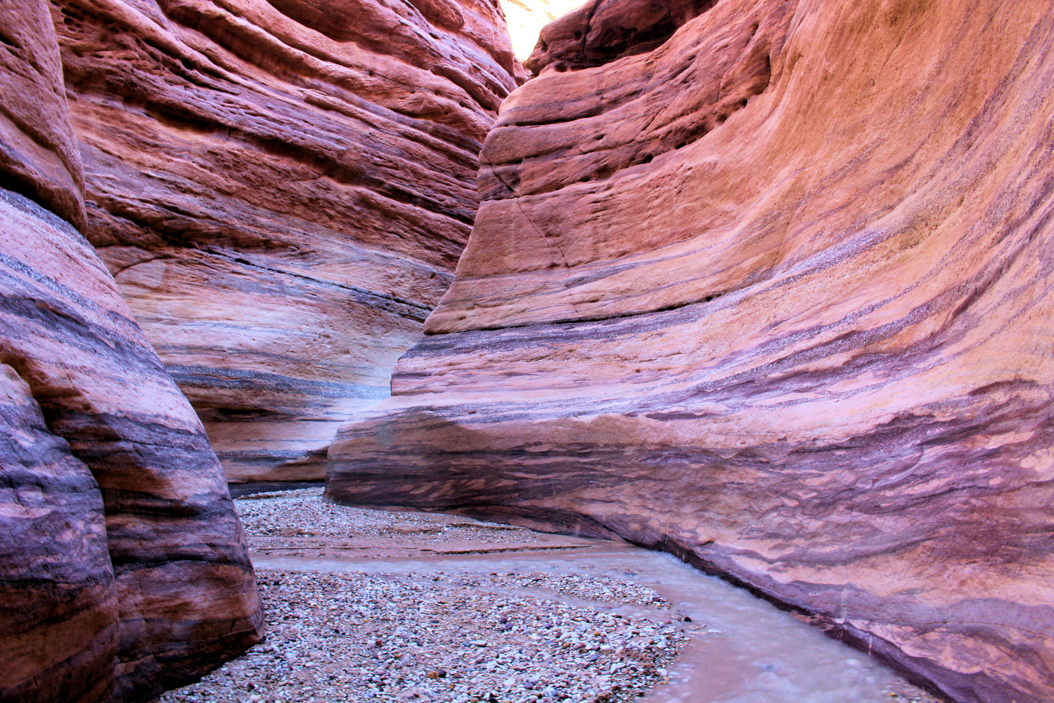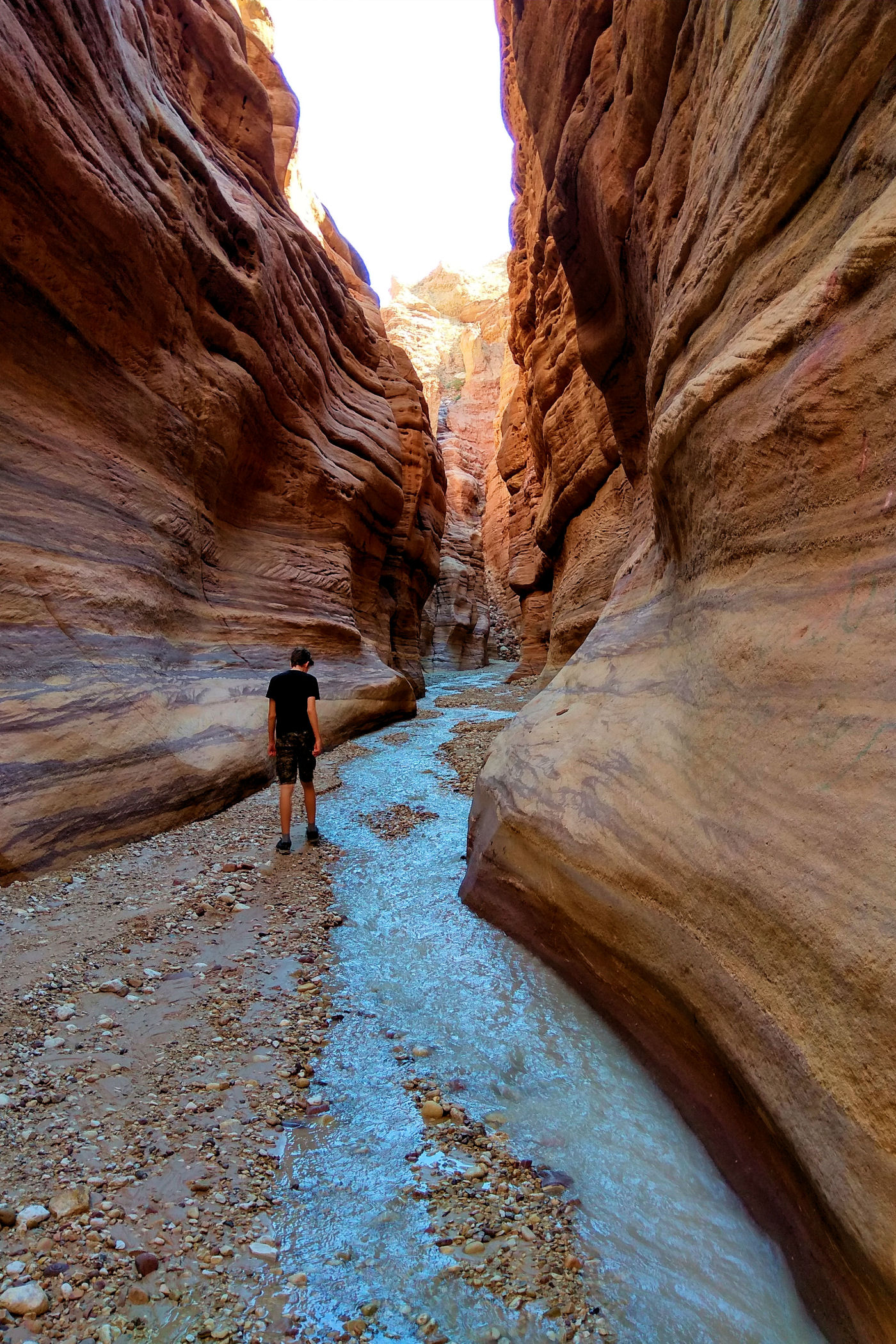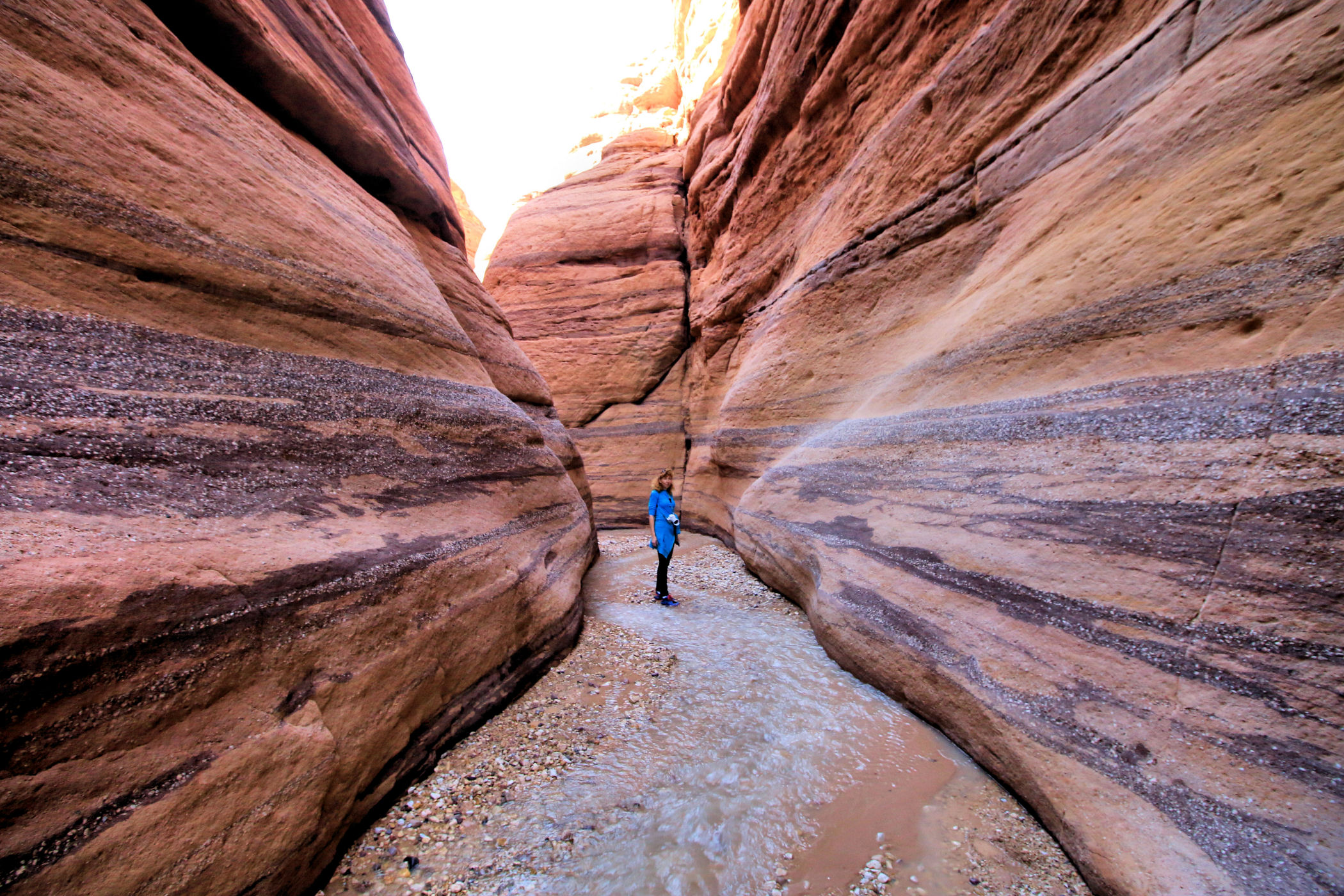 Mniej więcej po około 2km zaczyna się prawdziwa bajkowa kraina, kanion zamienia się w bardzo wąski, a wyżłobione przez wodę ściany przypominają kolorowy tort. Tu już jest na tyle wąsko, ze woda wypełnia prawie całą szerokość. Dochodzimy więc do miejsca, gdzie woda powoli zaczyna wlewać się do butów i zawracamy.