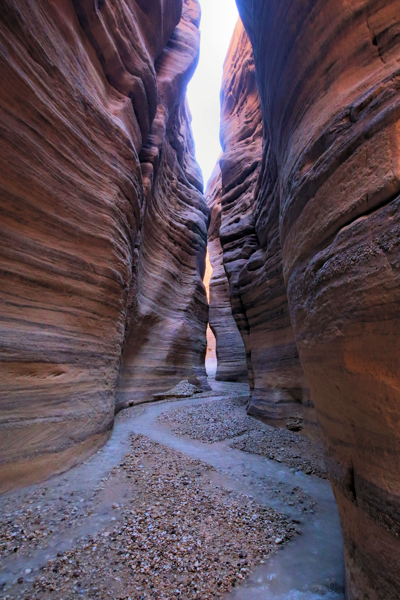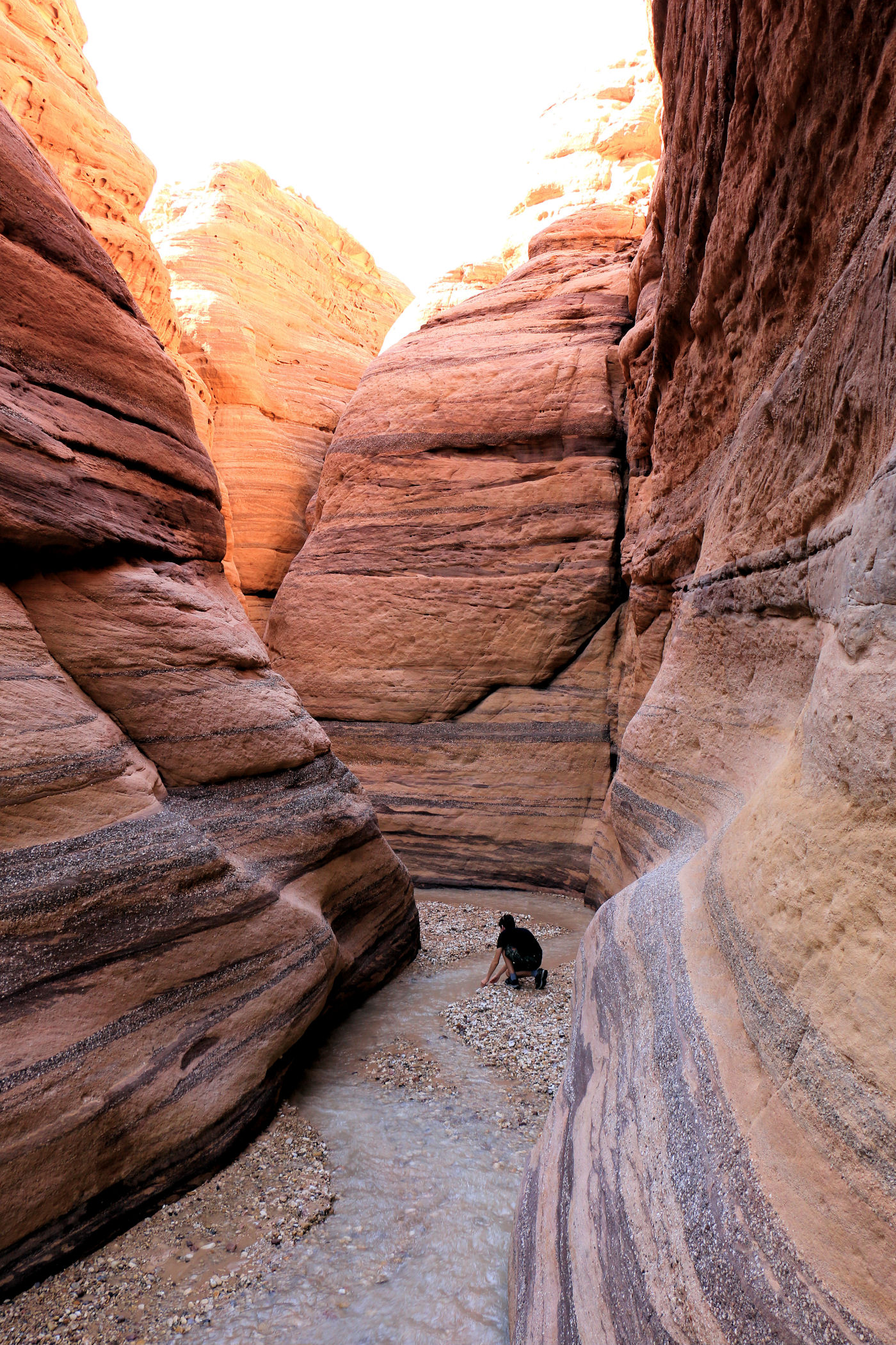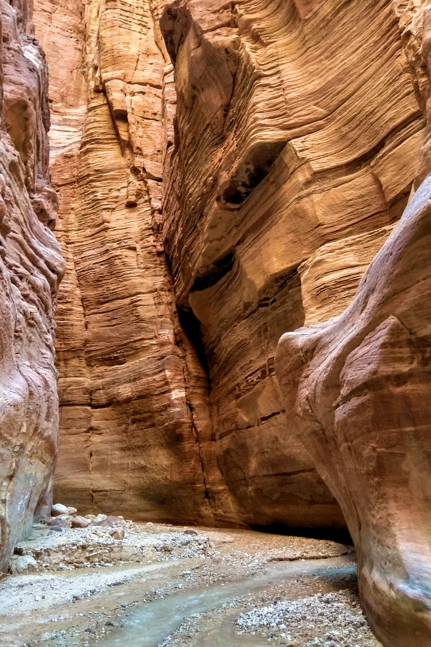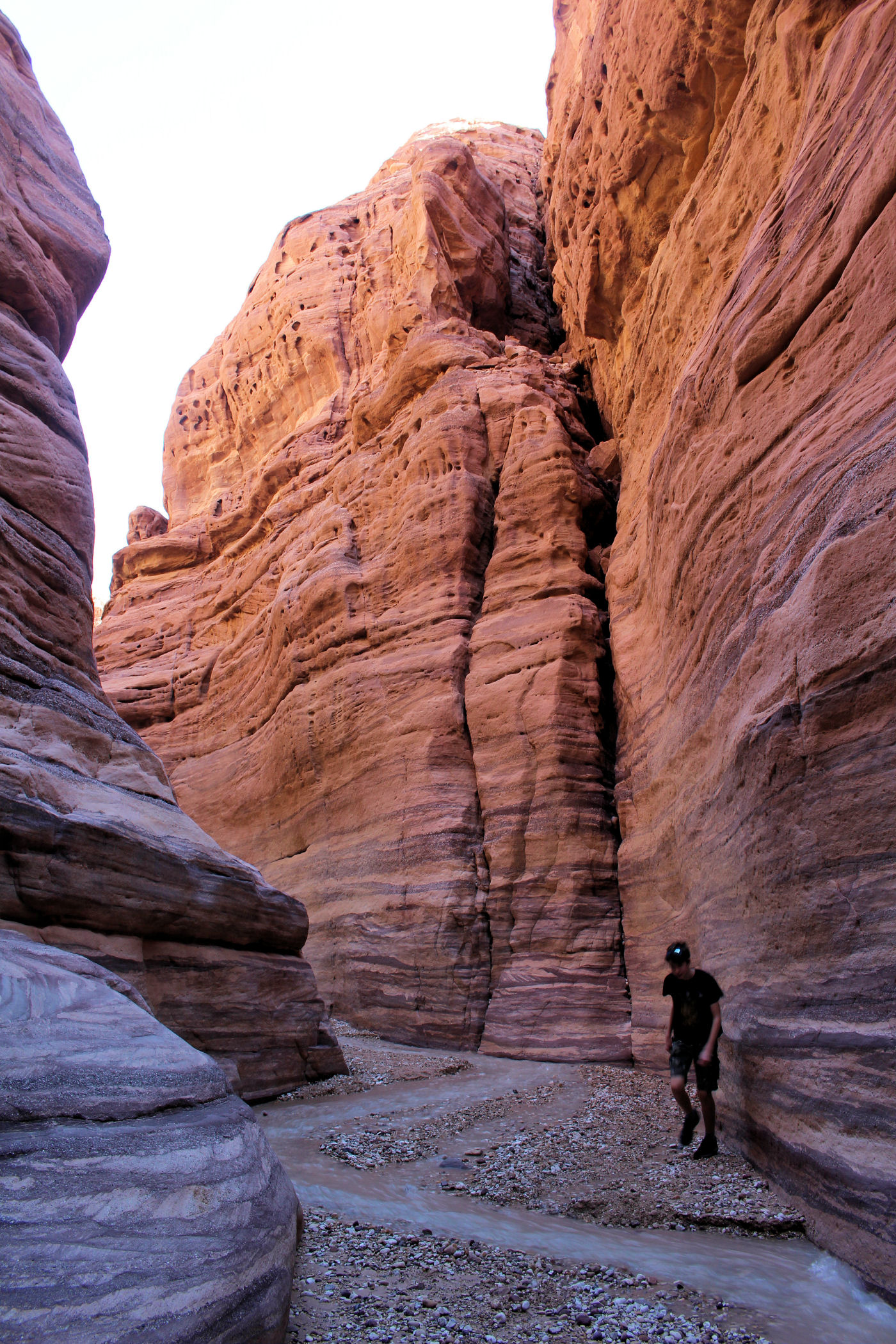 Mniej więcej po około 2km zaczyna się prawdziwa bajkowa kraina, kanion zamienia się w bardzo wąski, a wyżłobione przez wodę ściany przypominają kolorowy tort. Tu już jest na tyle wąsko, ze woda wypełnia prawie całą szerokość. Dochodzimy więc do miejsca, gdzie woda powoli zaczyna wlewać się do butów i zawracamy.