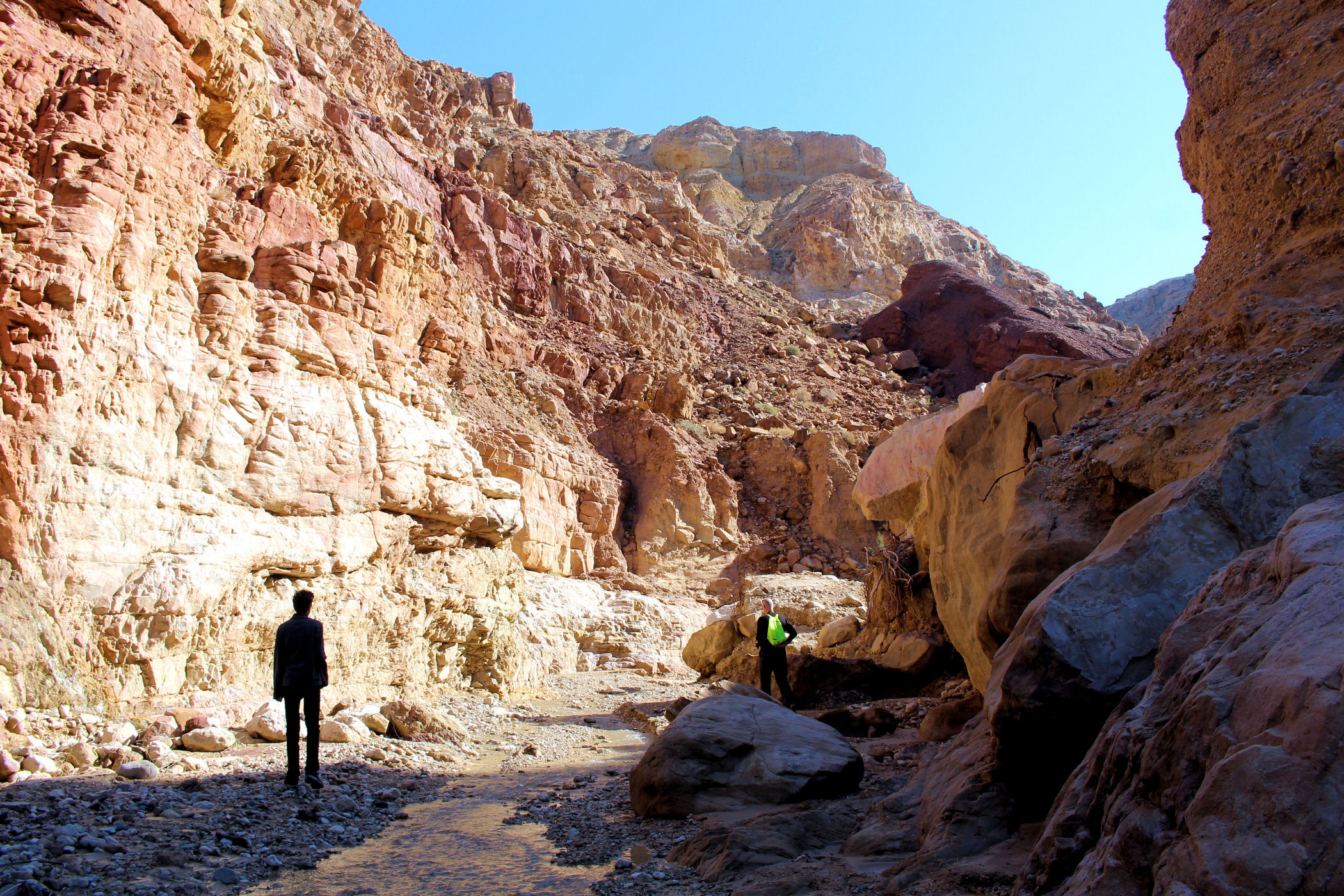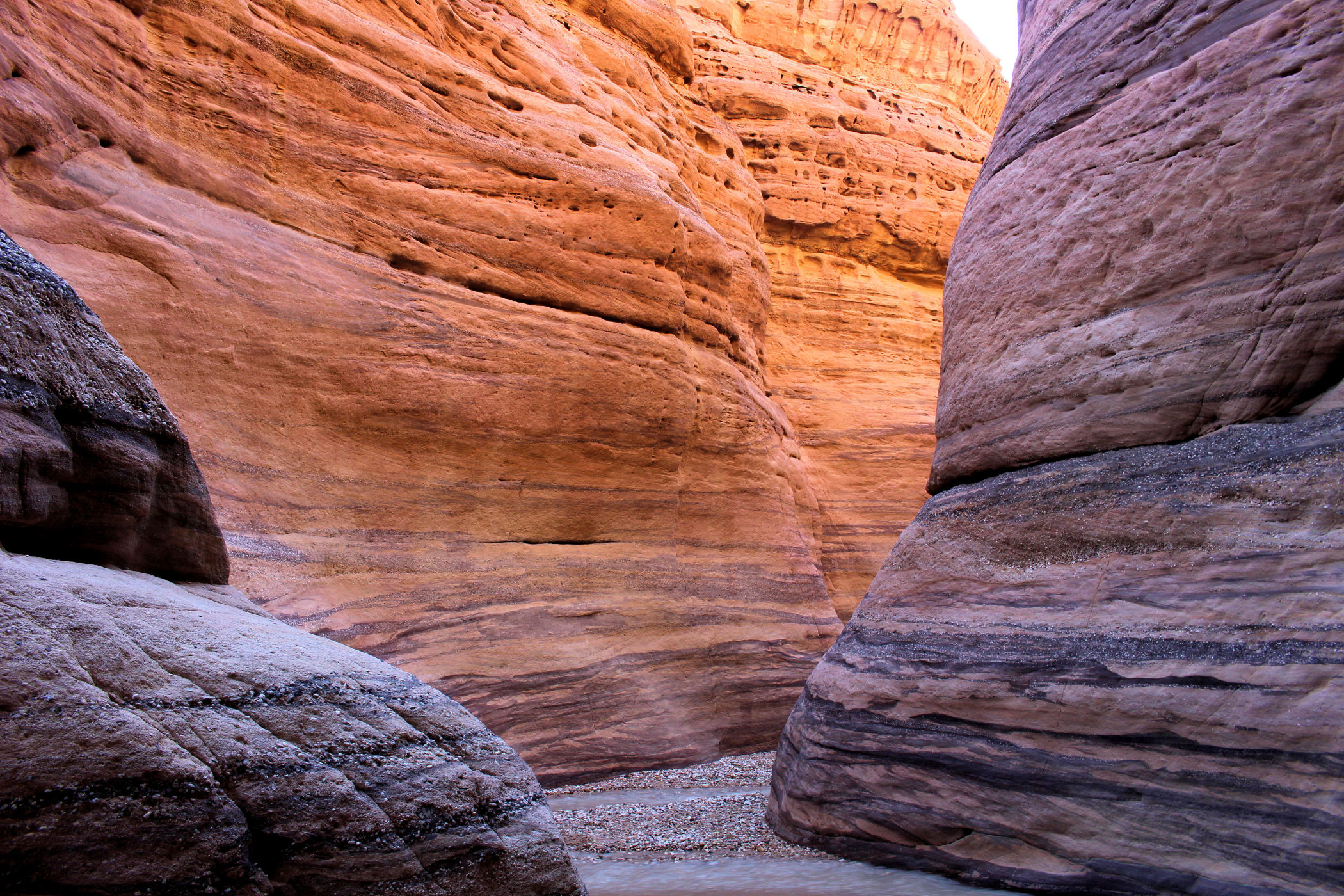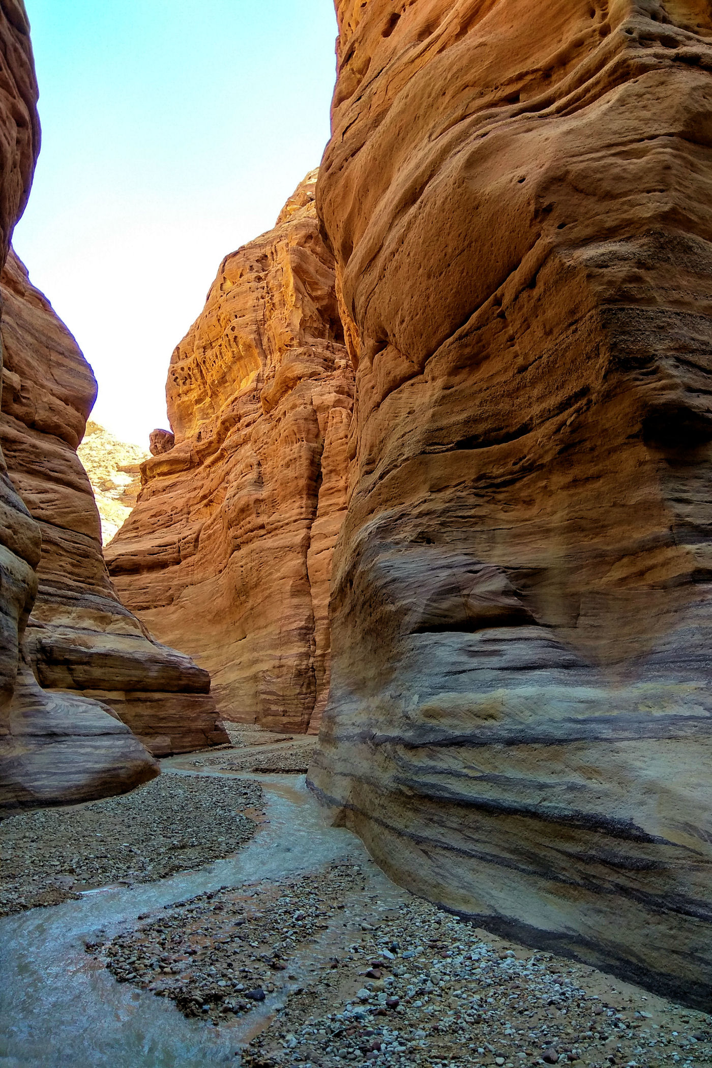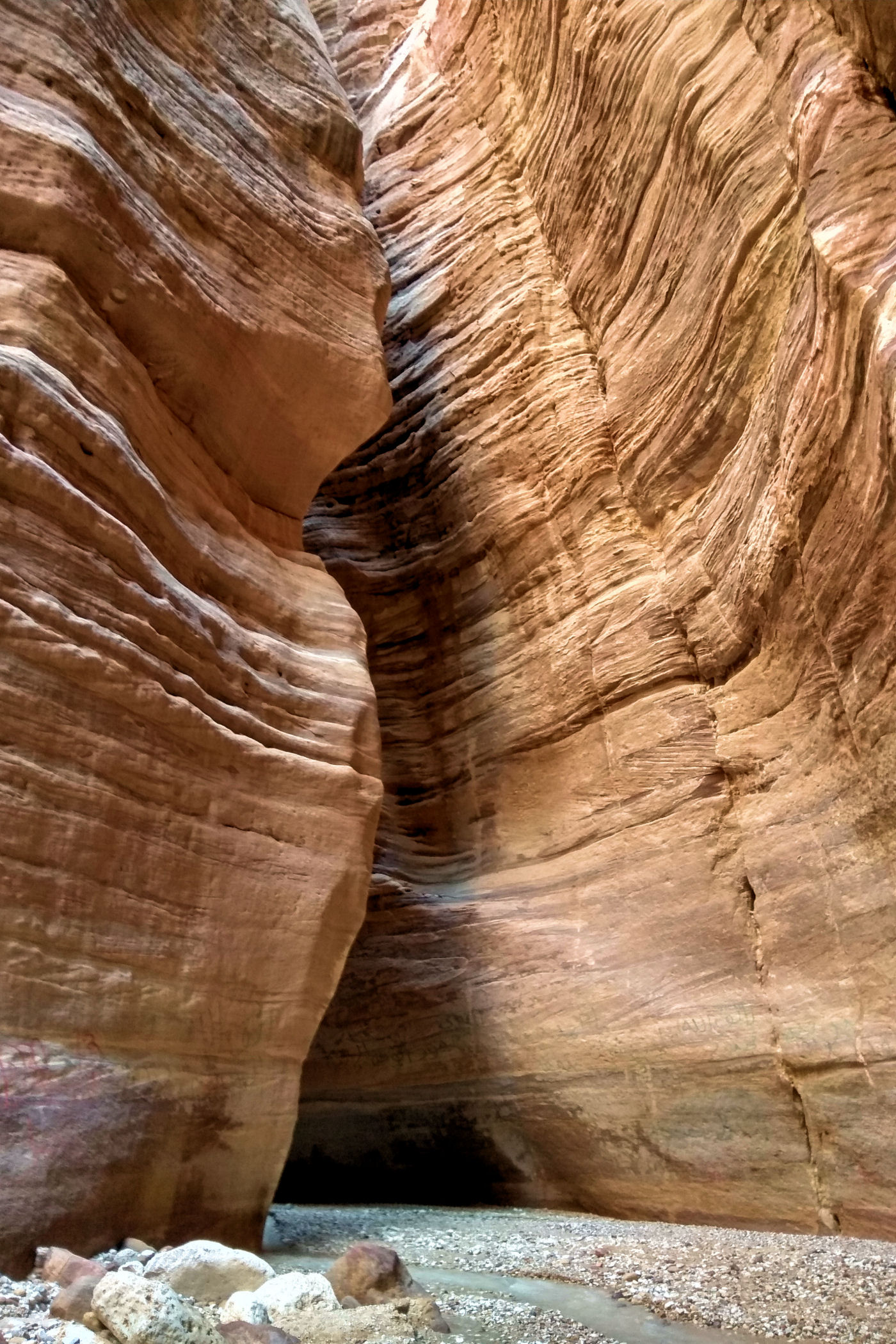 Mniej więcej po około 2km zaczyna się prawdziwa bajkowa kraina, kanion zamienia się w bardzo wąski, a wyżłobione przez wodę ściany przypominają kolorowy tort. Tu już jest na tyle wąsko, ze woda wypełnia prawie całą szerokość. Dochodzimy więc do miejsca, gdzie woda powoli zaczyna wlewać się do butów i zawracamy.