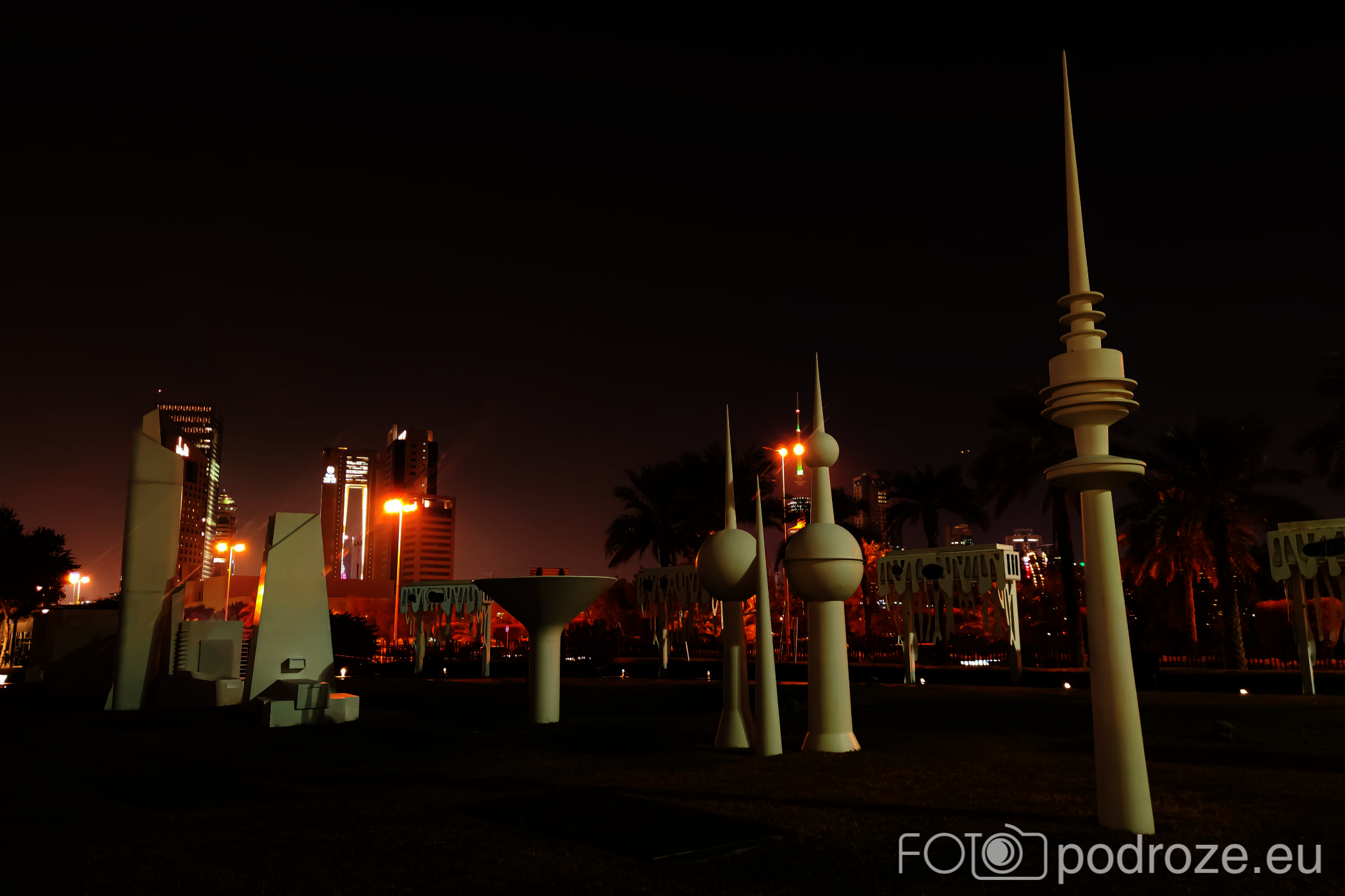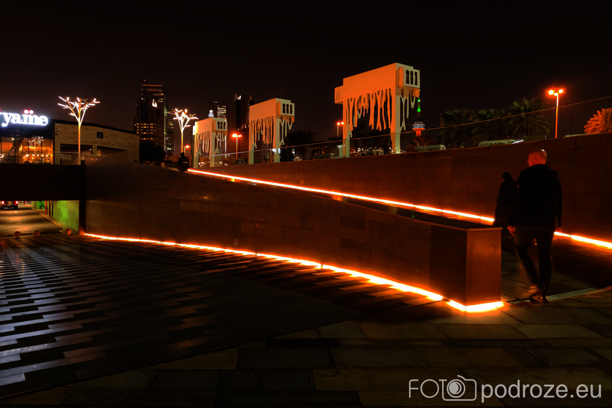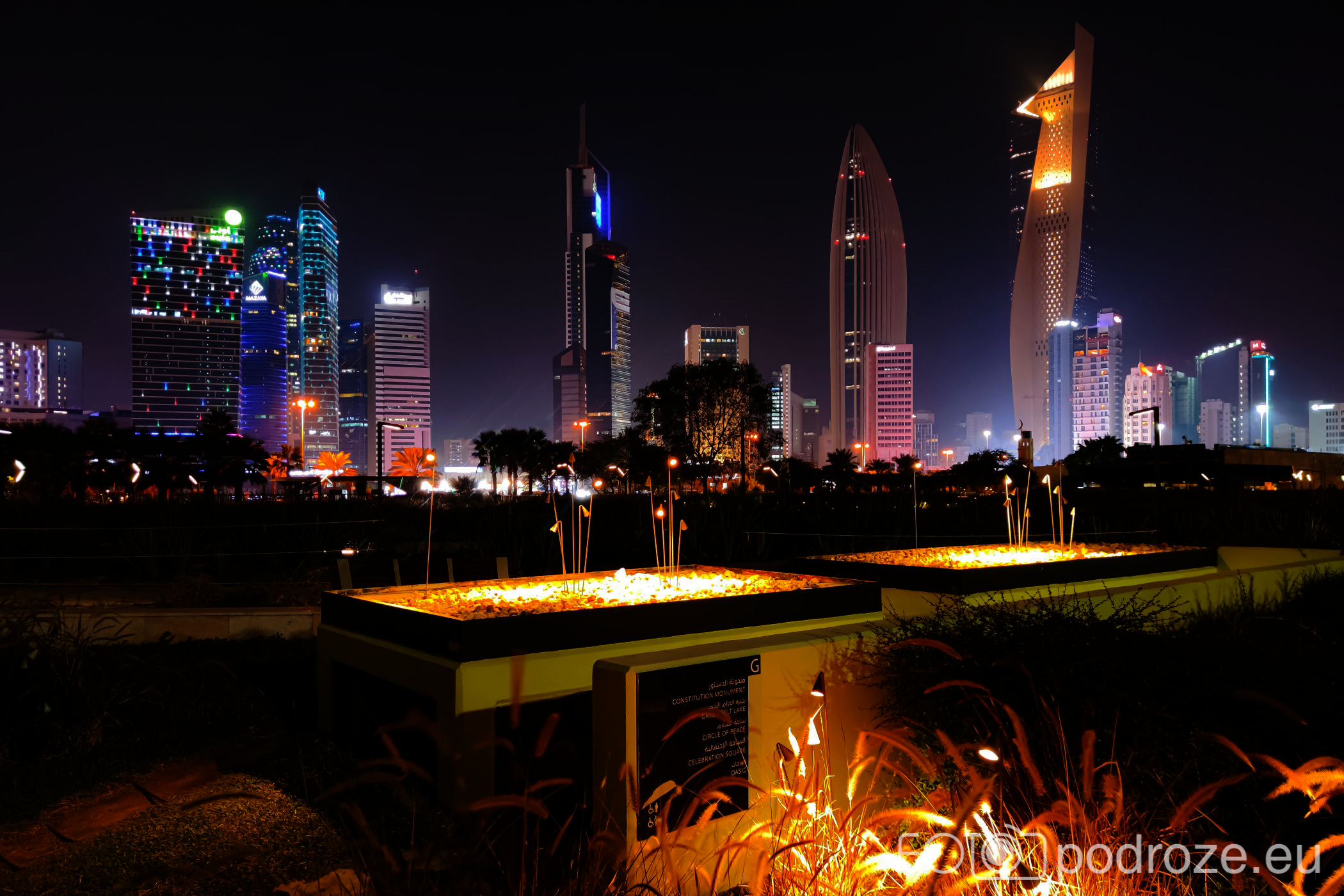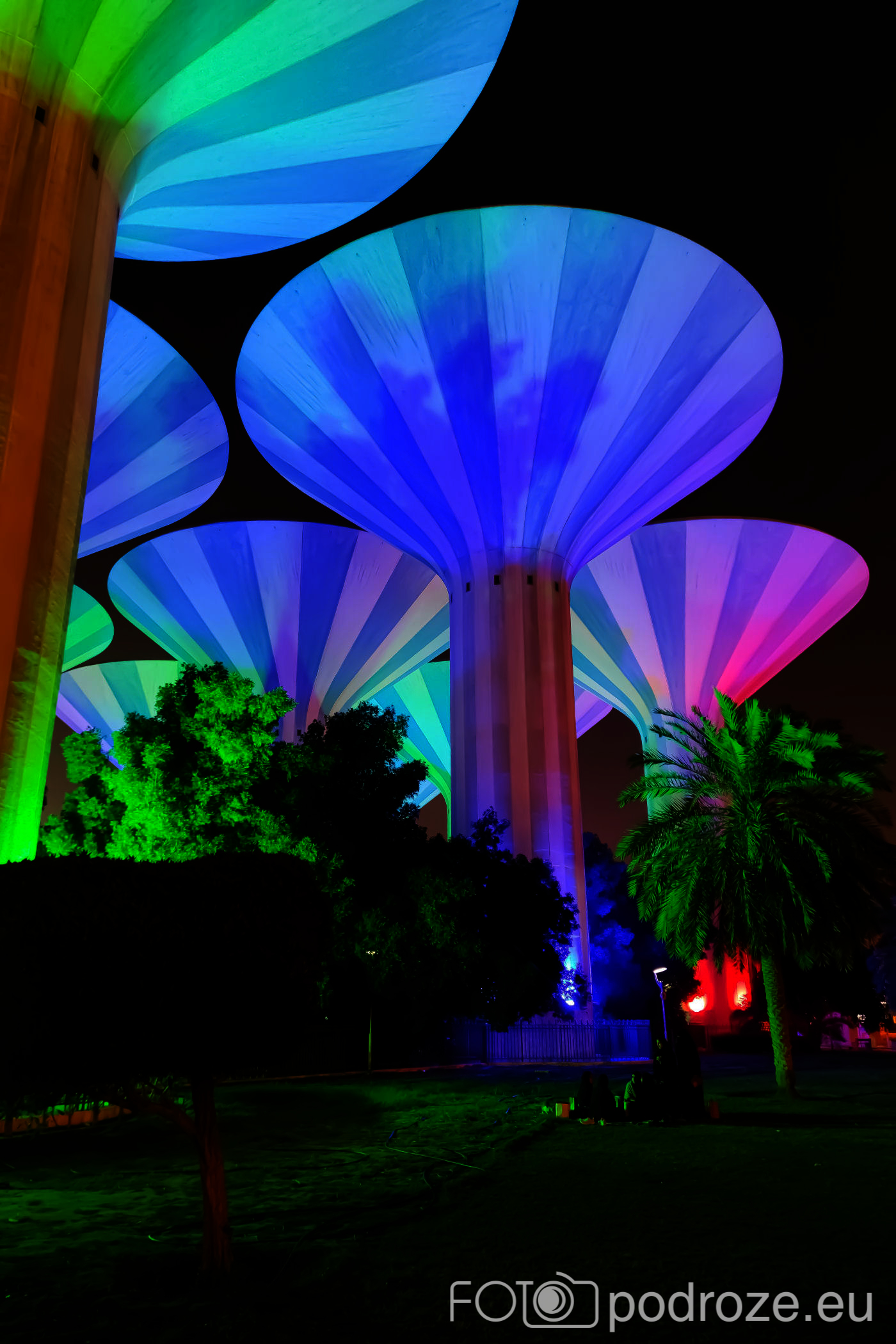 Abraj Park to najbardziej kolorowy park jaki widzieliśmy w życiu, a to wszystko przez bajecznie podświetlone wieże ciśnień. Jest ich w całym Kuwejcie kilka zespołów, ale tylko tu utworzono pod nimi park i podświetlono w ten, a nie inny sposób. Całość wygląda jak z bajki, ale oczywiście tylko po zmroku.
