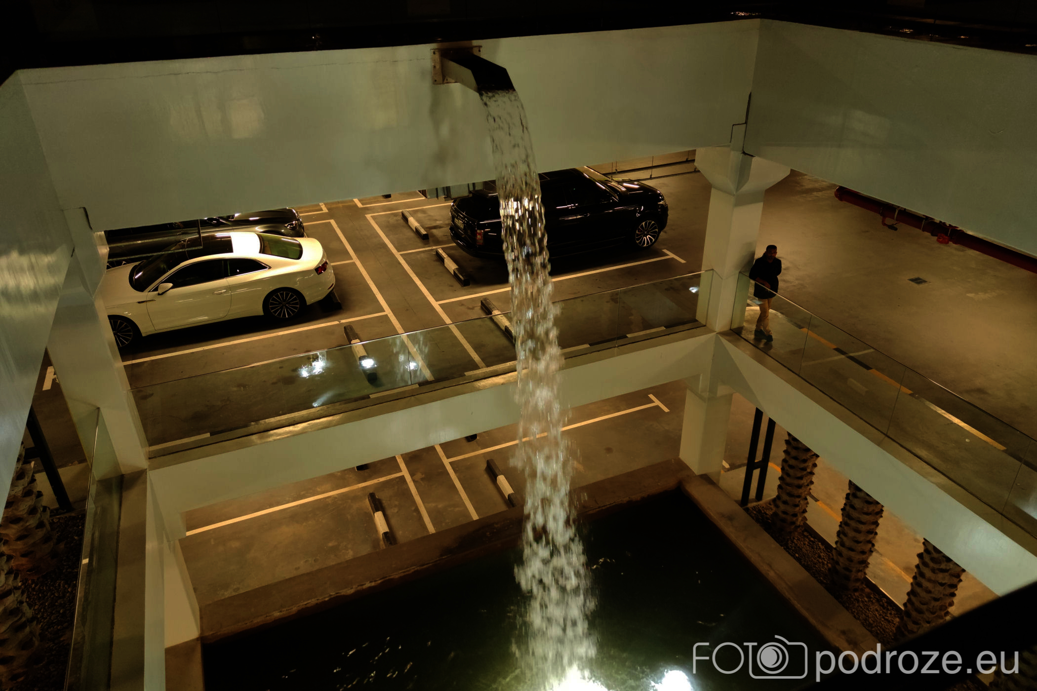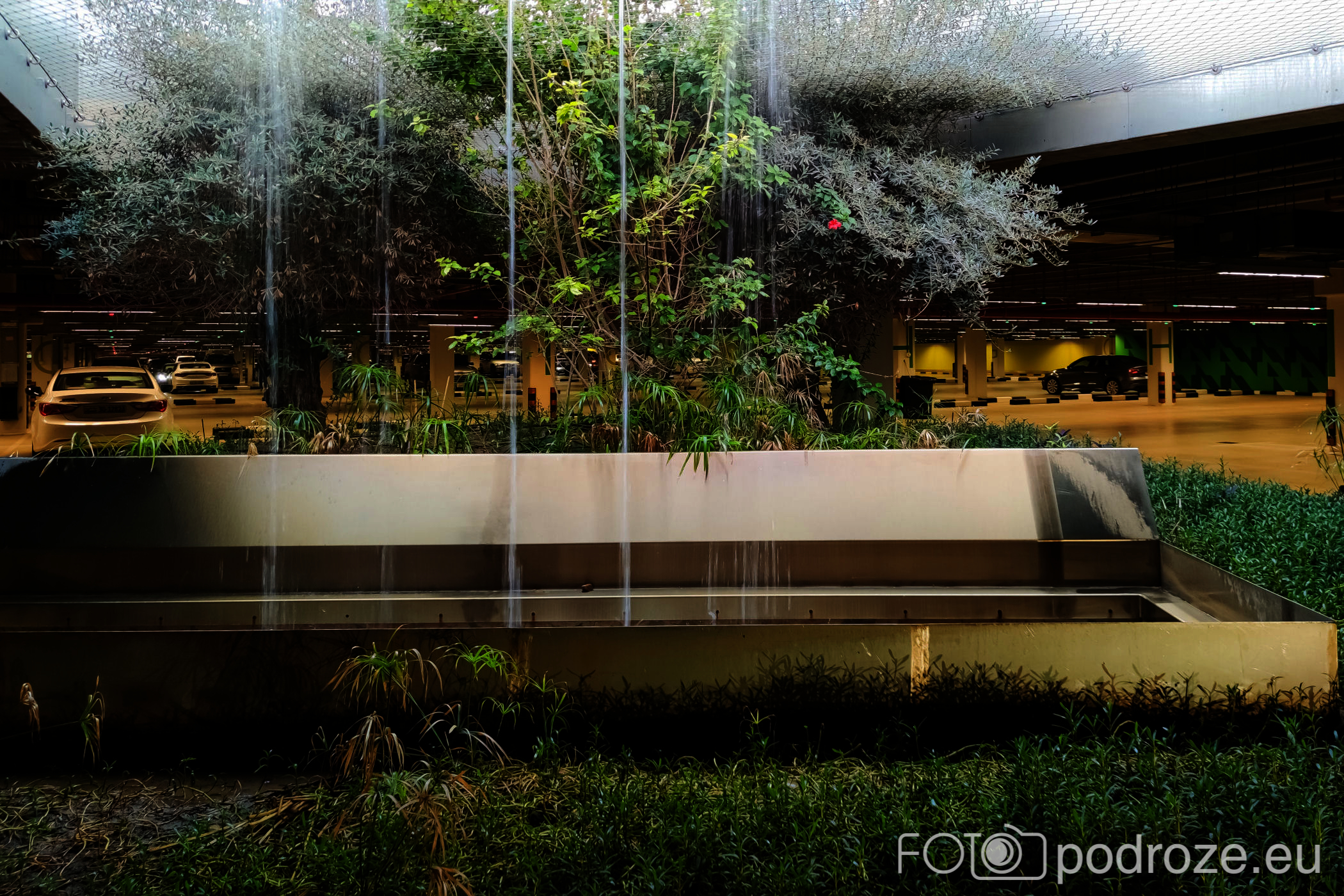 Pod całym kompleksem parkowym stworzono ogromny parking. Niestety brama wejściowa jest otwarta tylko w okolicy centrum handlowego górującego nad okolicą. Lokalizacja okolicy wejścia – link. To powodowało, że pomimo iż mieszkaliśmy dosłownie 300m od parku, musieliśmy jeździć do niego samochodem. Zaskoczeniem dla nas były wodospady zrobione nad otworami do parkingu.