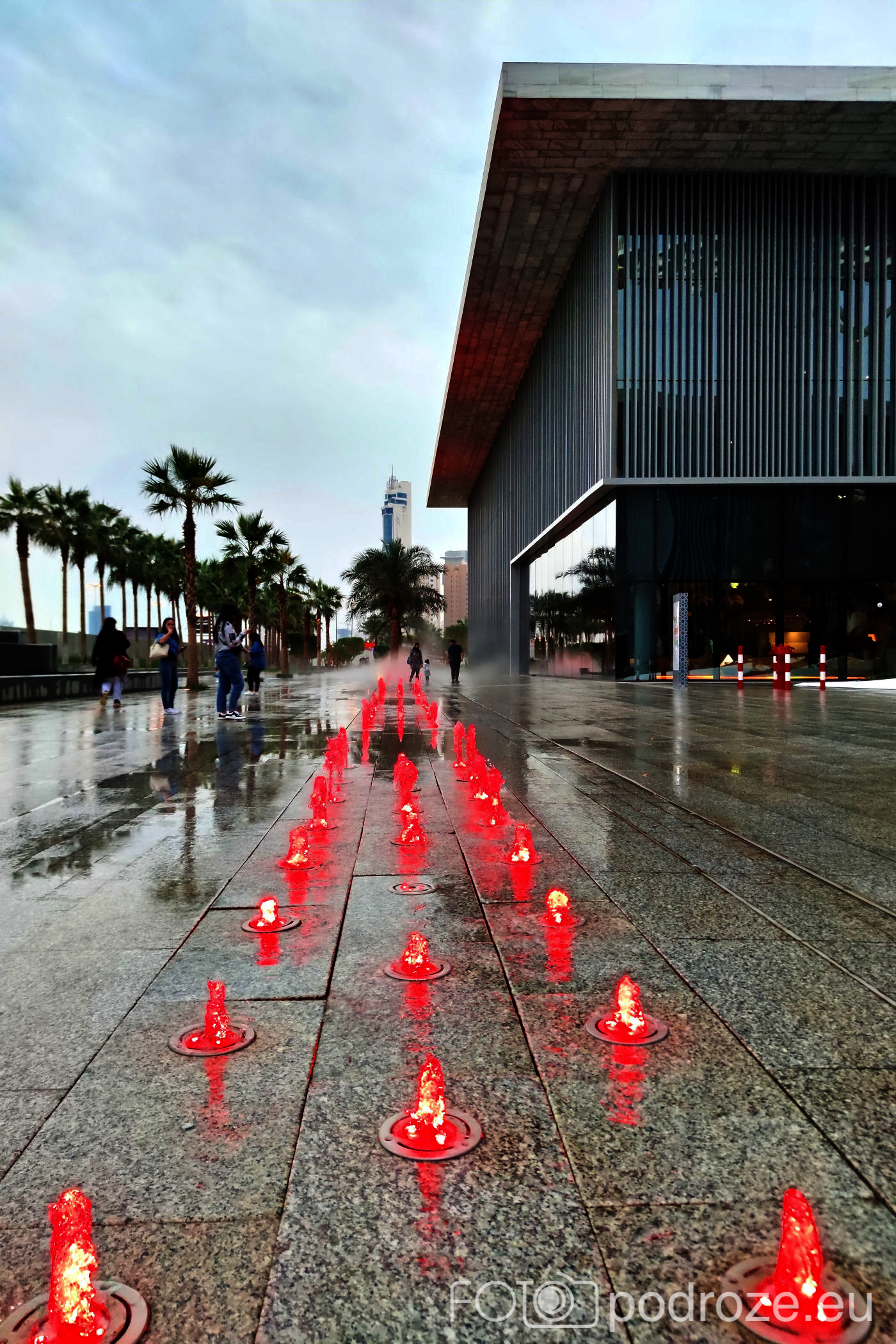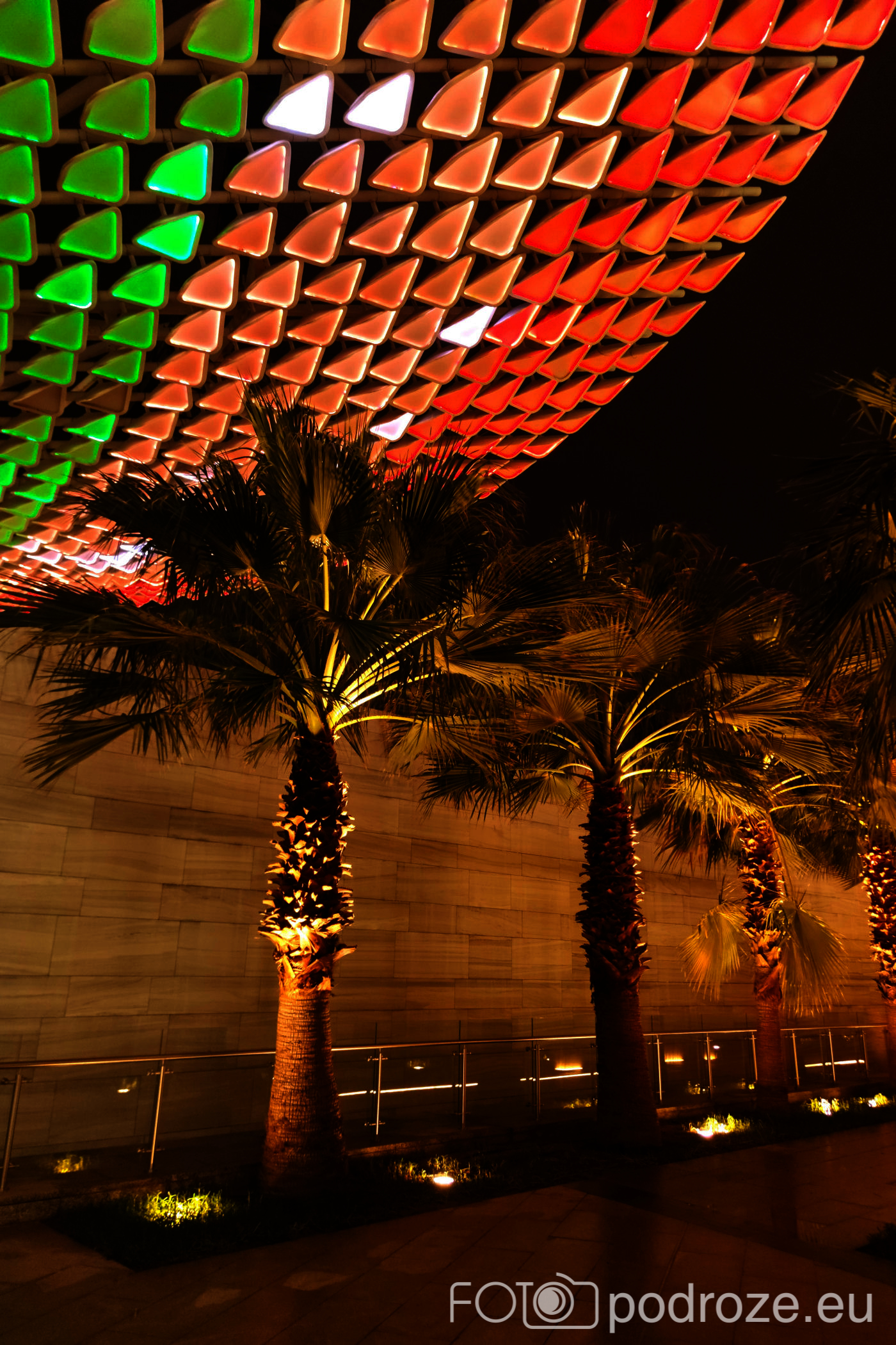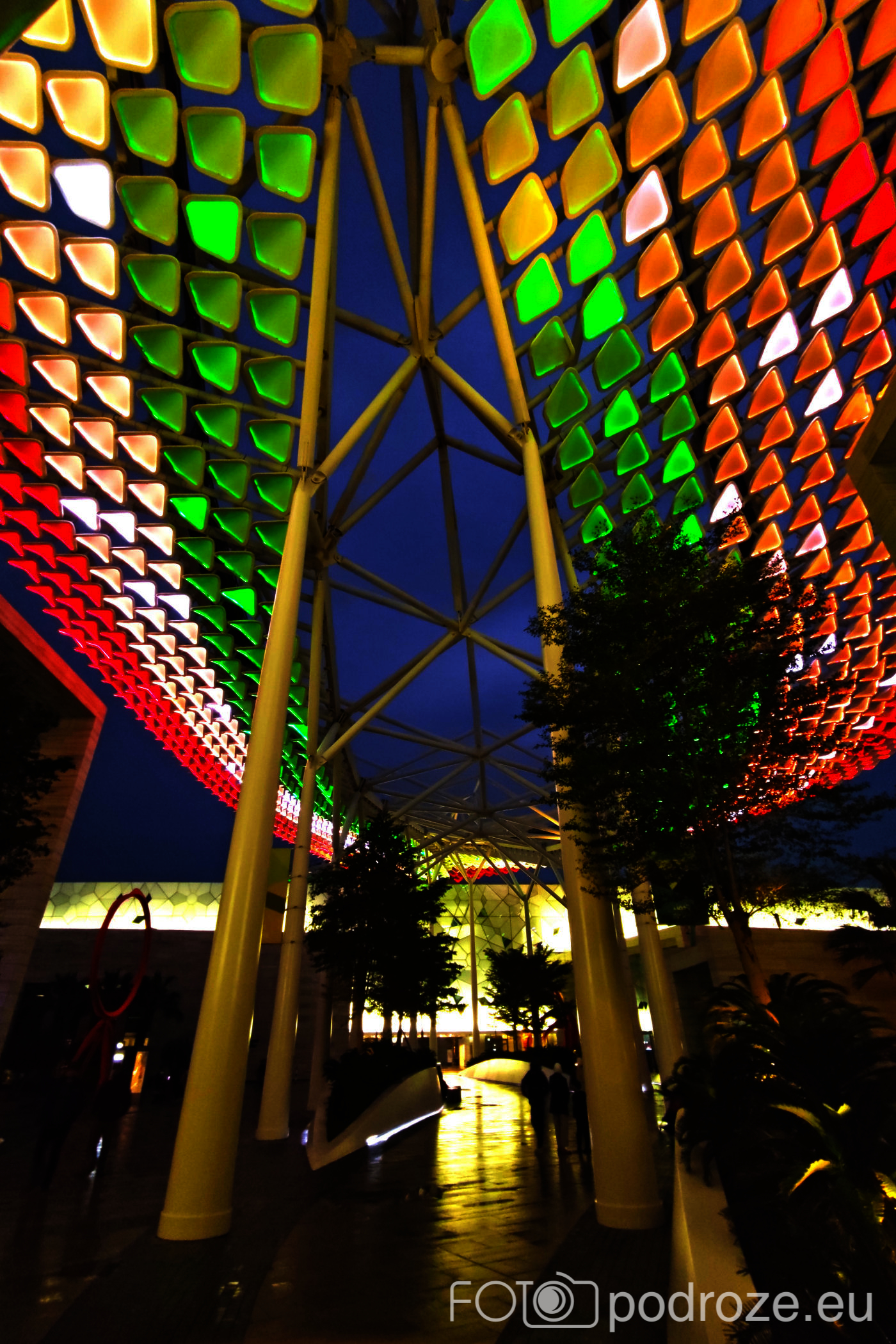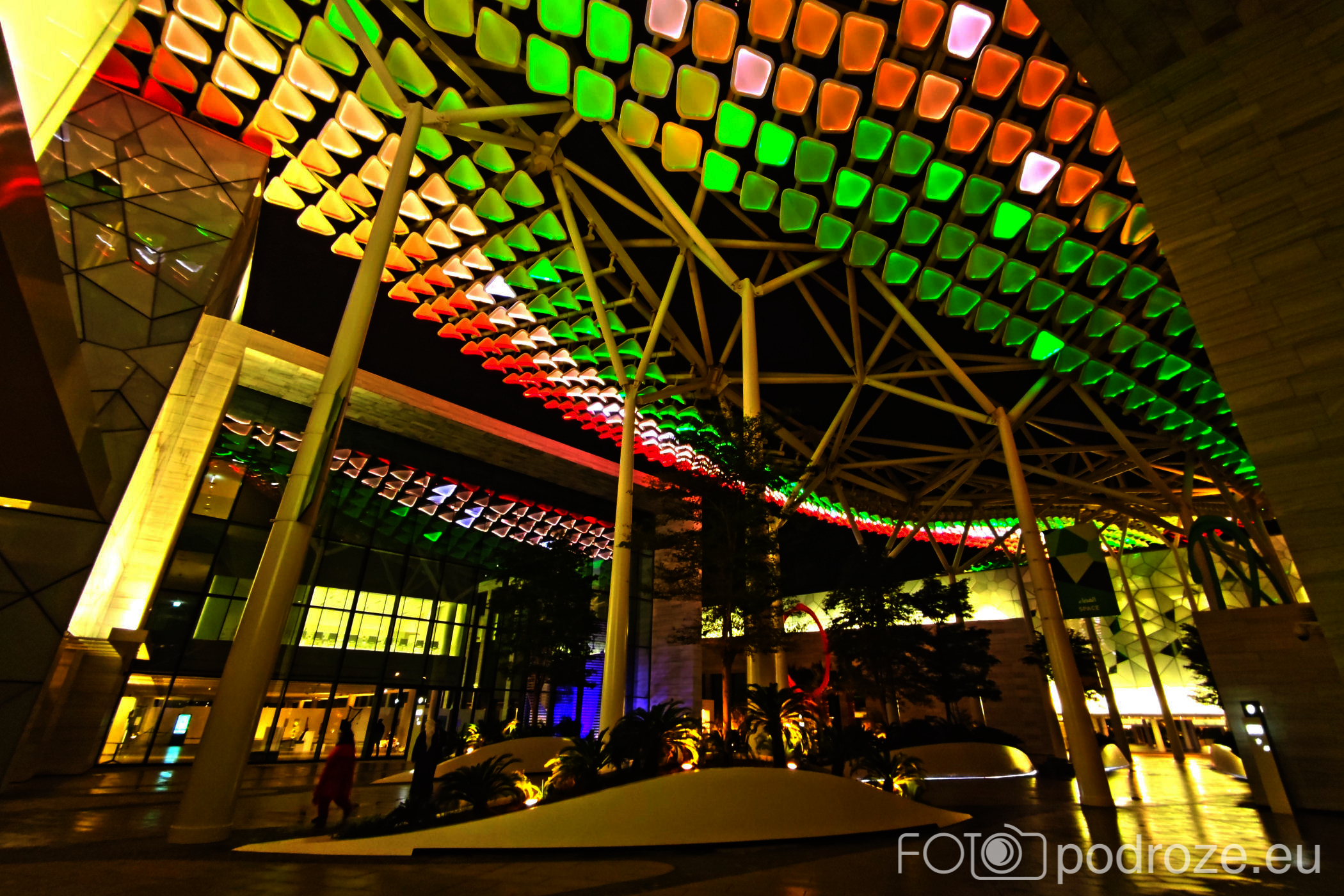 Wieczorem centrum jest fantastycznie oświetlone, zadaszenie ma kolory flagi Kuwejtu i generalnie robi ogromne wrażenie. Bardzo żałowaliśmy, że jesteśmy tu w deszczu i nie udało się obejrzeć wszystkich atrakcyjnych miejsc na zewnątrz.