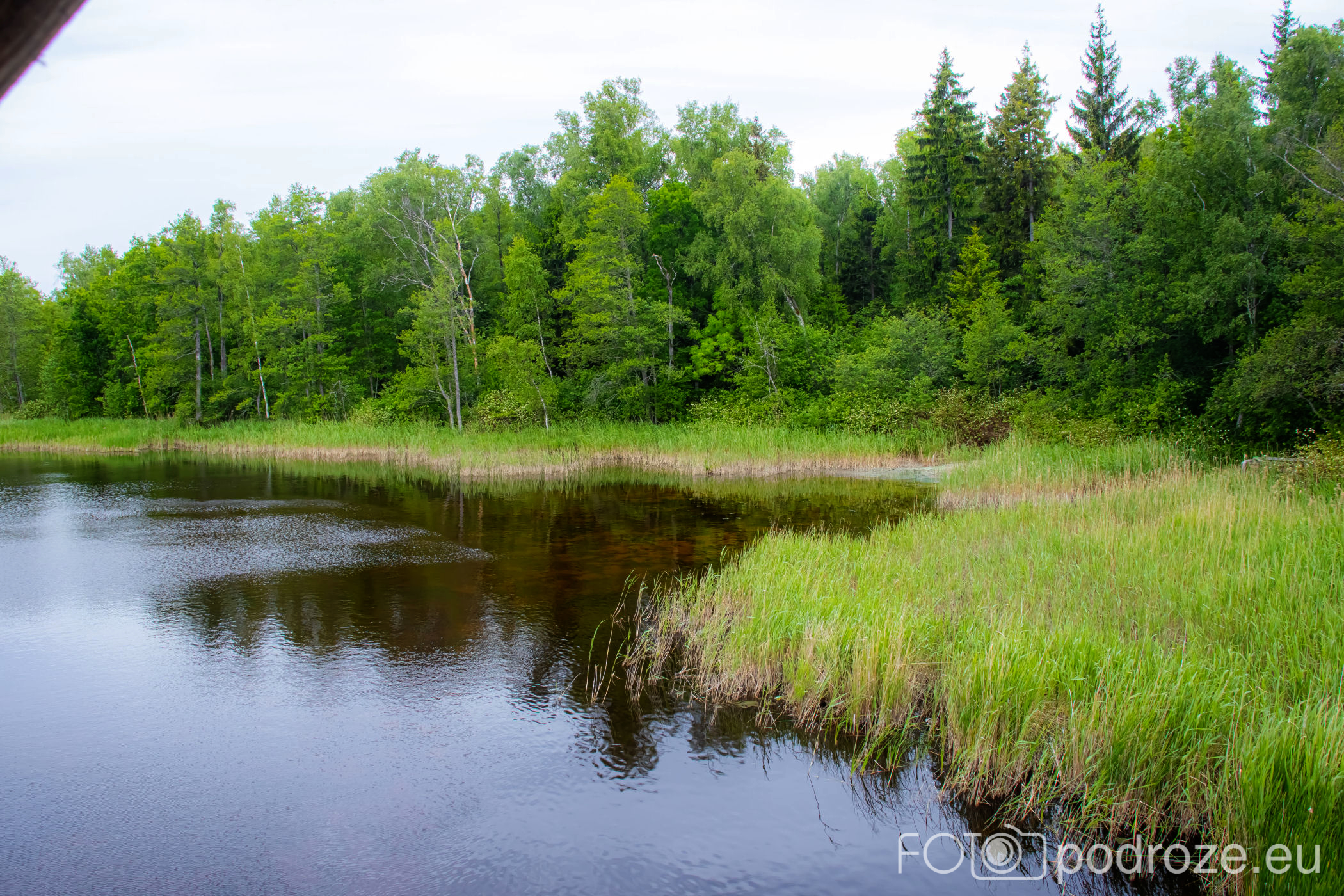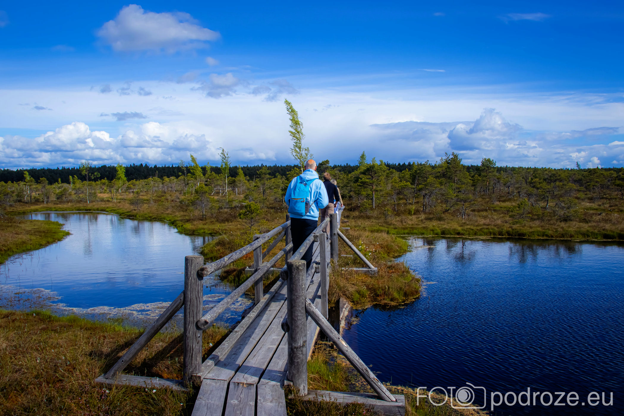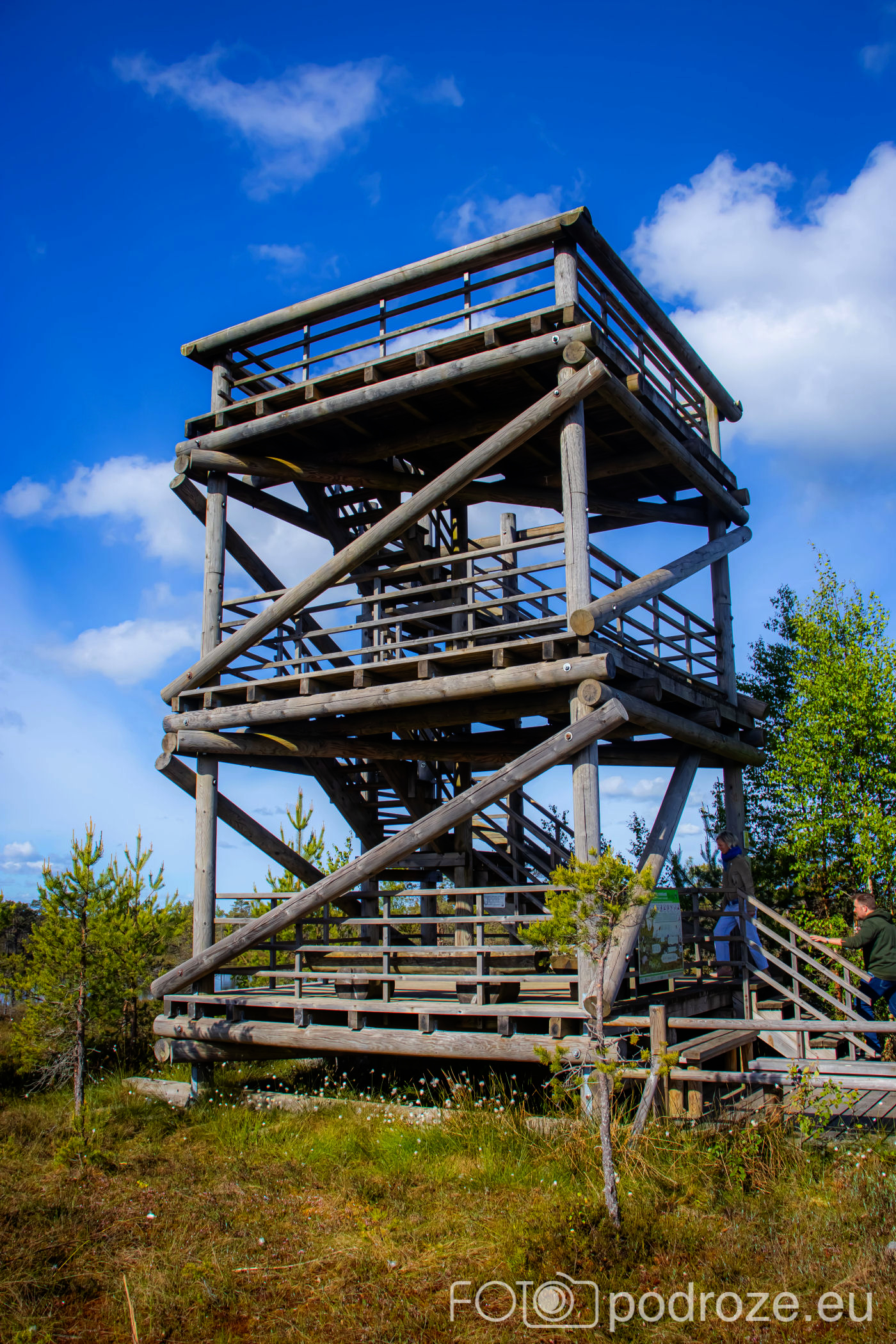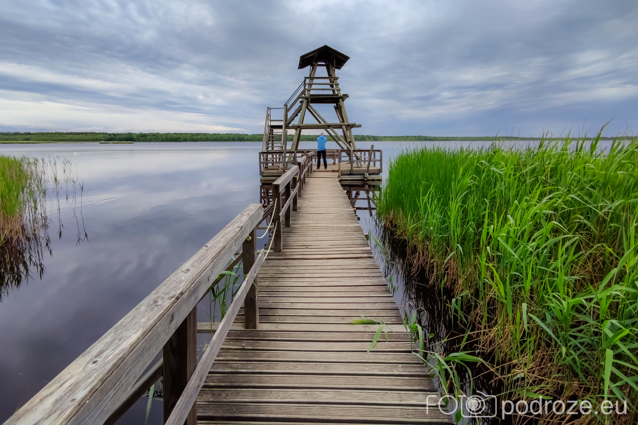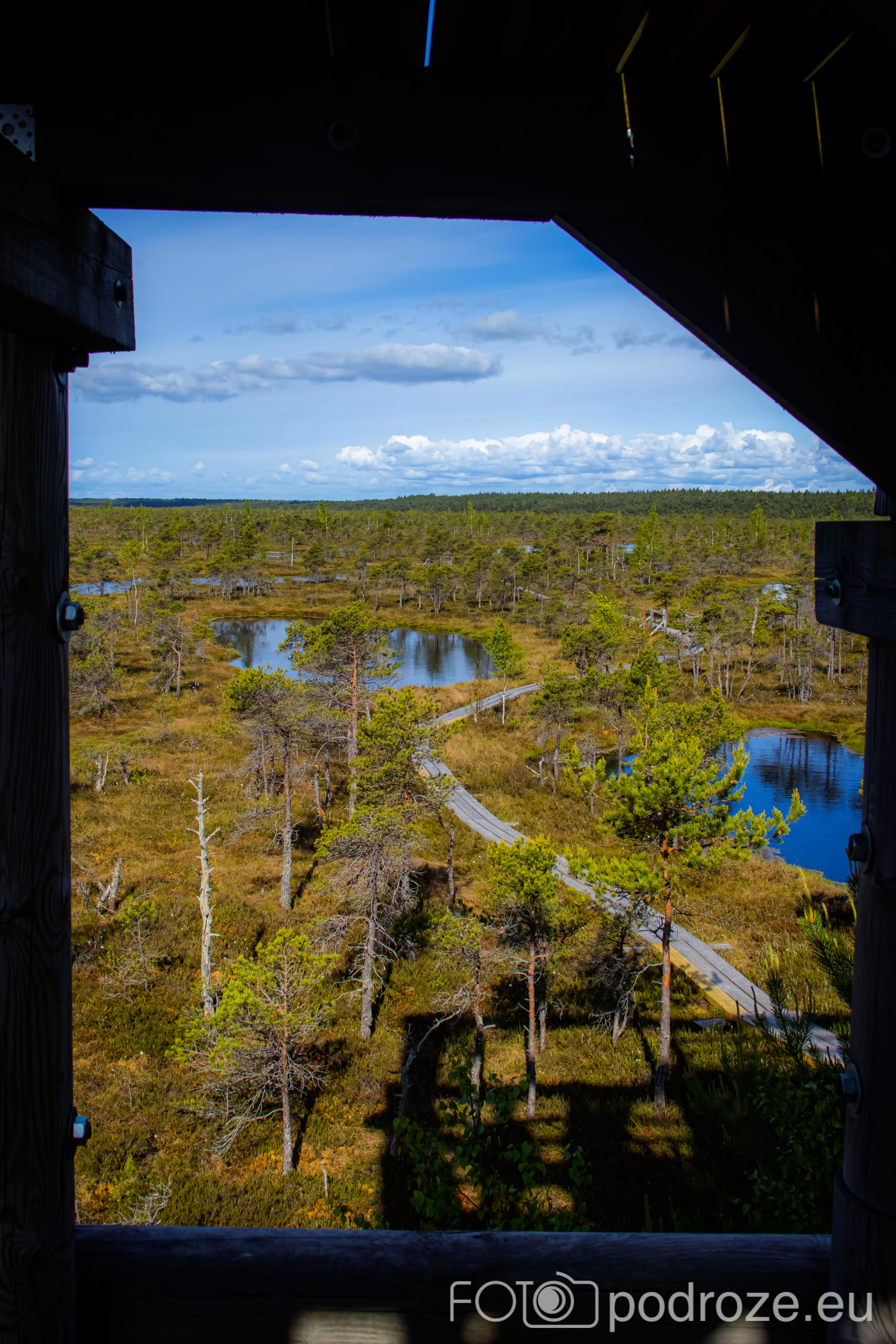 My zrezygnowaliśmy z robienia kolejnej pętli, woleliśmy tego dnia odwiedzić jeszcze kolejne miejsce. Dlatego dotarliśmy przez las autem aż do samego jeziorka, a stąd już tylko kilkadziesiąt metrów po bujającym się pomoście do drewnianej wieży widokowej.