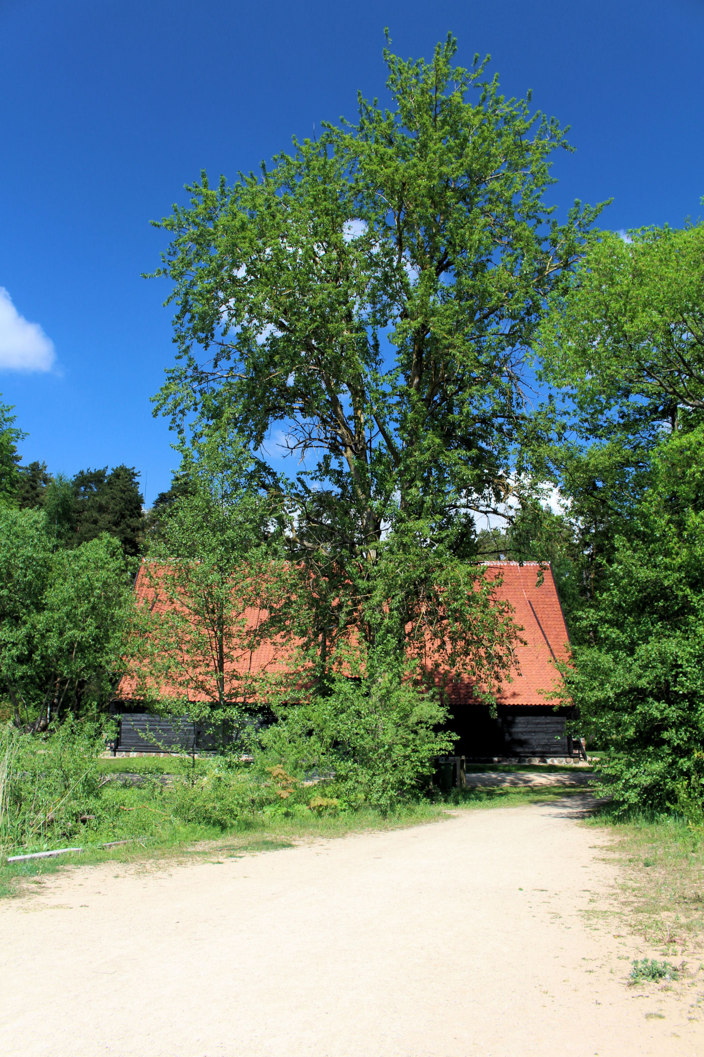 Idę dalej lasem wzdłuż brzegu jeziora, a zza drzew wyłania się pierwszy duży budynek z ciekawą elewacją i czerwonym dachem. W środku znajduje się imponująca wystawa kufrów.