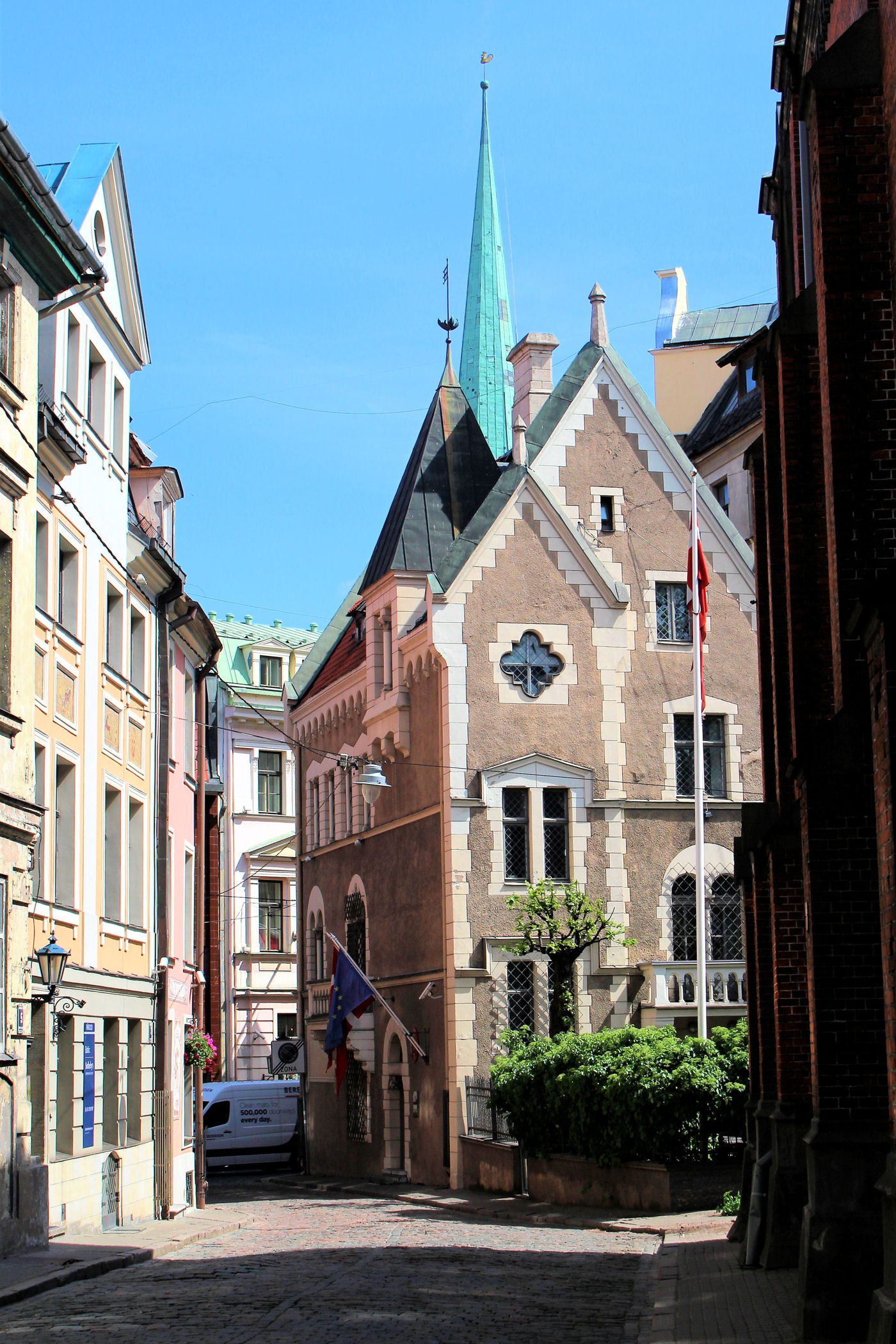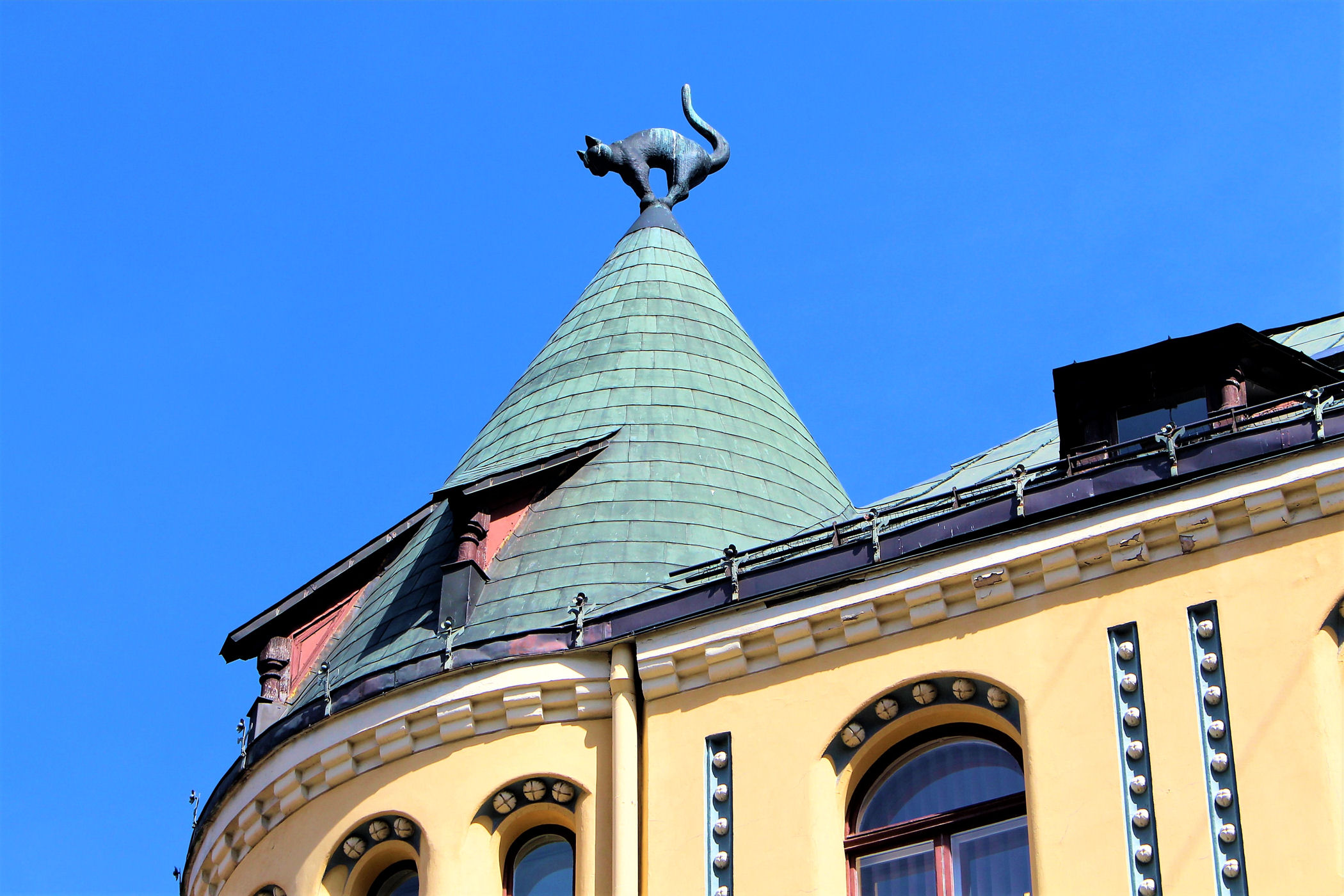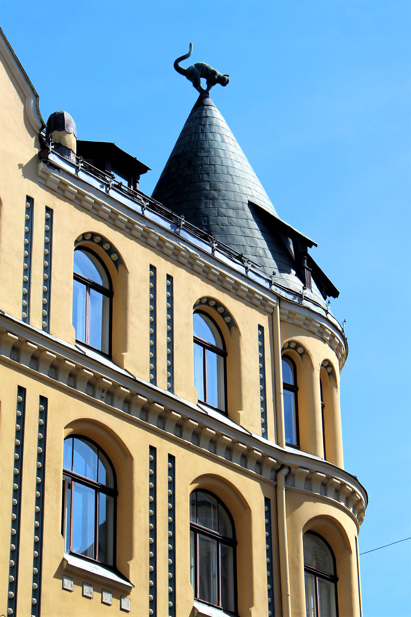 Teraz uliczką Meistaru kieruje się w stronę budynku, który stał się prawdziwą ikoną Rygi. Jego zwieńczenie w postaci figur kotów znajduje się bowiem na prawie wszystkich pamiątkach w tym mieście. Zbudowany został w 1909 roku według projektu Friedricha Scheffela. Jest to secesyjny budynek stylizowany na architekturę średniowieczną, a rzeźby kotów umieszczone są na dachu budynku.