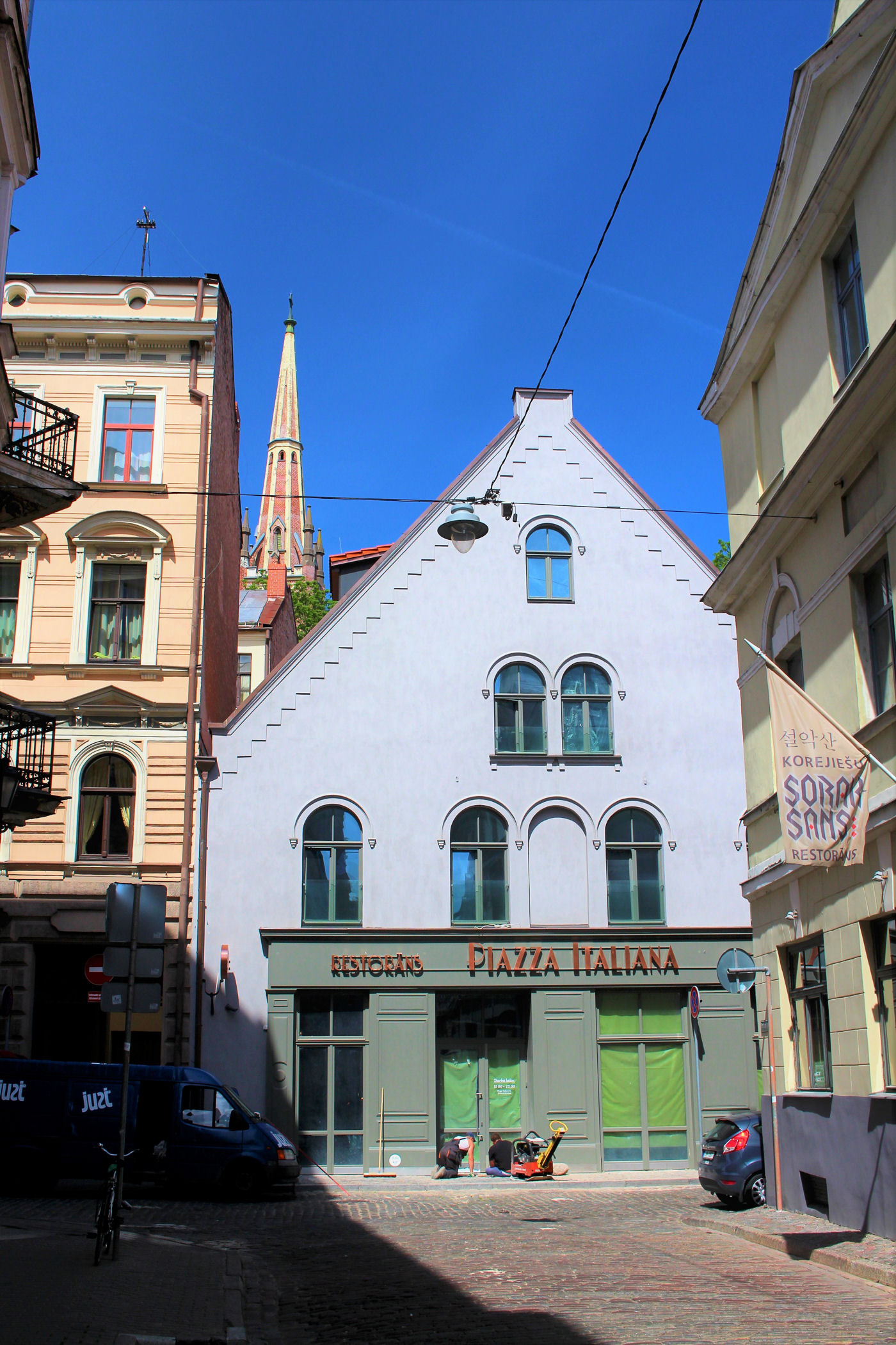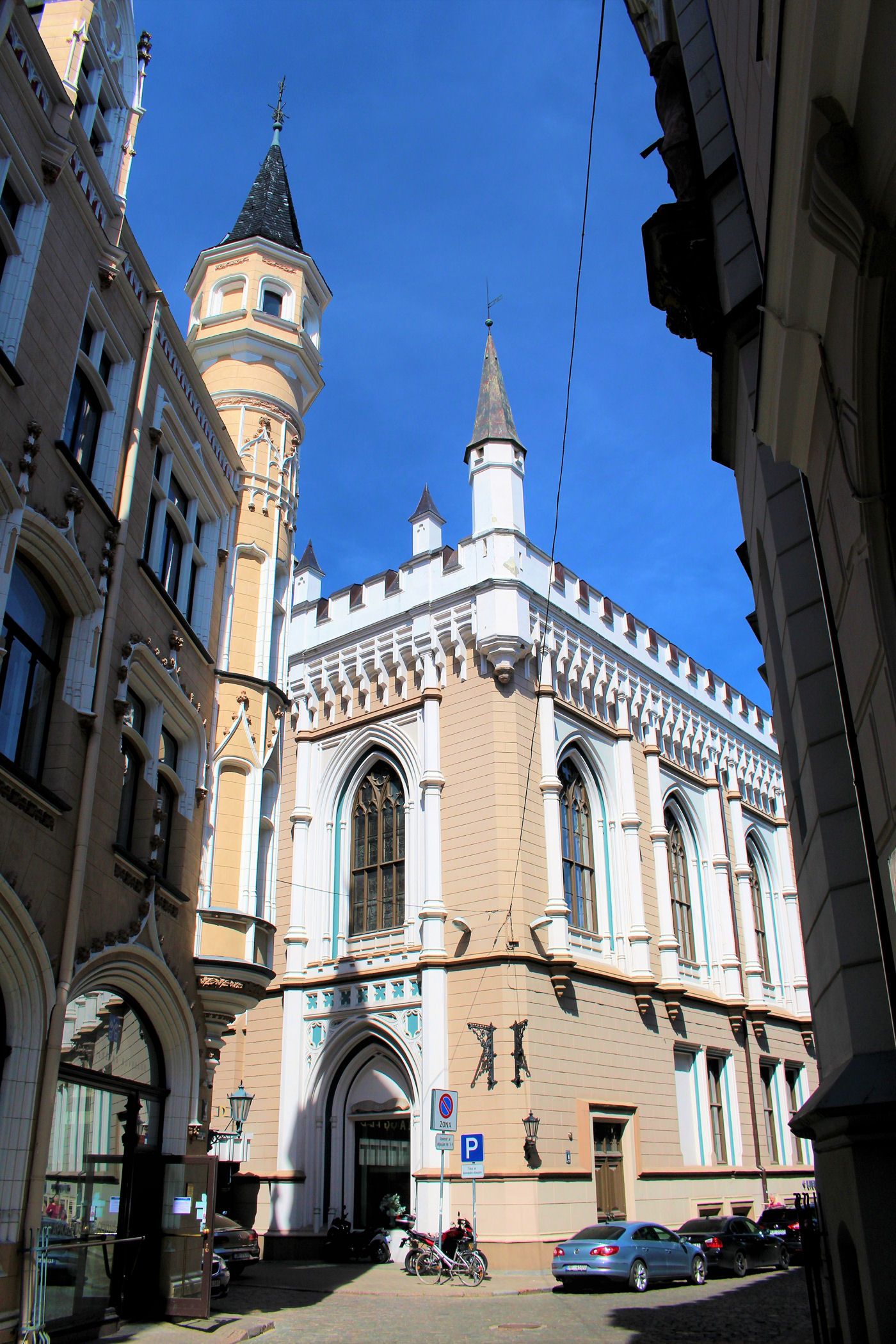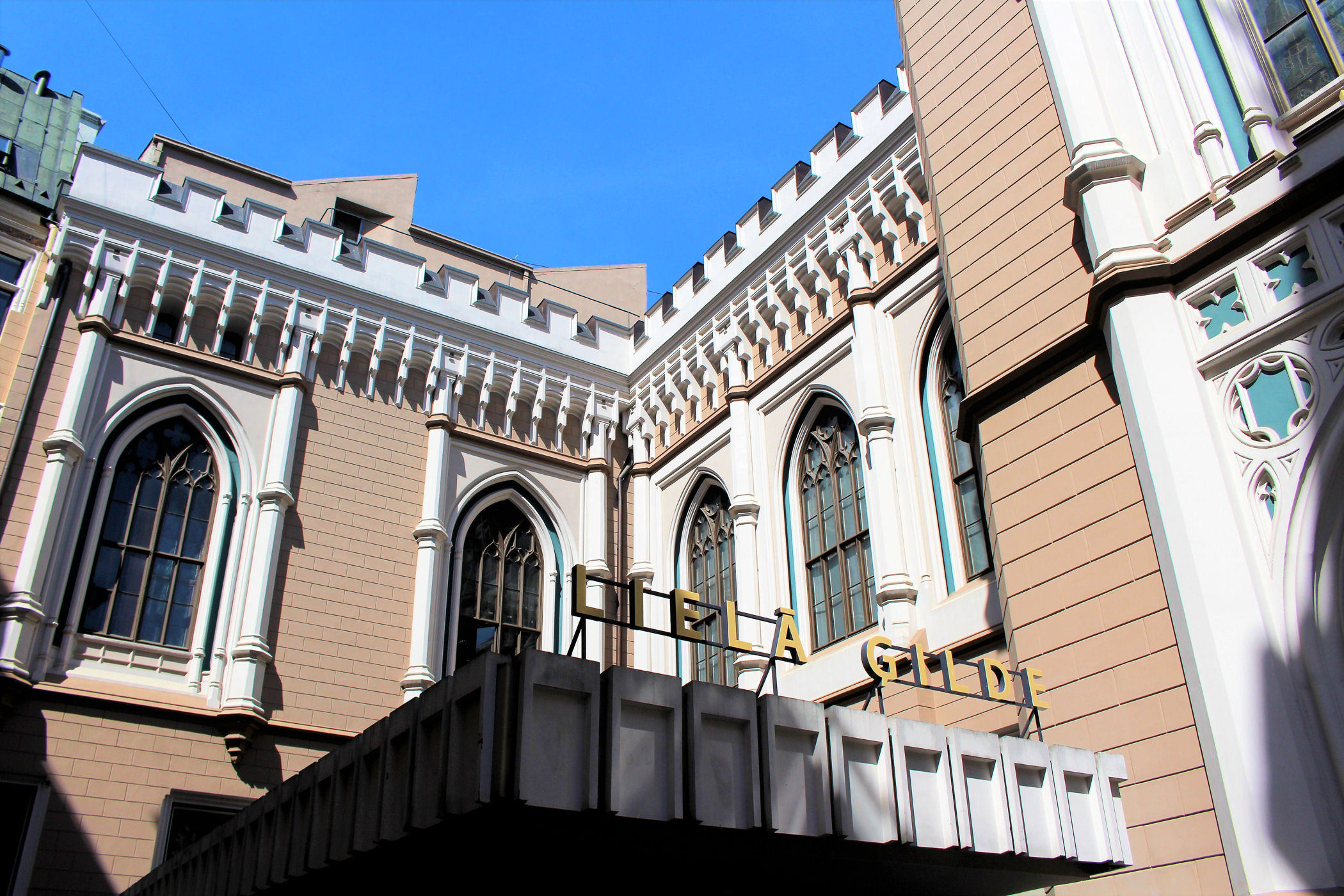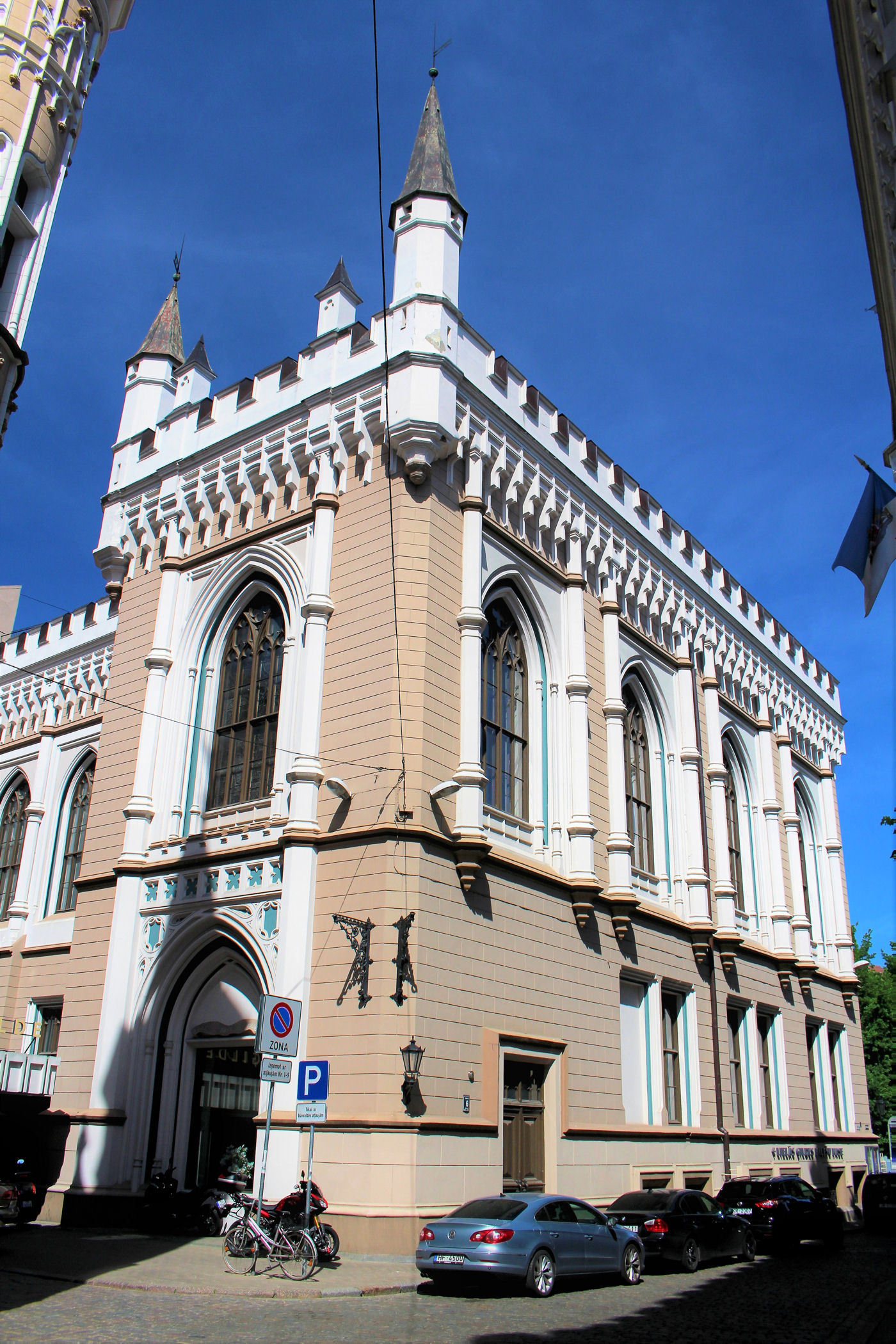 Kilkadziesiąt metrów dalej od kamieniczki z kotami znajdujemy jedne z najpiękniejszych budynków Rygi — Pierwszą Gildię Ducha Świętego, która powstała w 1252 roku jako stowarzyszenie kupców i rzemieślników. Wraz z rozwojem miasta i przystąpieniem do Ligi Hanzeatyckiej w 1282 roku, rozdzielono interesy tych grup, tworząc Małą Gildię św. Jana dla rzemieślników oraz Wielką Gildię Matki Boskiej dla kupców. Gildie zachowały wpływy aż do I wojny światowej, choć w XIX wieku przekształcono je w nowoczesne izby — kupiecką i przemysłową. Siedziby obu Gildii, zbudowane w średniowieczu i przebudowane w XIX wieku w stylu neogotyckim, stoją w północno-zachodnim narożniku Placu Liwskiego; dziś Mała Gildia pełni funkcję centrum kulturalnego, a Wielka jest siedzibą Łotewskiej Narodowej Orkiestry Symfonicznej.