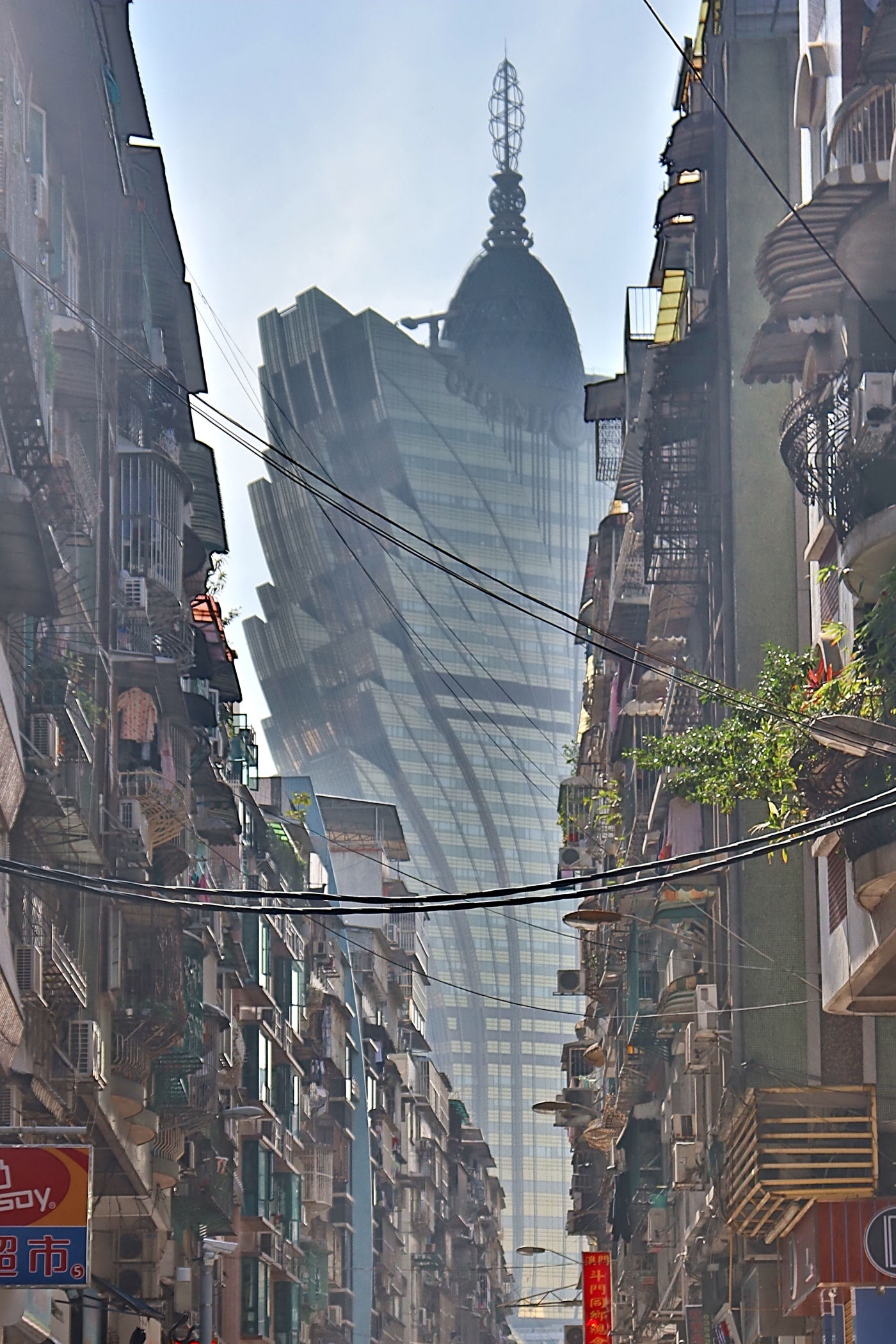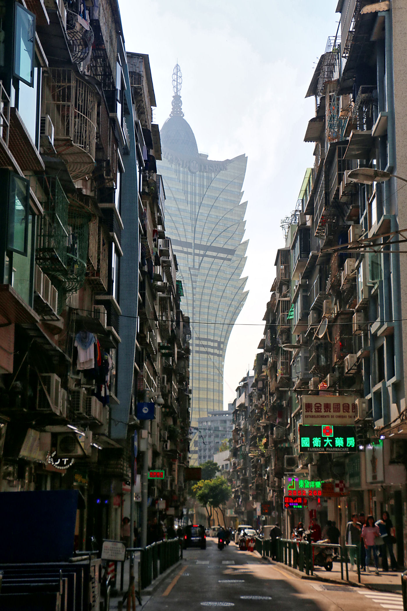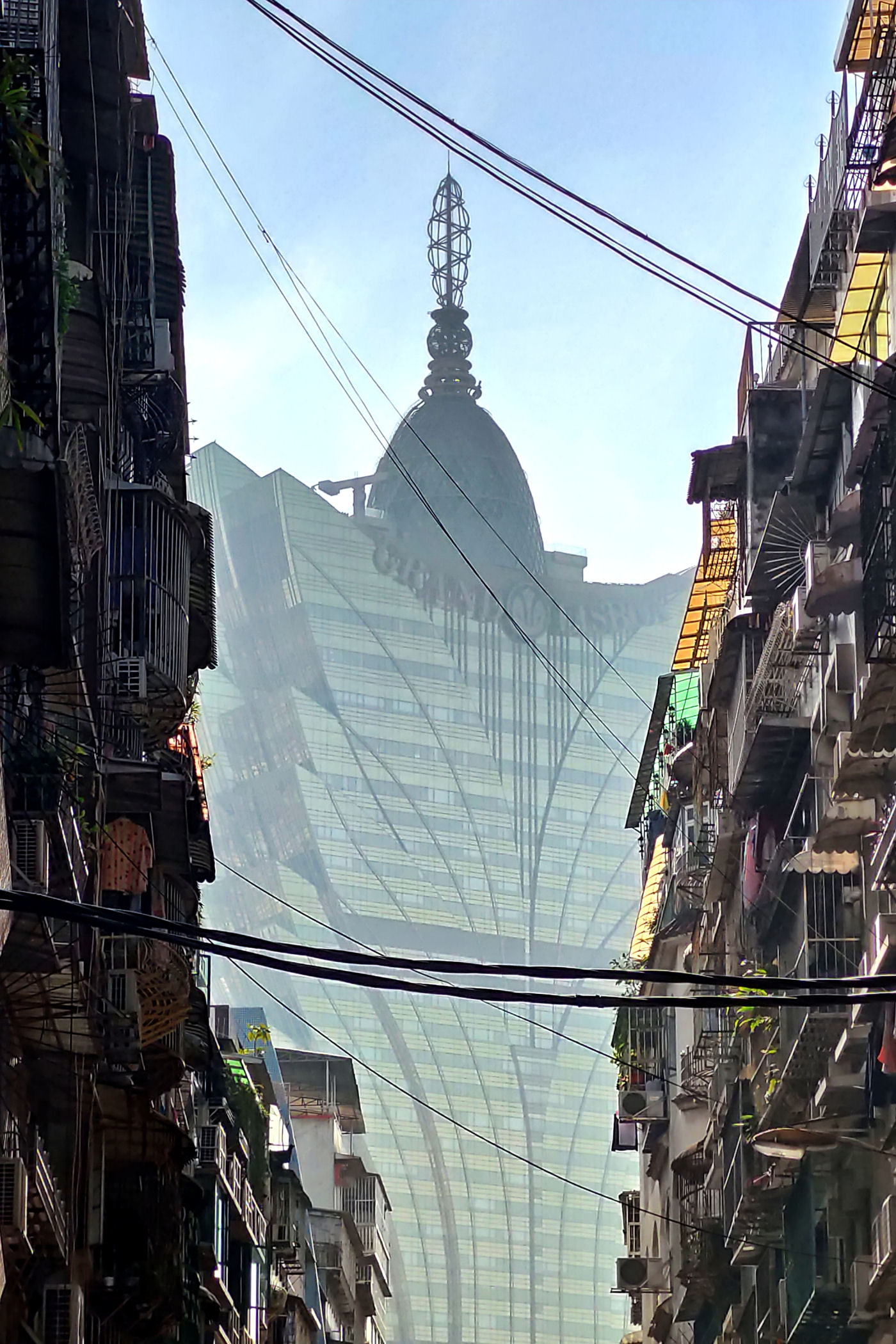 Jeśli będziecie mieli czas – koniecznie idźcie do dzielnicy mieszkalnej powyżej szpitala. Tu na ulicy Nova a Guia zobaczycie najbardziej komiczny obraz. Między starymi budynkami pełnymi kabli, wentylatorów i prania wyłania się budynek Grand Lisboa .