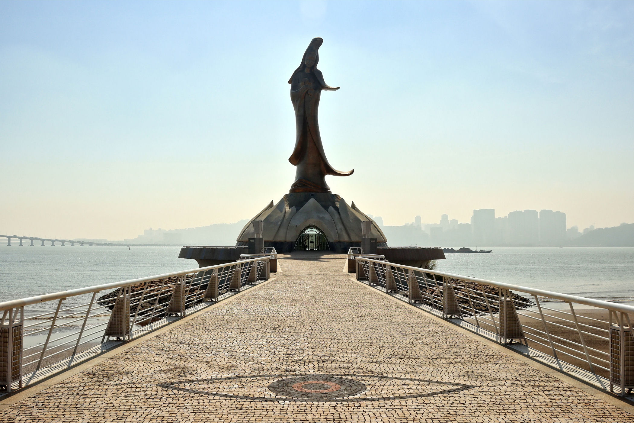 Idąc teraz wzdłuż wybrzeża na zachód, w tym miejscu zresztą mocno zaniedbanego, dojdziemy do kolejnego cypla. Na jego końcu znajduje się kopuła, a na niej posąg. Jest to część Centrum Ekumenicznego Kun Iam, które znajduje się na sztucznej wyspie, połączonej z lądem groblą długości 60m. Pomnik Kun Iam, który stoi pośrodku, patrząc na miasto Makau, symbolizuje, że ma on chronić miasto i mieszkających tam ludzi. Pomnik ma około 20 metrów wysokości i jest wykonany z około 50 odlewów z brązu o masie do 50 ton.