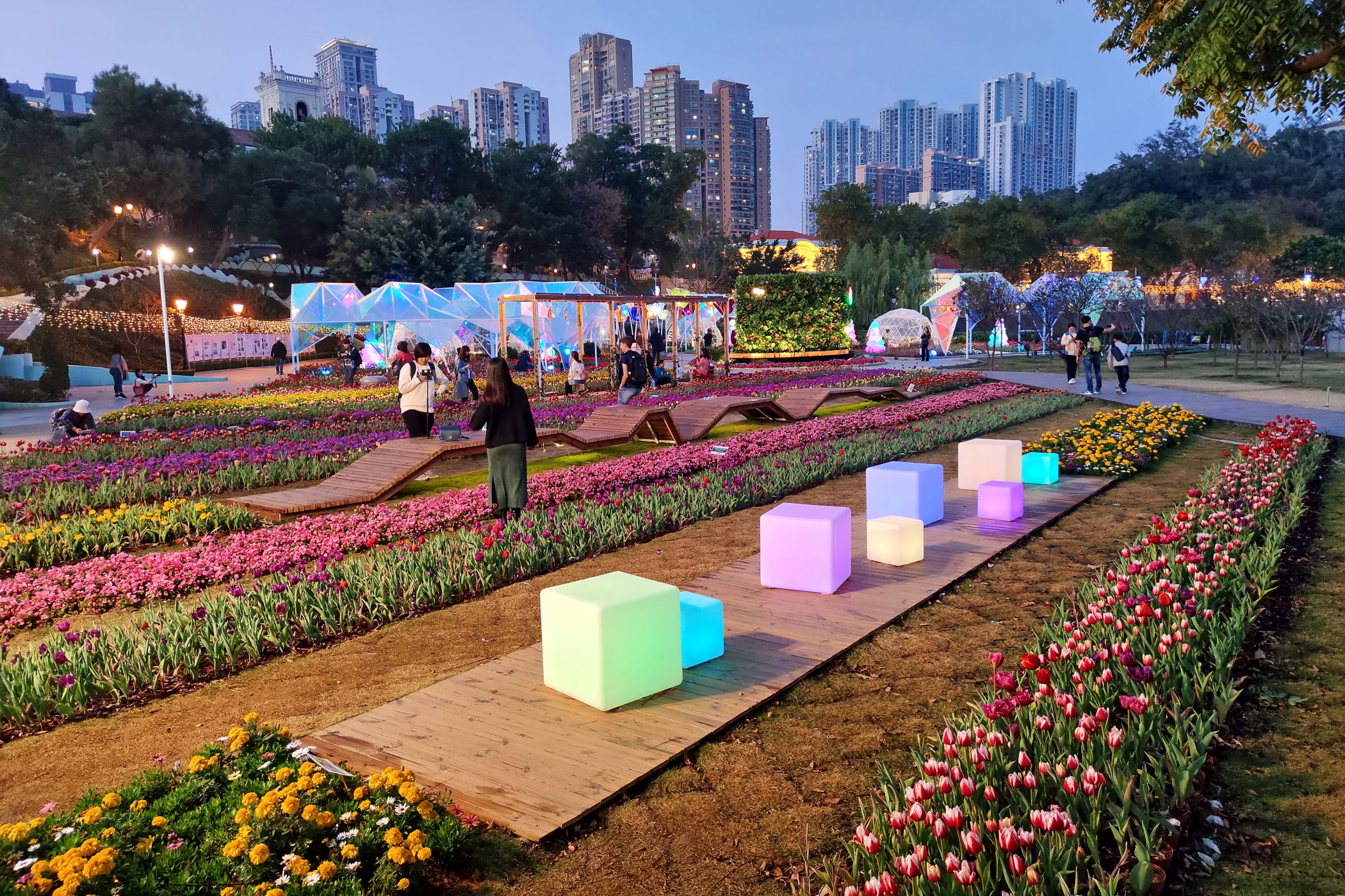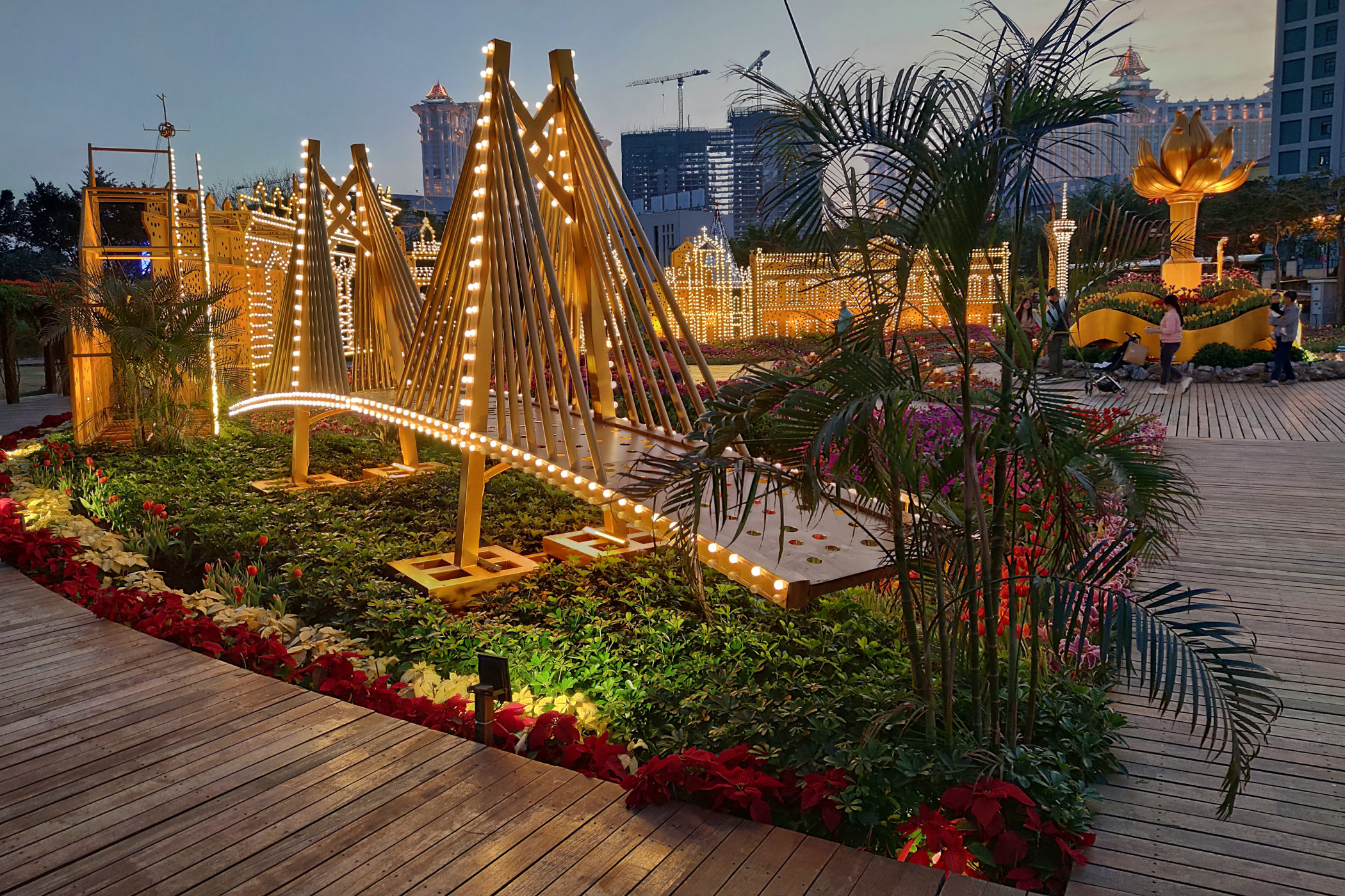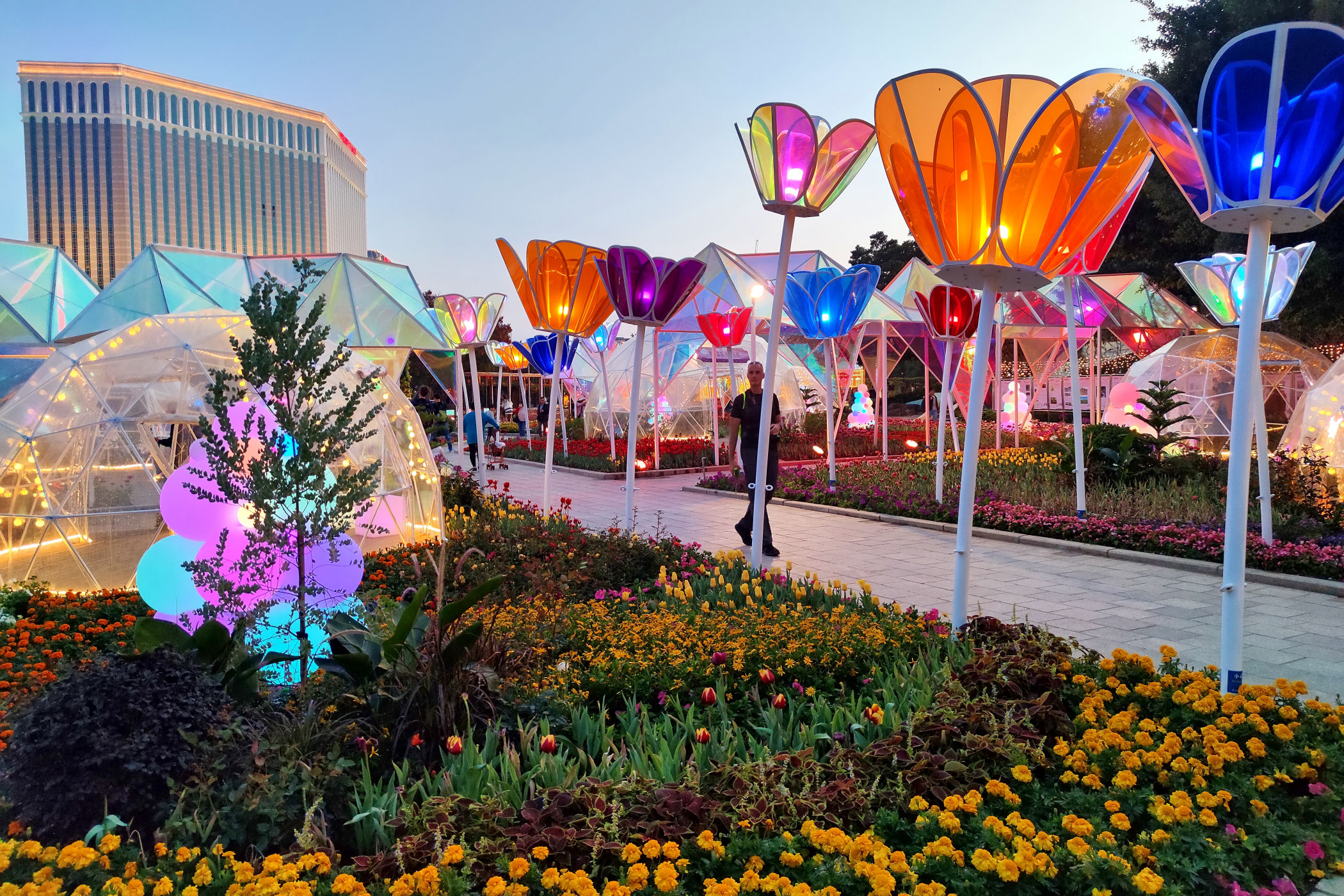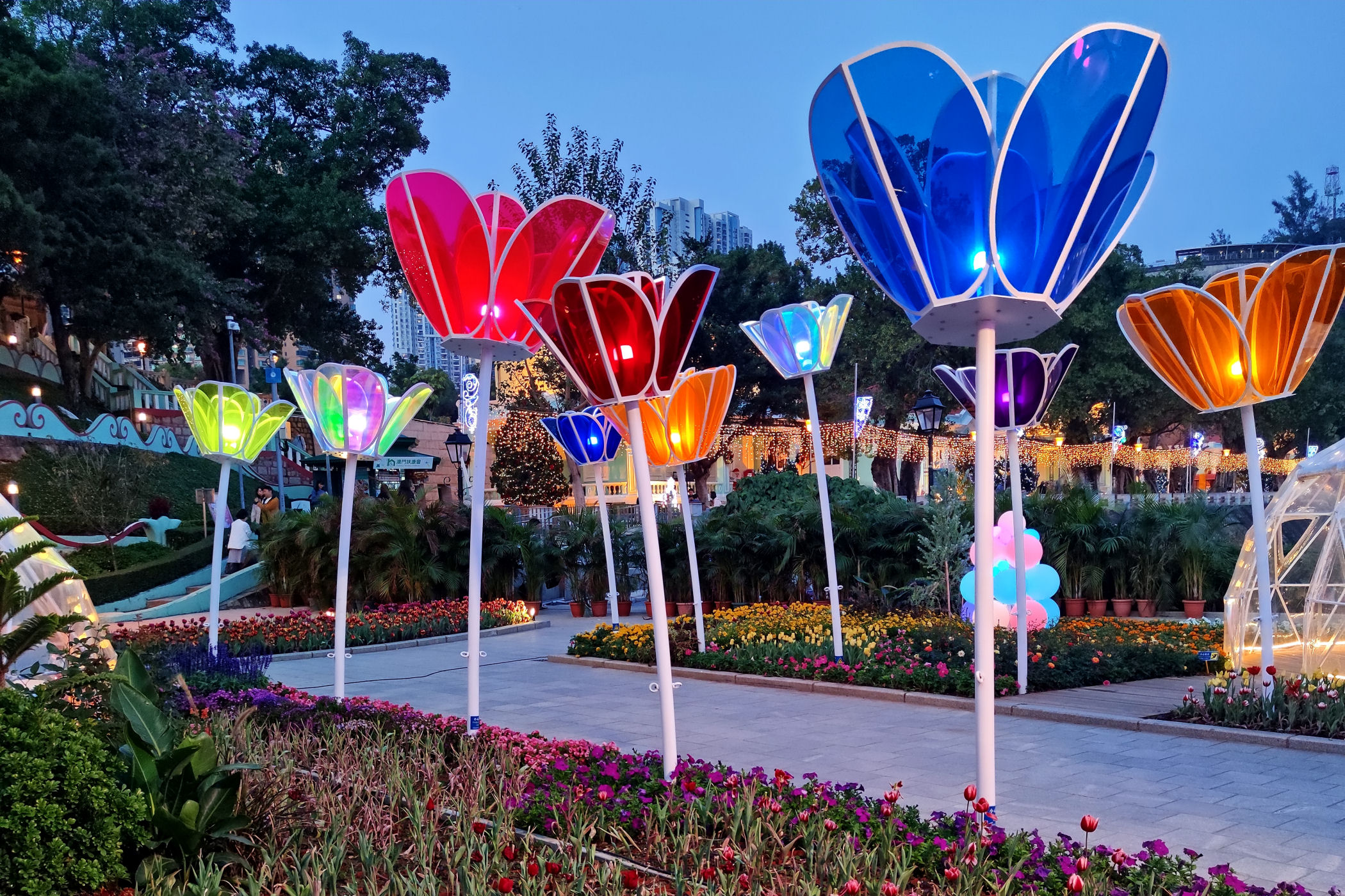 W pobliżu Starej Taipy znajduje się nowo wybudowany ( na mapach googla jeszcze go nie ma) park kwiatów. Jest okres świąteczno – noworoczny, park więc oprócz normalnej „zabudowy”, czyli Makau w miniaturce ma jeszcze dodatkowo ozdoby typowo świąteczne. Do tego kwitnące tulipany, które ze świecącymi ozdobami stanowią kiczowatą, ale bajkową całość.