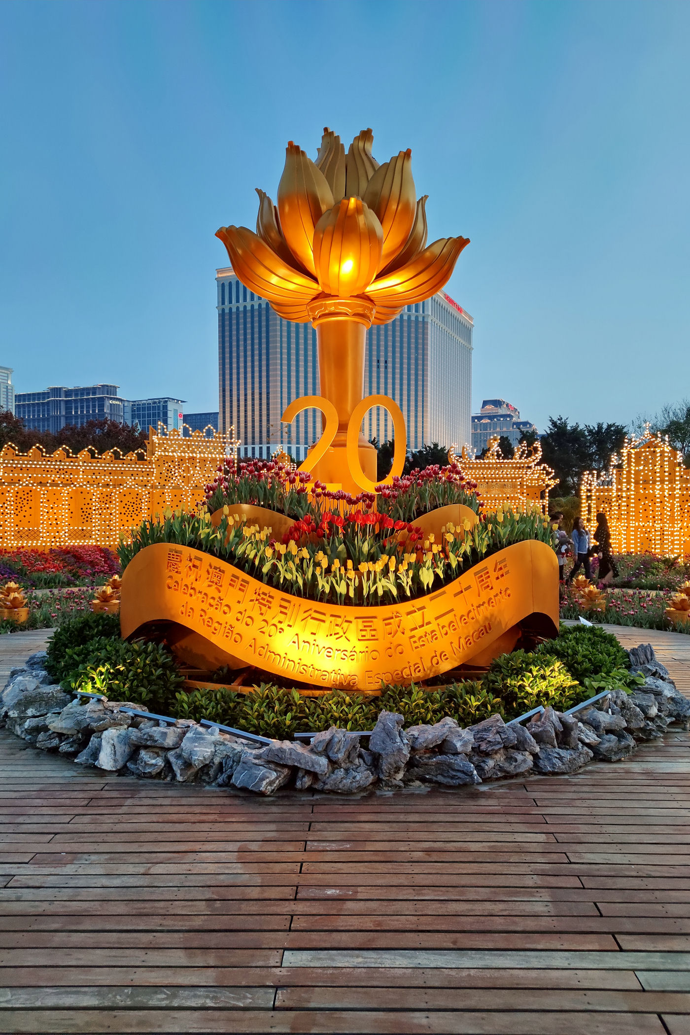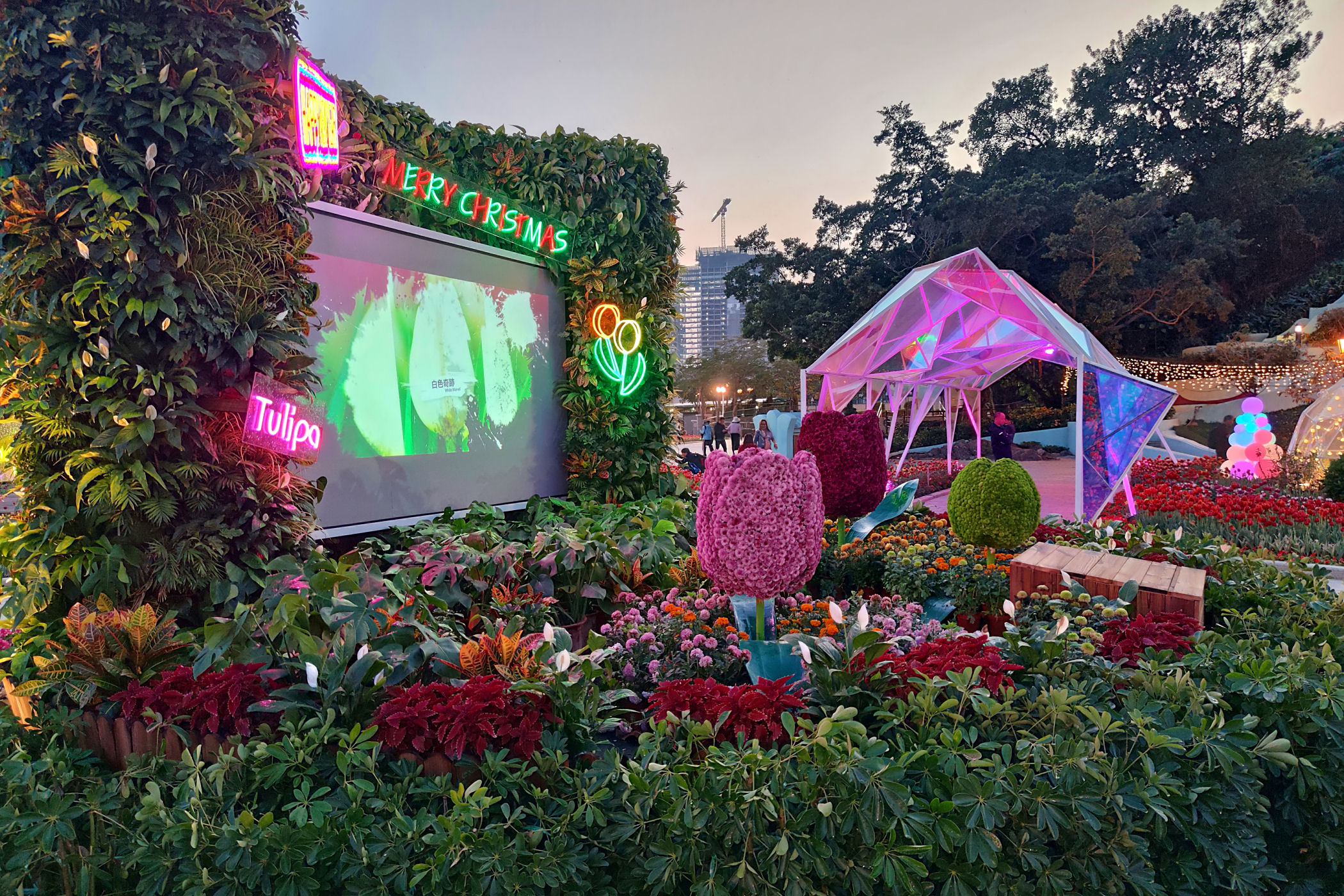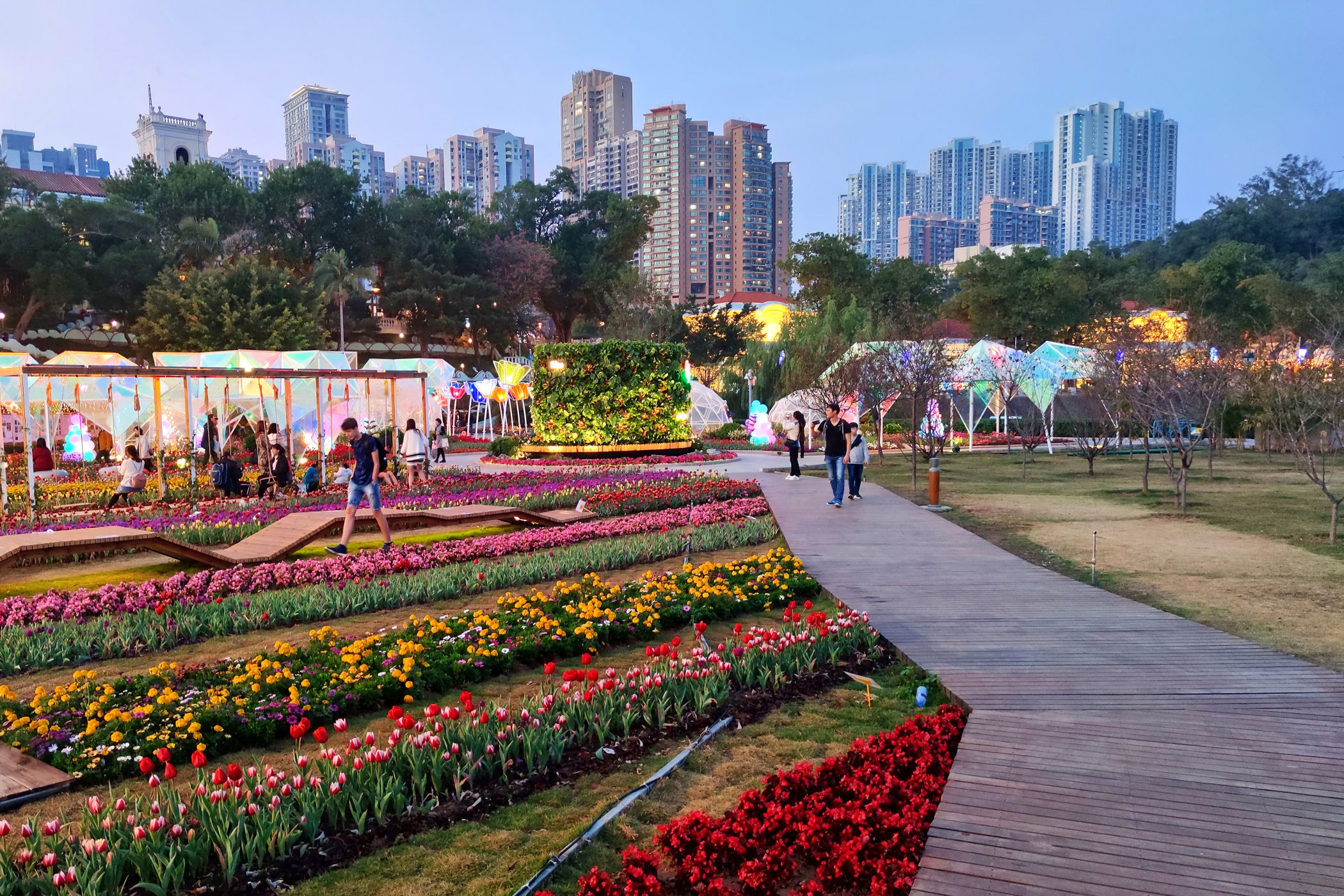 W pobliżu Starej Taipy znajduje się nowo wybudowany ( na mapach googla jeszcze go nie ma) park kwiatów. Jest okres świąteczno – noworoczny, park więc oprócz normalnej „zabudowy”, czyli Makau w miniaturce ma jeszcze dodatkowo ozdoby typowo świąteczne. Do tego kwitnące tulipany, które ze świecącymi ozdobami stanowią kiczowatą, ale bajkową całość.