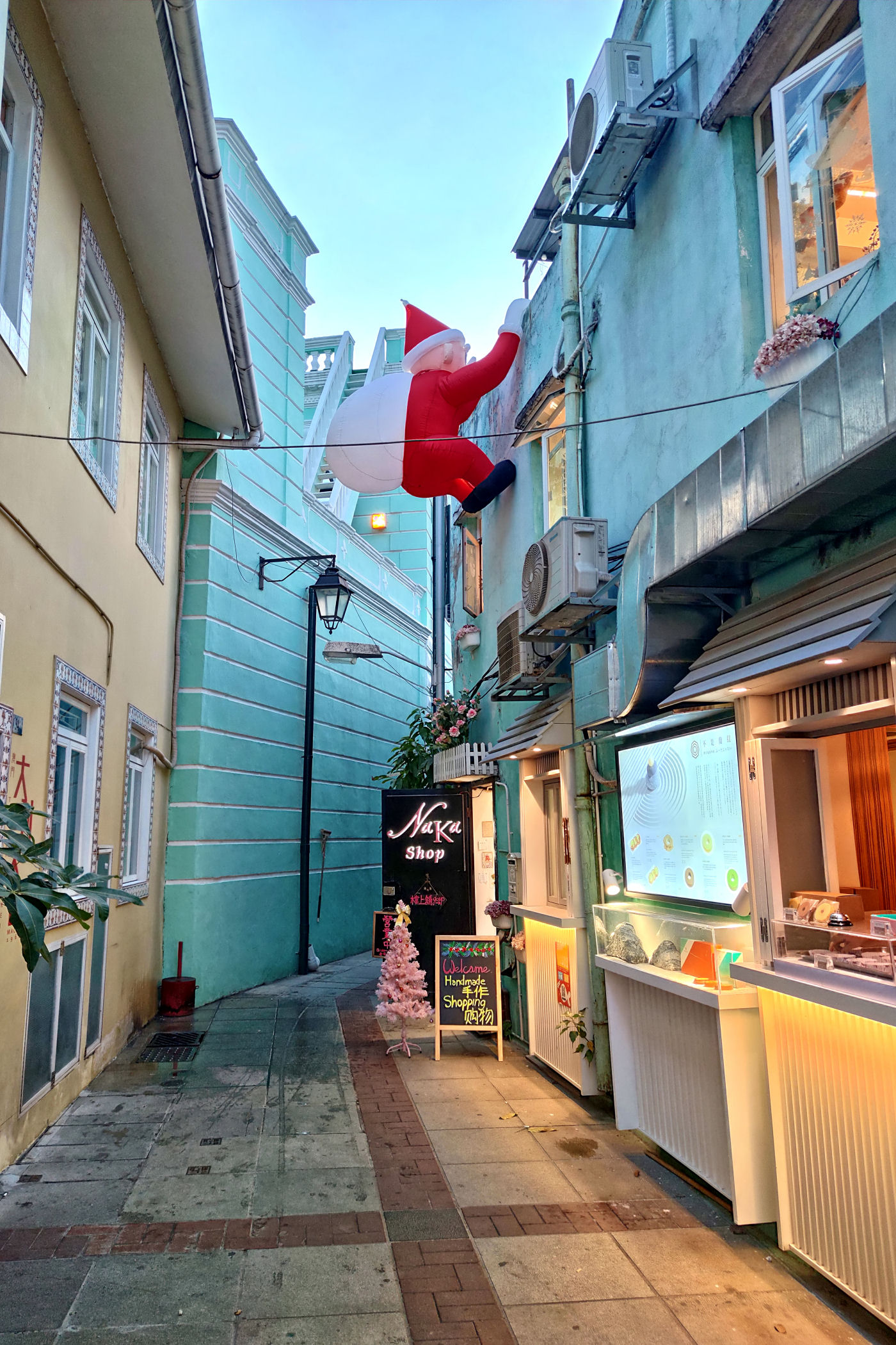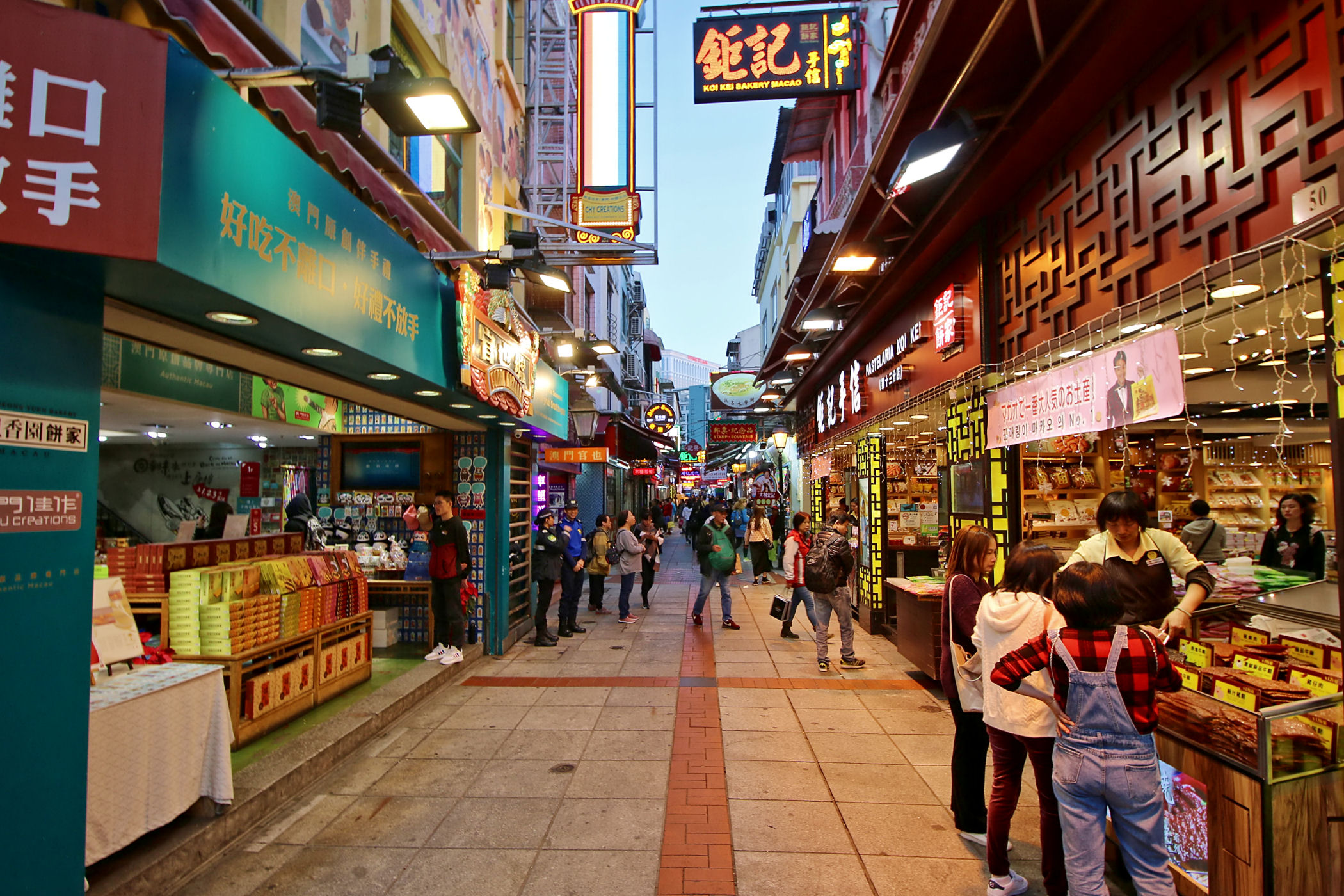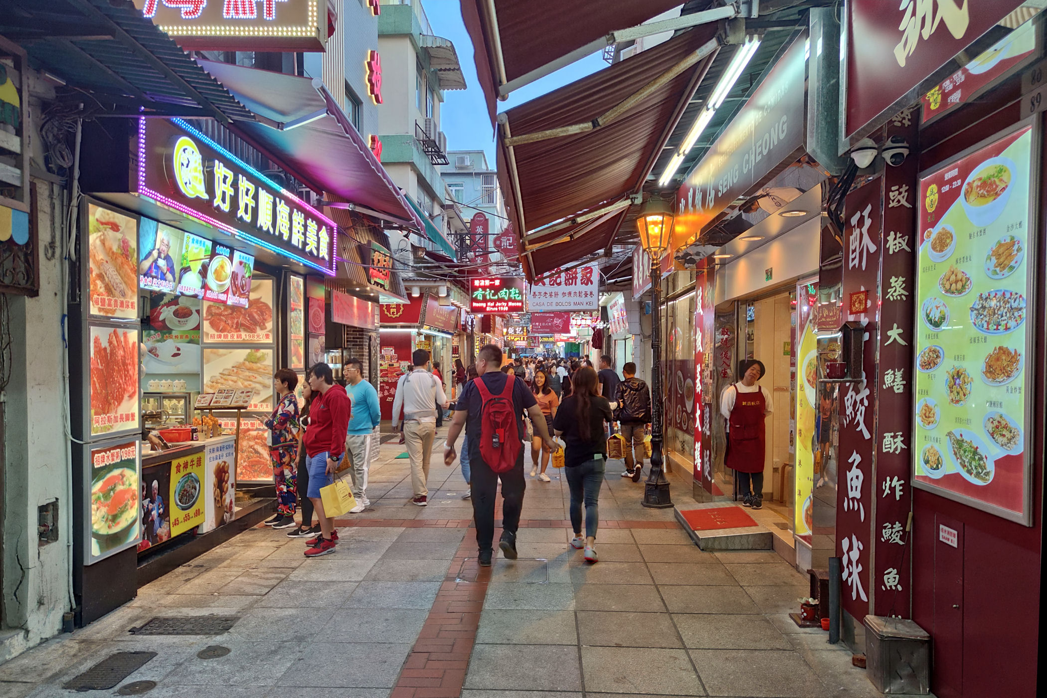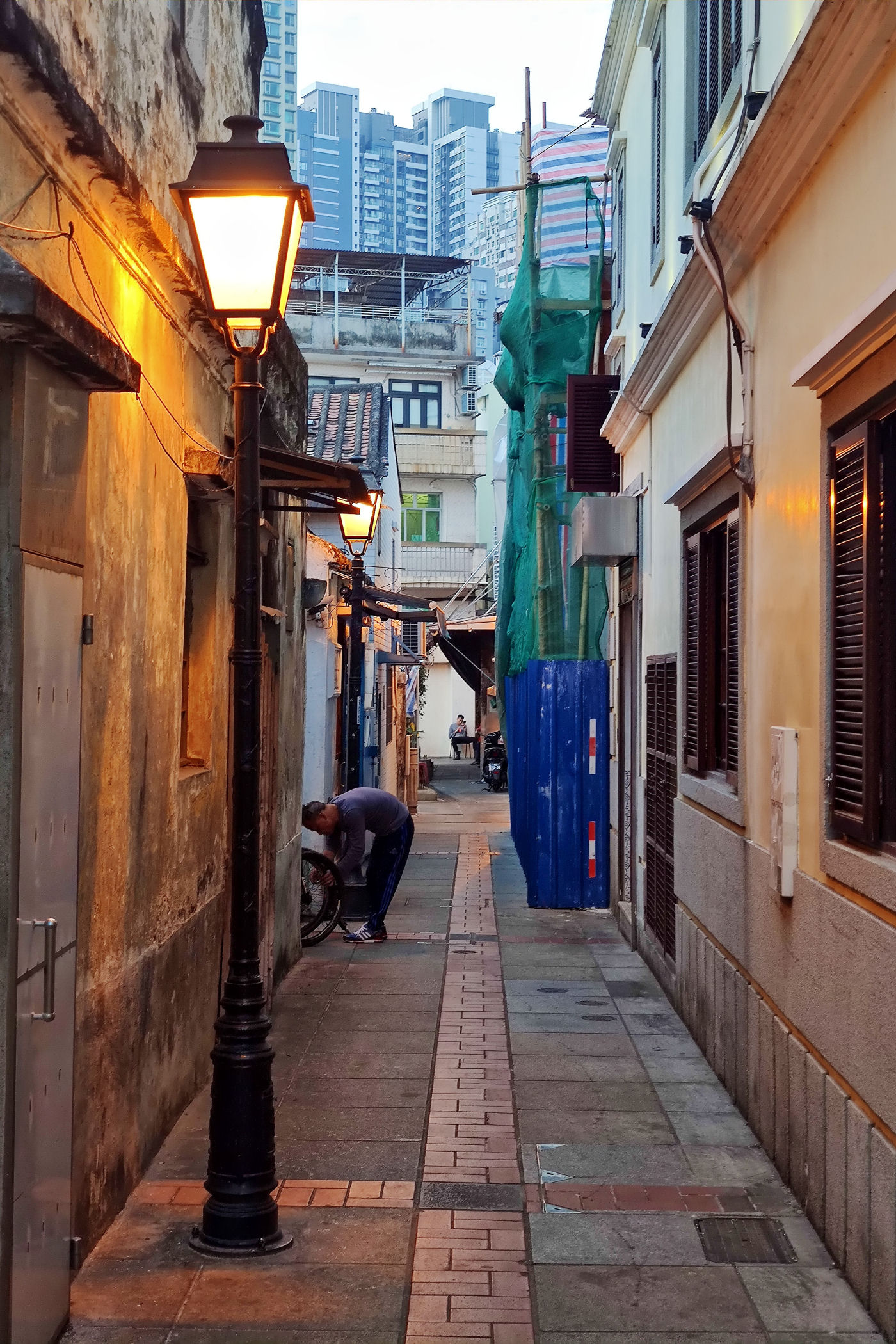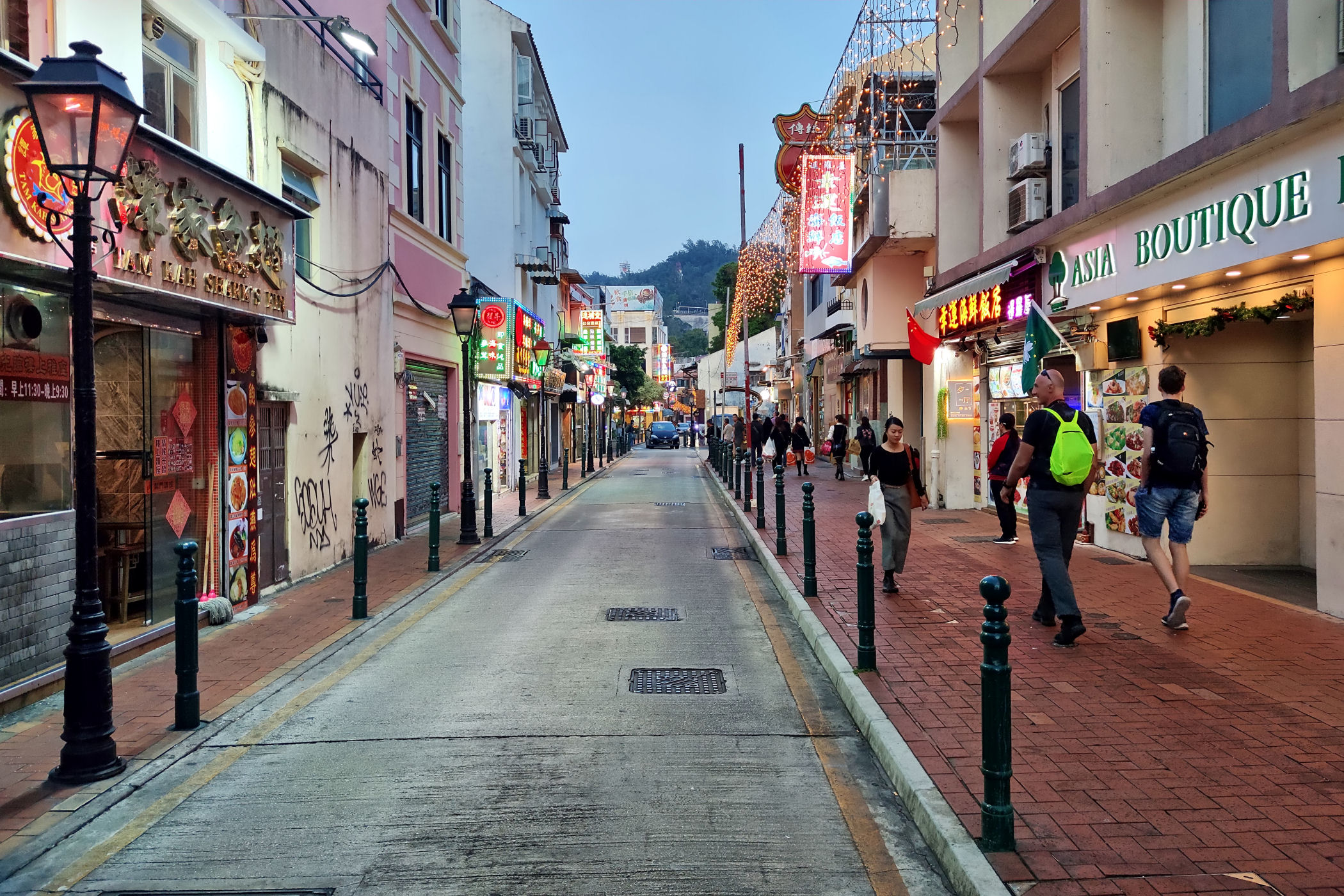 Przechodzimy dalej na południe przez Aleję Olimpica. Teraz uliczką Ponte Negra wiodącą wzdłuż kolorowych niskich już bloków dochodzimy do kompletnie innej zabudowy. To stara część Taipy jeszcze z czasów kolonialnych. Wąskie uliczki, kolorowa zabudowa, miejscami mocno zaniedbana, a do tego mnóstwo jadłodajni przy uliczkach z jedzeniem na wynos. Ta mieszanka portugalsko – chińska stanowi nie lada koloryt.