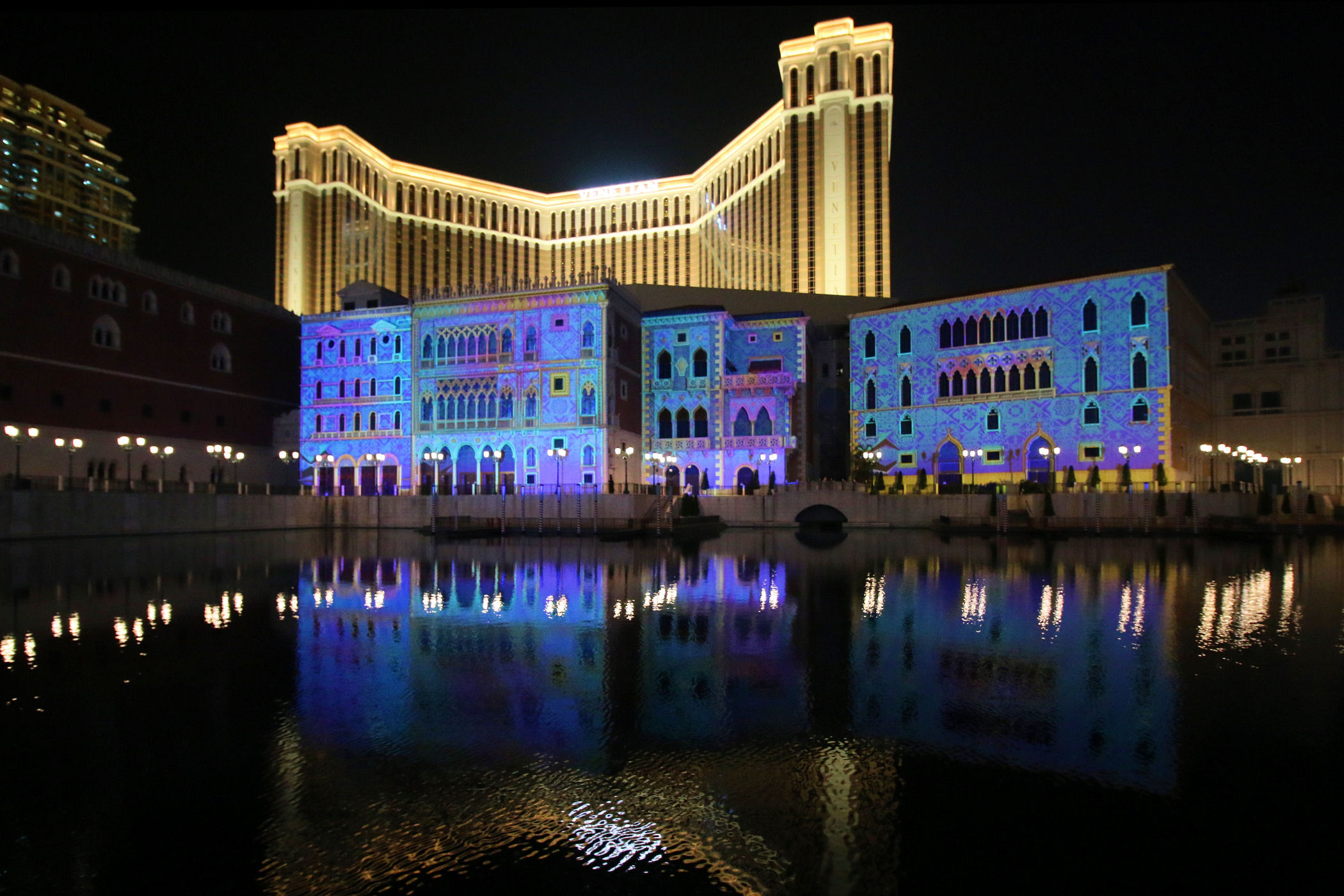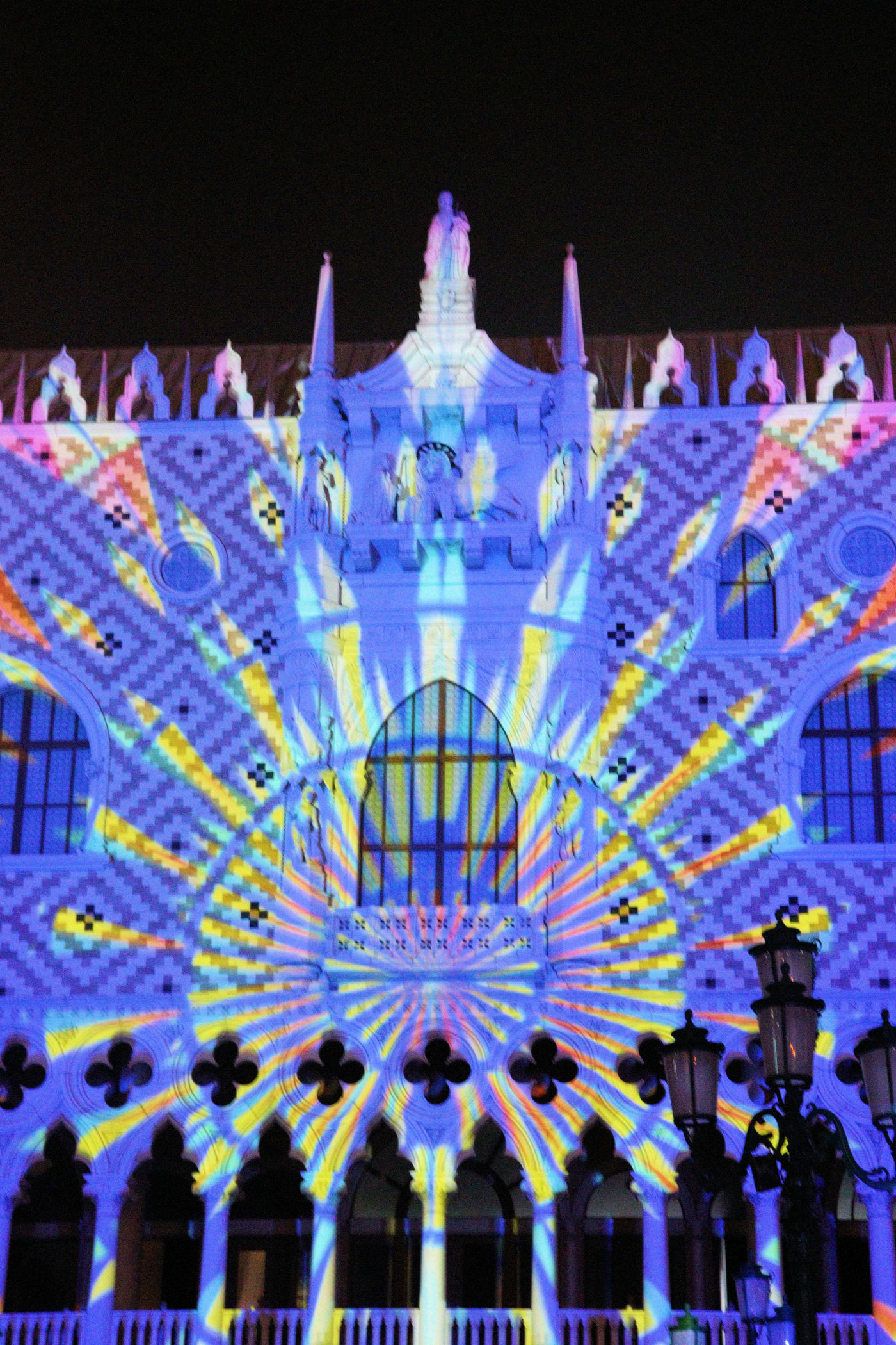 Nasz „obchód” zaczynamy od Wenecji – tu znajduje się HOTEL VENETIAN I CASINO. Oczywiście wielki hotel leży nad wodą w której odbija się pięknie podświetlony budynek. Jak dochodzimy do głównego mostu zaczyna się show. Pokaz światła na budynku nazywany mappingiem plus odpowiednia muzyka robią wrażenie.