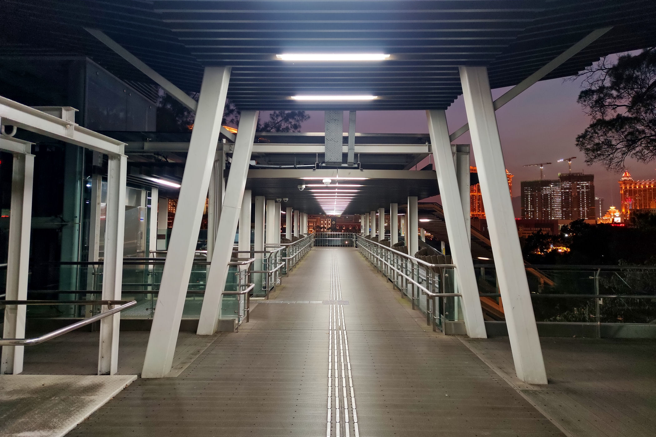 Winda jest ciekawa, bo wygląda troszkę jak kolejka, jest pochylona i samoobsługowa. Po za nami na wzgórzu nie ma nikogo. Aż się nie chce w to wierzyć – w końcu to szczyt sezonu. Z góry widać cała zabudowę dzielnicy COTAI , czyli części nowo utworzonej.