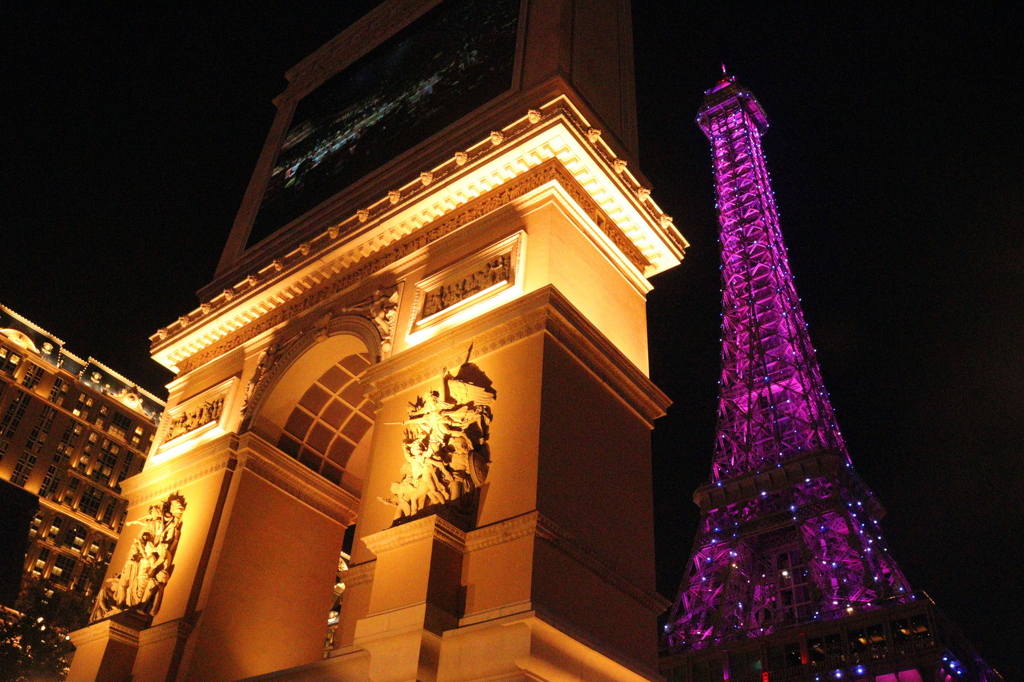 Tuż za Wenecją zaczyna się Paryż. Ogromny gmach THE PARISIAN zwraca uwagę ju z daleka górującą nad wszystkim wieżą Eifla. Widać każda mekka hazardu musi mieć swoja wieżę. Nie byliśmy rodzinnie pod oryginałem, za to byliśmy pod kopią, która szczerze mówiąc całkiem fajnie wygląda. Naprzeciwoko znajduje się odpowiednik Pól Elizejskich . Kiedy tam jesteśmy trwa właśnie jakiś koncert.