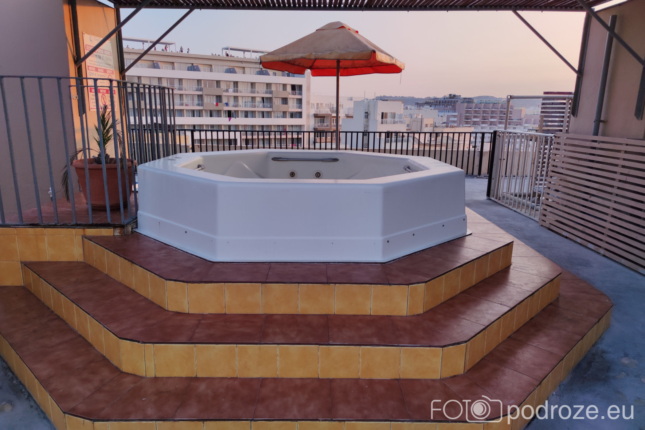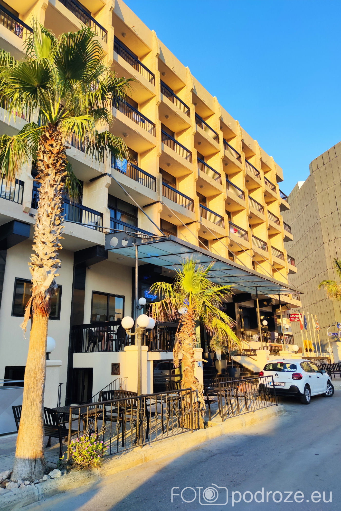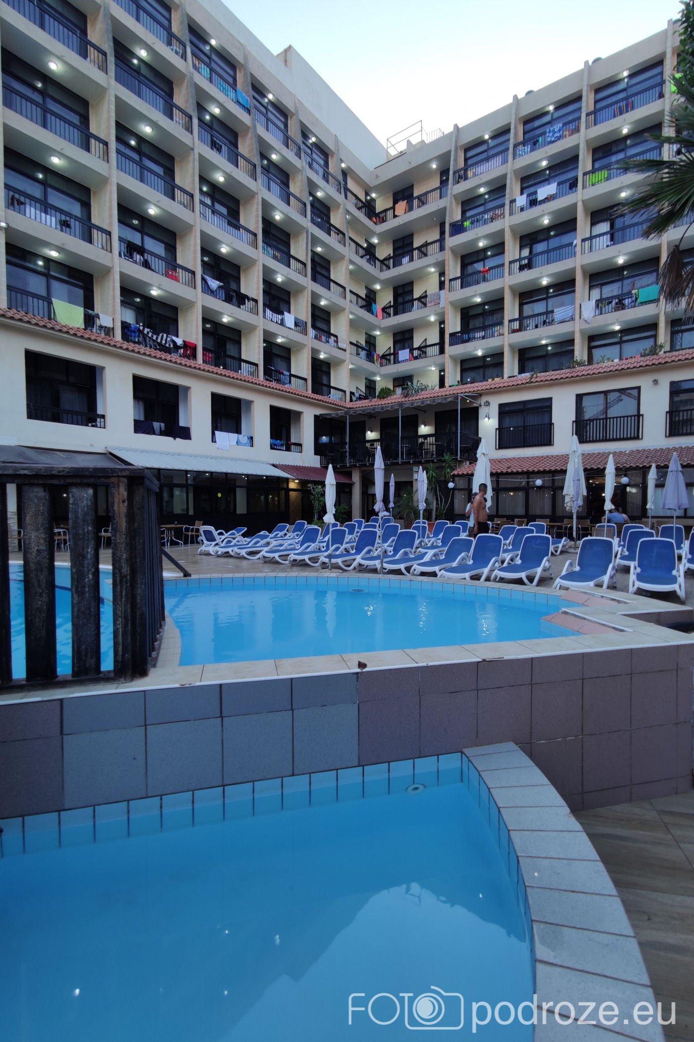 Jeśli traficie do tego hotelu co my zostawiam tu także garść informacji. Canifor Hotel ma 4 gwiazdki, ale daleko mu do tego poziomu. Położony w centrum betonowej dżungli z dala od wybrzeża oferuje nieciekawe widoki. Basen maleńki wciśnięty między zabudowania , na dachu niedziałające, zagrzybiałe jacuzzi i potwornie brudne leżaki. Balkony połączone ze sobą nie dość, że nie oferują najmniejszej intymności, to zmuszają do zamykania drzwi (żeby nieproszeni goście nie skorzystali). Do tego muzyka wewnątrz dziedzińca na pełen regulator do późnej nocy. Mąż z synem dostali pokój od strony ulicy i było jeszcze gorzej. Cysterna z wodą codziennie budziła ich głośnymi odgłosami o 5 rano.