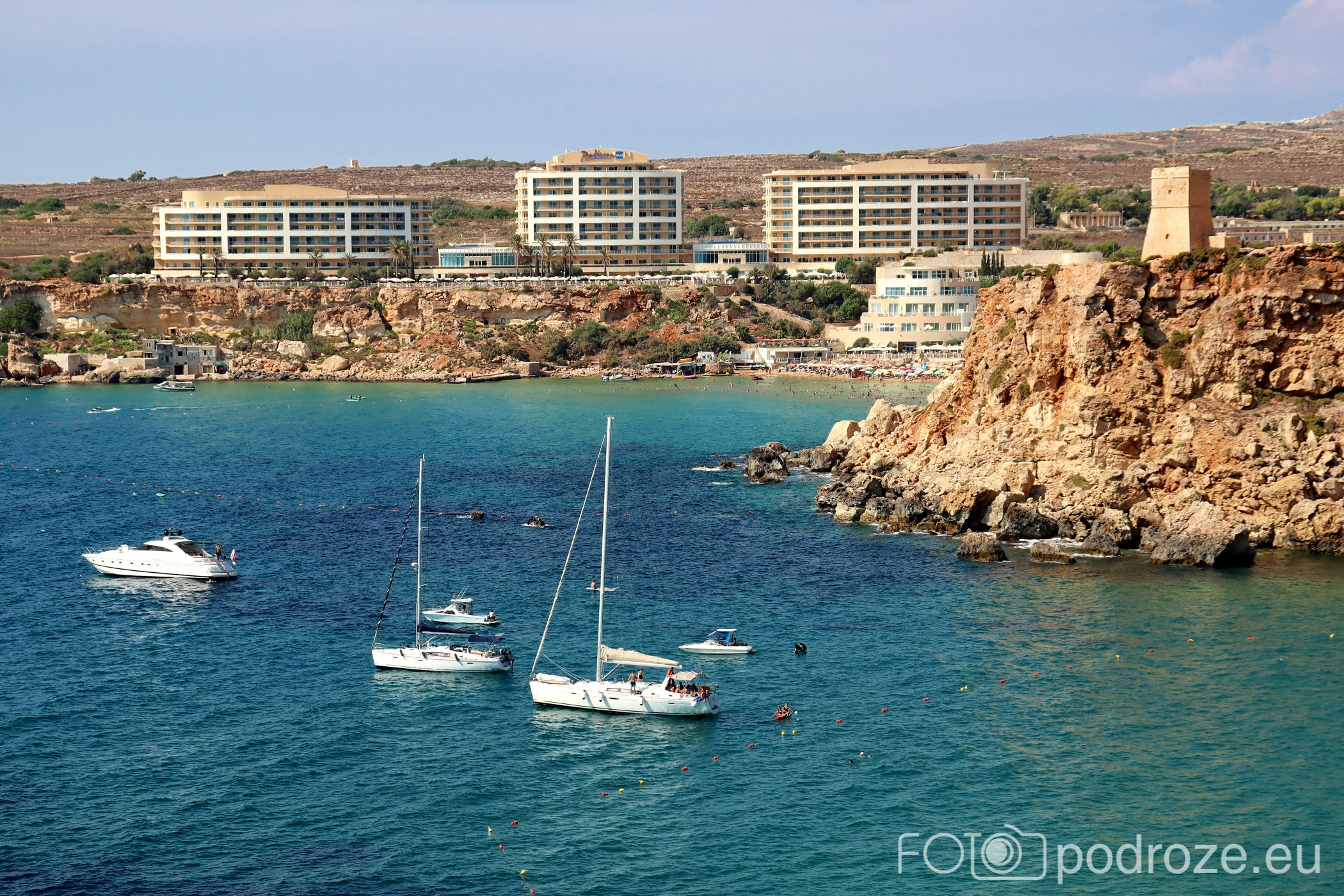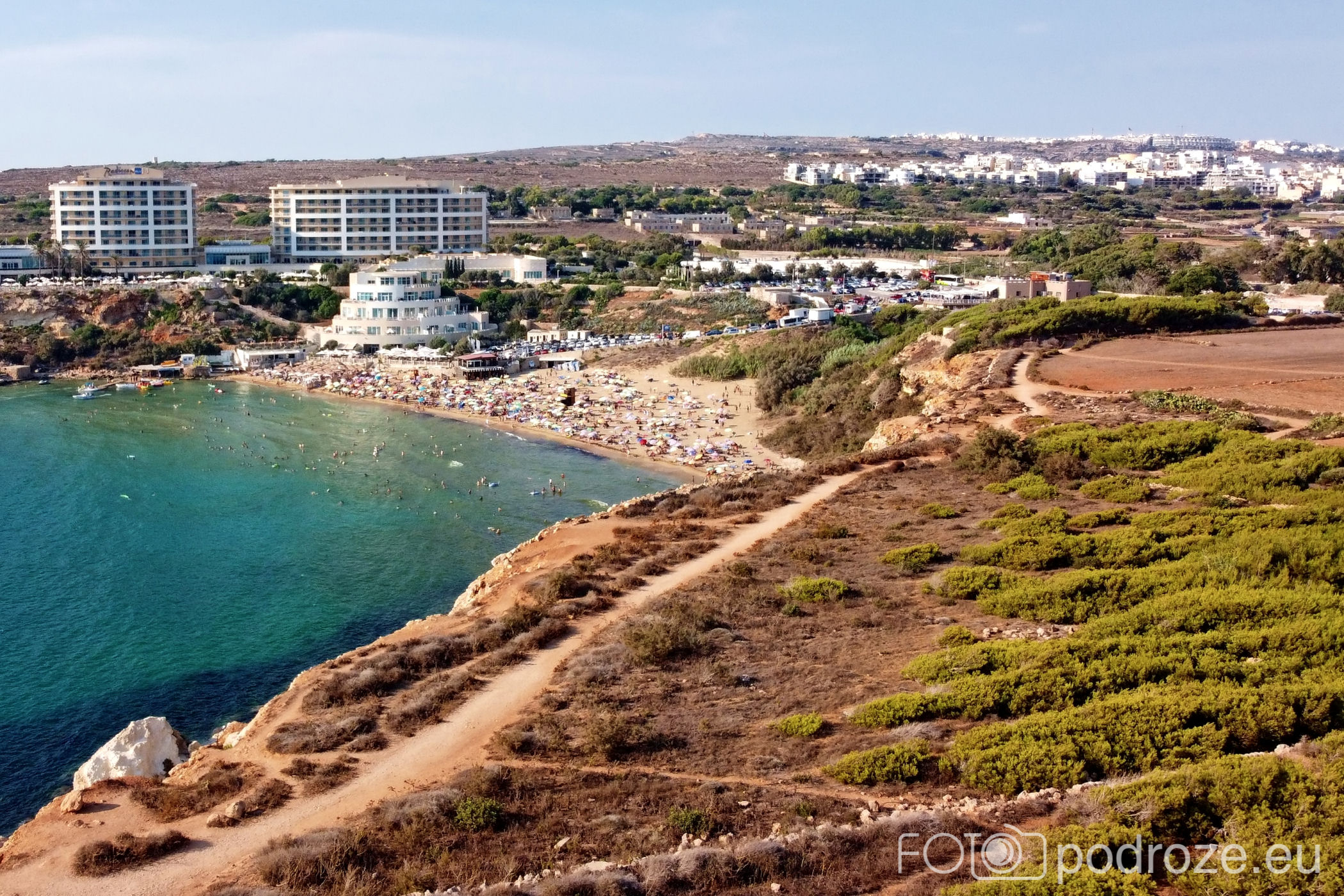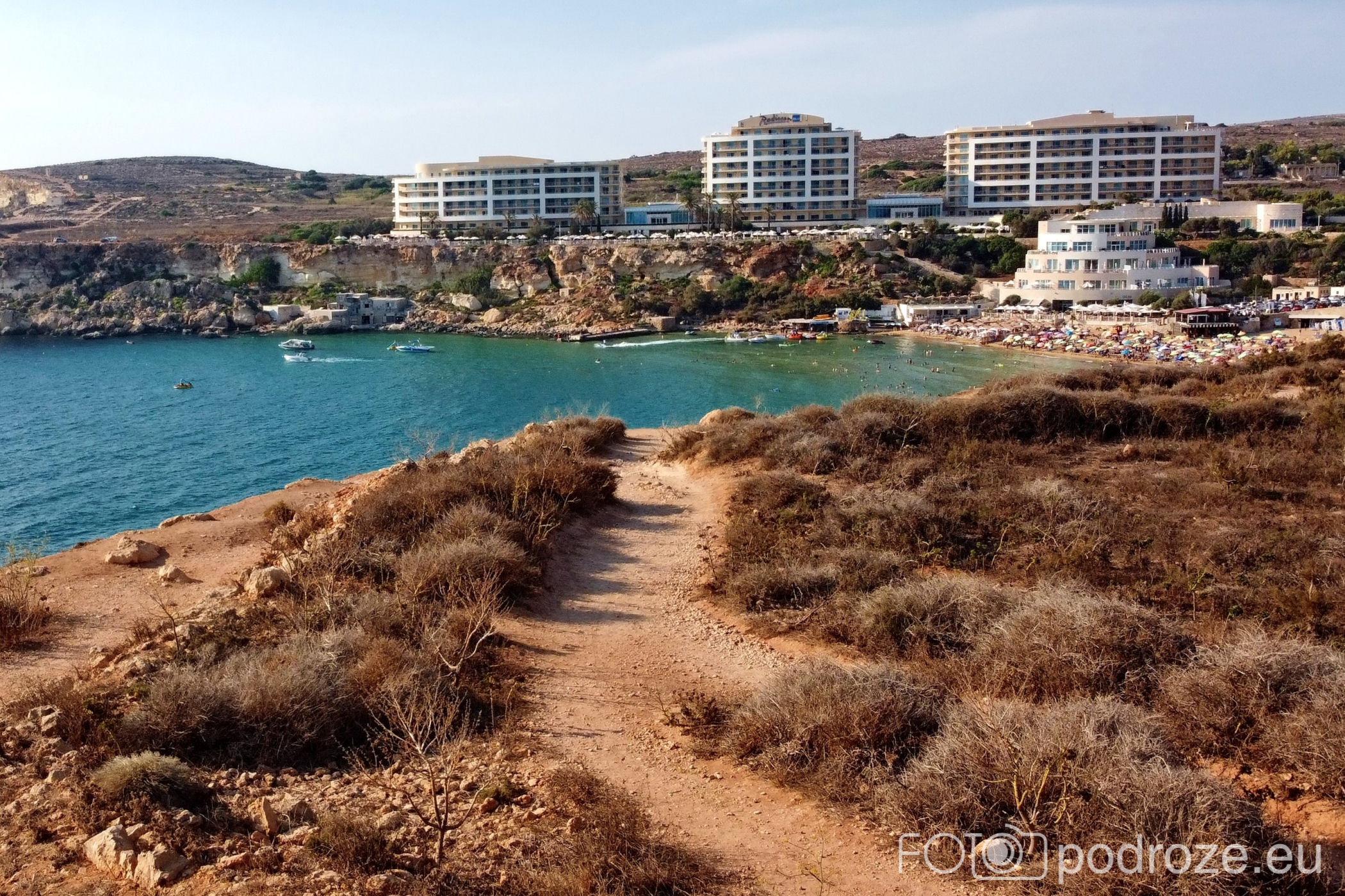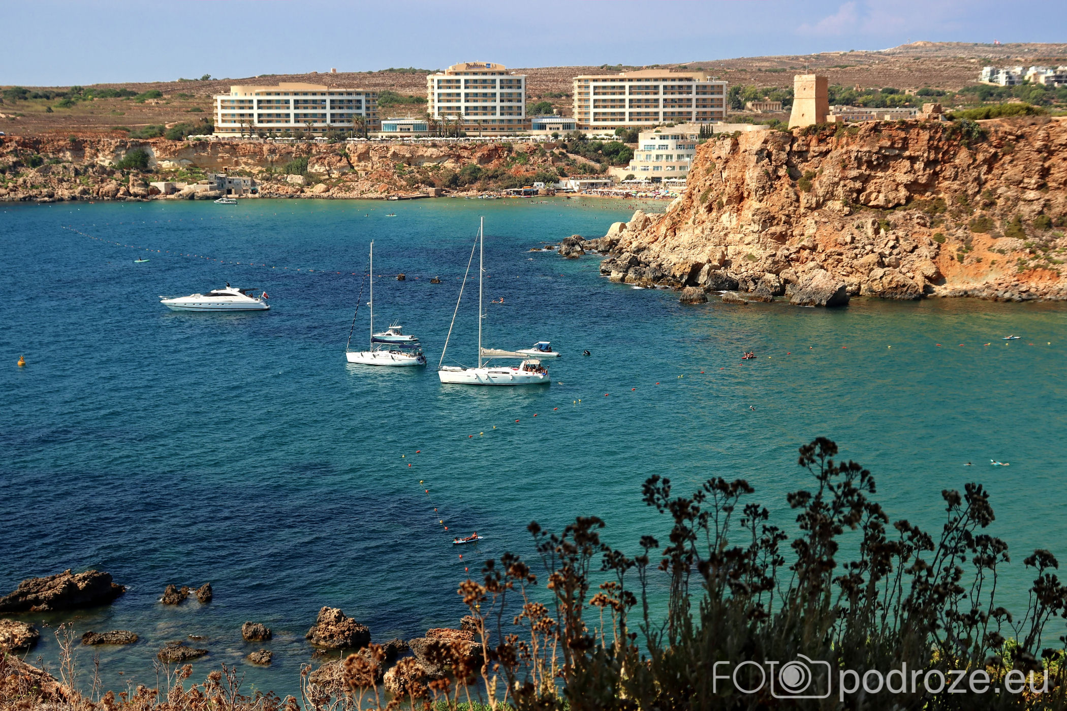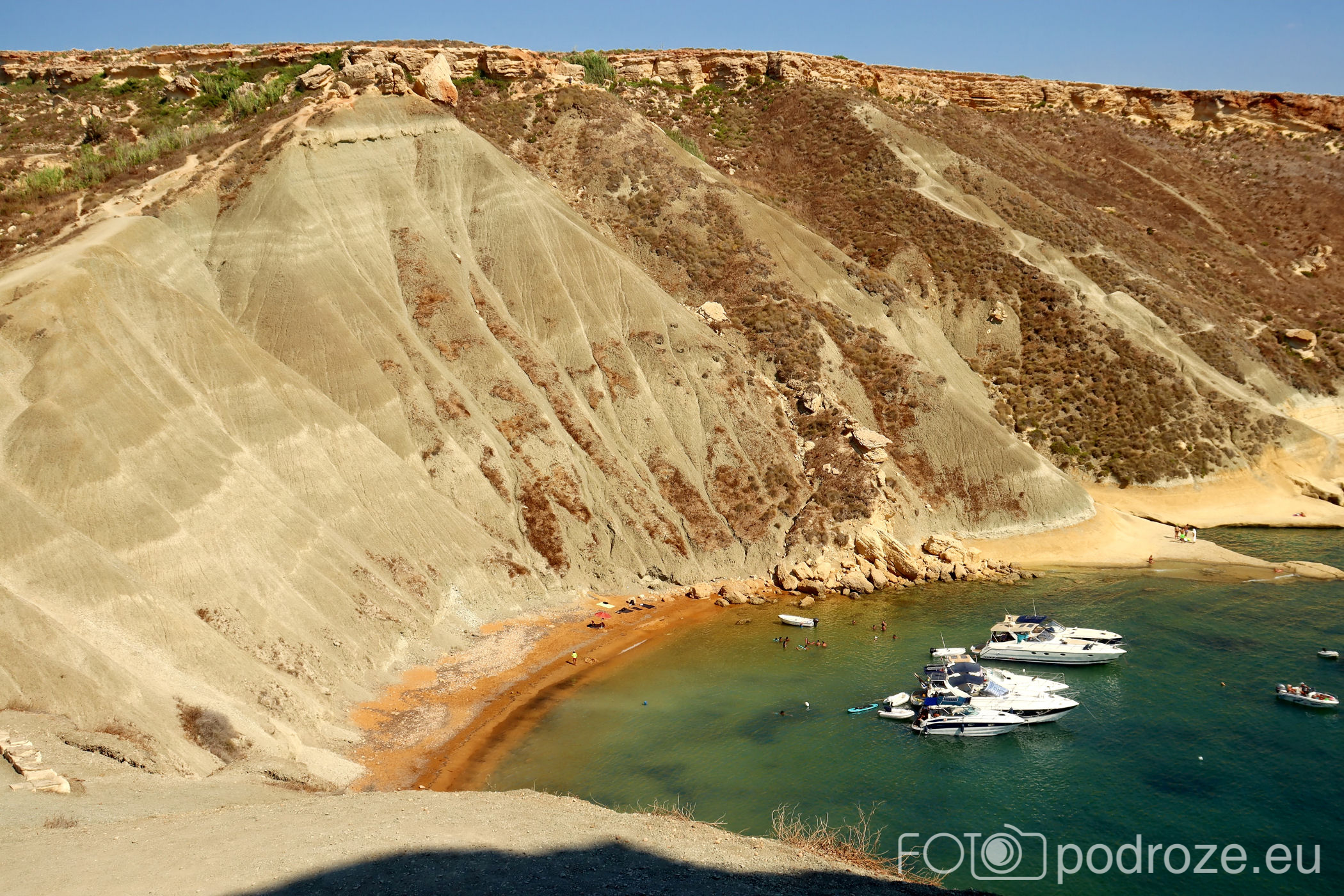 Zatoka Golden Bay to podobno jedna z najpiękniejszych plaż na wyspie. A to dzięki osłoniętym brzegom schowanym za górzystym wybrzeżem i pochyłym klifom oraz przede wszystkim dzięki piaskowi , który nie jest tu zbyt często spotykany. Zatoka ma swój parking i przystanek autobusowy oraz kompleks hotelowy – Aquamarine Watersports Golden Bay Malta. Ma jak już wspominałam szeroką linię brzegową z miękkim złotym piaskiem i spokojniejsze wody niż w innych rejonach. Na plaży można wypożyczyć leżaki i parasole, a na miejscu są też kawiarnie i restauracje. My do tej zatoki nie schodziliśmy, ale miejsca, które zamieszczam są robione z cypla na południe od niej.
