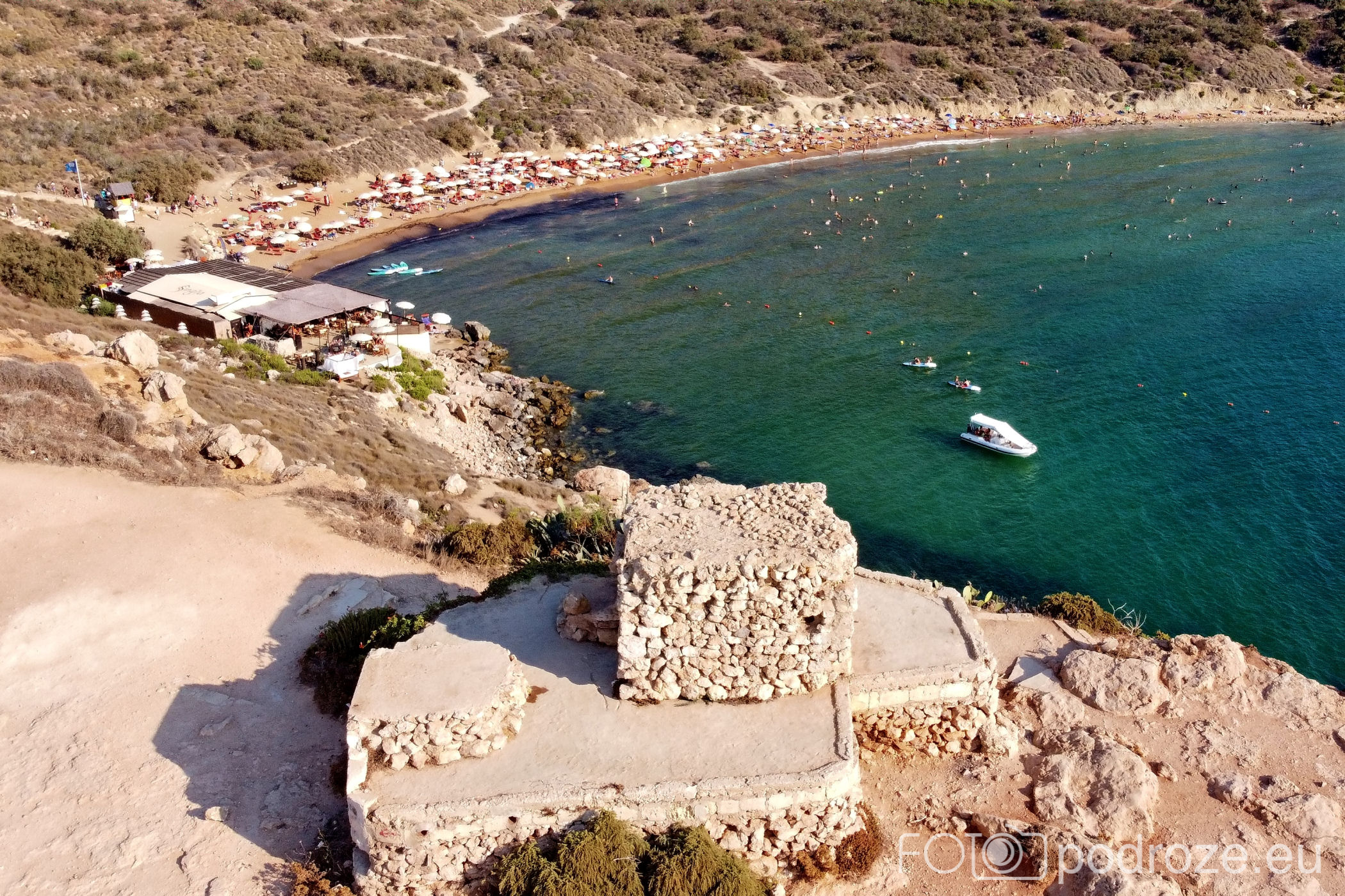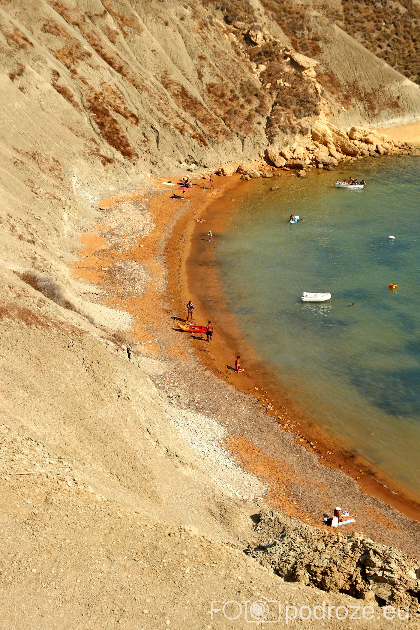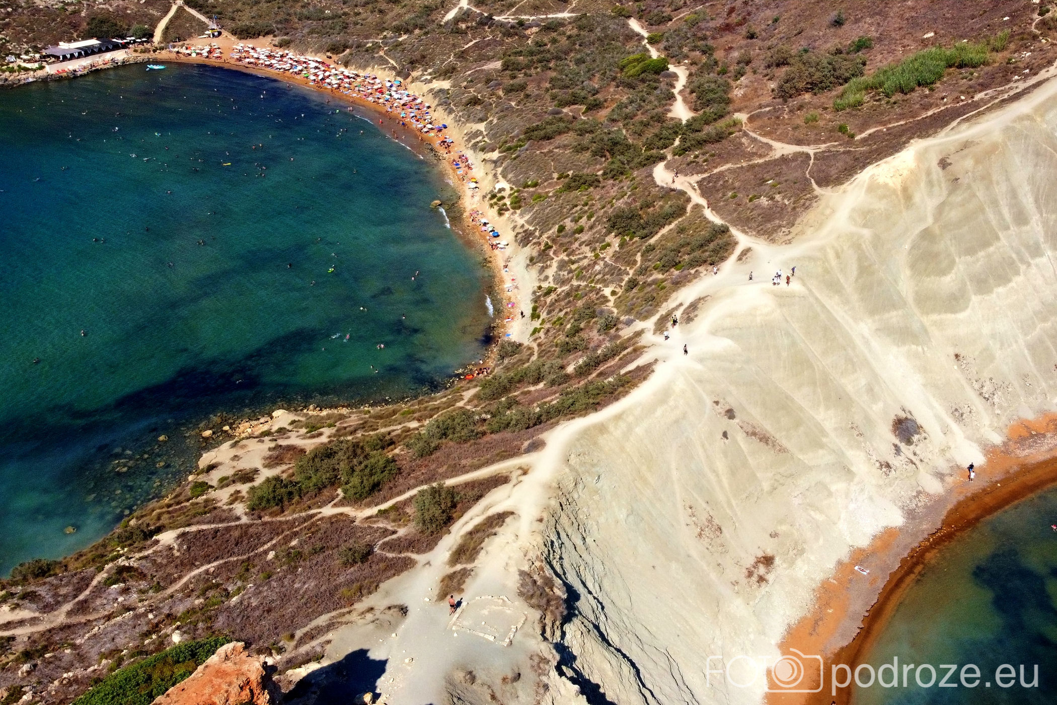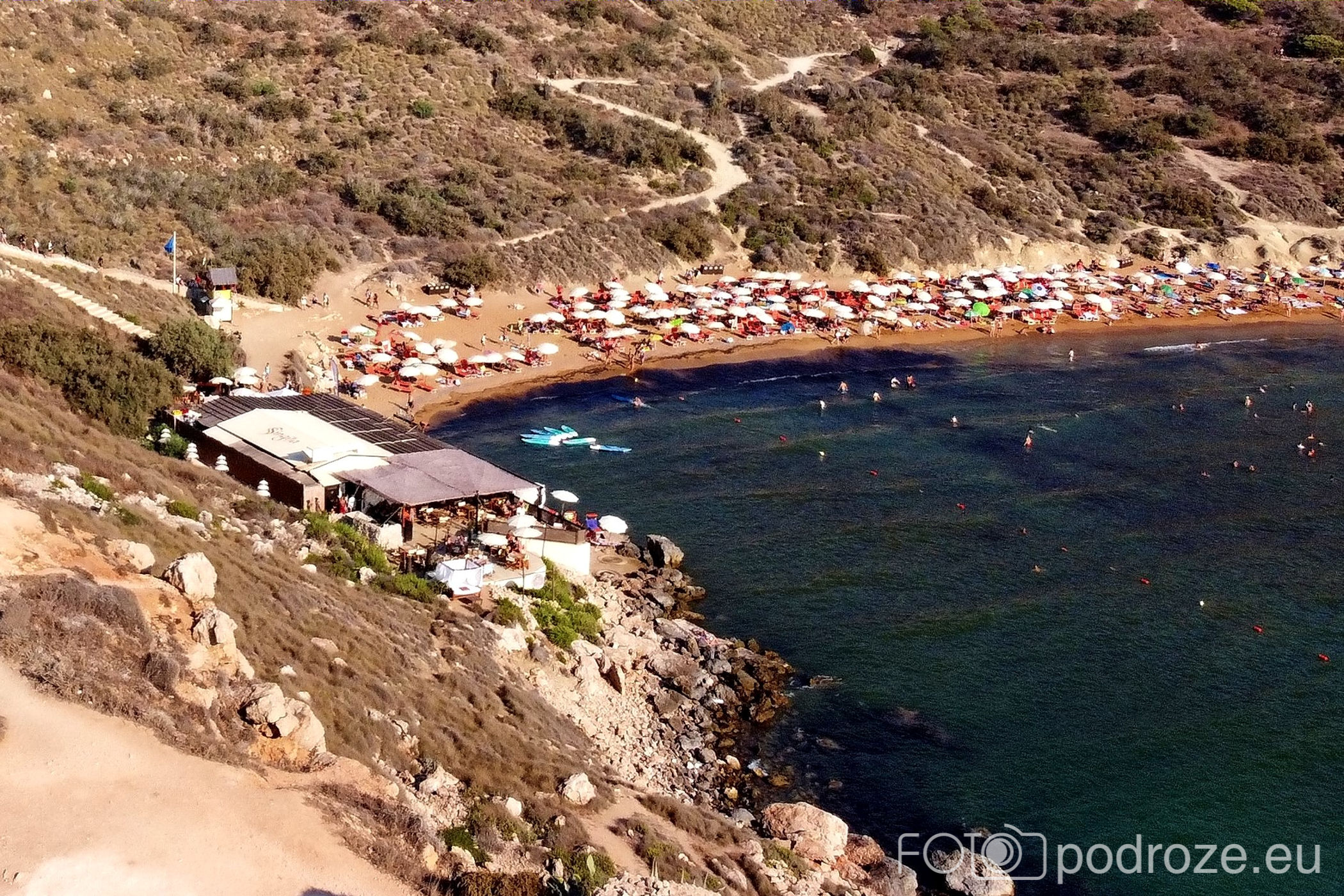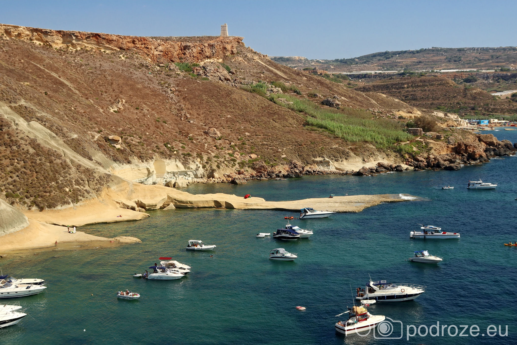 Zatoka Golden Bay to podobno jedna z najpiękniejszych plaż na wyspie. A to dzięki osłoniętym brzegom schowanym za górzystym wybrzeżem i pochyłym klifom oraz przede wszystkim dzięki piaskowi , który nie jest tu zbyt często spotykany. Zatoka ma swój parking i przystanek autobusowy oraz kompleks hotelowy – Aquamarine Watersports Golden Bay Malta. Ma jak już wspominałam szeroką linię brzegową z miękkim złotym piaskiem i spokojniejsze wody niż w innych rejonach. Na plaży można wypożyczyć leżaki i parasole, a na miejscu są też kawiarnie i restauracje. My do tej zatoki nie schodziliśmy, ale miejsca, które zamieszczam są robione z cypla na południe od niej.