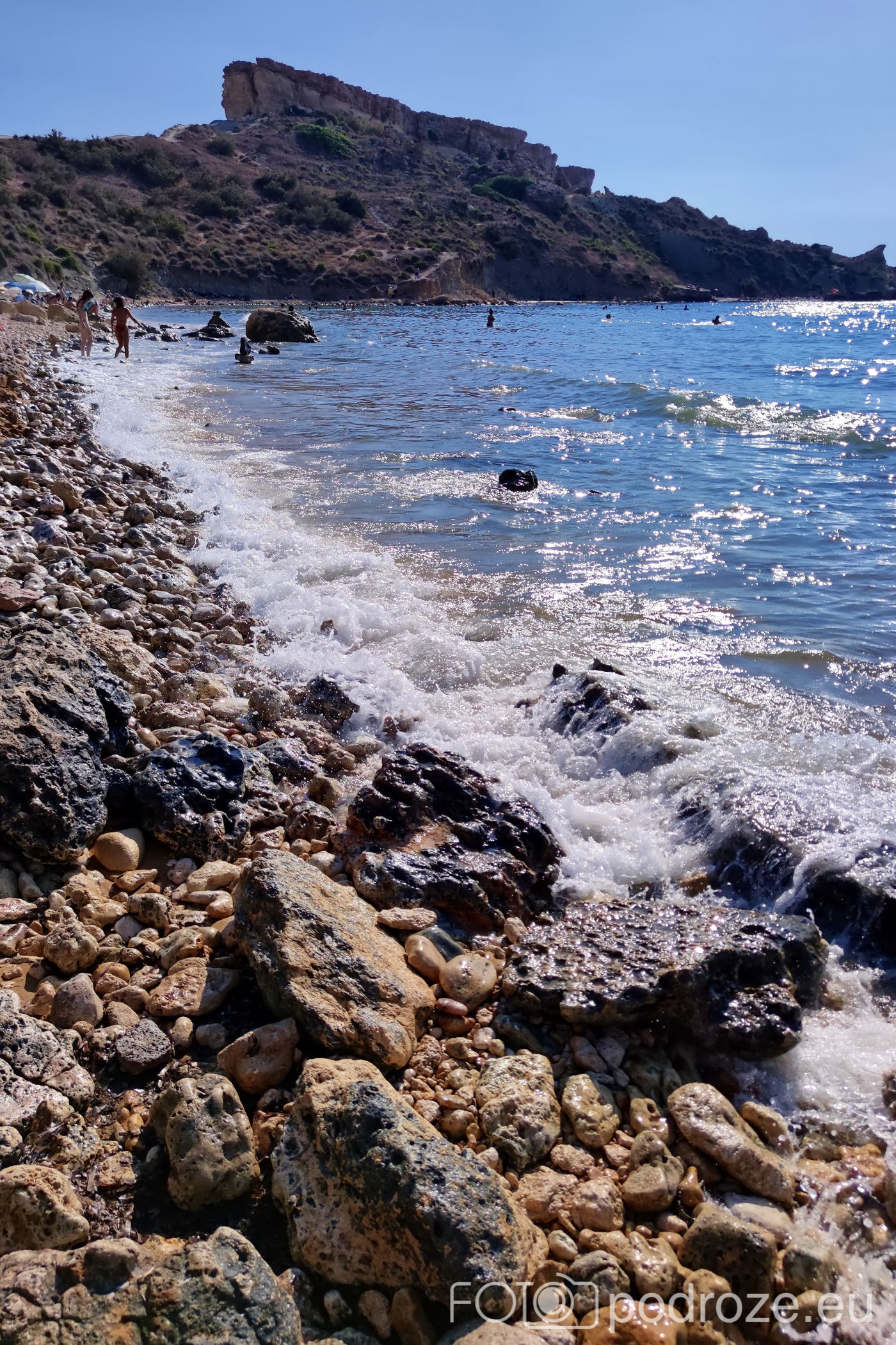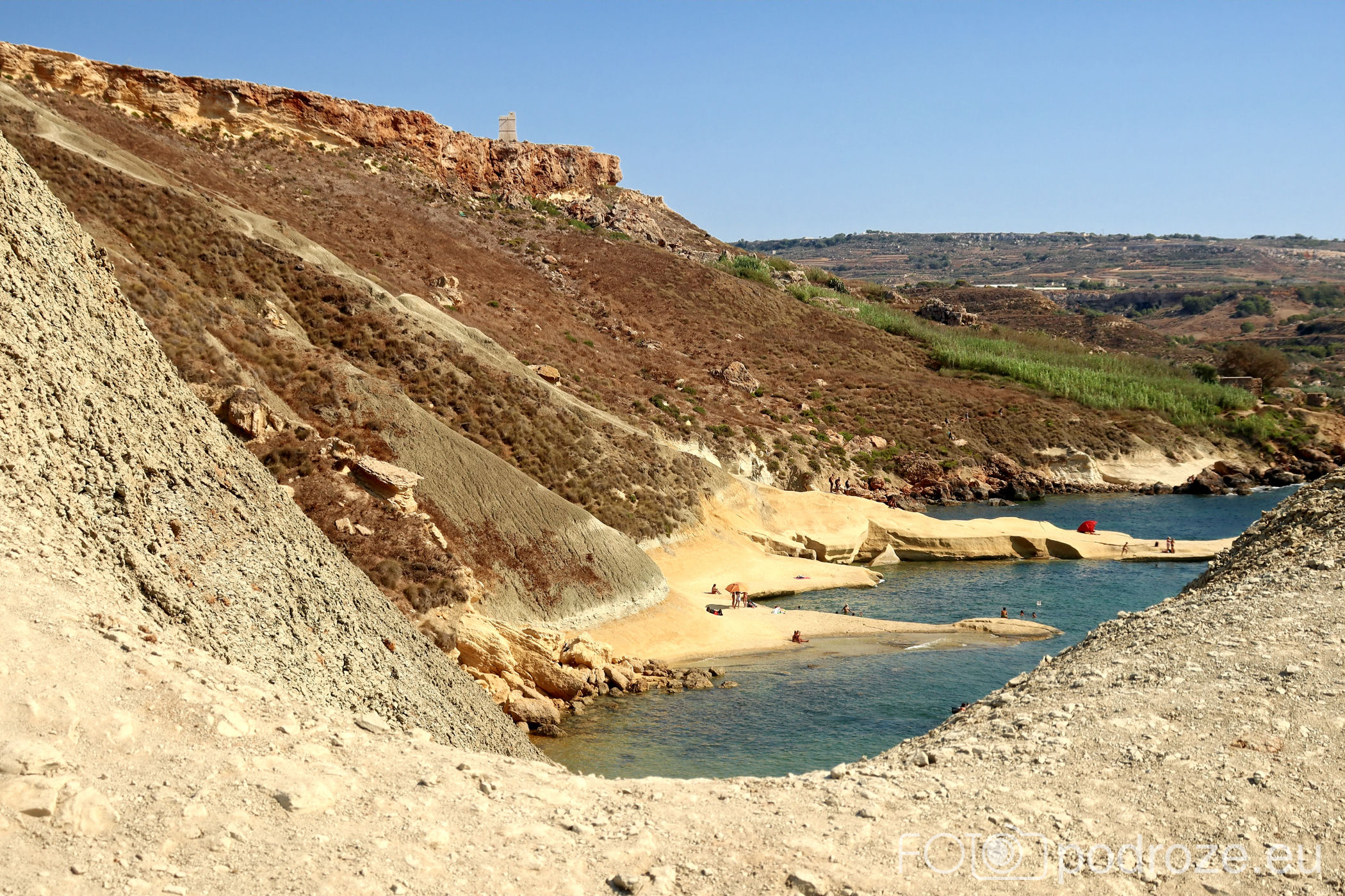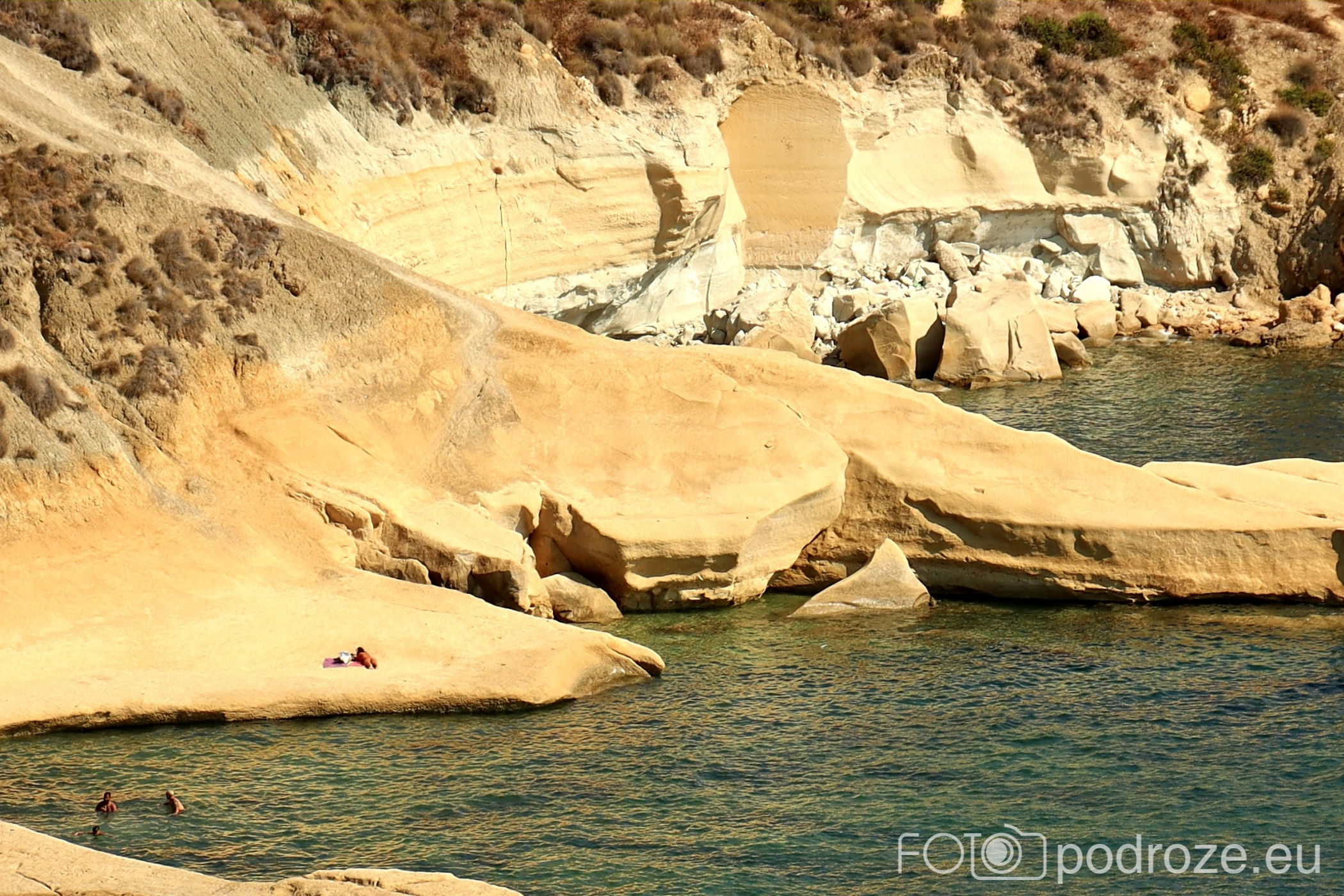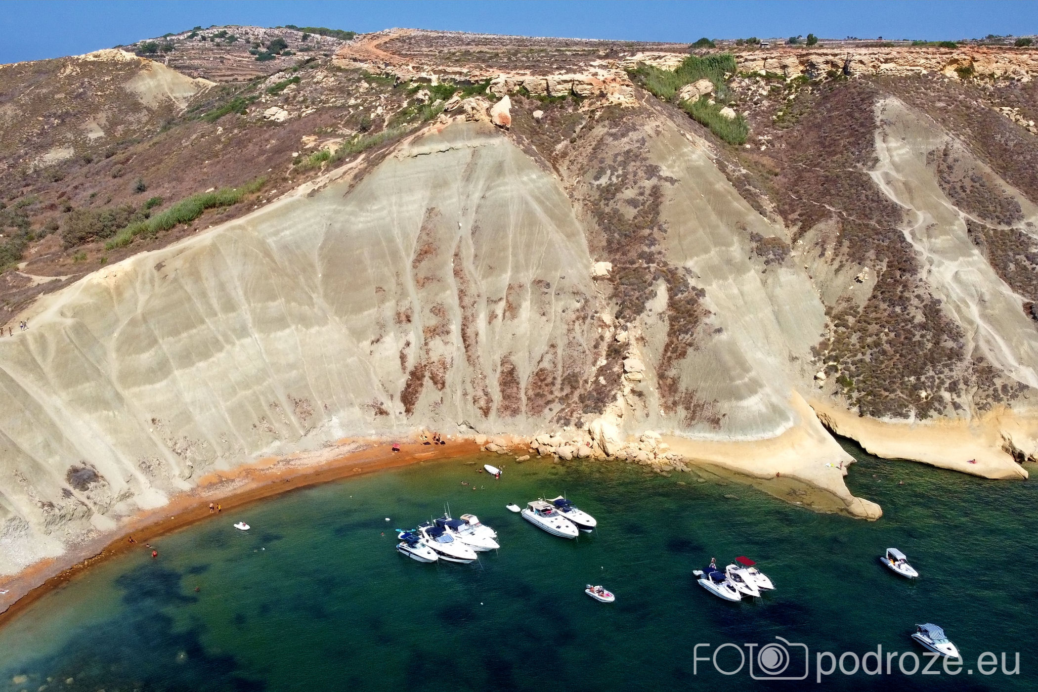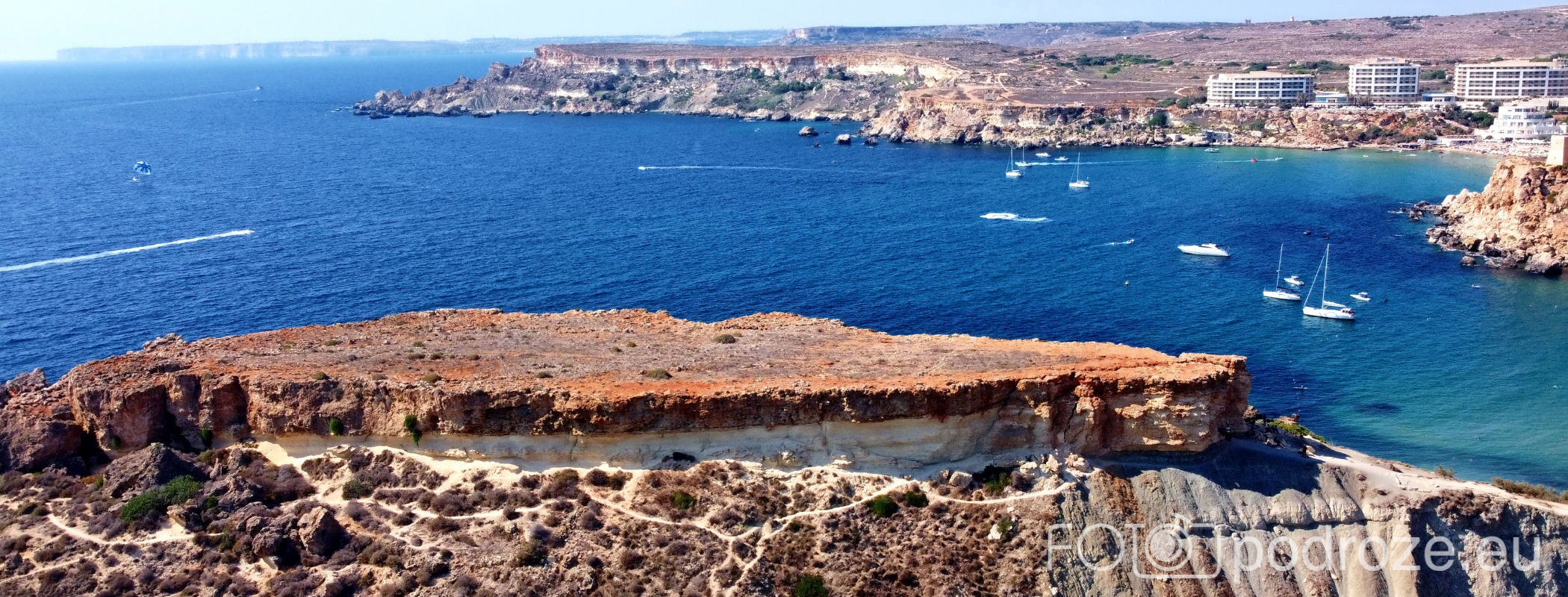 Zatoka Golden Bay to podobno jedna z najpiękniejszych plaż na wyspie. A to dzięki osłoniętym brzegom schowanym za górzystym wybrzeżem i pochyłym klifom oraz przede wszystkim dzięki piaskowi , który nie jest tu zbyt często spotykany. Zatoka ma swój parking i przystanek autobusowy oraz kompleks hotelowy – Aquamarine Watersports Golden Bay Malta. Ma jak już wspominałam szeroką linię brzegową z miękkim złotym piaskiem i spokojniejsze wody niż w innych rejonach. Na plaży można wypożyczyć leżaki i parasole, a na miejscu są też kawiarnie i restauracje. My do tej zatoki nie schodziliśmy, ale miejsca, które zamieszczam są robione z cypla na południe od niej.