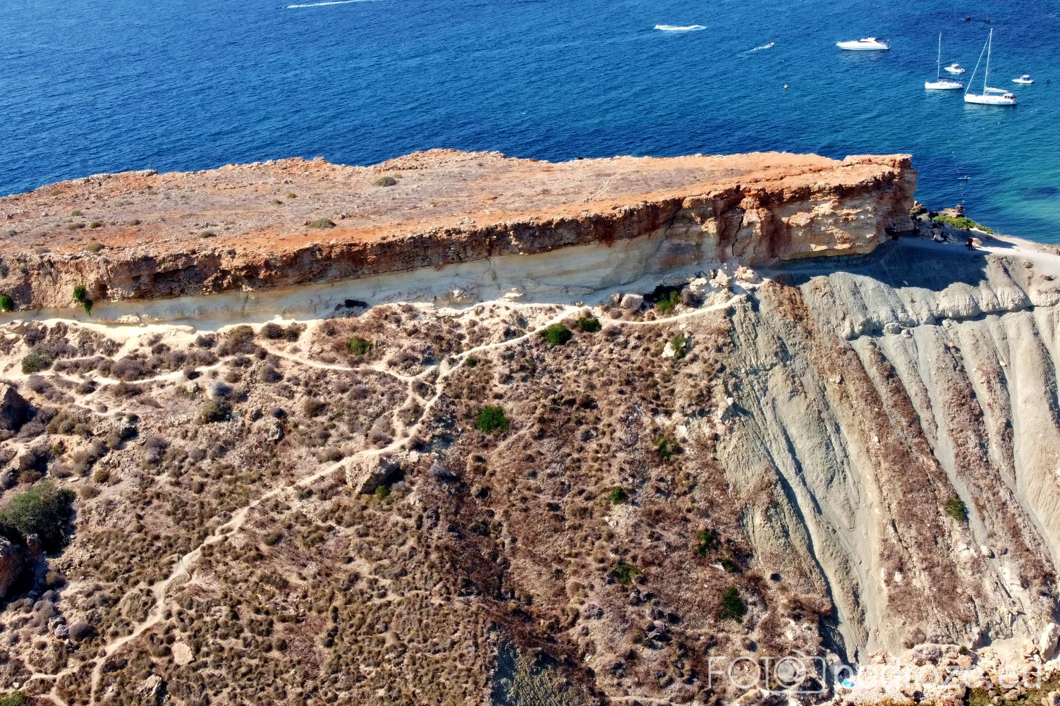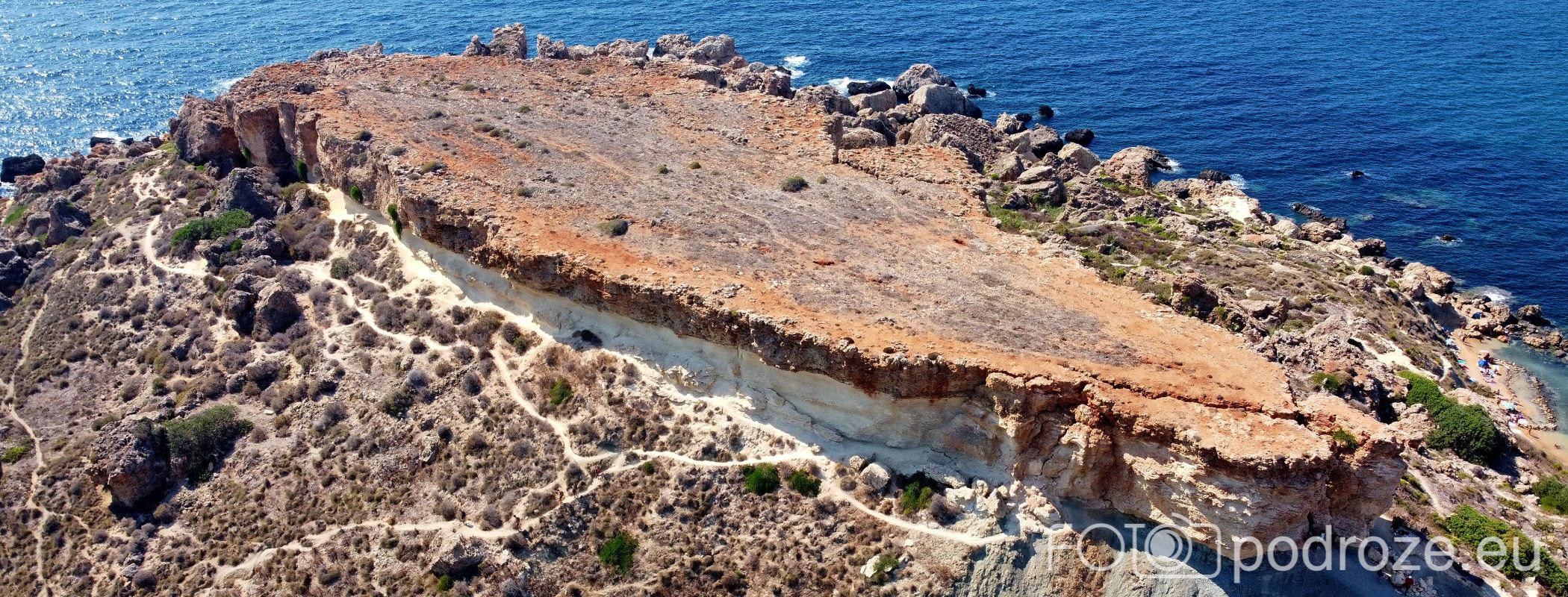 Teraz dopiero docieramy do celu. A jest nim przepiękny klif , gdzie znajduje się przepiękny spot widokowy. Na sam cypel nie dochodzimy, bo skały są tu bardzo niestabilne, a klify bardzo strome. Dzięki dronowi udaje się jednak obejrzeć całość. Aż trudno uwierzyć w jego kształt, dopiero z drona widać, że wzgórze jest płaskie jak stół, a dodatkowo uformowane jest z innego koloru skały niż okolica.