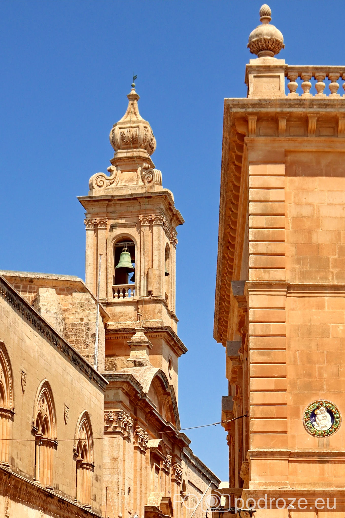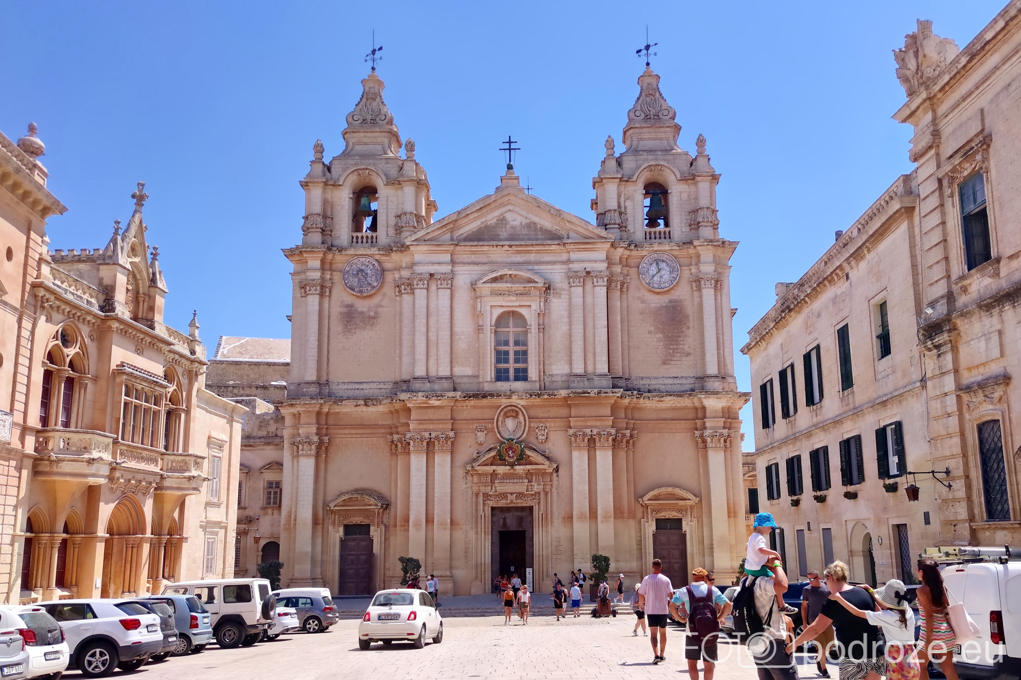 Z placu wejściowego przechodzimy ulicami dalej . Czy pójdziemy w prawo, czy w lewo, obie ulice zaprowadzą nas na kolejny plac z Katedrą Św. Pawła, który jak już wspominałam w historii dopłyną do Malty i gościł właśnie w Mdinie. Na placu króluje oczywiście piękna katedra św. Pawła. Wybudowana została w miejscu, w którym niegdyś stał dom Publiusza, pierwszego biskupa Malty. To najważniejsza, choć nie największa świątynia Malty. Katedra ma dwie wieże i dwa zegary. Prawy pokazuje godziny i minuty, lewy z kolei dni i miesiące. Wnętrze katedry jest przepiękne , niestety wstęp jest drogi (10 euro).