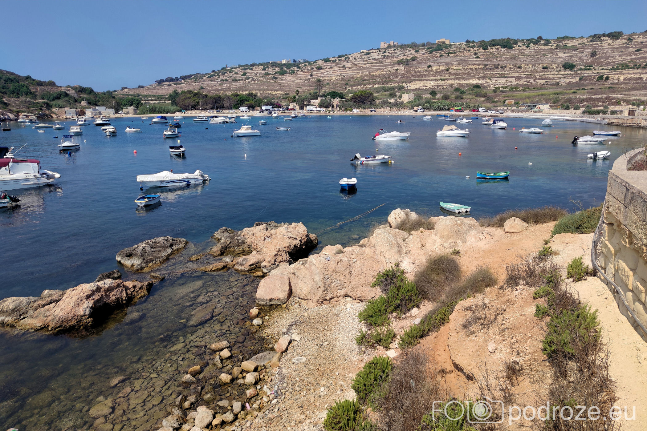 Teraz wędrujemy pionowo w dół do zatoki MISTRA BAY . W zatoce zaznaczona była plaża i do niej wędrujemy, aby ochłodzić się w morzu po małym trekkingu w palącym słońcu. Zatoczka z daleka urokliwa, z bliska okazuje się nieciekawa. Do tego woda w tym mini porcie jest wyjątkowo śmierdząca. Nikt z nas nie ma ochoty na kąpiel. Okrążamy więc zatoczkę i wędrujemy dalej.