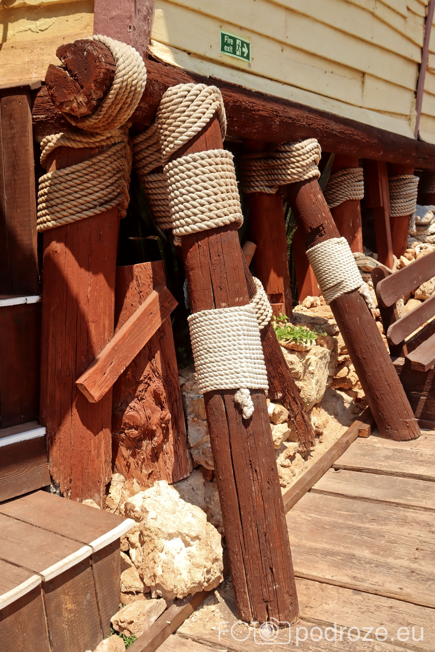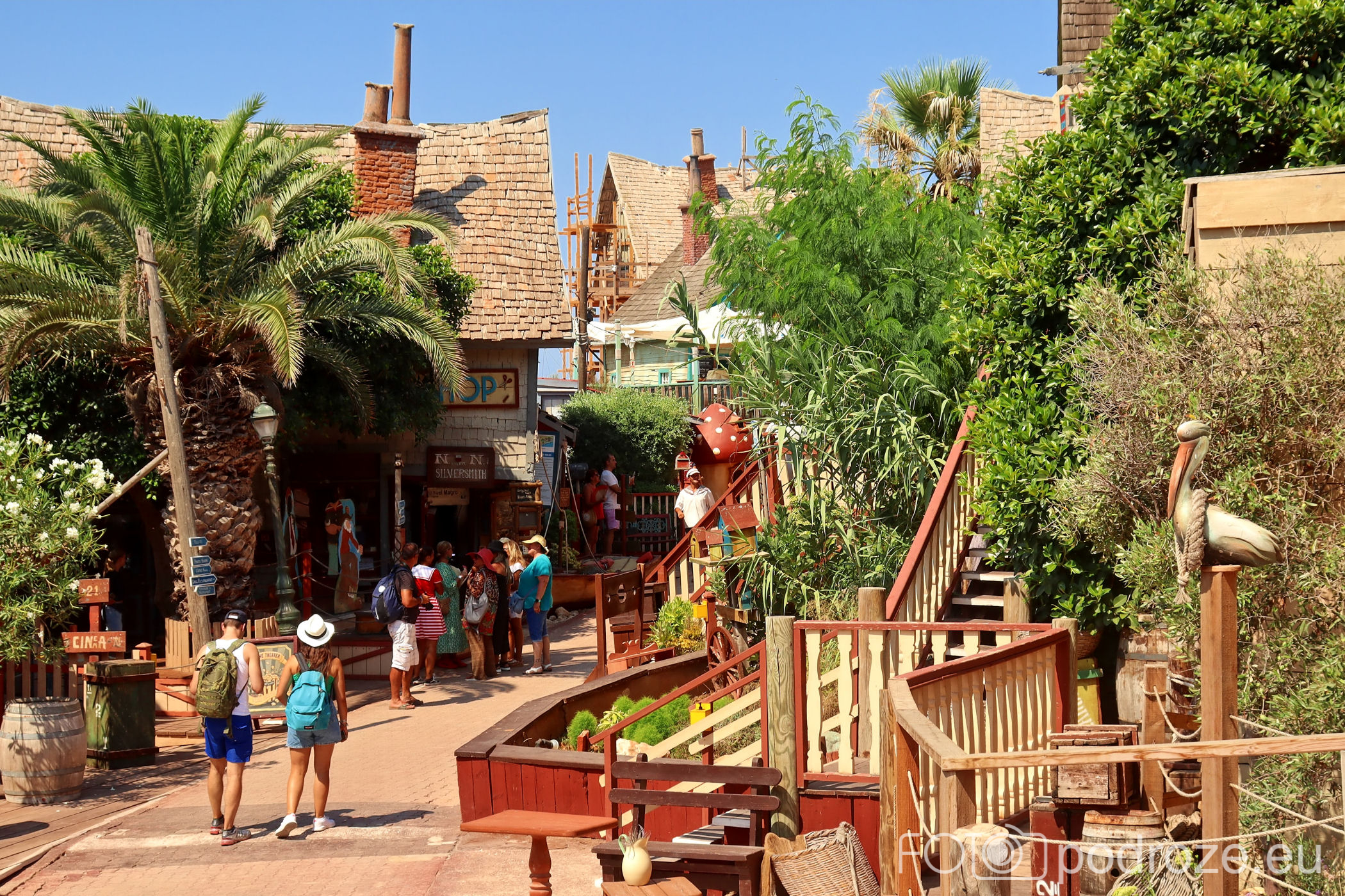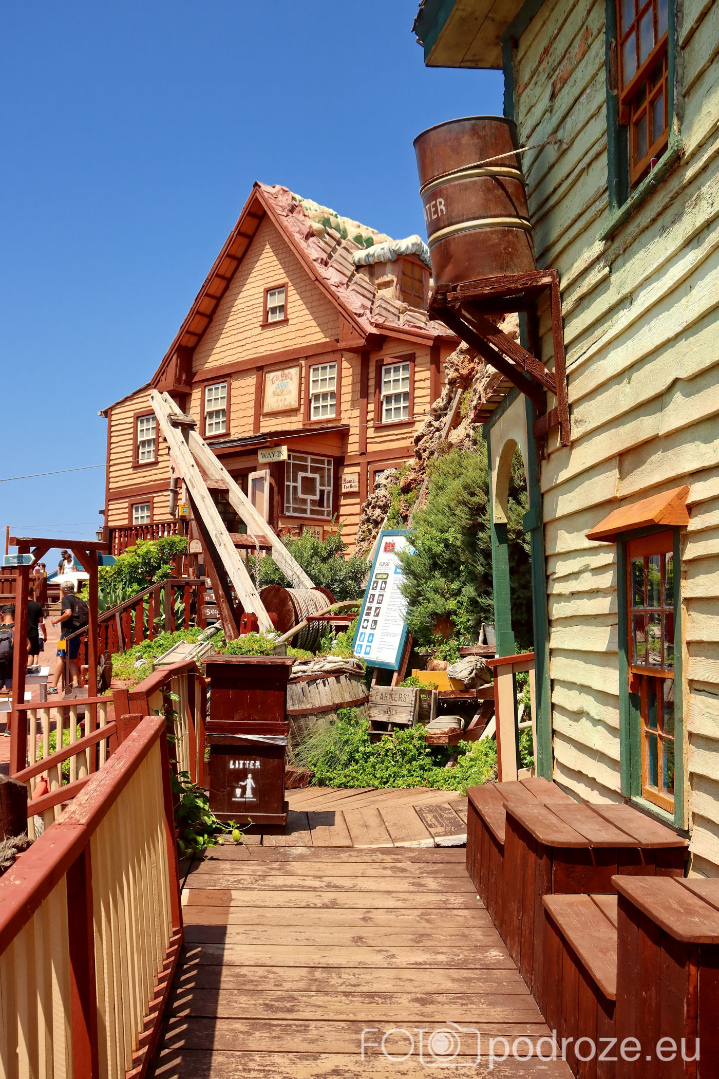 Zajeżdżamy autobusem pod samą wioskę. Już na parkingu wita nas kolorowy budynek restauracji zapowiadający cały ten kolorowy świat Popeya. Strefa wejściowa to kolejny budynek w bajkowej stylistyce. Potem schodzimy w dół mijając kopalnie, plot drewniany , mostek i 2 łodzie.