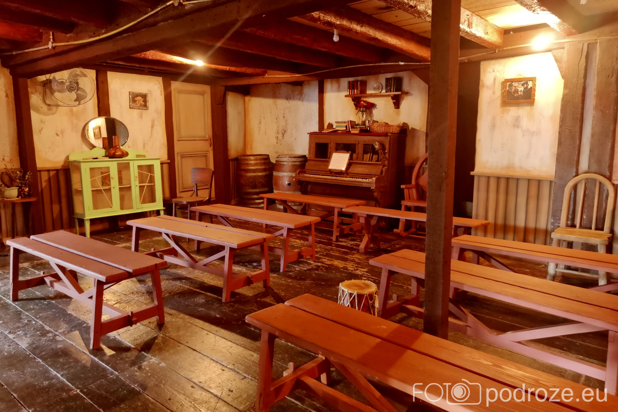 Do każdego domku można wejść i obejrzeć jego wnętrza. Mamy tu ciekawe aranżacje , wprowadzone kukły opowiadające jakąś historię. Możemy siąść do stołu, czy położyć się na łóżku bohaterów, zagrać na pianinie w knajpce, czy poczuć się jak olbrzym w pokoju iluzji.