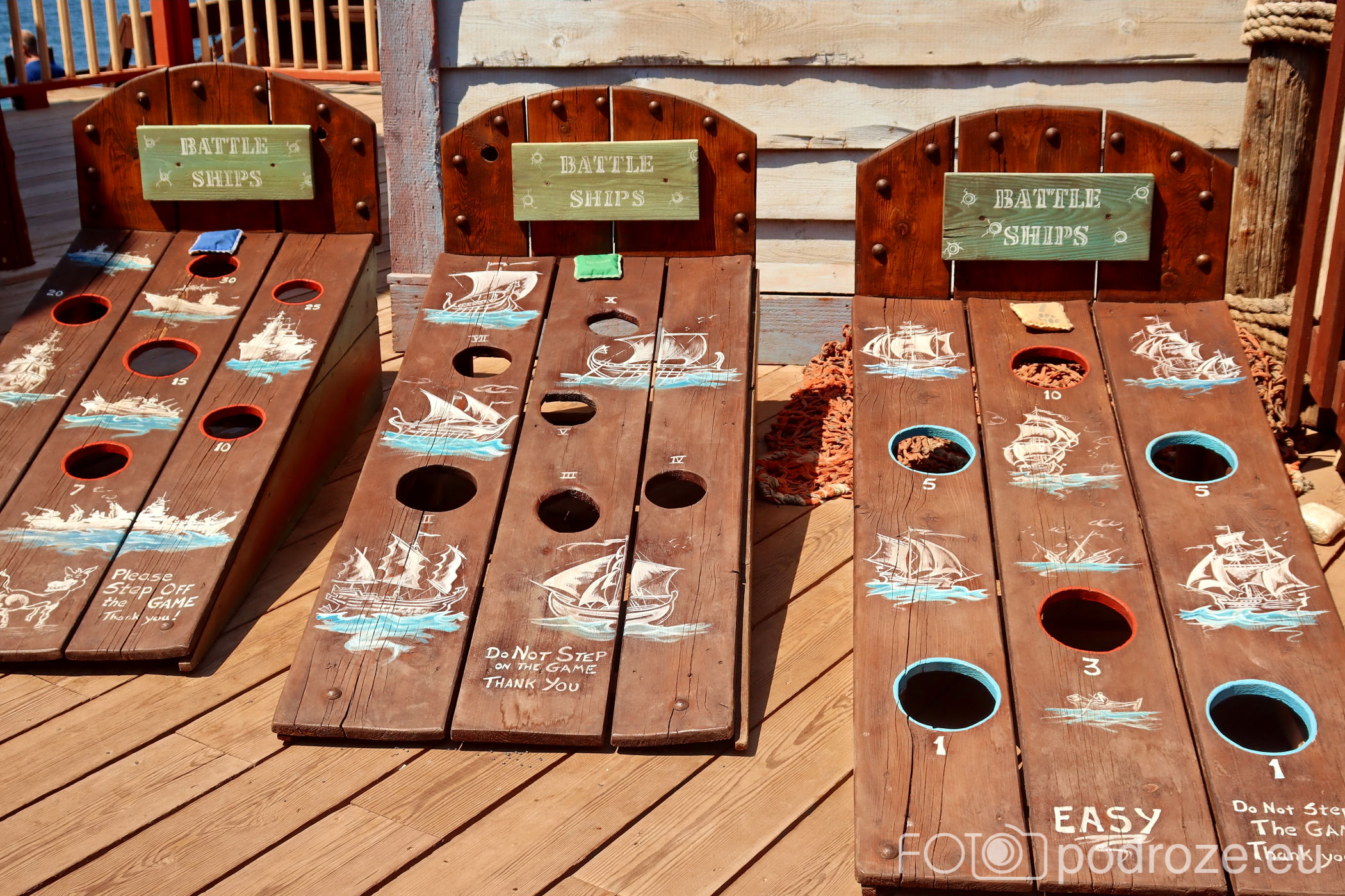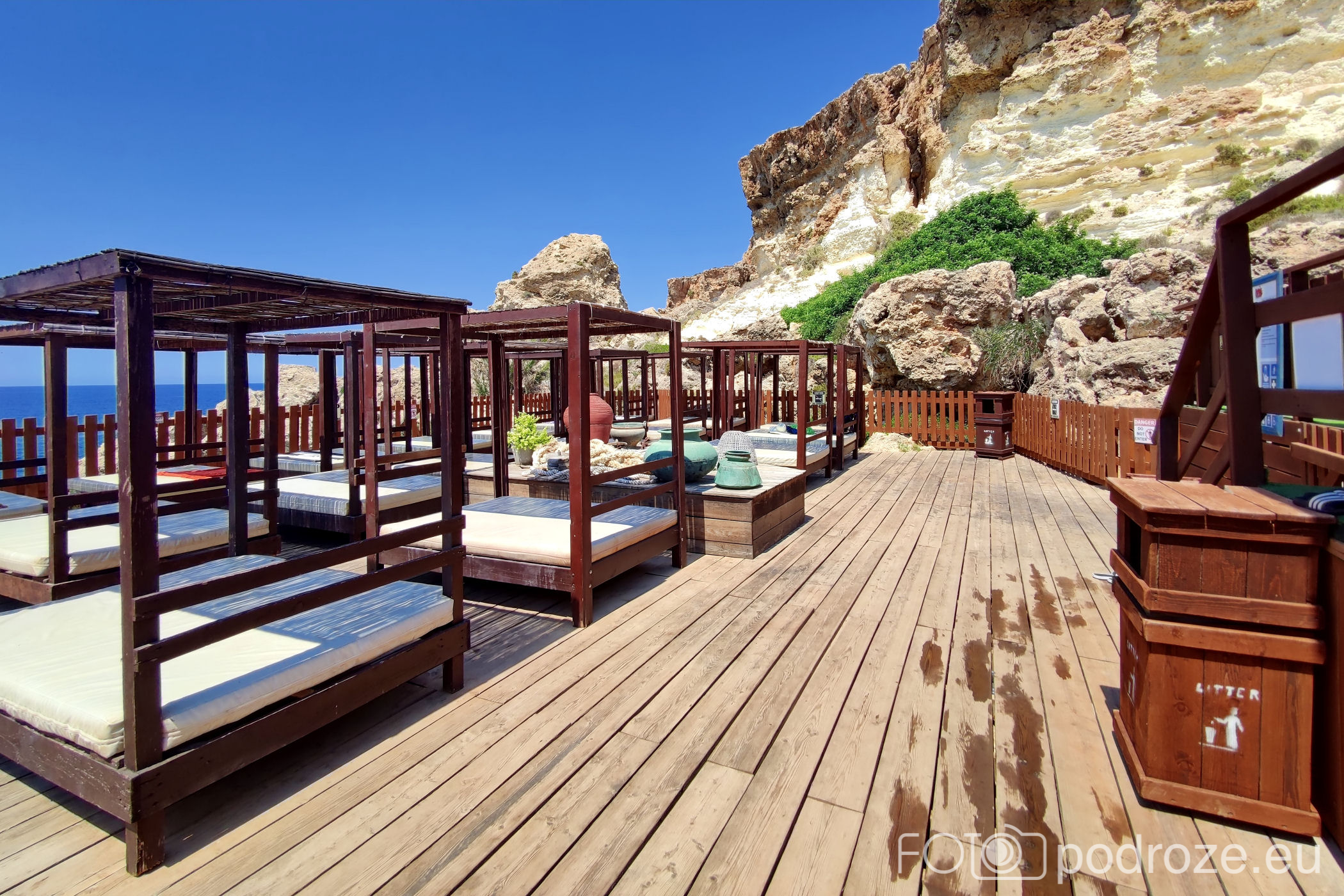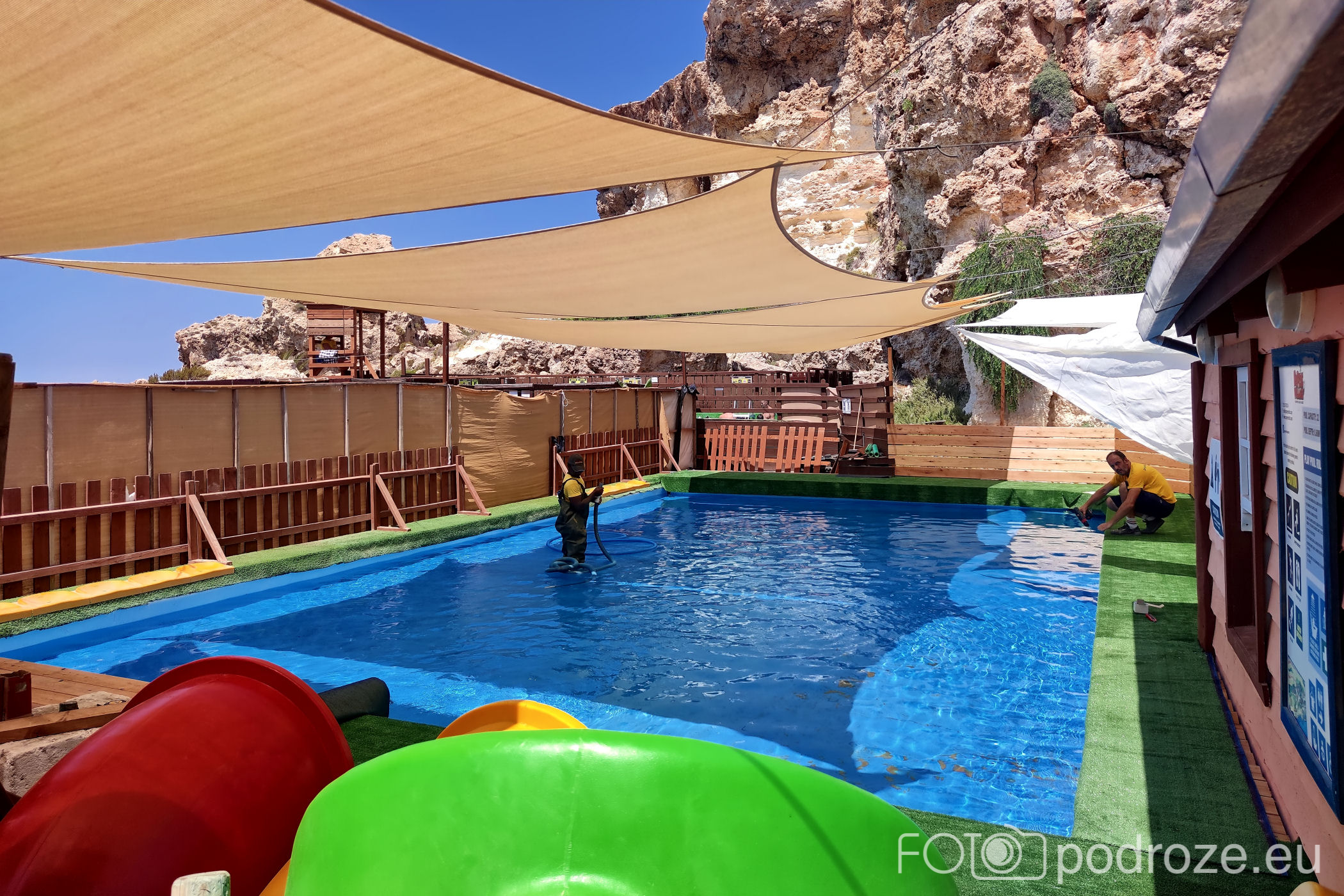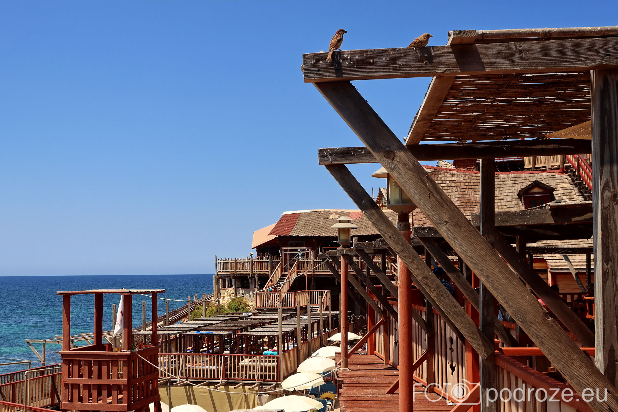 Jak już poczujemy się zmęczeni zwiedzaniem miasteczka , to możemy przejść w dół do strefy relaksu. Czeka na nas plaża z całą infrastruktura rozrywkową i gastronomiczną. Mamy też do dyspozycji basen z całą strefą relaksu na końcu wioski . Ten akurat był czyszczony podczas naszego pobytu, dlatego strefa była pusta i wolna od ludzi.