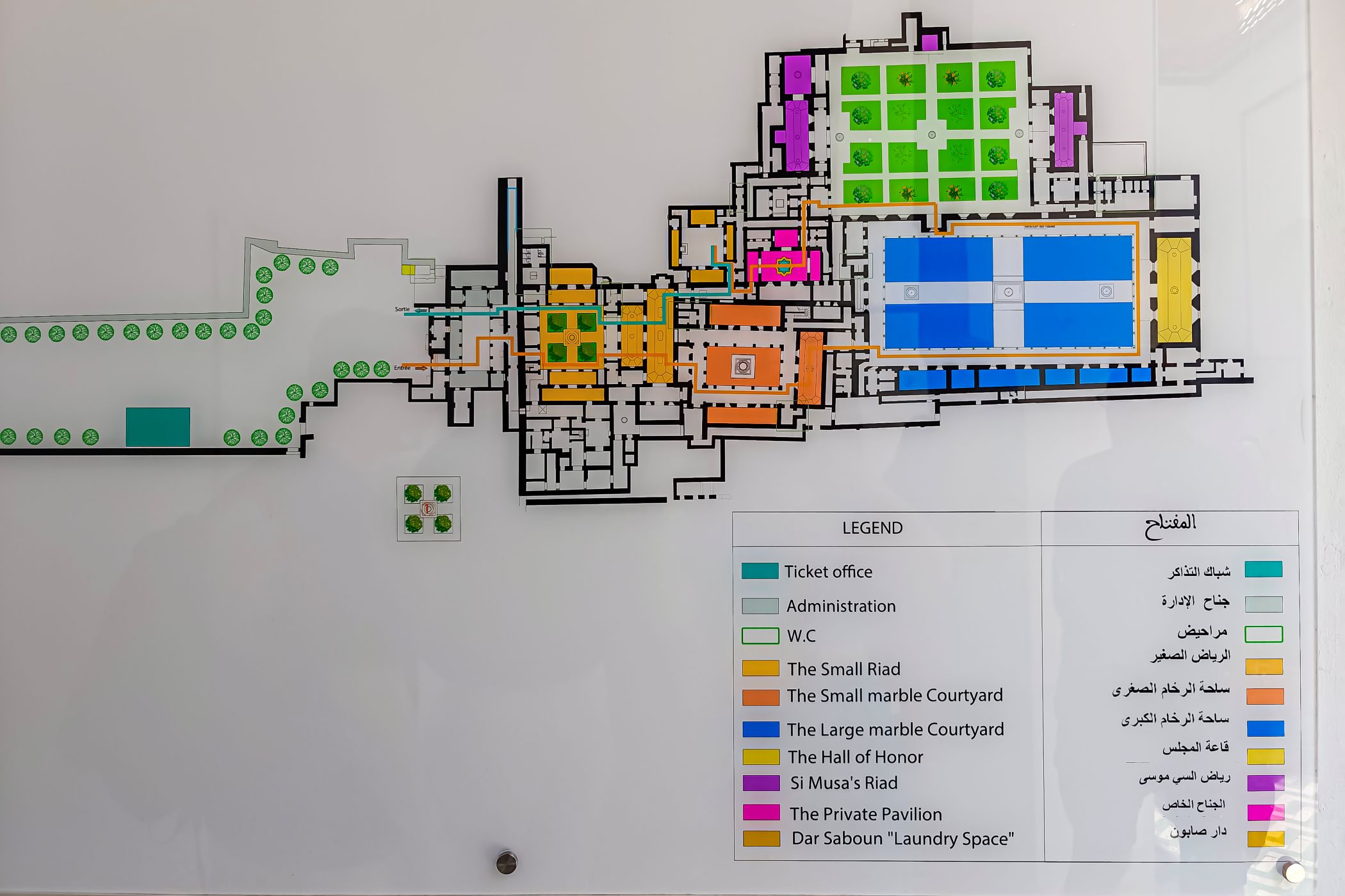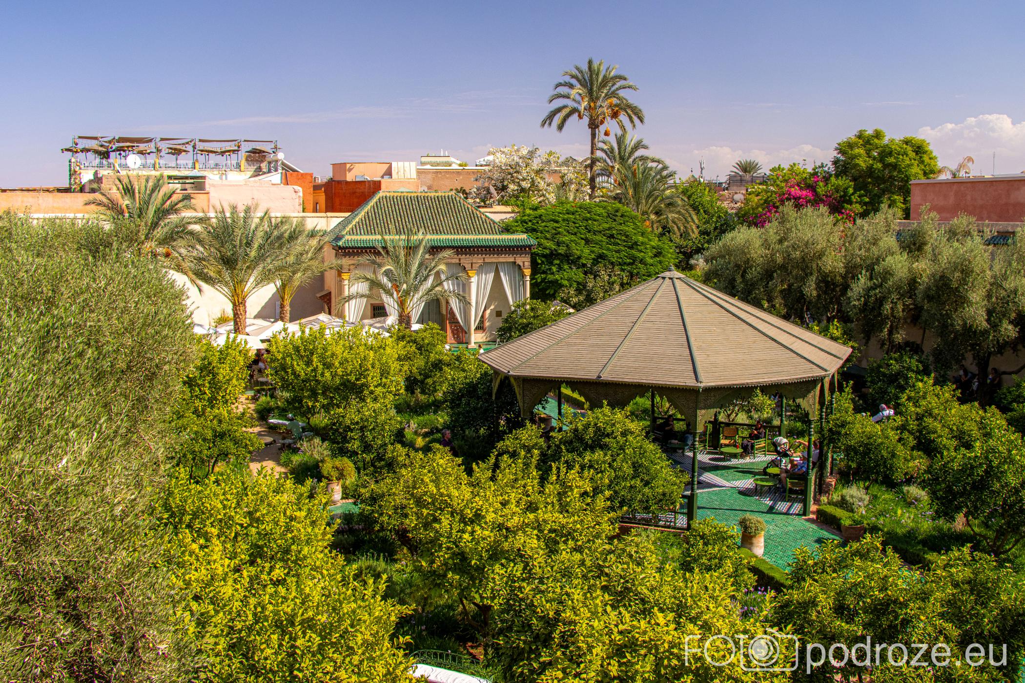 Pałac posiada kilka dziedzińców ogrodowych, pełnych drzew pomarańczowych, palm i fontann. To miejsca ciszy i relaksu, kontrastujące z przestrzenią reprezentacyjną, pokazujące jak w architekturze marokańskiej łączy się funkcjonalność z estetyką.