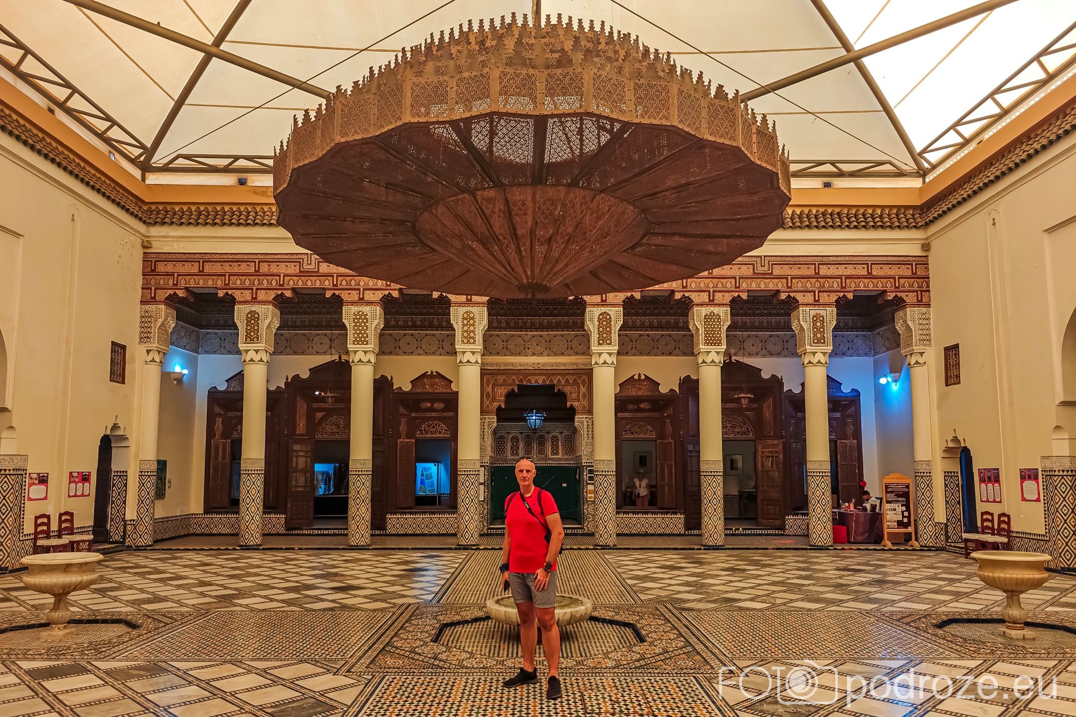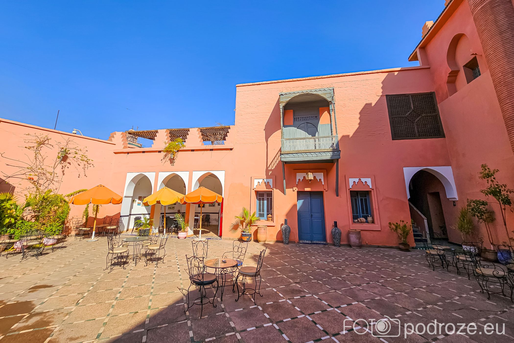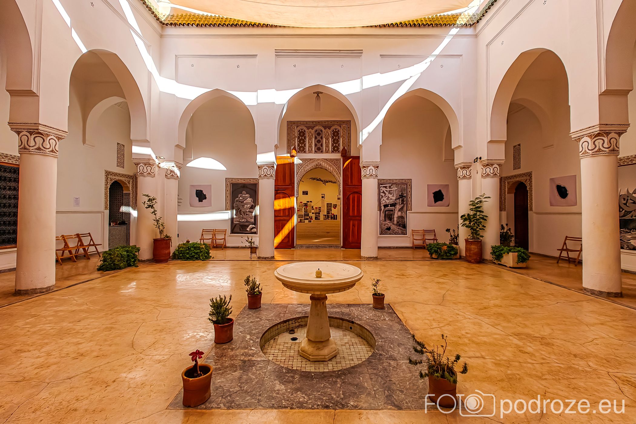 Budynek ten to tradycyjna architektura marokańska, gdyż posiada wewnętrzny dziedziniec (sebil) ozdobiony misternymi płytkami, łukami i rzeźbionym drewnem. Z drzewami i stoliczkami wygląda przepięknie i stanowi idealne tło do fotografii.