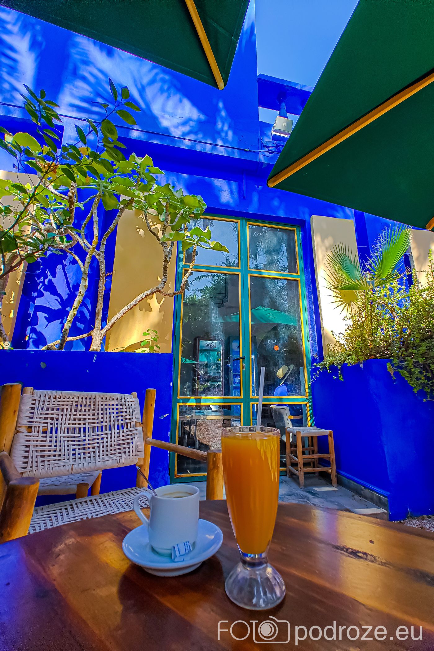 Niestety mimo zakupu biletów z dużym wyprzedzeniem, nie udało mi się dostać do Ogrodów Majorelle i zobaczyć willi Yves Saint Lorenta. Na pocieszenie zostało mi wypić kawę w części ogrodów, gdzie w jednym z budynków graniczącym z willą znajduje się urokliwa kawiarnia. Oto zdjęcia właśnie z tej części ogrodów.
