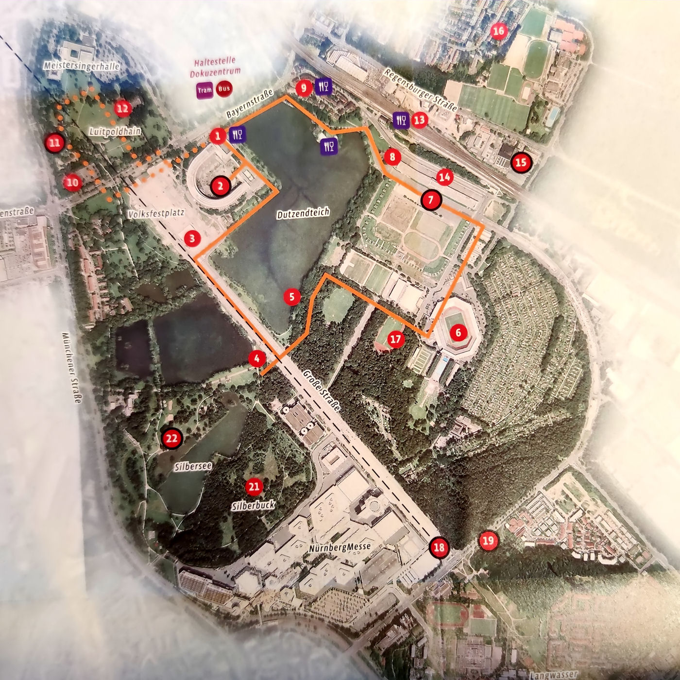 Wystawa w środku pokazuje nam gigantomanie narodowosocjalistycznego reżimu. Do dziś tylko część obiektów i całego założenia urbanistycznego (11 km2) na południu Norymbergi można obejrzeć, ale nawet to co pozostało robi wrażenie. Gigantyczne budowle w większości nieukończone na dawnych Terenach Zjazdów Partyjnych III Rzeszy w południowo-wschodniej części Norymbergi przypominają właśnie o tej manii wielkości .