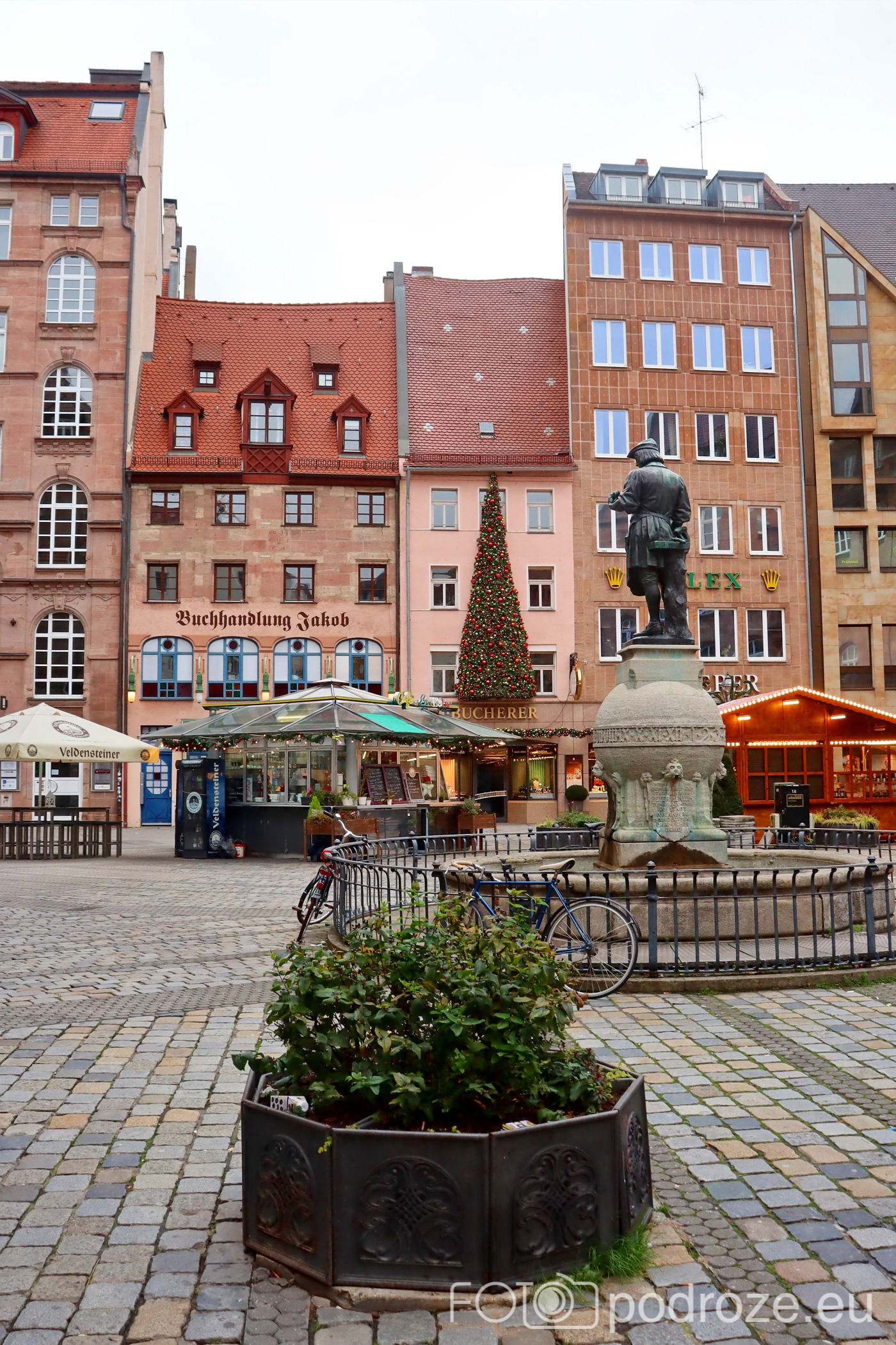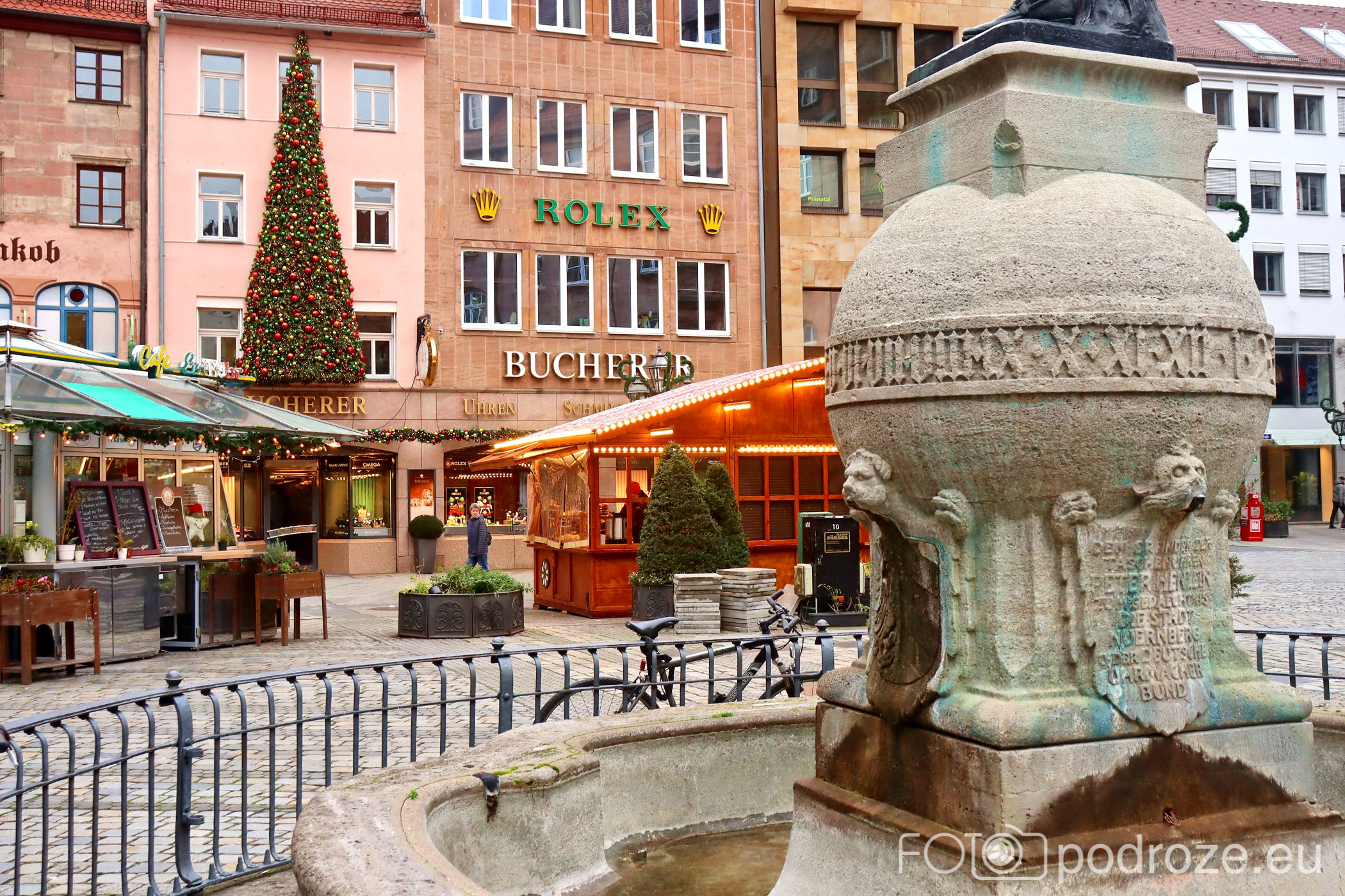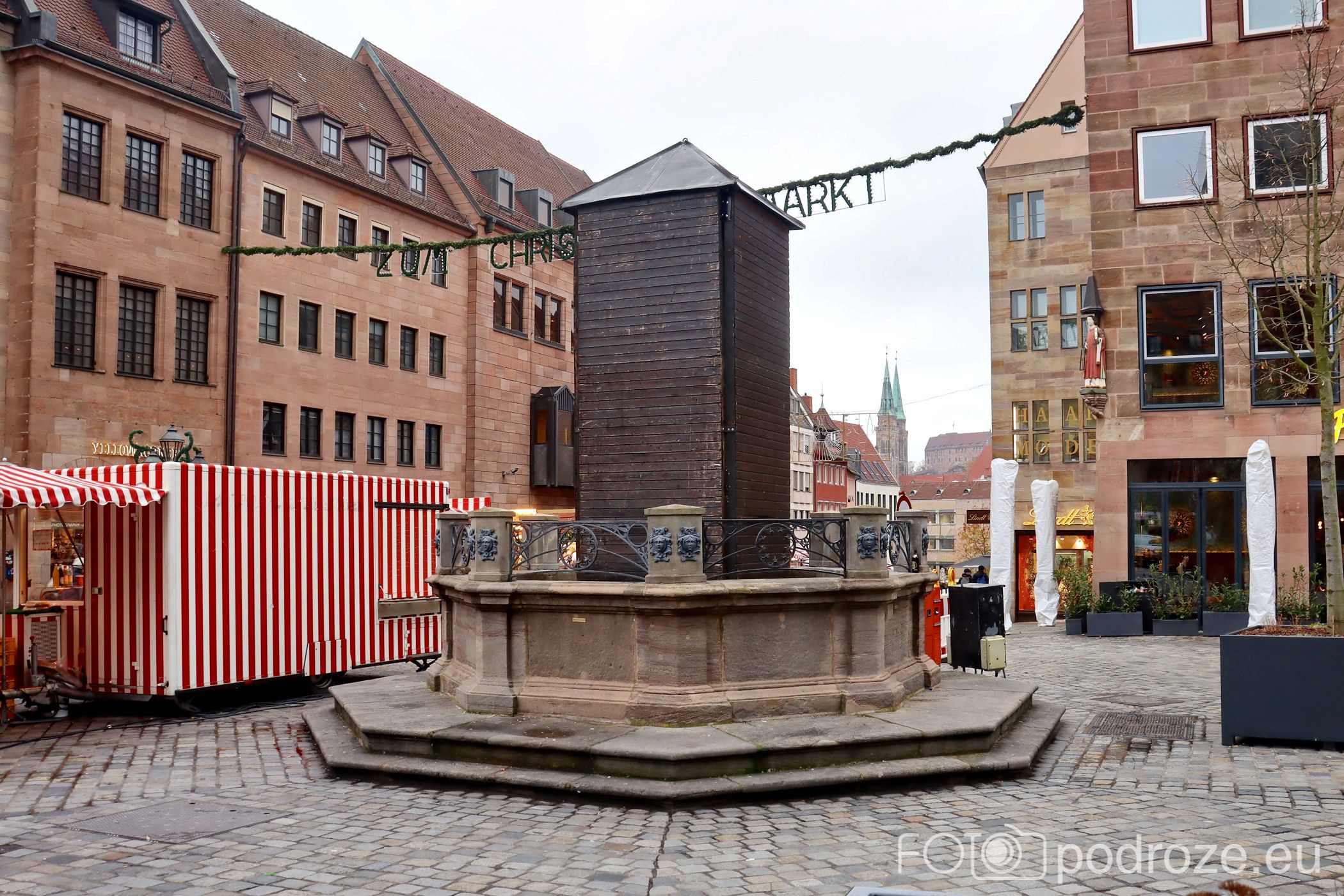 Główny plac Norymbergi to tradycyjne miejsce handlu, na którym do dzisiaj nawet latem stoją stragany sprzedające lokalne, frankońskie produkty. Wcześniej znajdowała się tu dzielnica żydowska, ale zniknęła wskutek pogromu w 1349 roku. Potem, czyli w XIV wieku wytyczono ten plac. Na rynku mamy dwa ważne obiekty historycznie : Piękna Studnia i kościół Najświętszej Maryi Panny. Niestety zabudowa wokół rynku już nie została historycznie odtworzona po zniszczeniach wojennych i nie da się ukryć, że piękna nie jest.