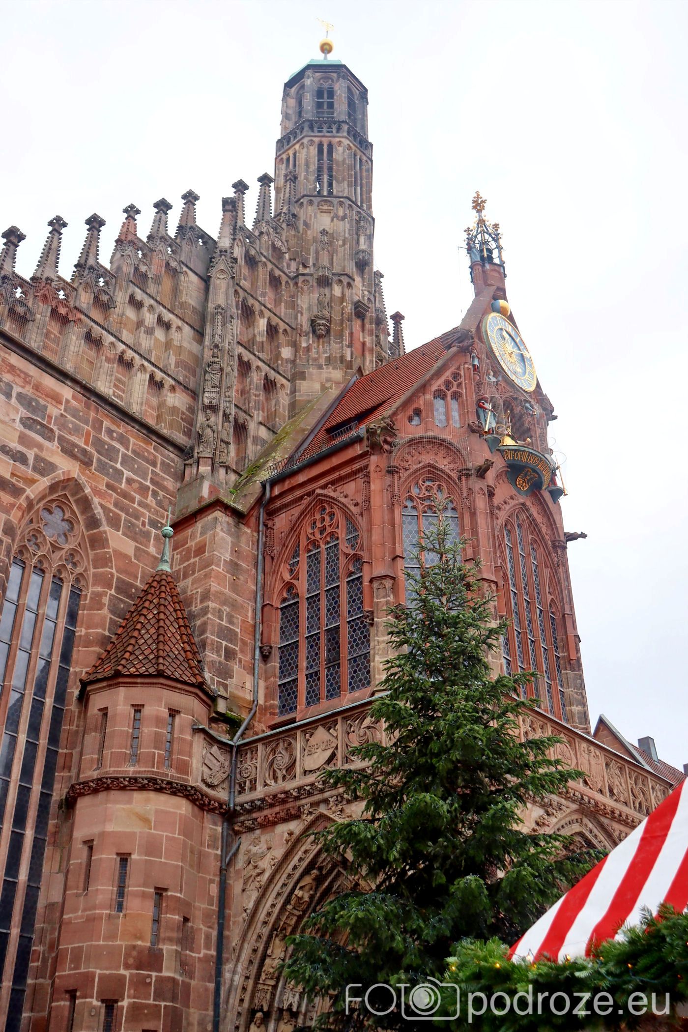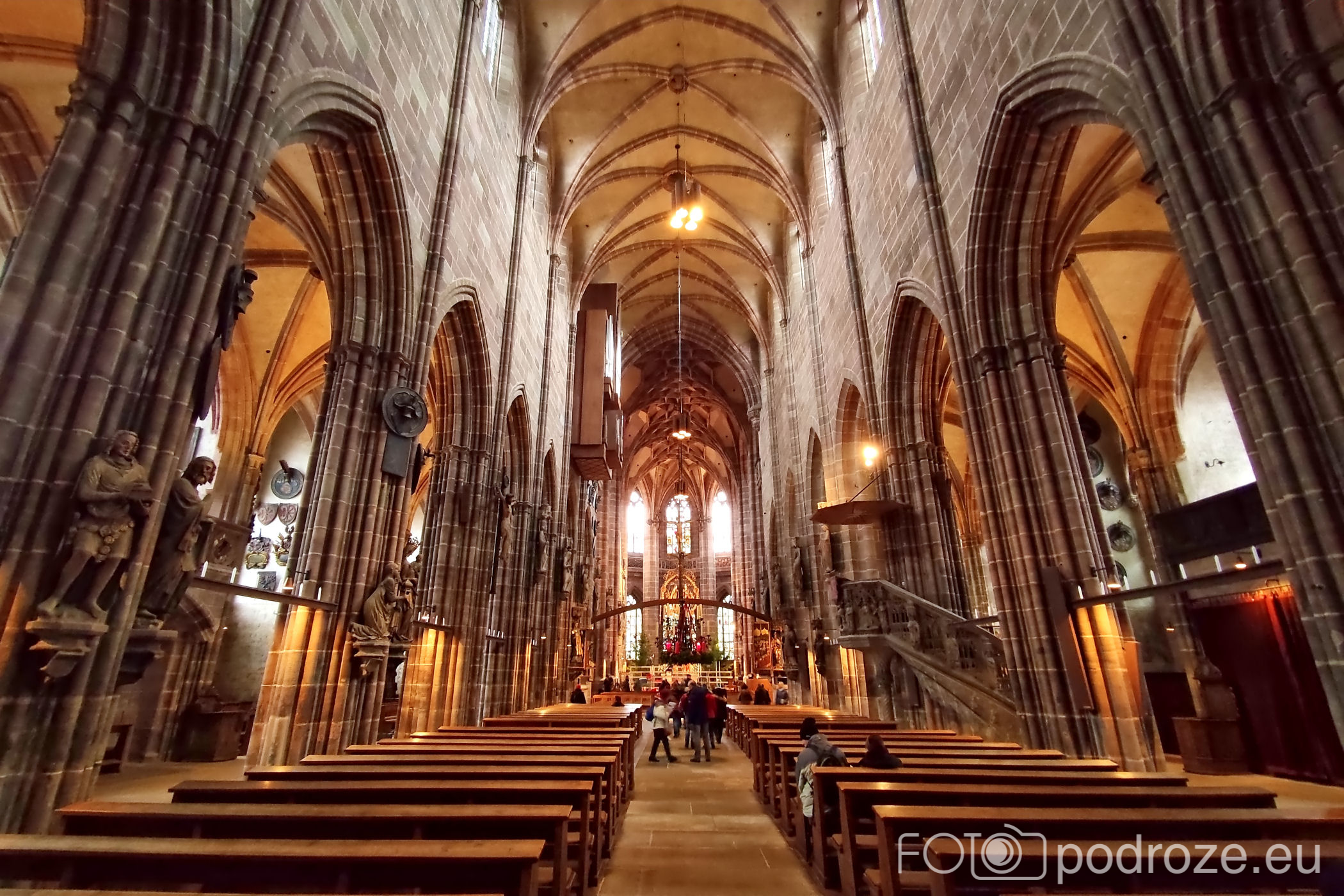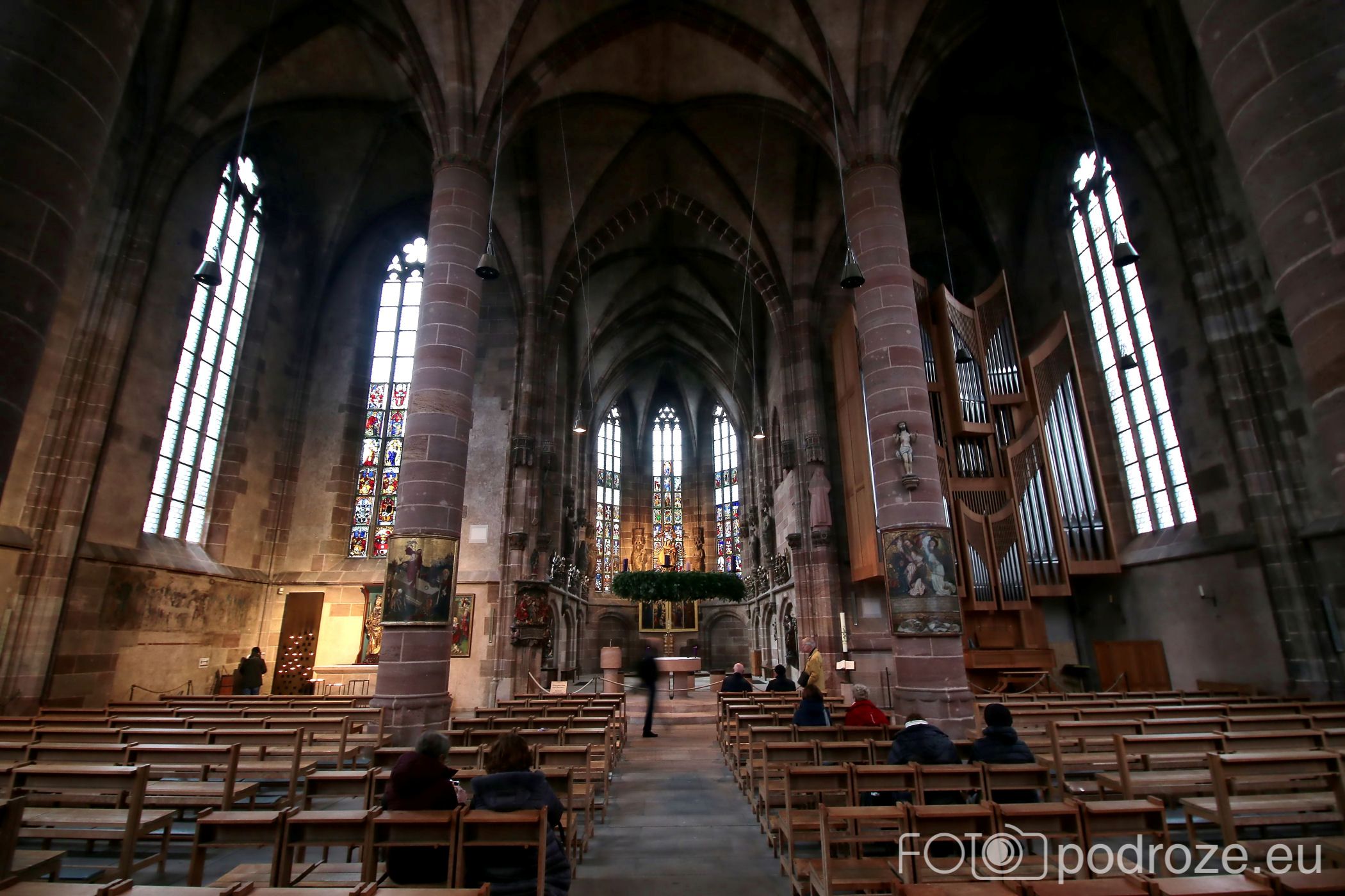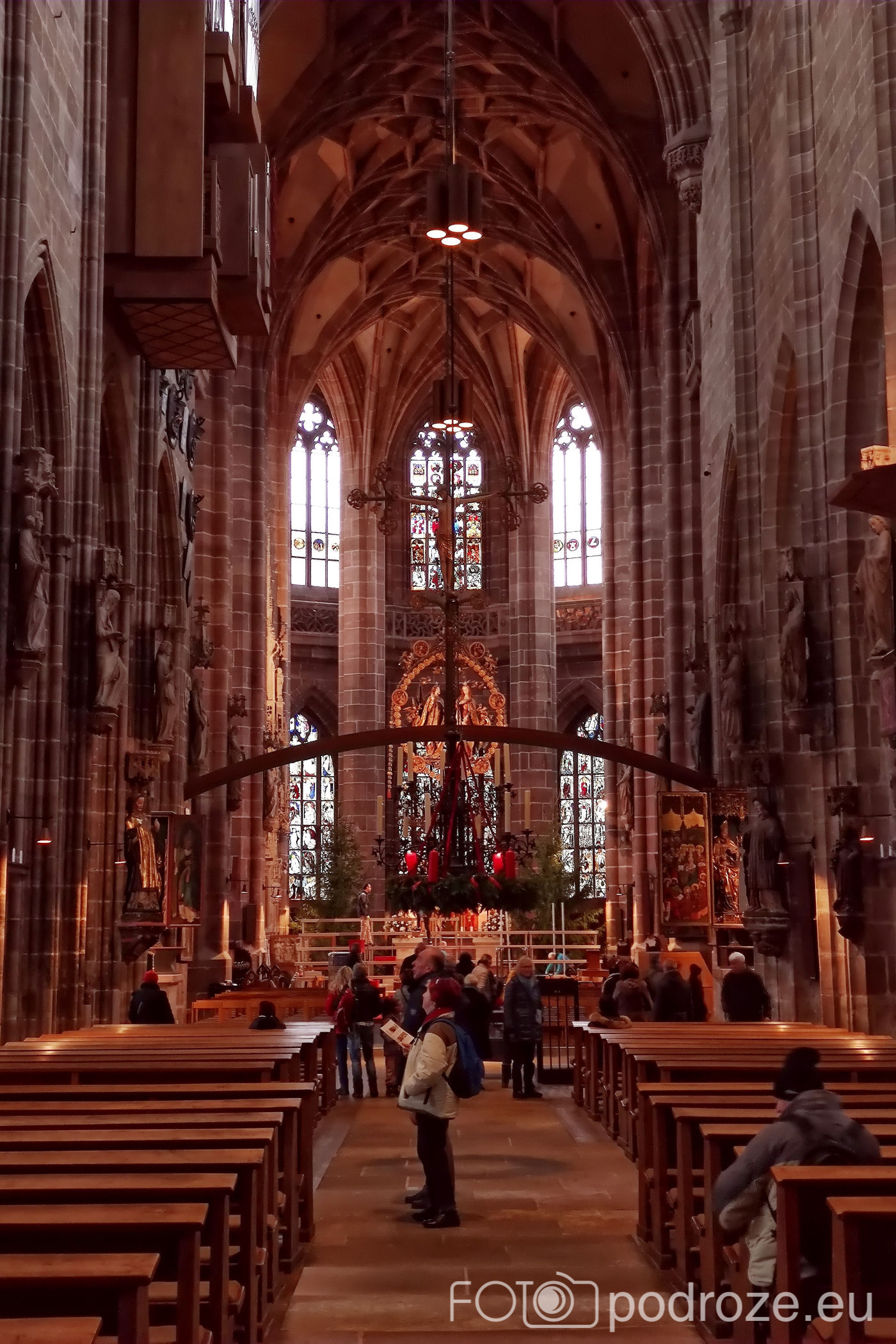 Przy rynku jak już wspomniałam mamy jedną z najciekawszych świątyń w mieście. Imponująca fasada przyciąga turystów odbywającym się tu codziennie o 12:00 pochodem figurek. W ziemie oświetlona dodatkowo dwiema ogromnymi choinkami . Wnętrze XIV-wiecznej świątyni też koniecznie trzeba odwiedzić. znajdują się tu między innymi najstarsze witraże w Norymberdze z połowy XV wieku.