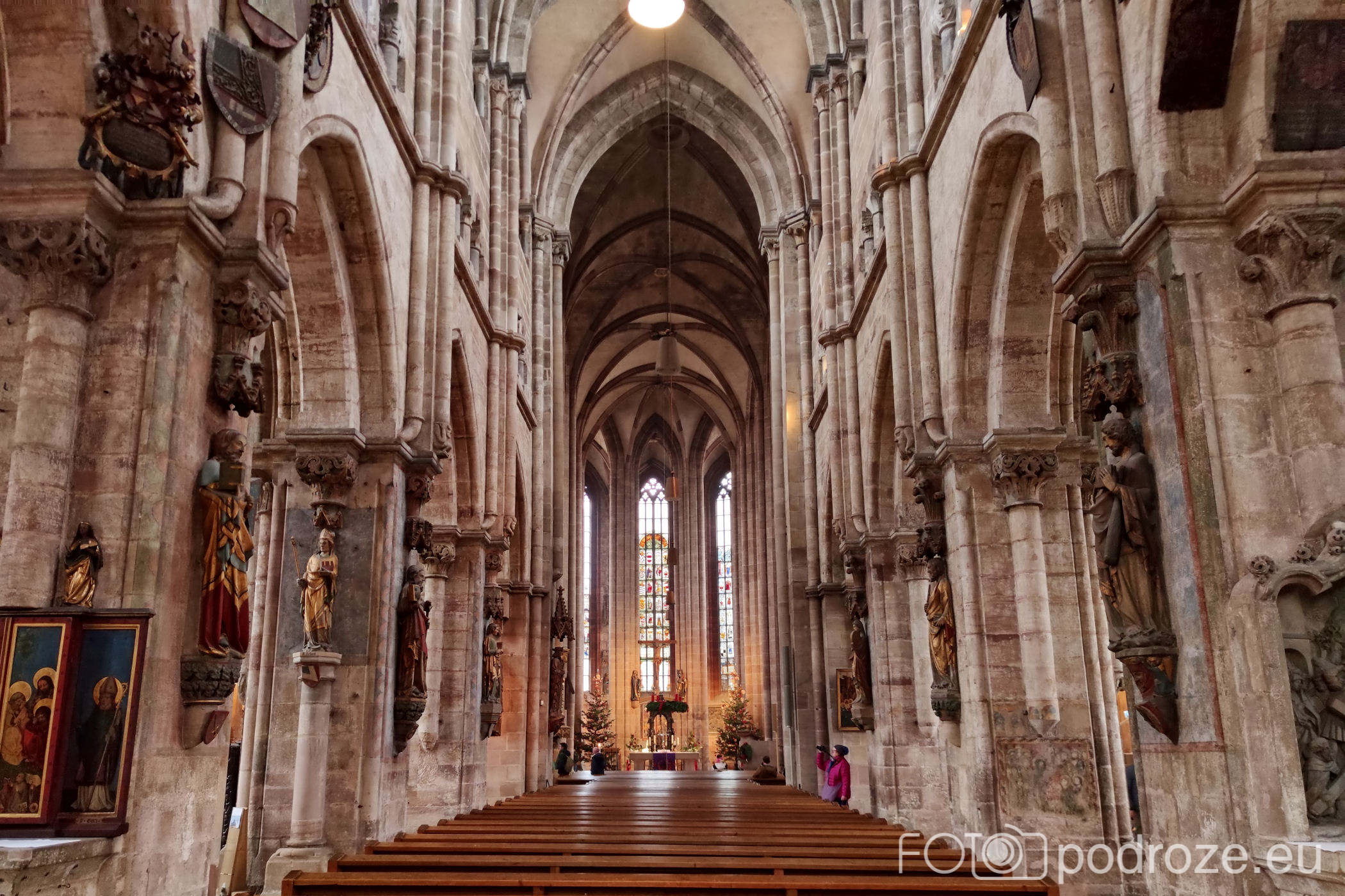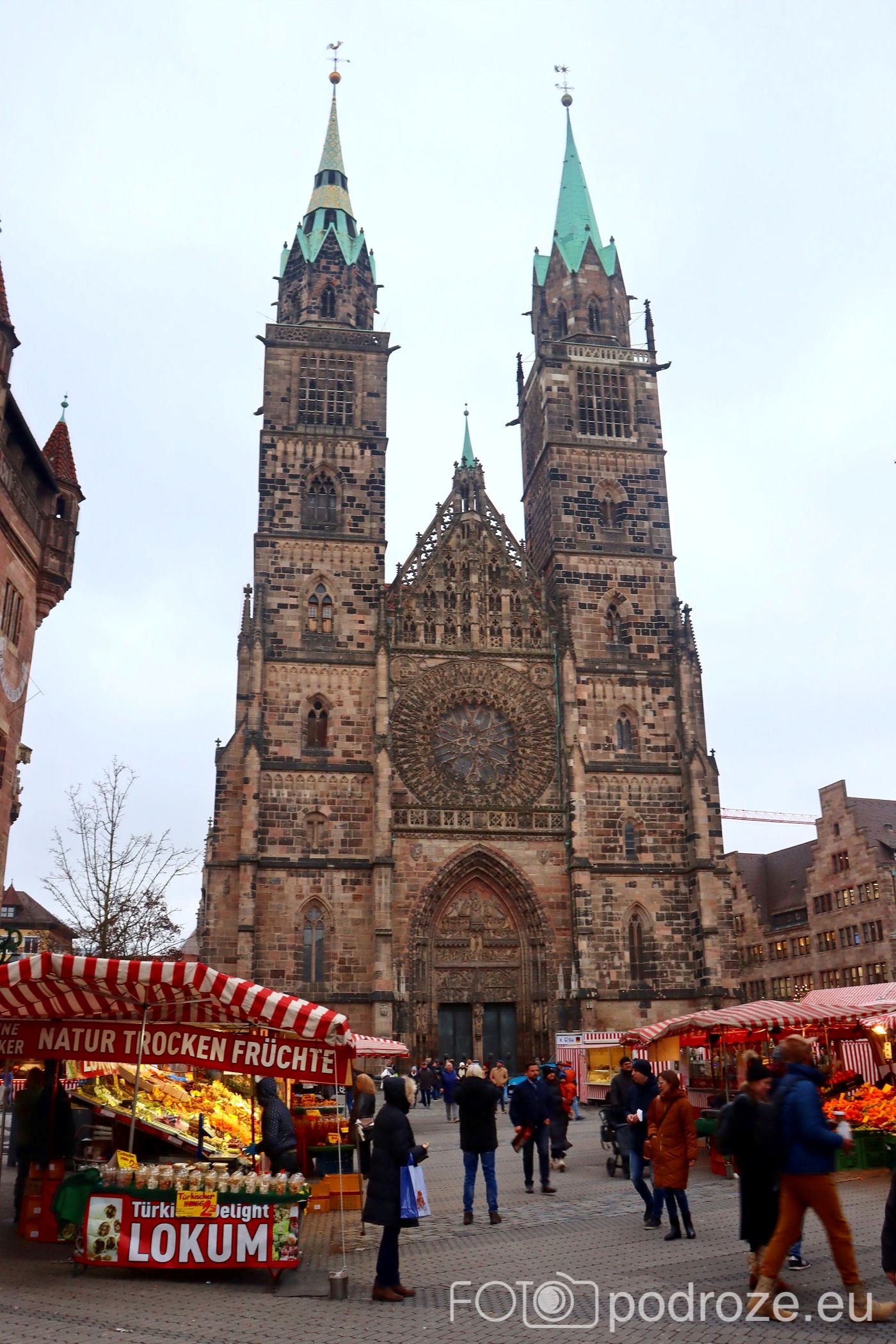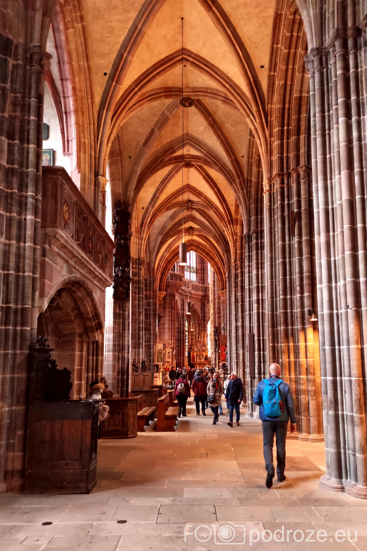 Przy rynku jak już wspomniałam mamy jedną z najciekawszych świątyń w mieście. Imponująca fasada przyciąga turystów odbywającym się tu codziennie o 12:00 pochodem figurek. W ziemie oświetlona dodatkowo dwiema ogromnymi choinkami . Wnętrze XIV-wiecznej świątyni też koniecznie trzeba odwiedzić. znajdują się tu między innymi najstarsze witraże w Norymberdze z połowy XV wieku.