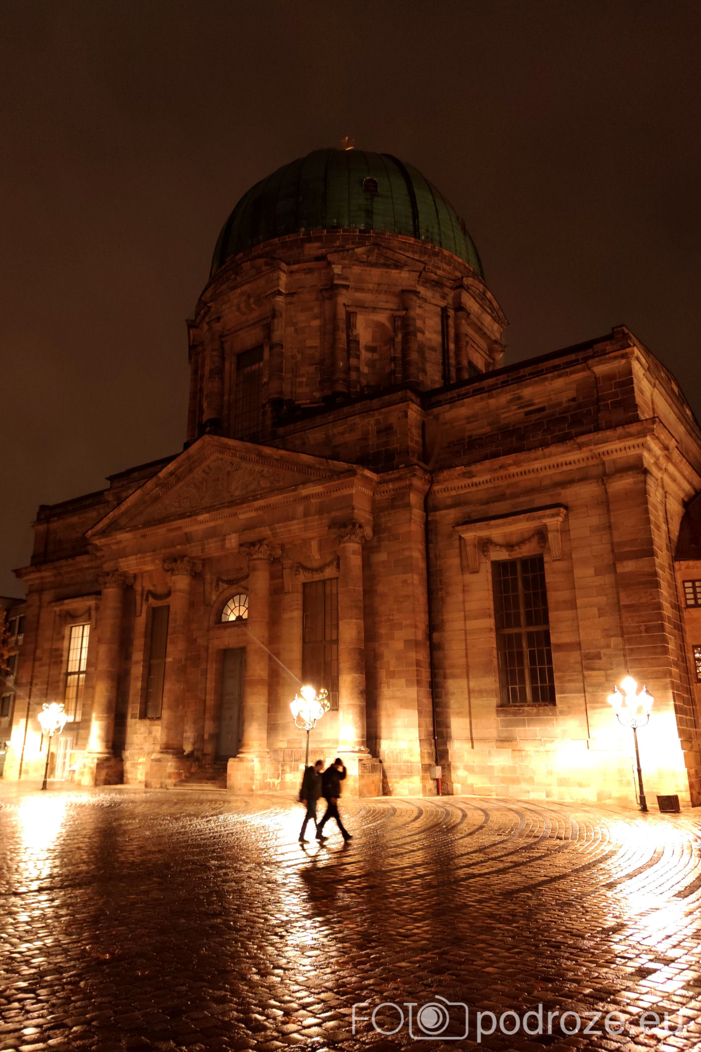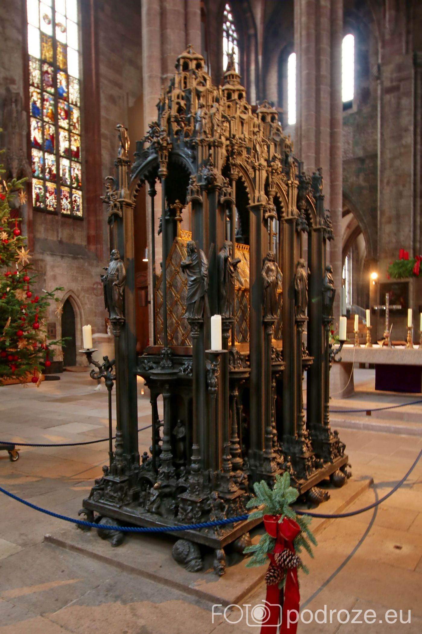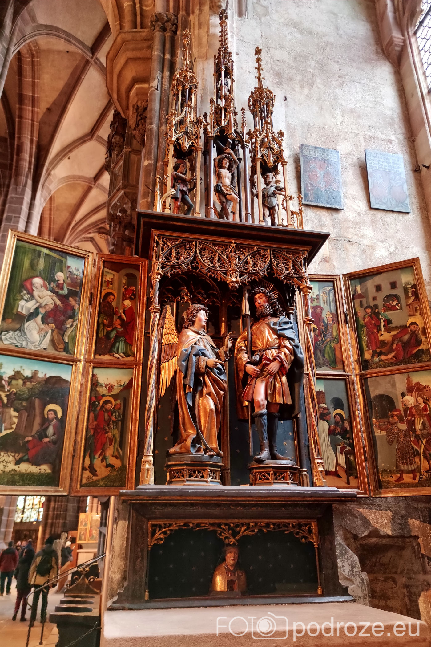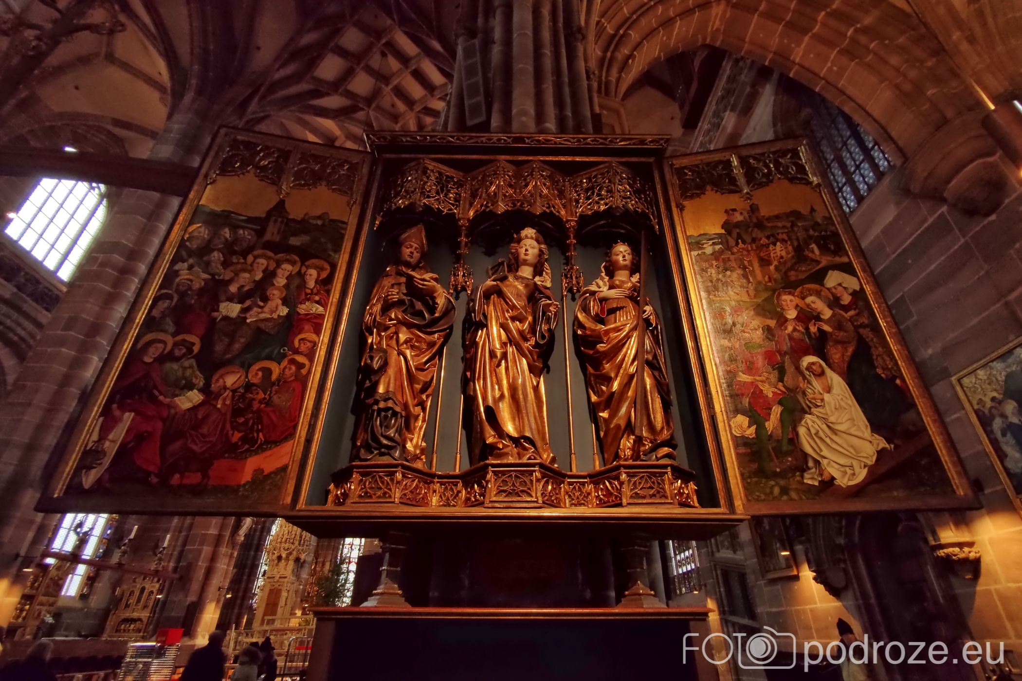 Przy rynku jak już wspomniałam mamy jedną z najciekawszych świątyń w mieście. Imponująca fasada przyciąga turystów odbywającym się tu codziennie o 12:00 pochodem figurek. W ziemie oświetlona dodatkowo dwiema ogromnymi choinkami . Wnętrze XIV-wiecznej świątyni też koniecznie trzeba odwiedzić. znajdują się tu między innymi najstarsze witraże w Norymberdze z połowy XV wieku.