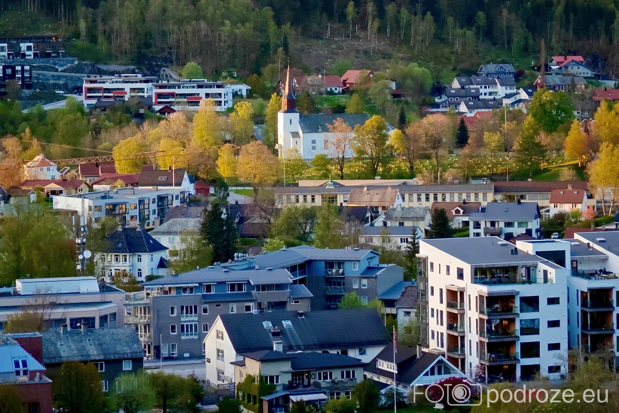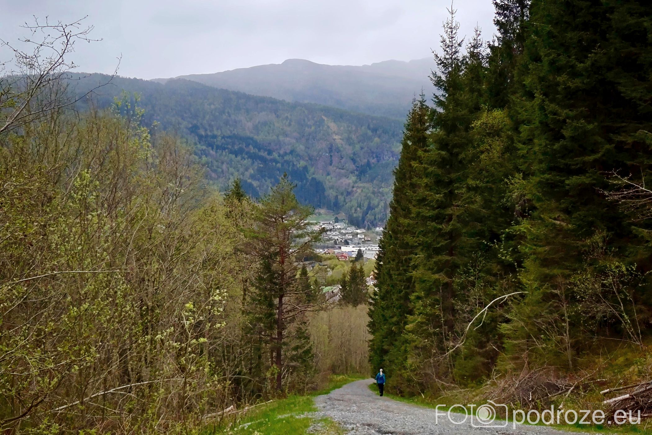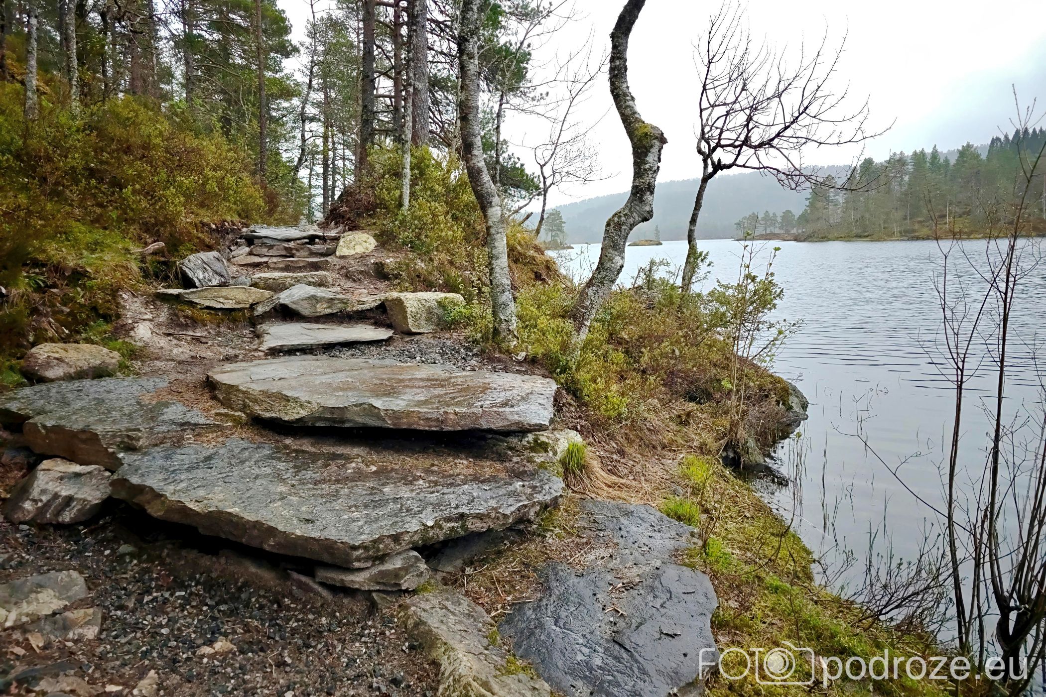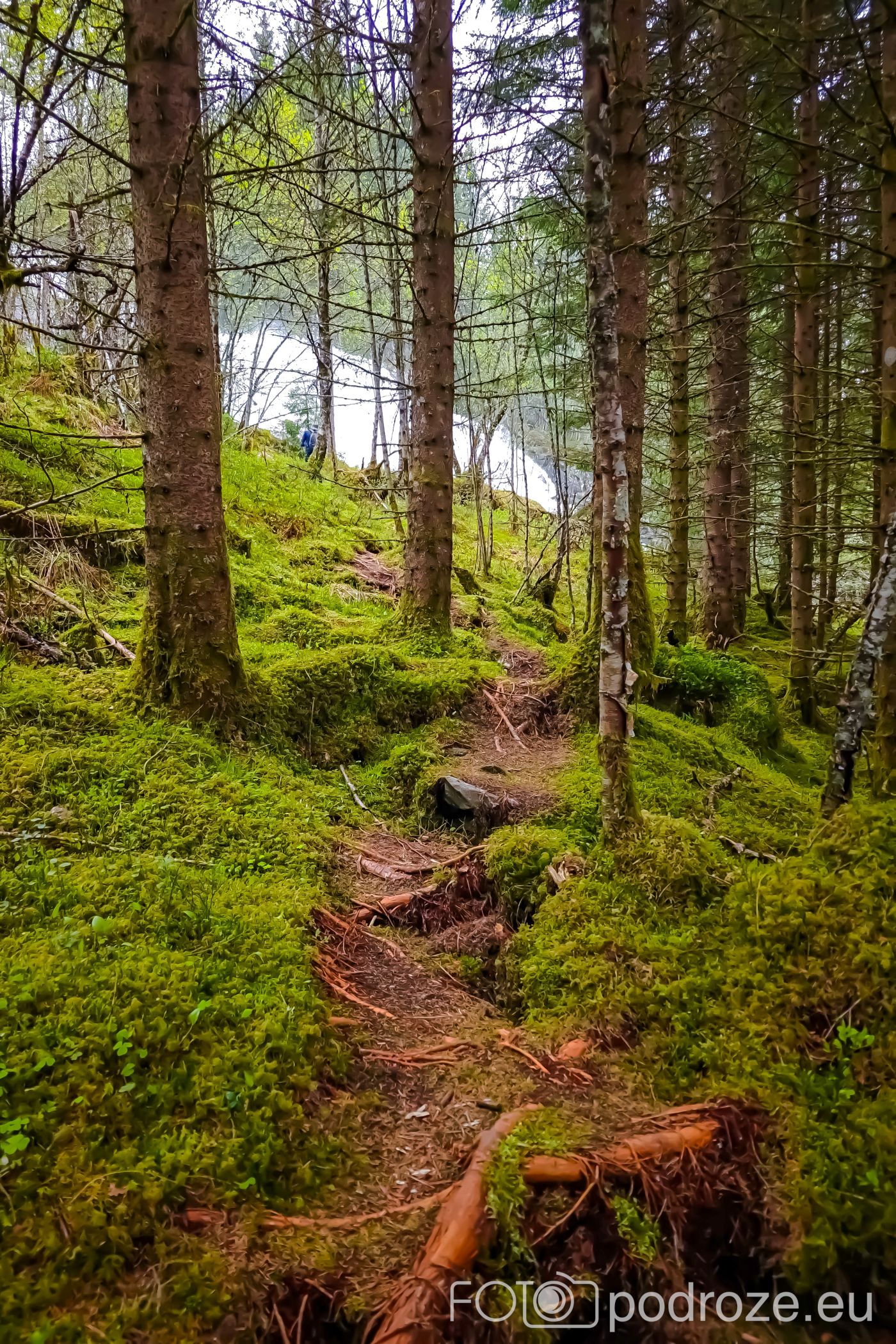 Niestety na zdobycie góry się nie zdecydowałyśmy. Pogoda była fatalna, cały czas deszcz, a szczyt był w gęstych chmurach. Udało się jednak przejść większość szlaku i dotrzeć do jeziorka Bekkjevatn. Początek szlaku to południowo – zachodnia część miasta. Dużo zieleni i rozsiane wszędzie drewniane domki. Mijamy nawet szkołę z drewnianym dachami.