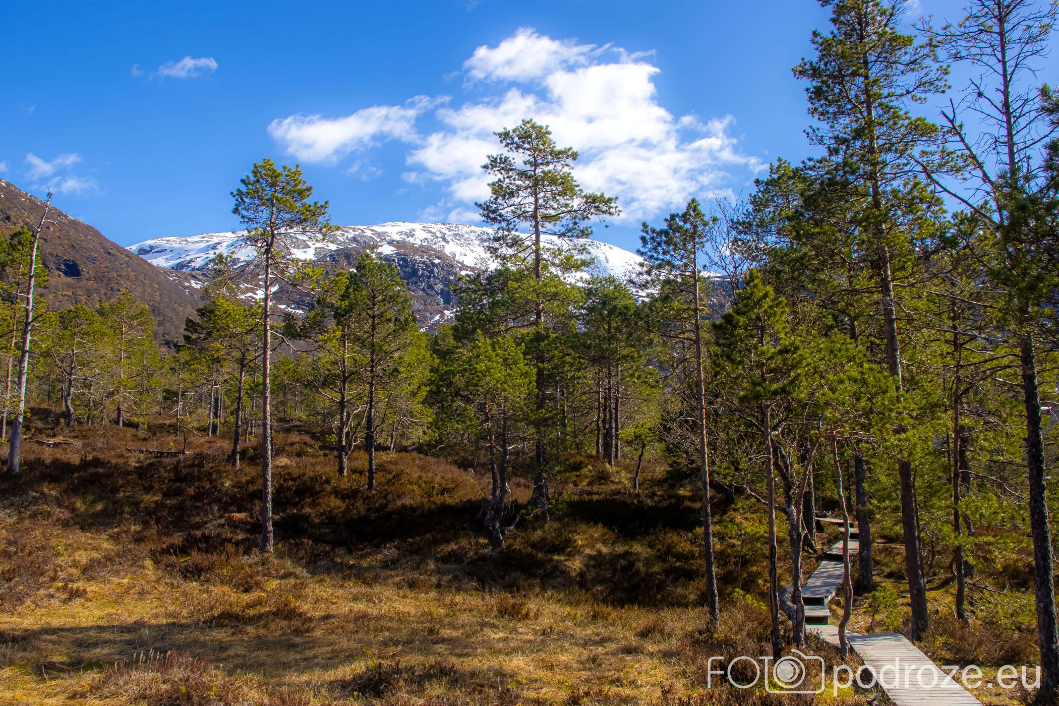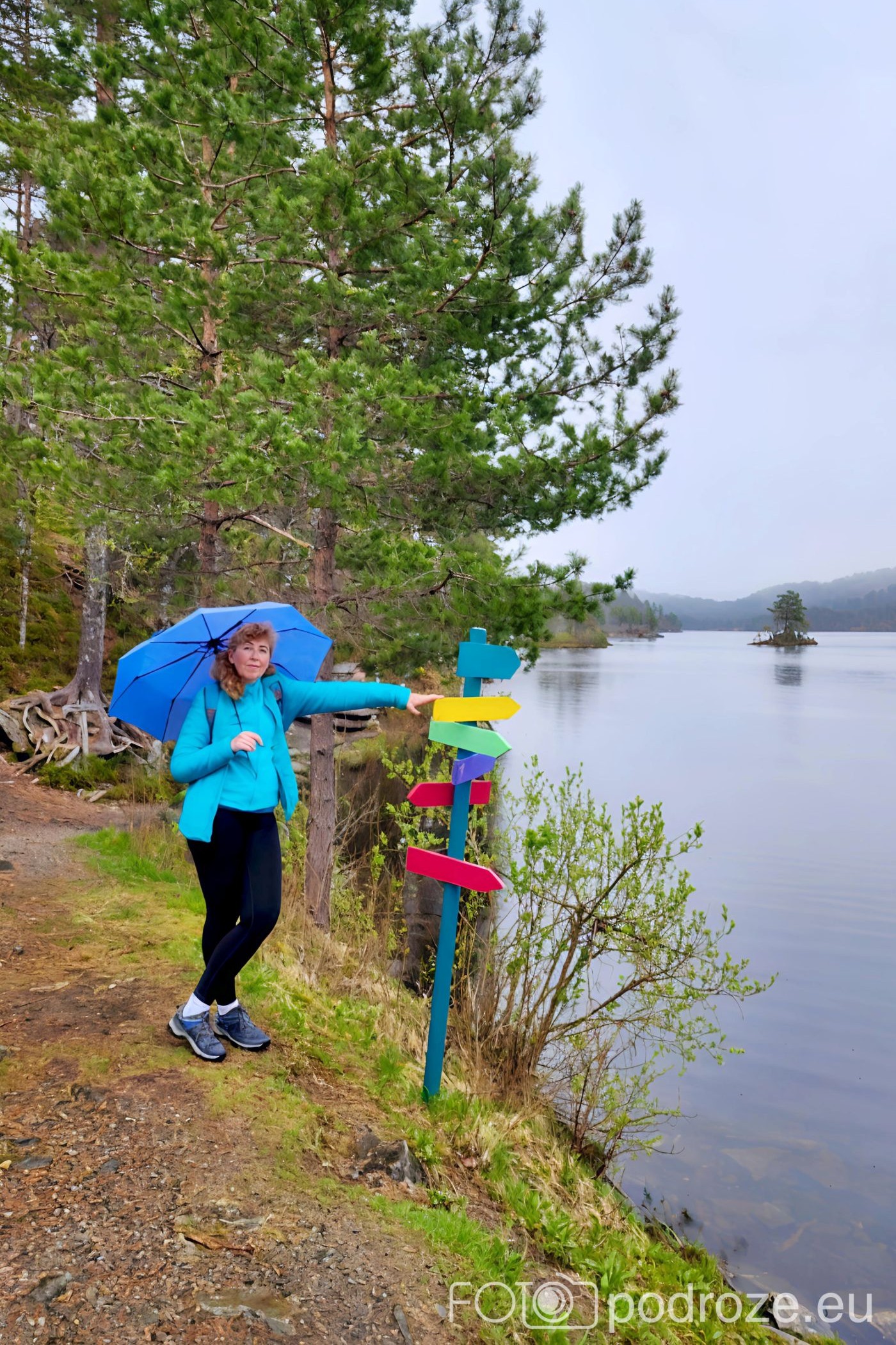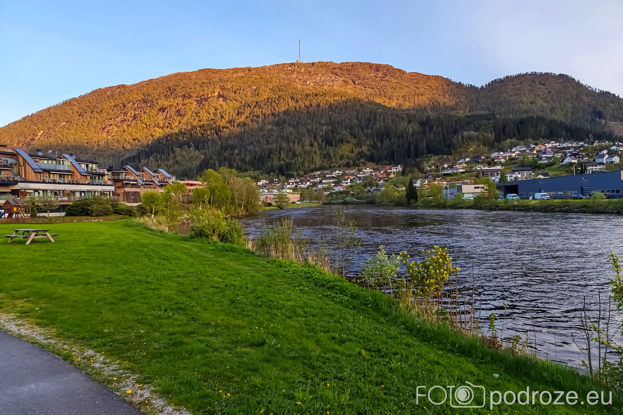 Niestety na zdobycie góry się nie zdecydowałyśmy. Pogoda była fatalna, cały czas deszcz, a szczyt był w gęstych chmurach. Udało się jednak przejść większość szlaku i dotrzeć do jeziorka Bekkjevatn. Początek szlaku to południowo – zachodnia część miasta. Dużo zieleni i rozsiane wszędzie drewniane domki. Mijamy nawet szkołę z drewnianym dachami.