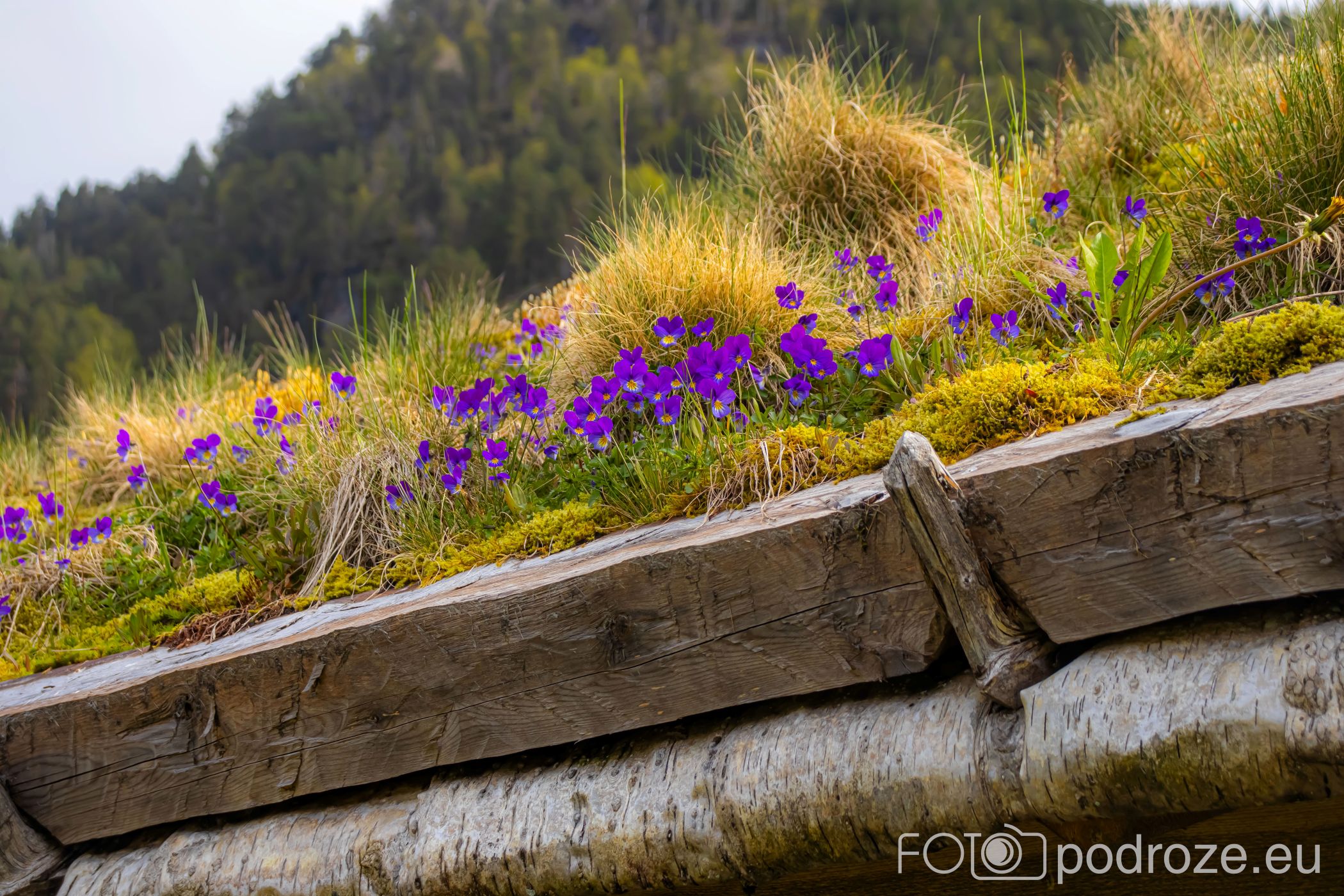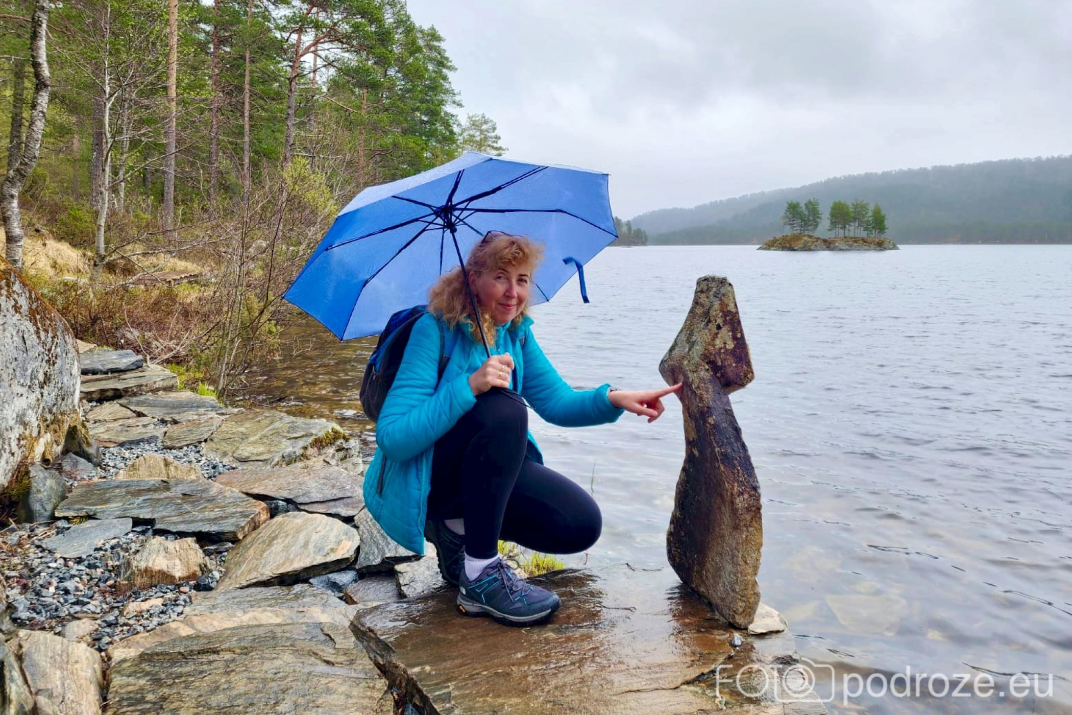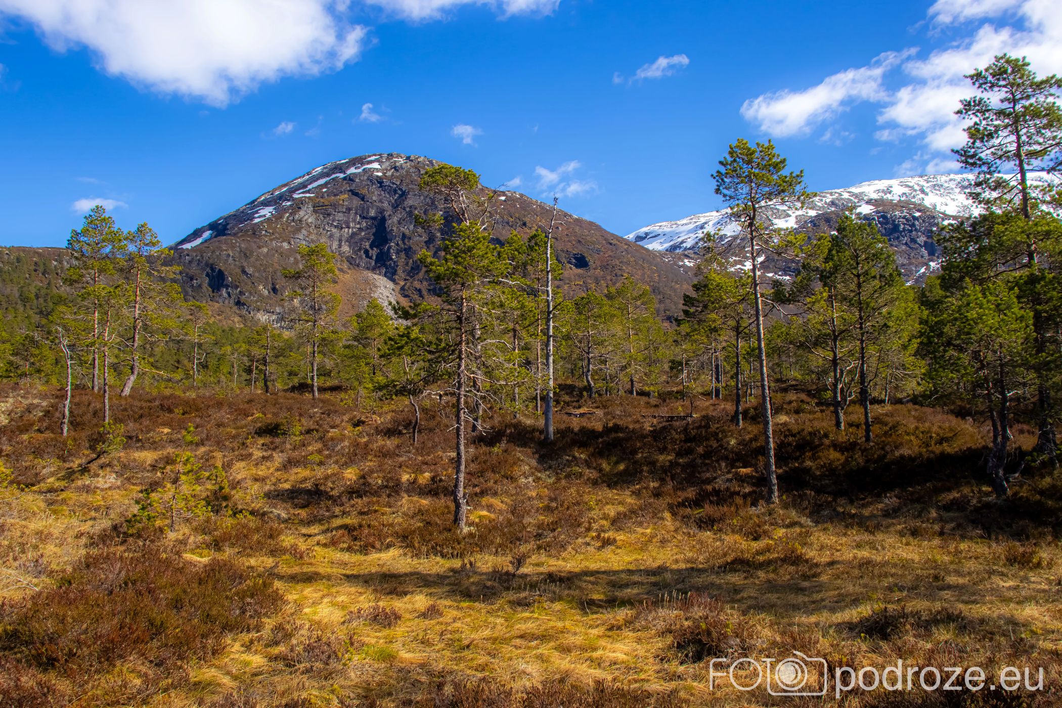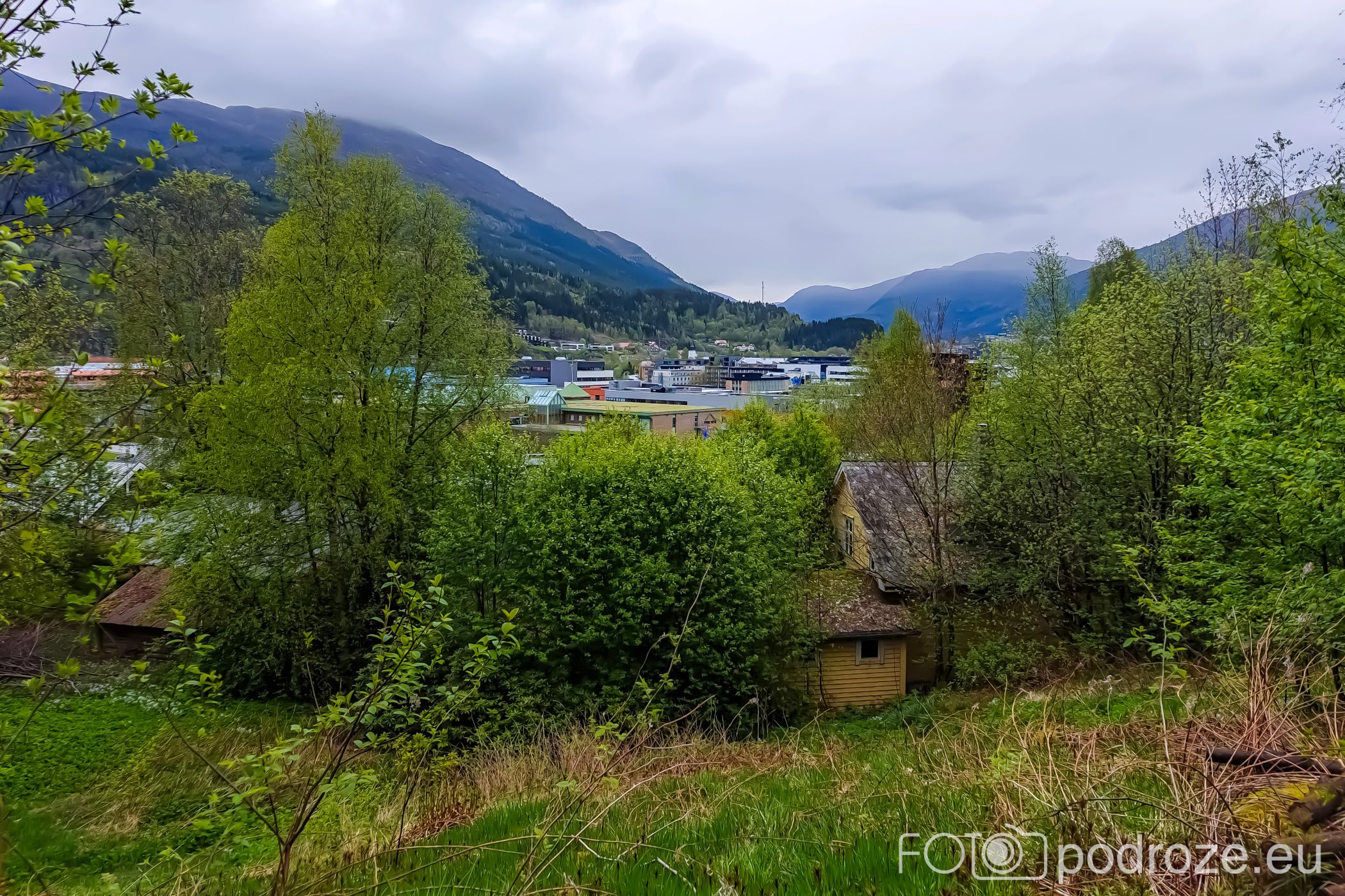 Niestety na zdobycie góry się nie zdecydowałyśmy. Pogoda była fatalna, cały czas deszcz, a szczyt był w gęstych chmurach. Udało się jednak przejść większość szlaku i dotrzeć do jeziorka Bekkjevatn. Początek szlaku to południowo – zachodnia część miasta. Dużo zieleni i rozsiane wszędzie drewniane domki. Mijamy nawet szkołę z drewnianym dachami.