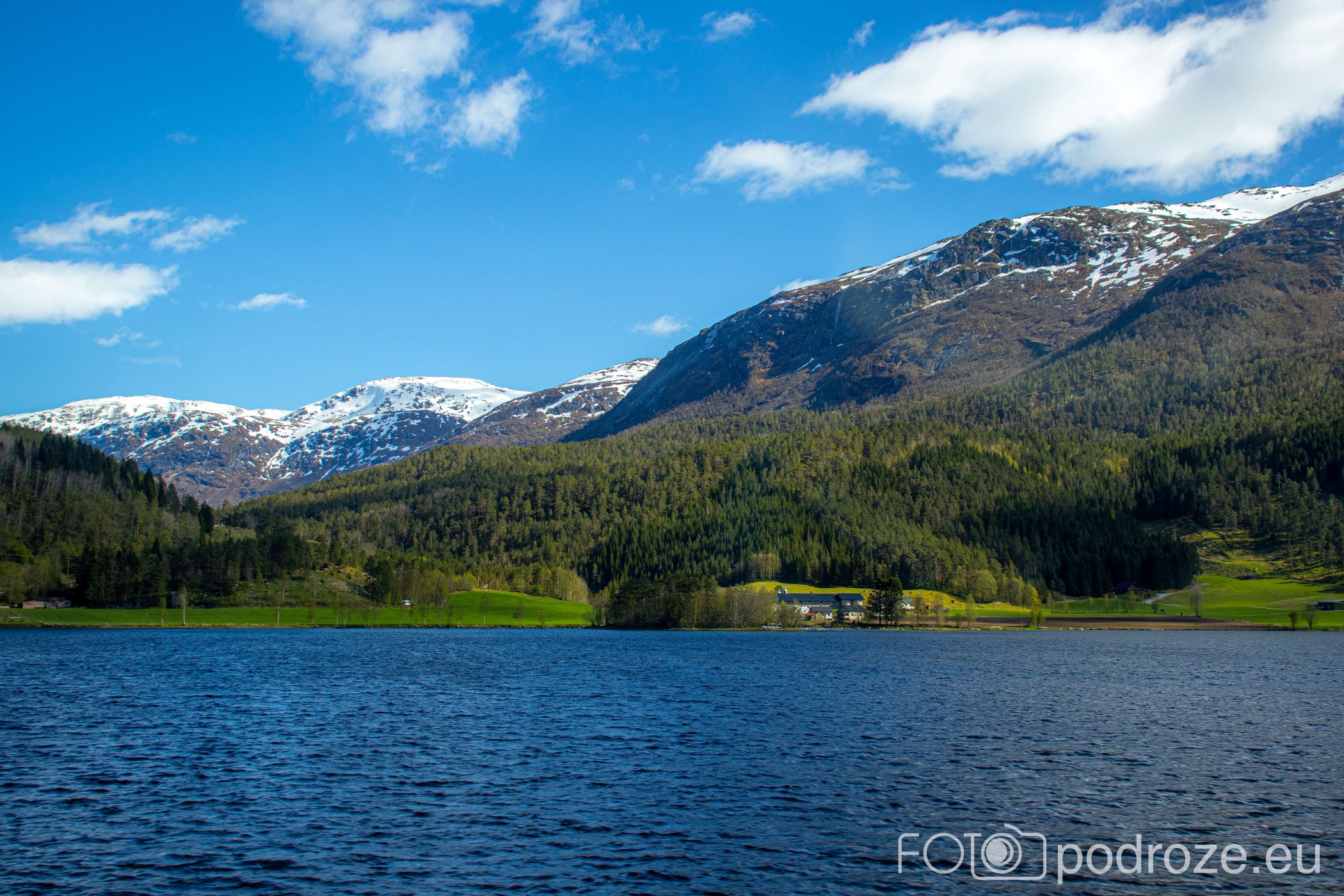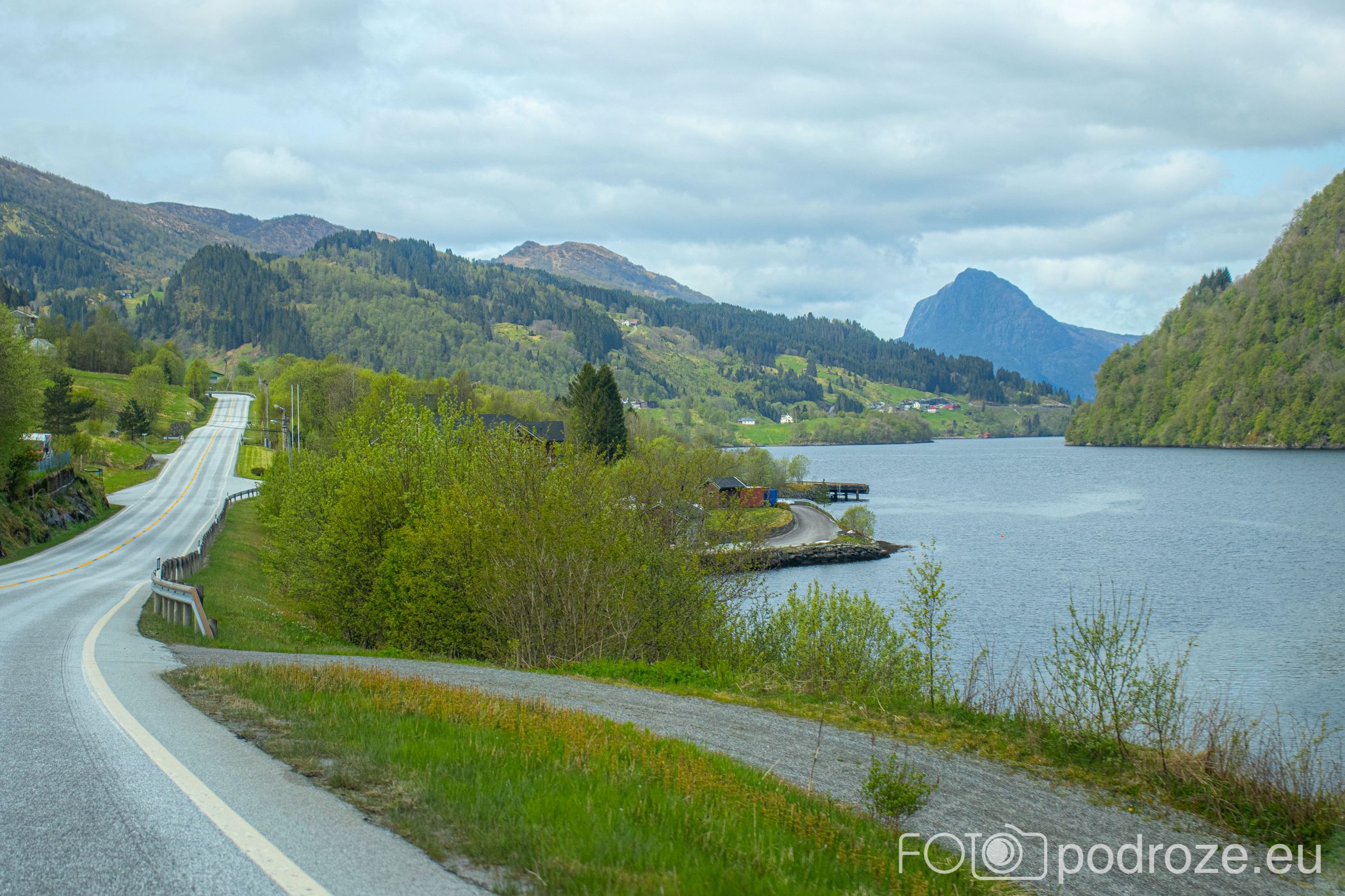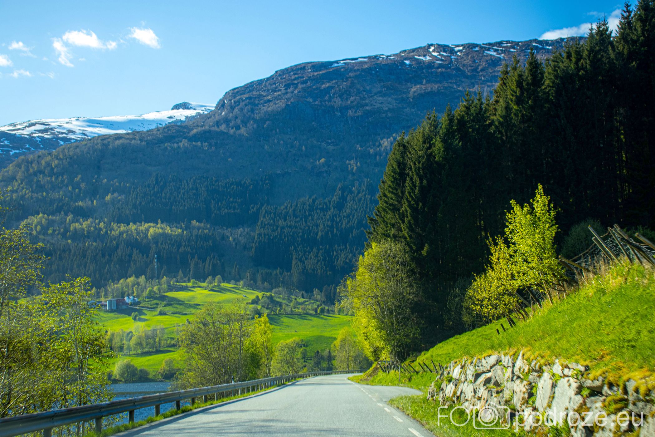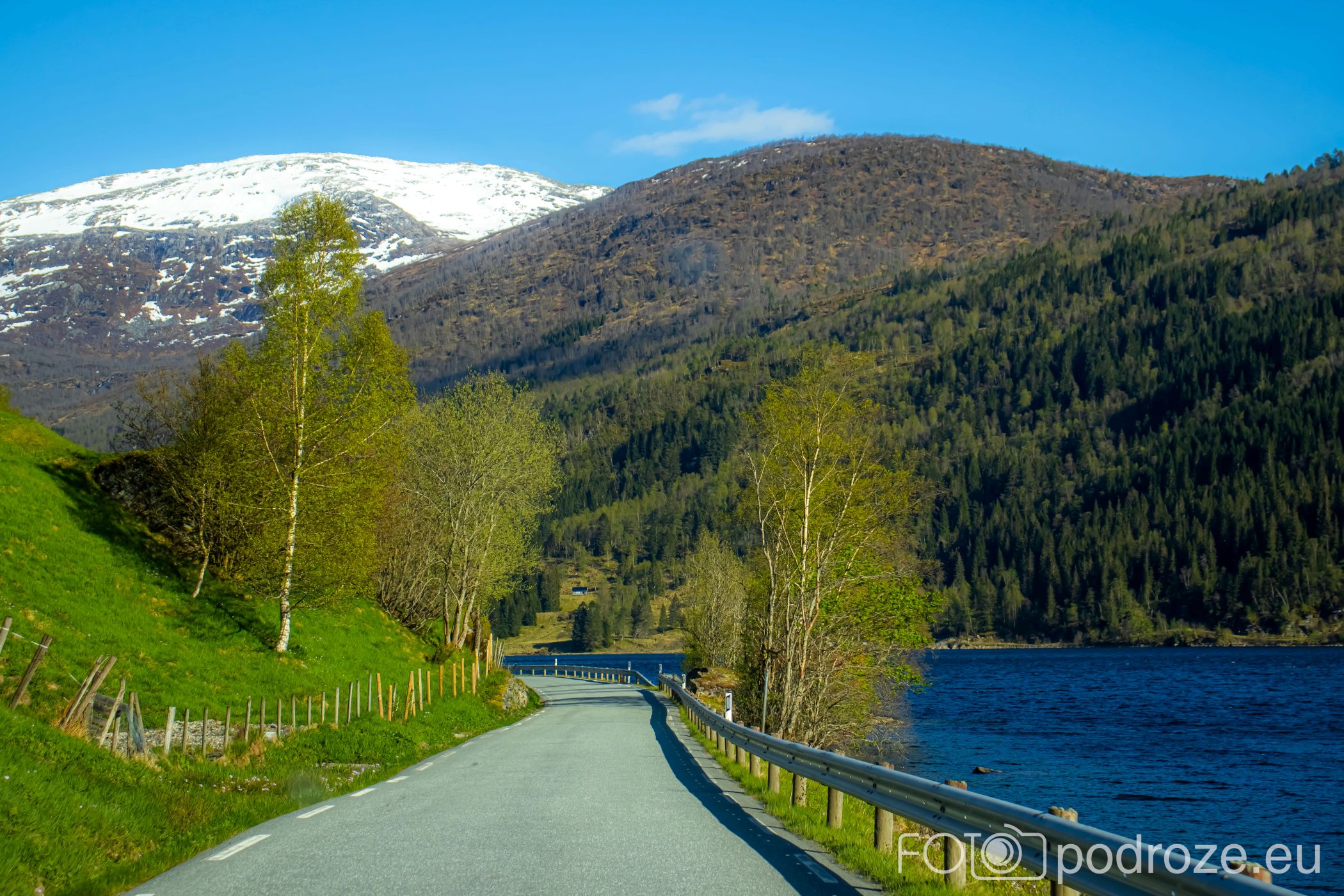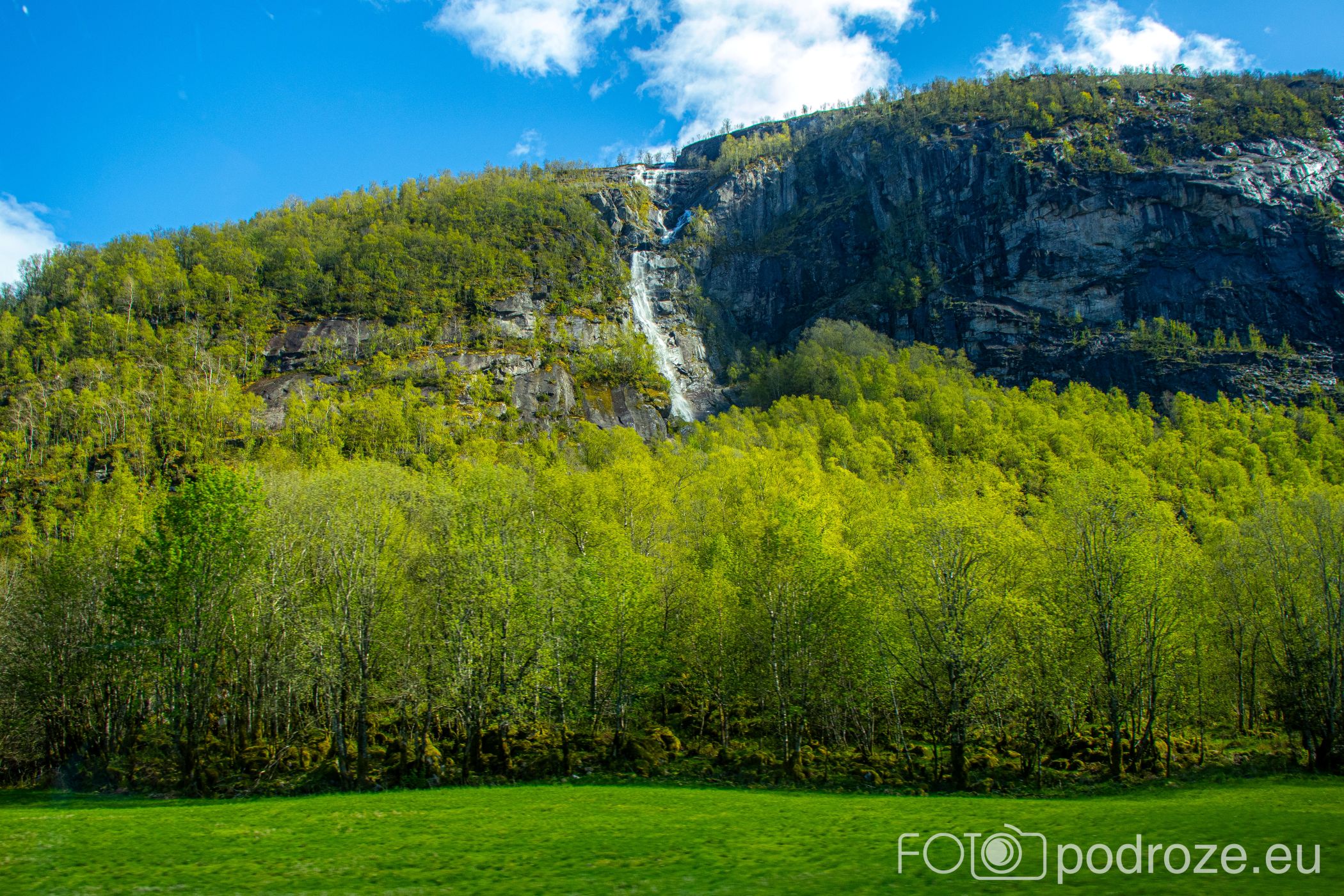 Ruszamy teraz na wschód od Forde drogą Fv613. Trasa wiedzie wzdłuż jeziora Holsavatnet, a widoki jakie nam towarzyszą to zielone lasy, skaliste góry, miejscami urokliwe kolorowe domki norweskie i „prywatne” wodospady.