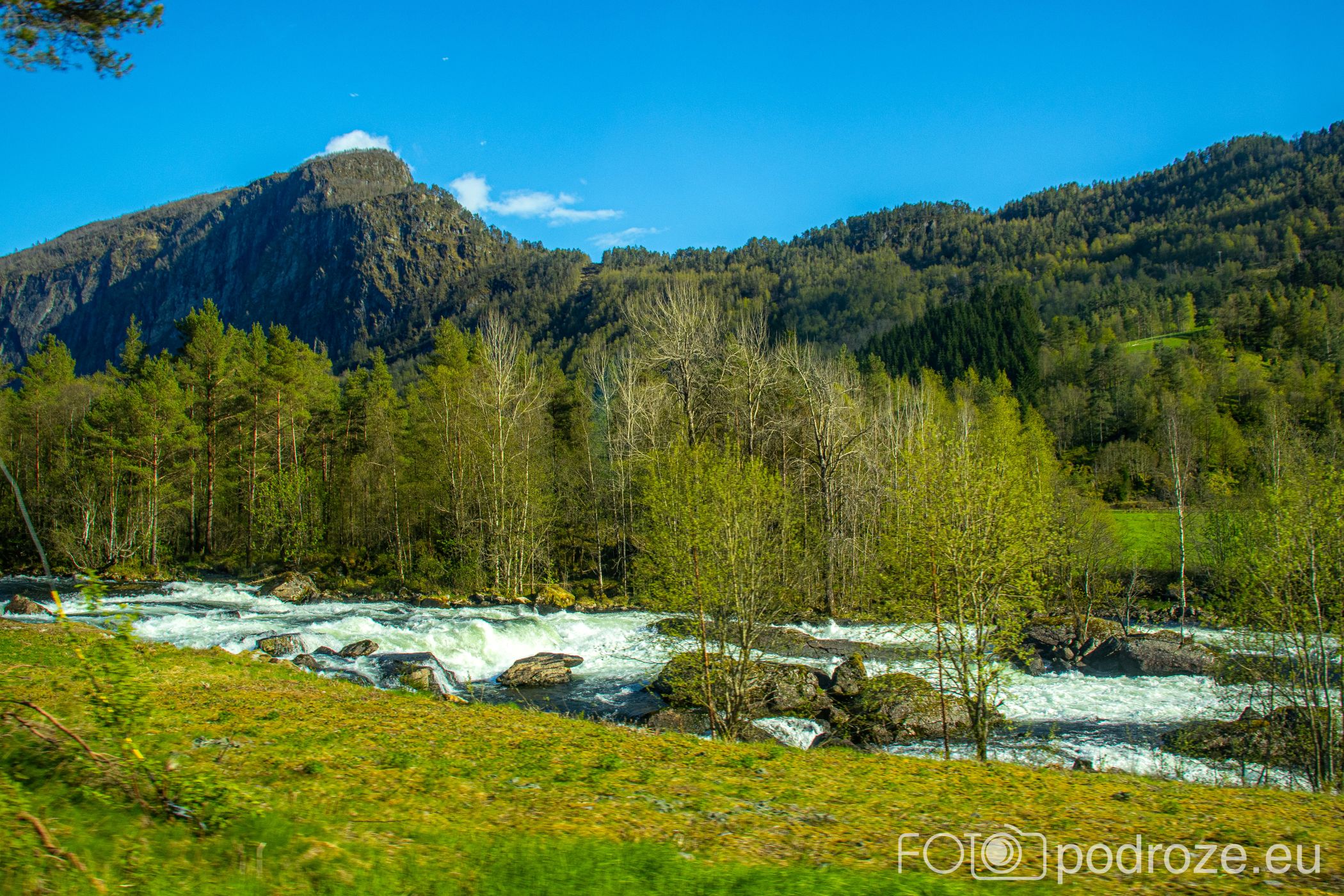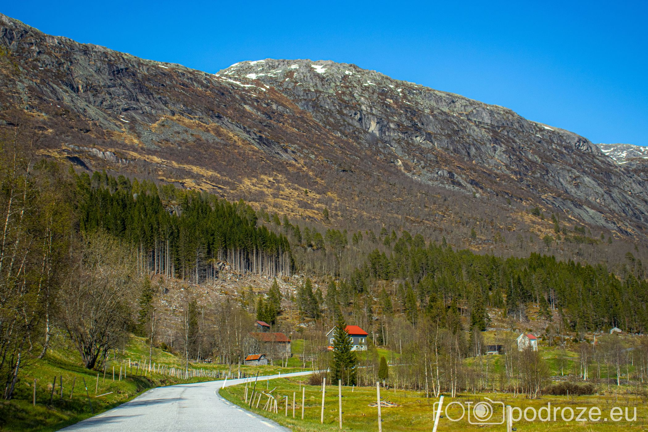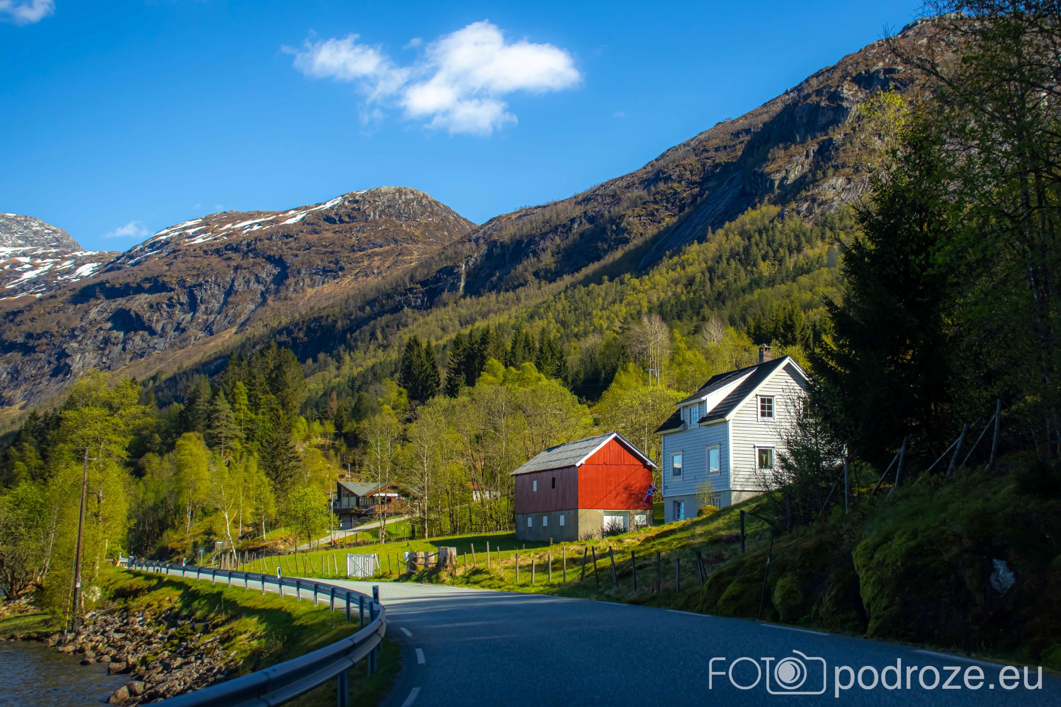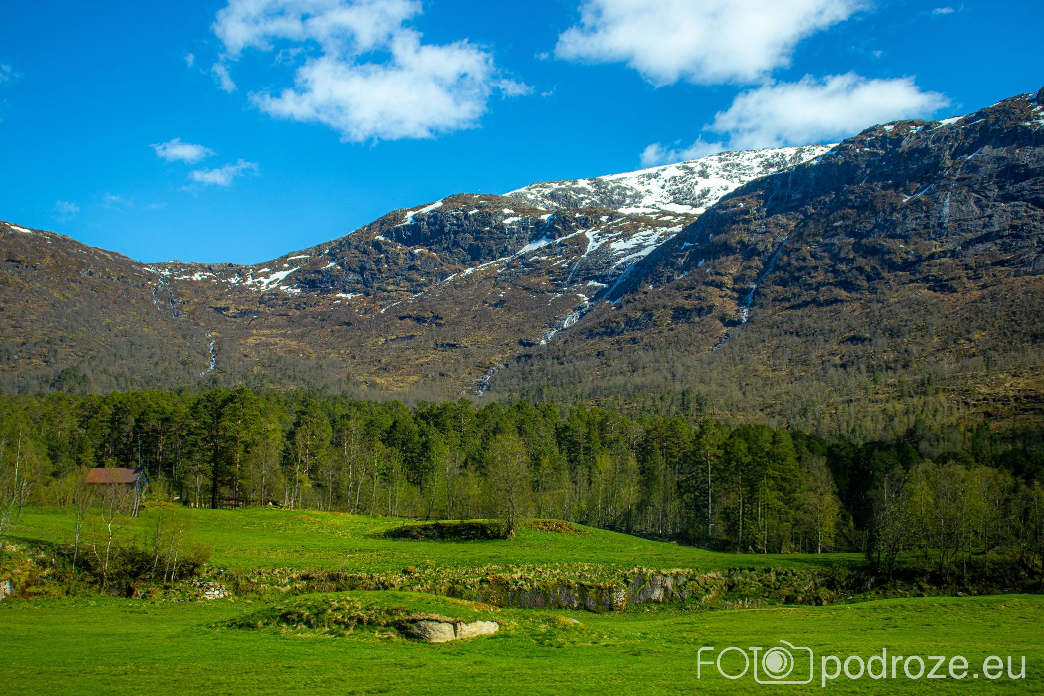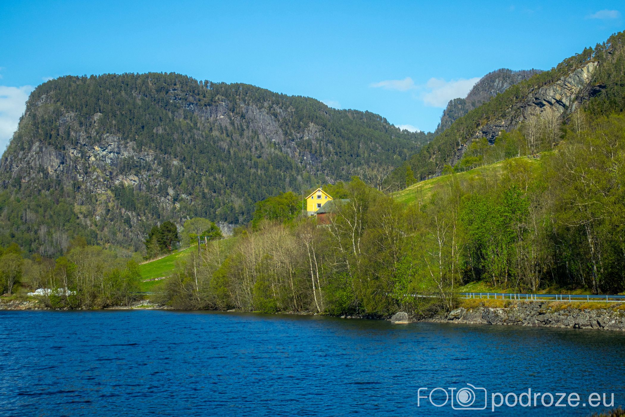 Ruszamy teraz na wschód od Forde drogą Fv613. Trasa wiedzie wzdłuż jeziora Holsavatnet, a widoki jakie nam towarzyszą to zielone lasy, skaliste góry, miejscami urokliwe kolorowe domki norweskie i „prywatne” wodospady.