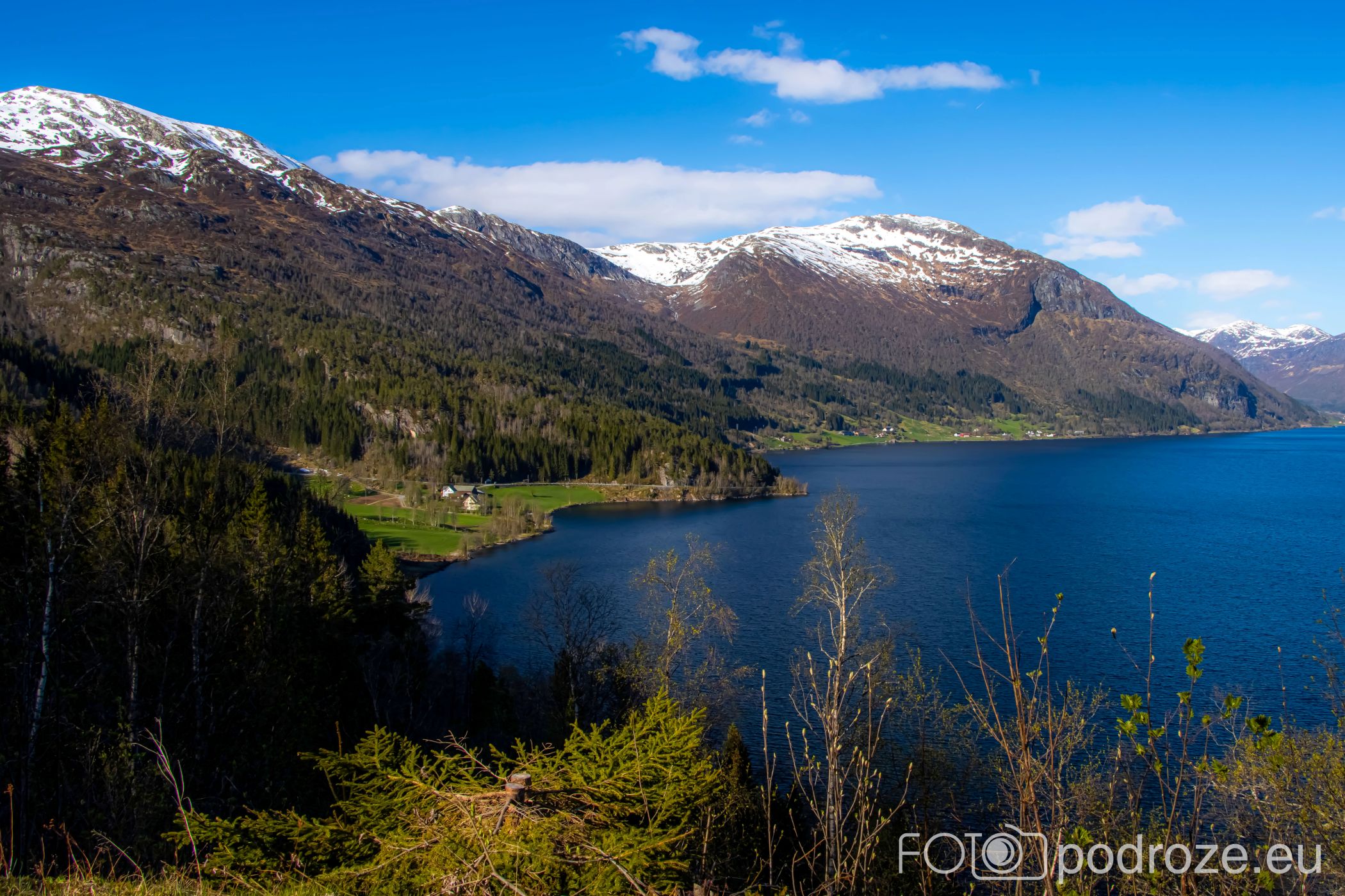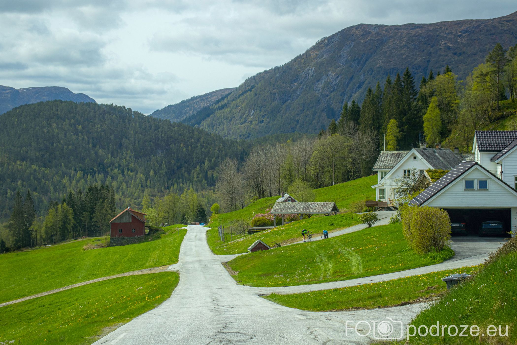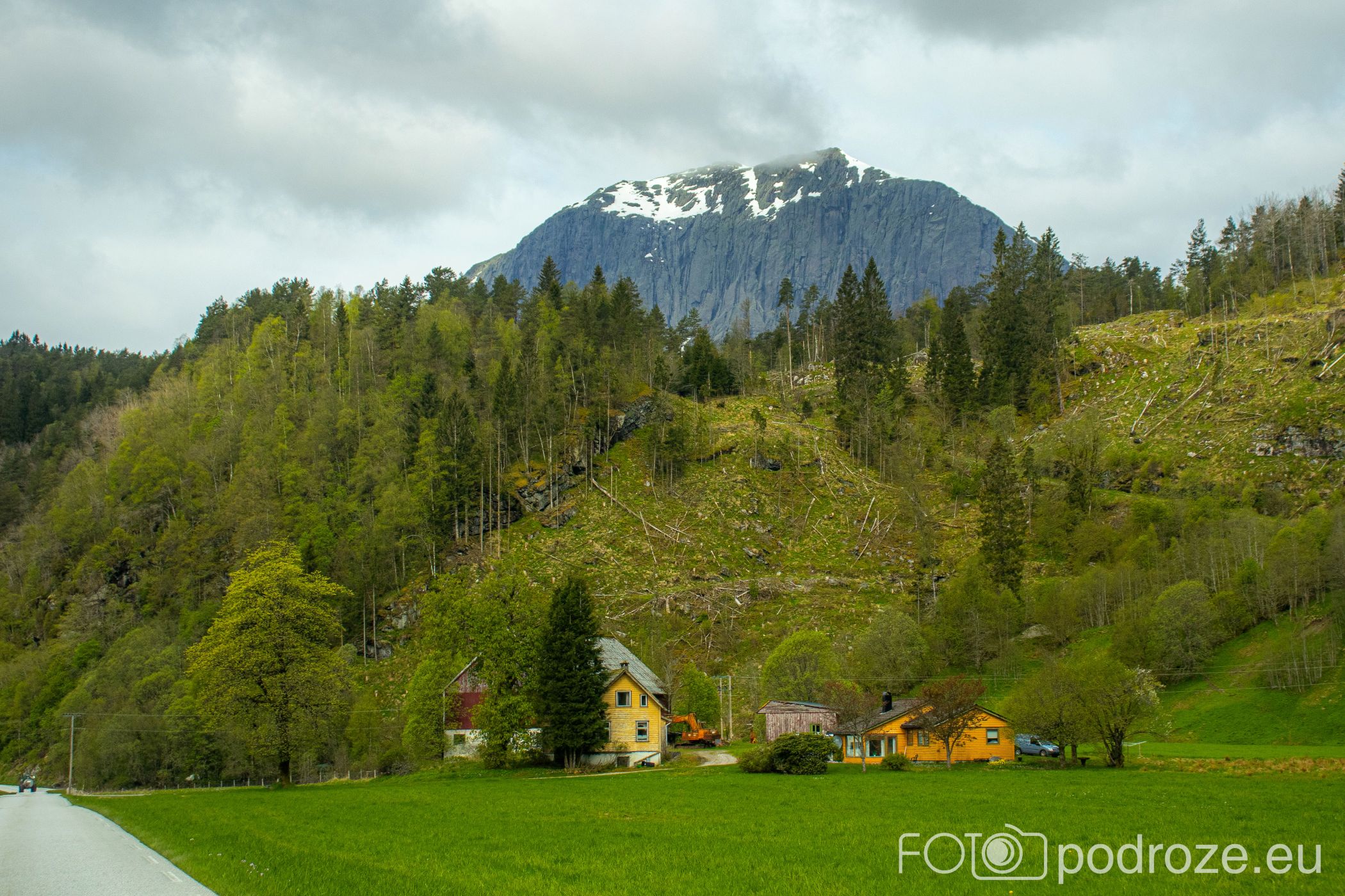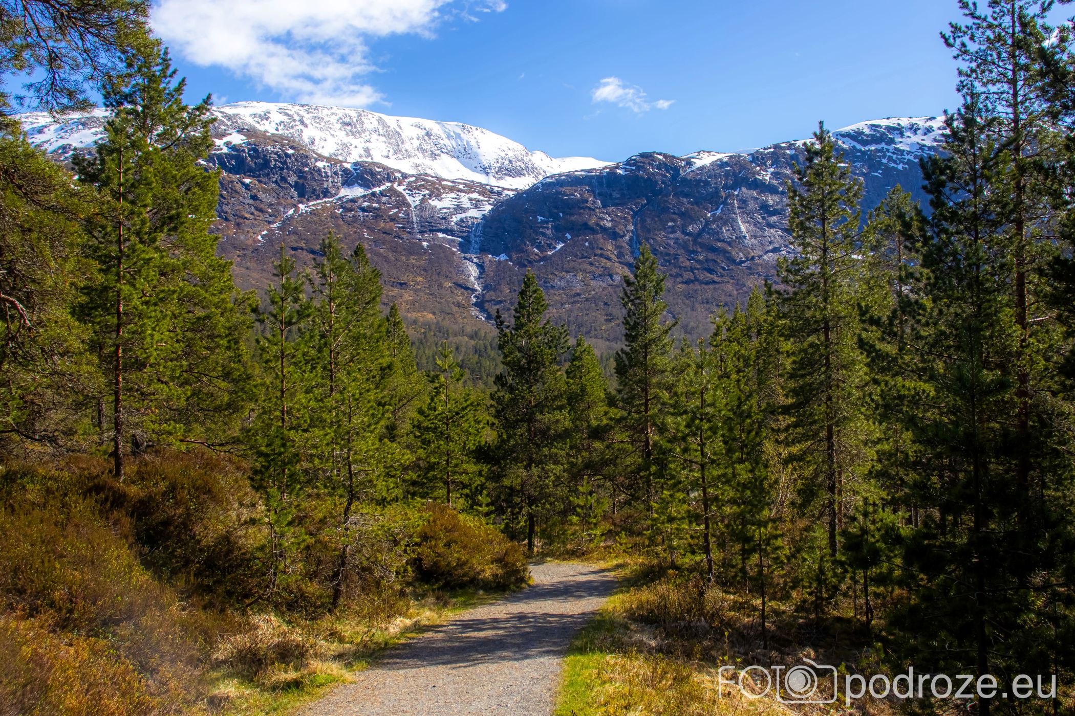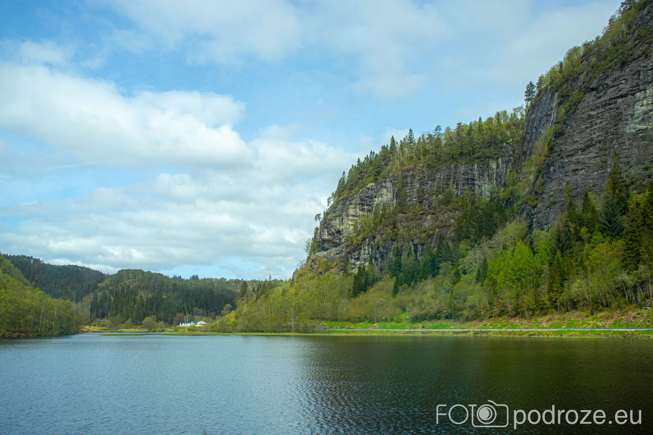 Ruszamy teraz na wschód od Forde drogą Fv613. Trasa wiedzie wzdłuż jeziora Holsavatnet, a widoki jakie nam towarzyszą to zielone lasy, skaliste góry, miejscami urokliwe kolorowe domki norweskie i „prywatne” wodospady.