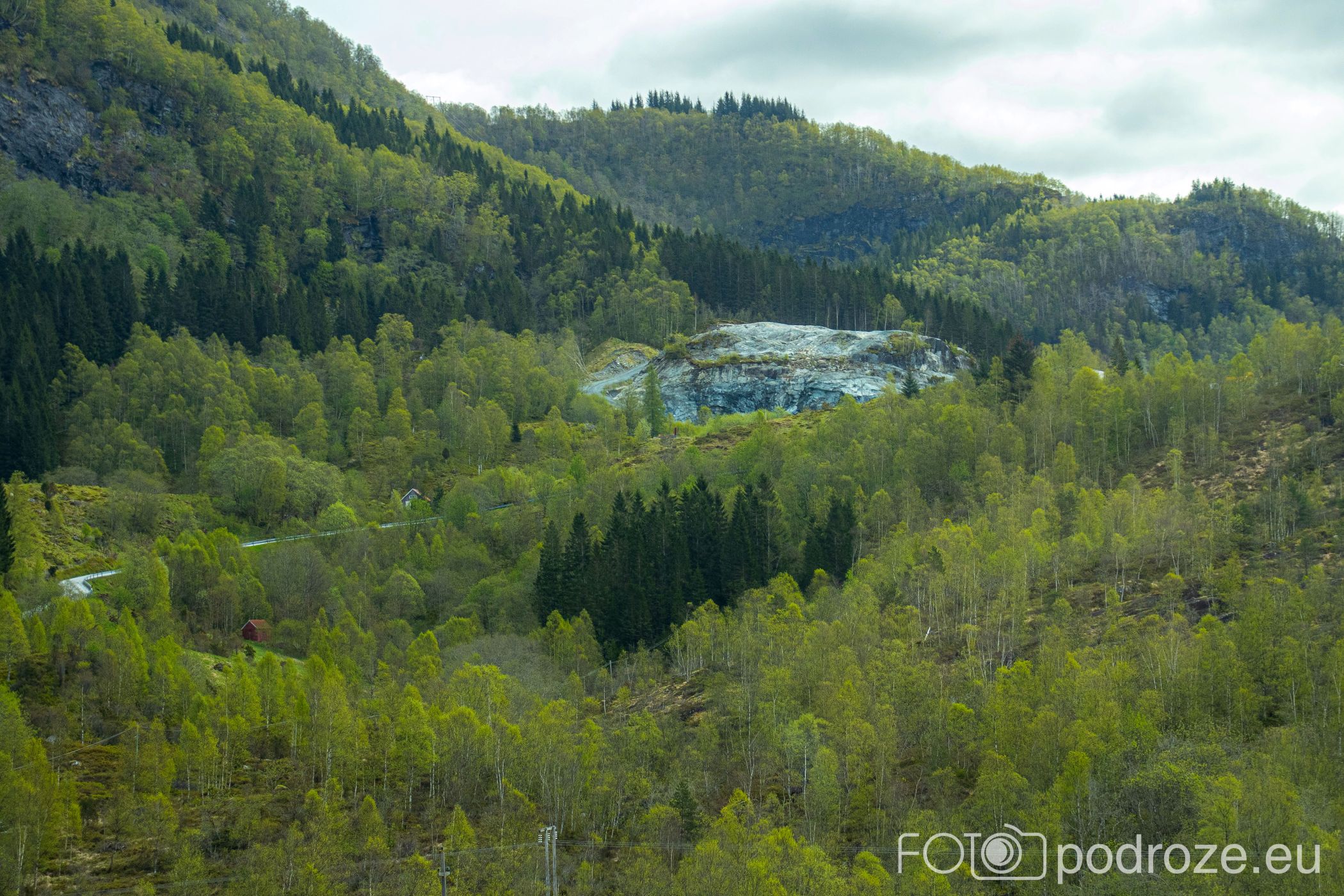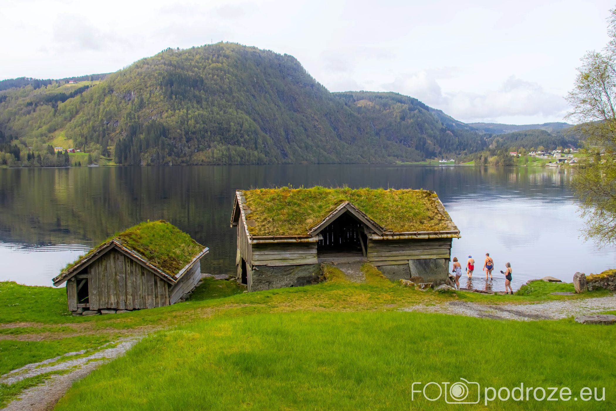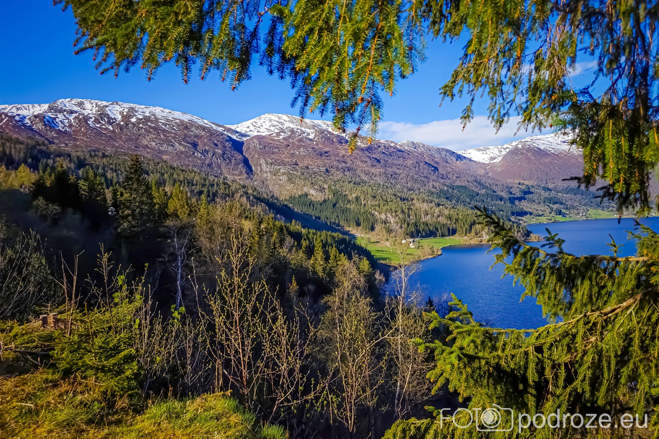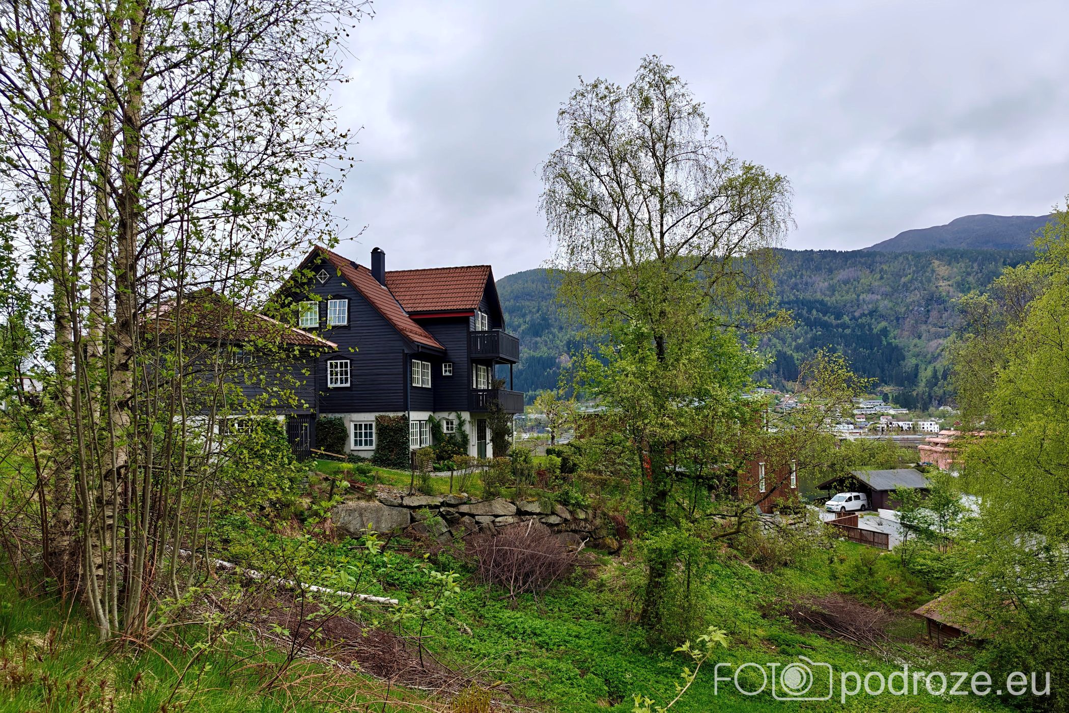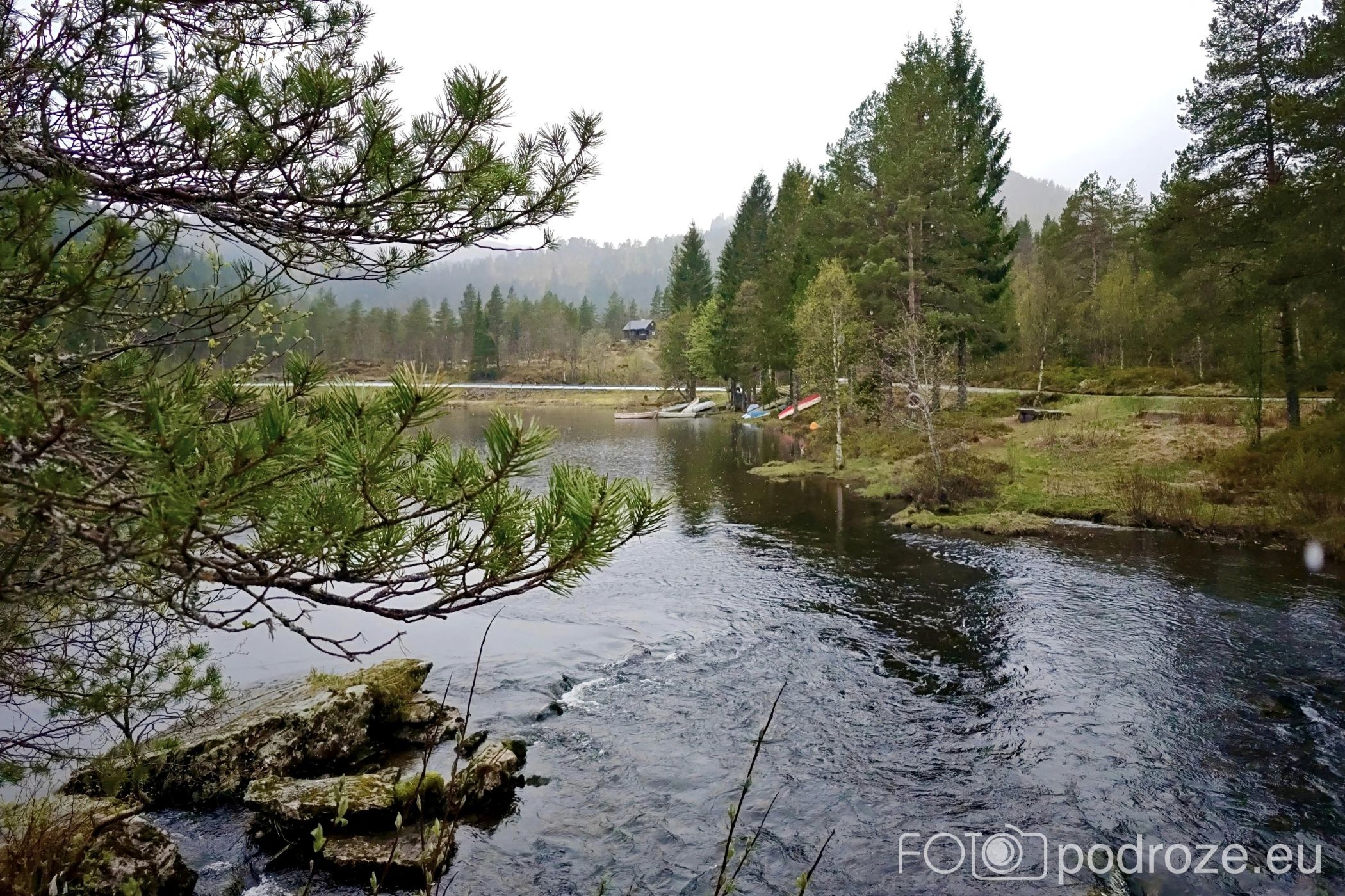 Ruszamy teraz na wschód od Forde drogą Fv613. Trasa wiedzie wzdłuż jeziora Holsavatnet, a widoki jakie nam towarzyszą to zielone lasy, skaliste góry, miejscami urokliwe kolorowe domki norweskie i „prywatne” wodospady.