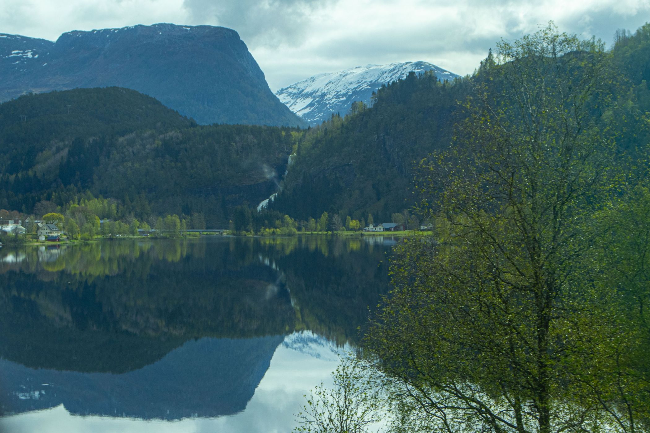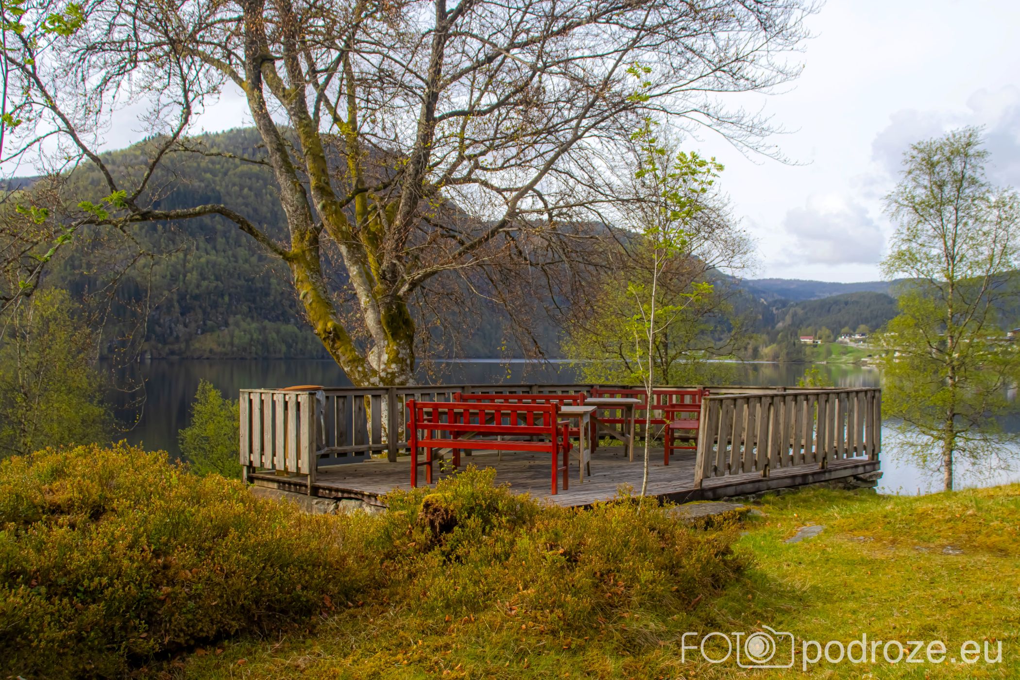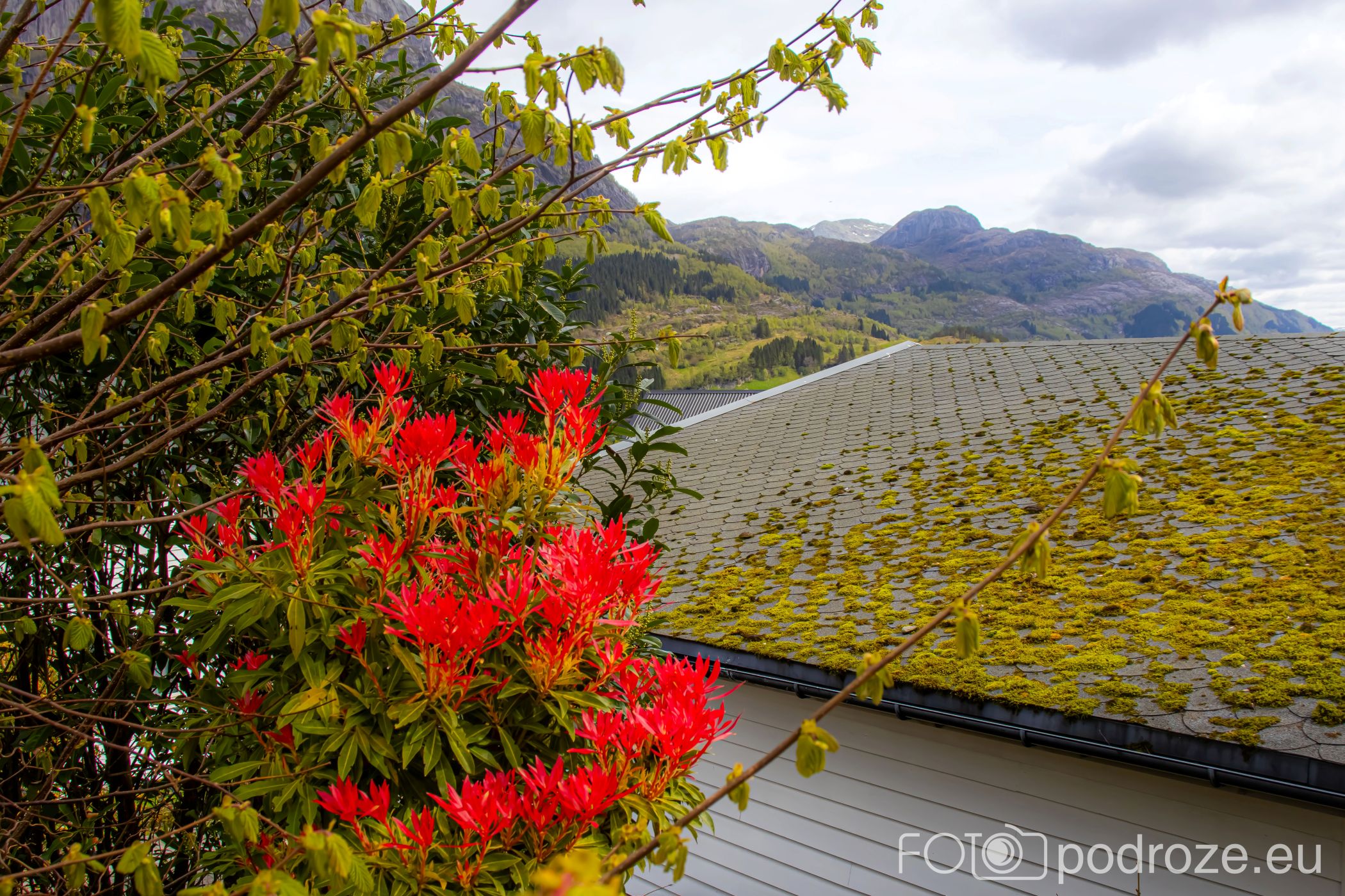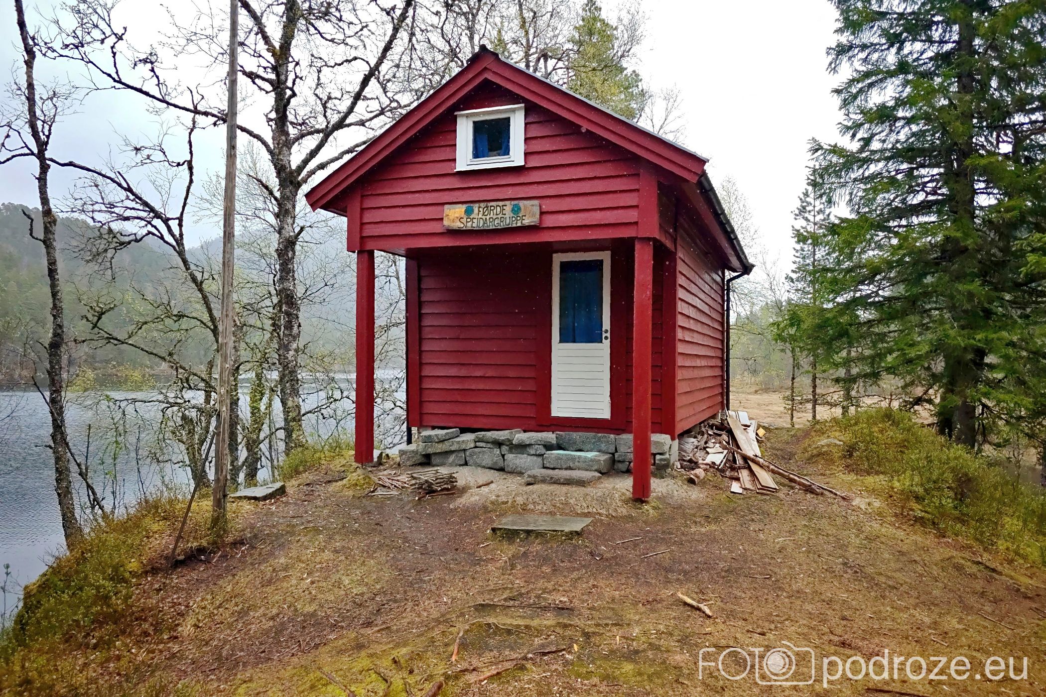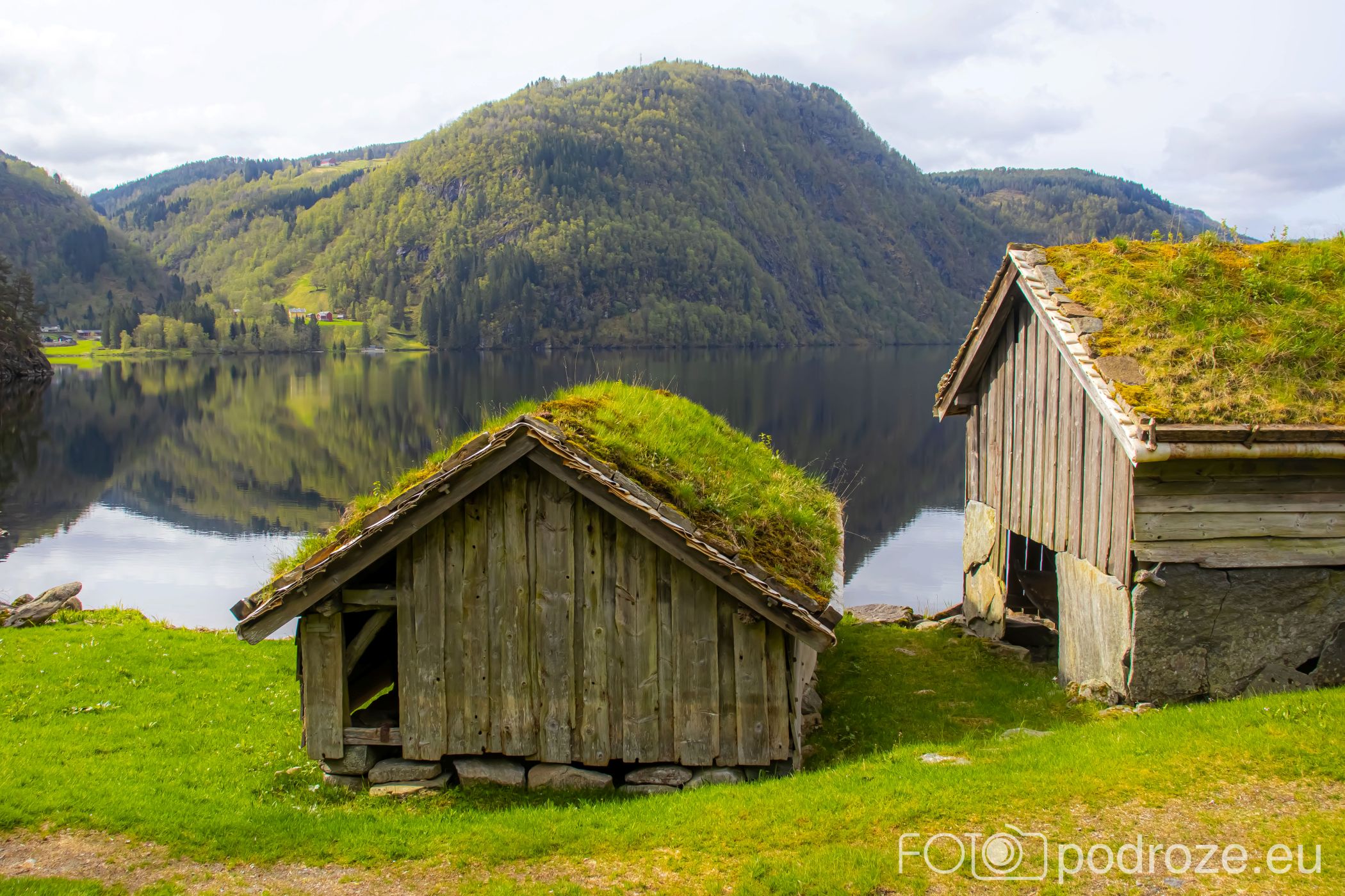 Ruszamy teraz na wschód od Forde drogą Fv613. Trasa wiedzie wzdłuż jeziora Holsavatnet, a widoki jakie nam towarzyszą to zielone lasy, skaliste góry, miejscami urokliwe kolorowe domki norweskie i „prywatne” wodospady.